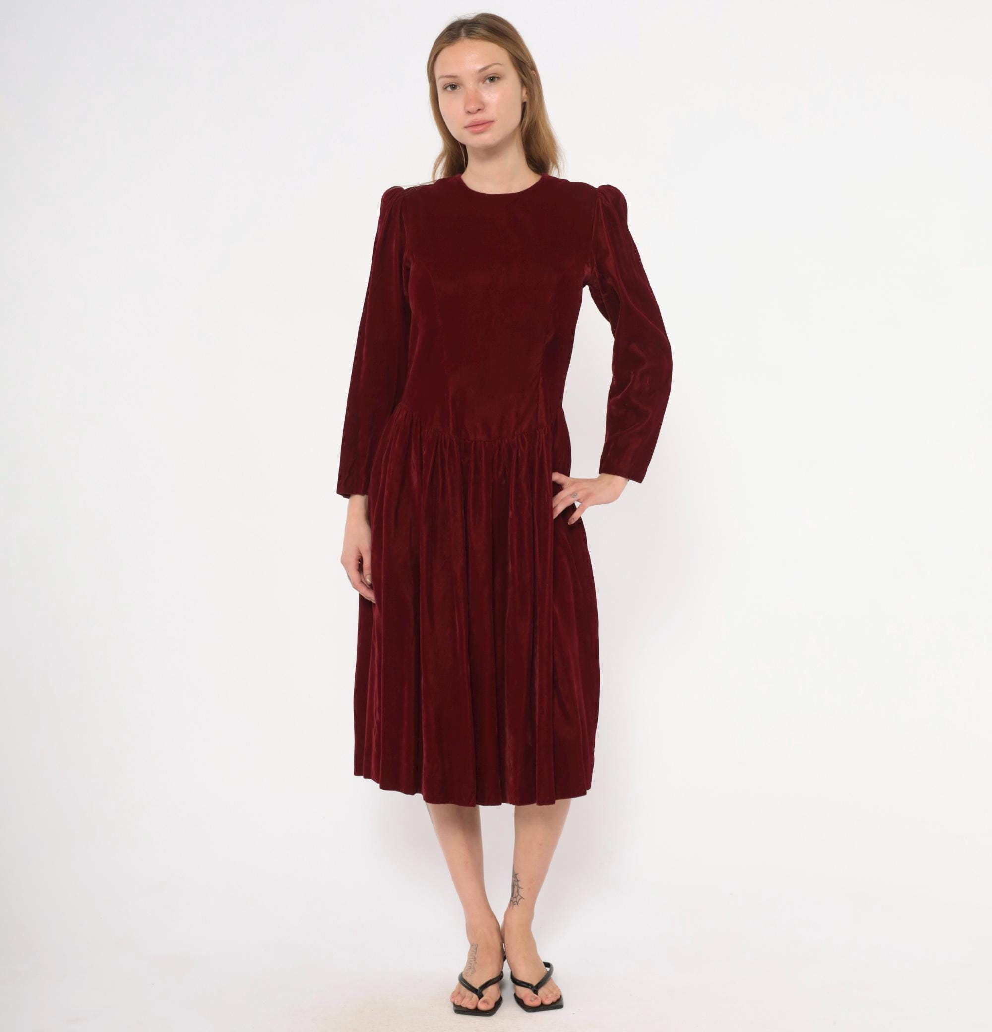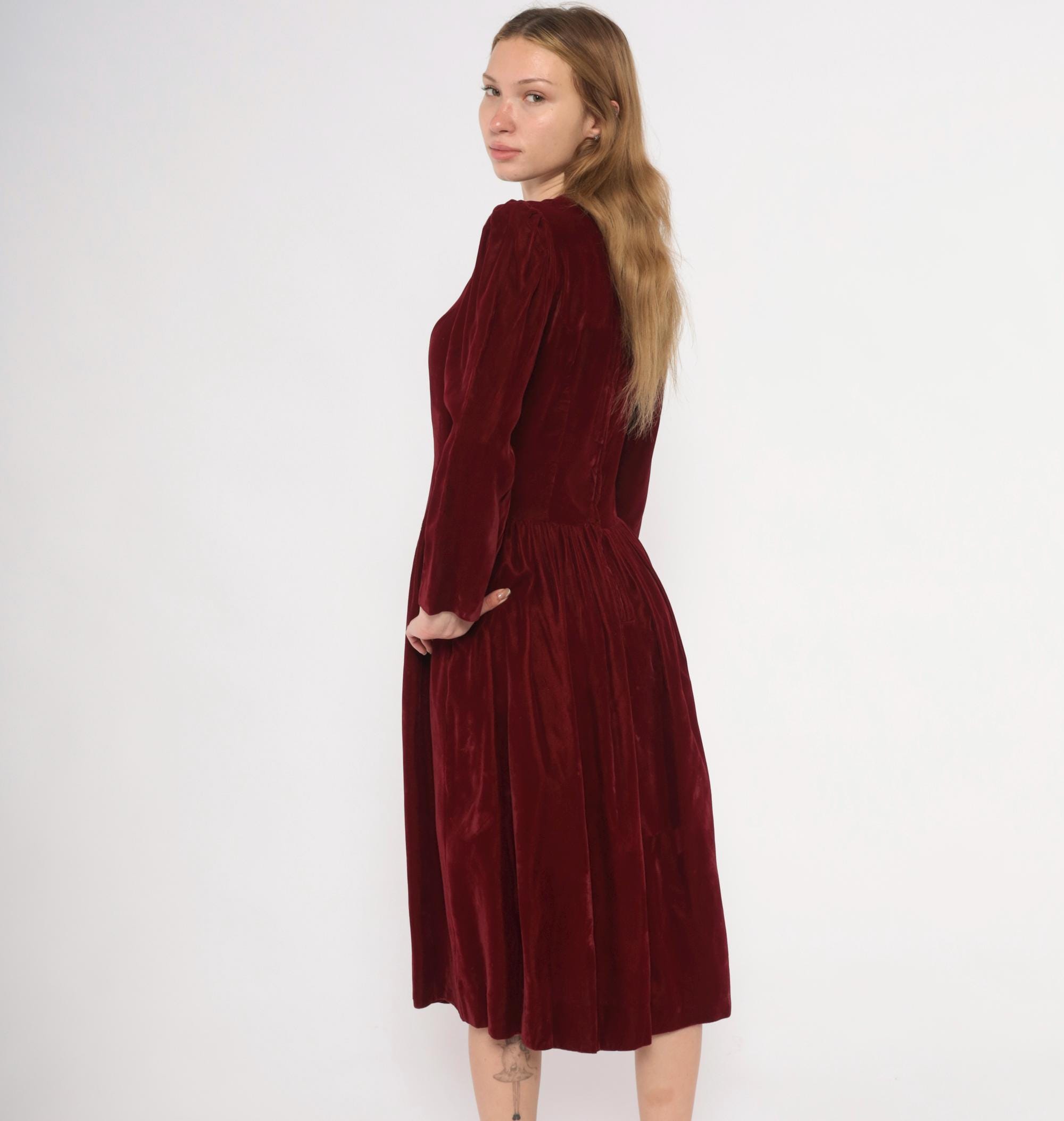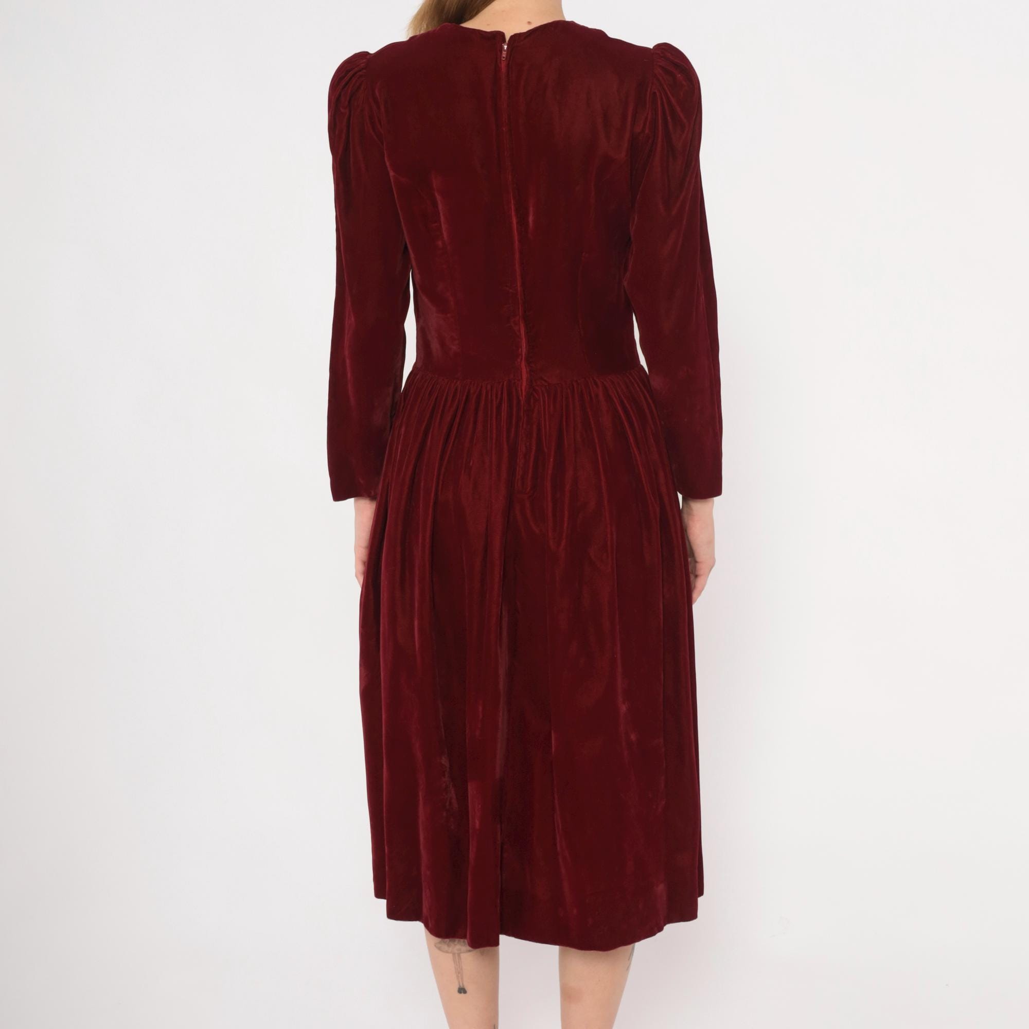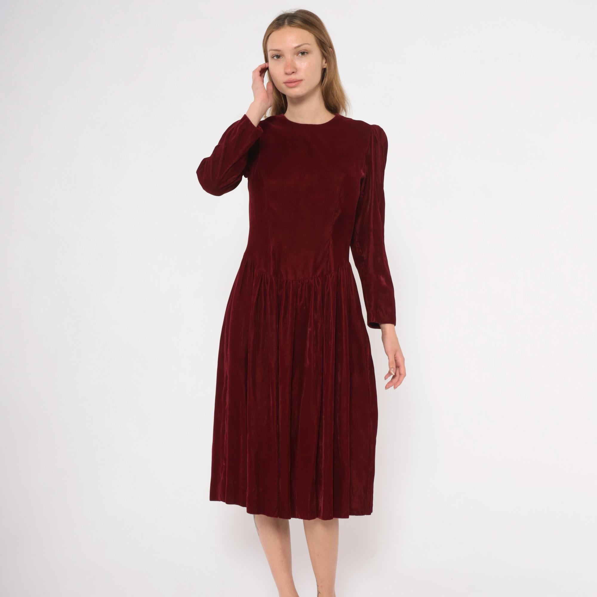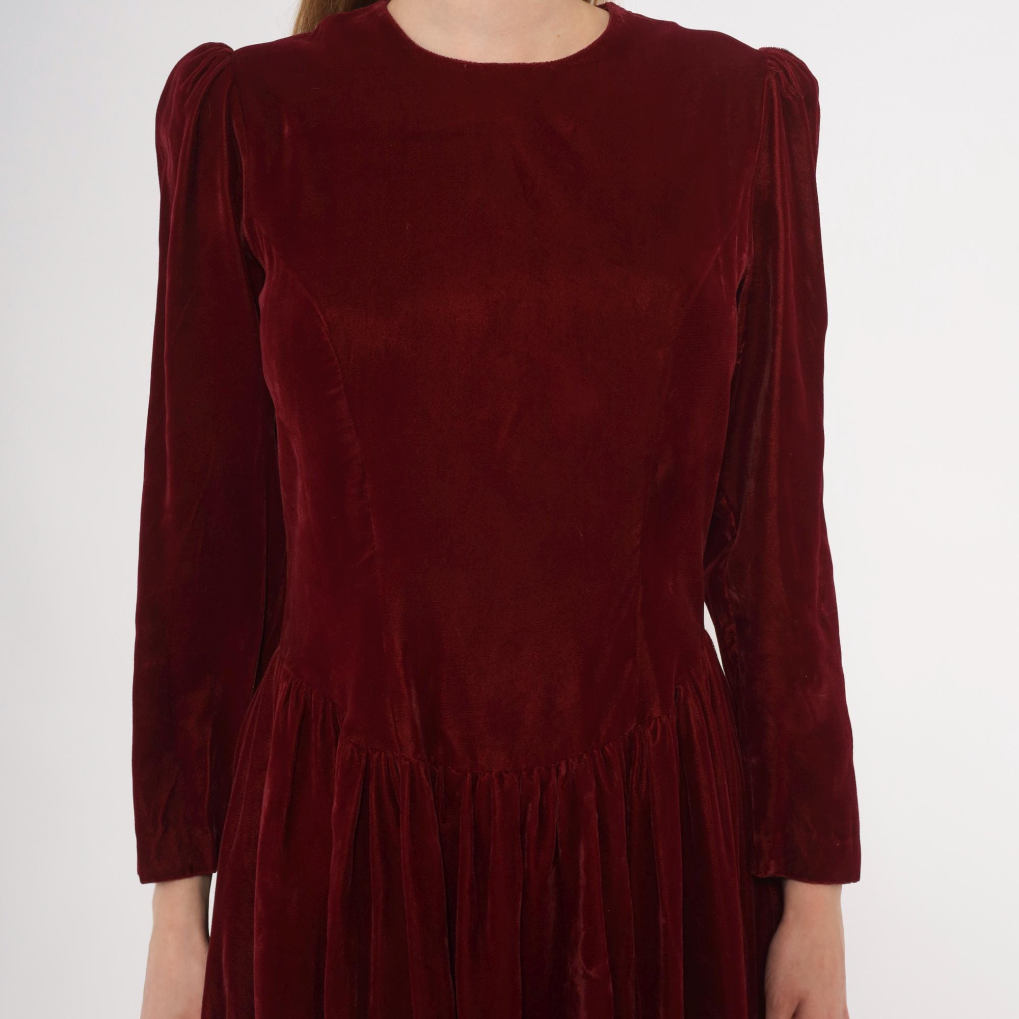 70s burgundy velvet midi dress with a crew neckline and puffed shoulders that taper into fitted long sleeves. Fitted bodice through the waist with a dropped waistline and gathered full skirt.