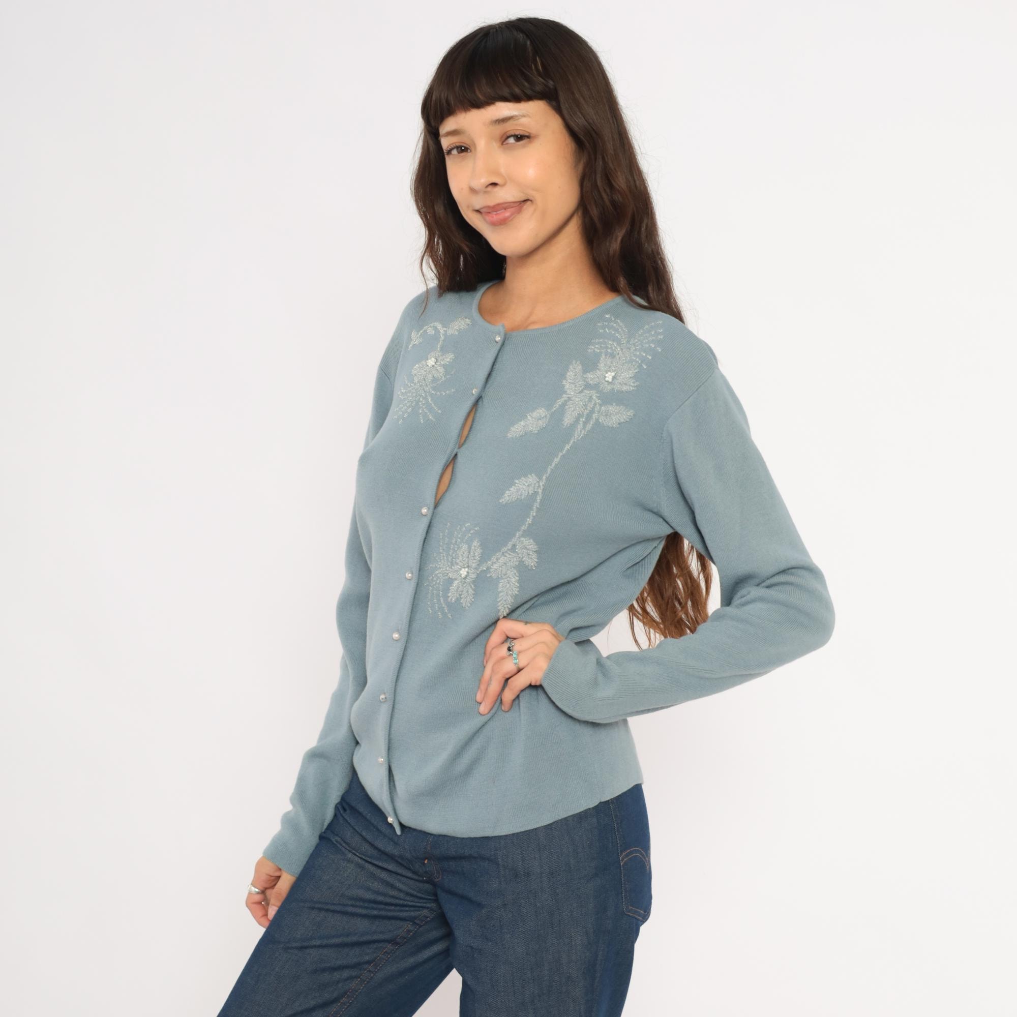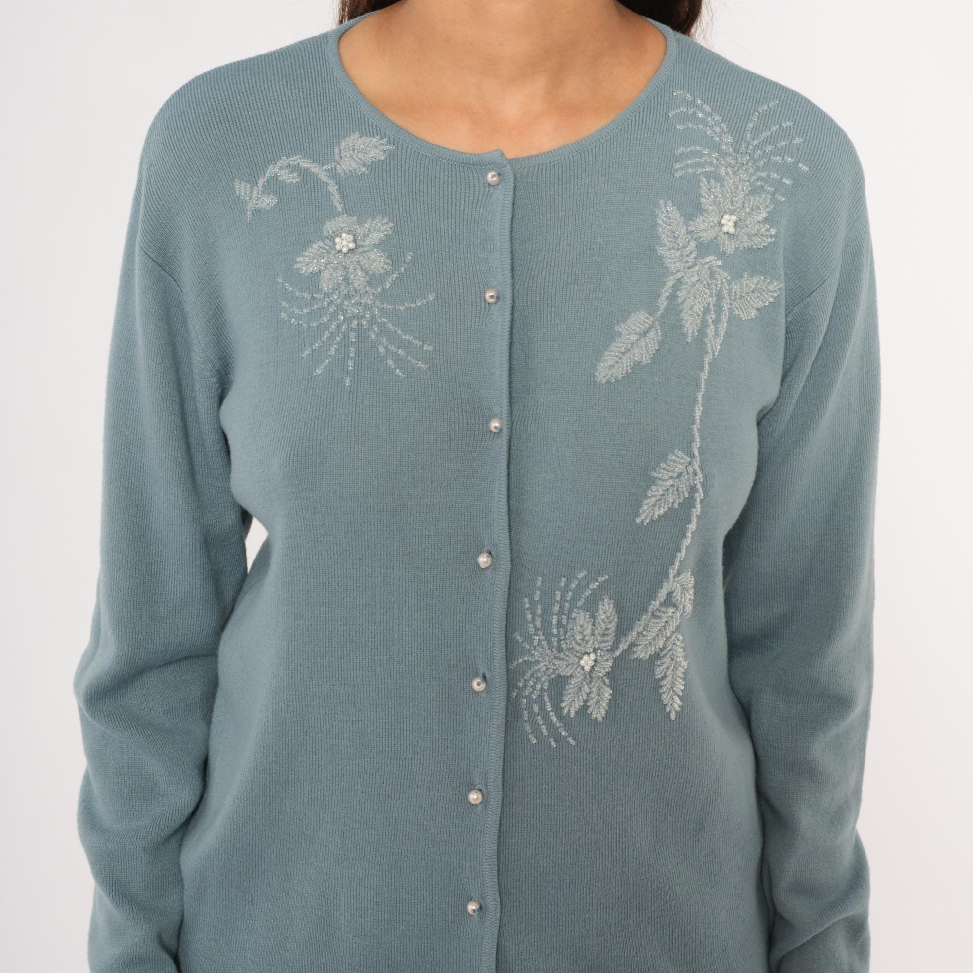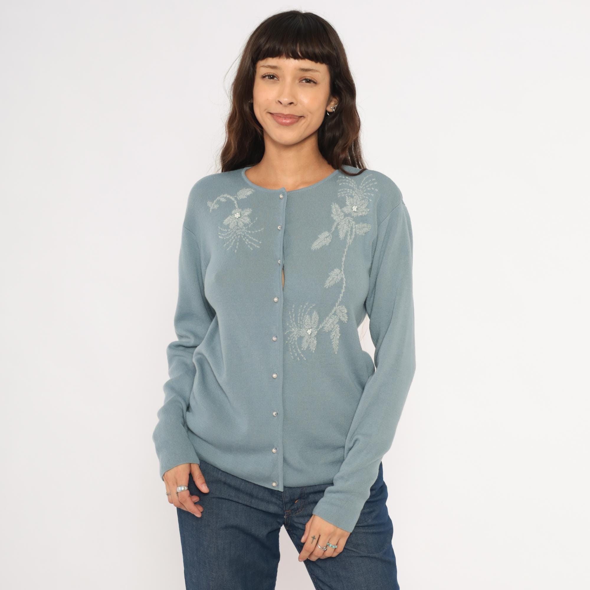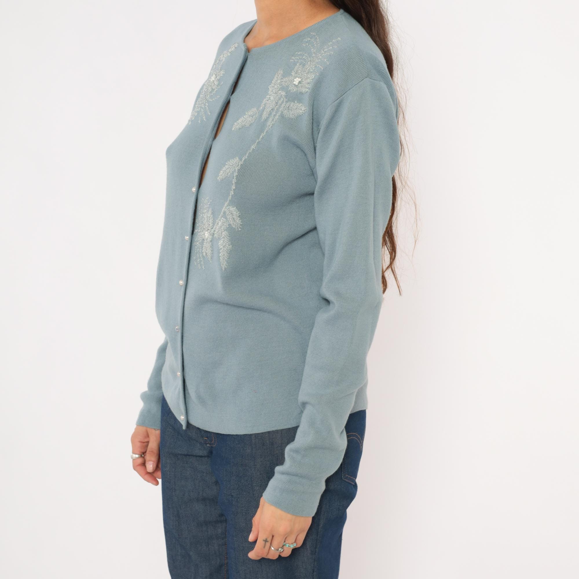 90s powder blue button-front cardigan from Saks Fifth Avenue with embroidered floral vine motifs across the chest in white and silver-toned thread. Small pearl-like buttons down the center front and a round crew neckline. Long sleeves with ribbed cuffs and a straight hem, with beaded flower centers accenting the embroidery on both sides.
