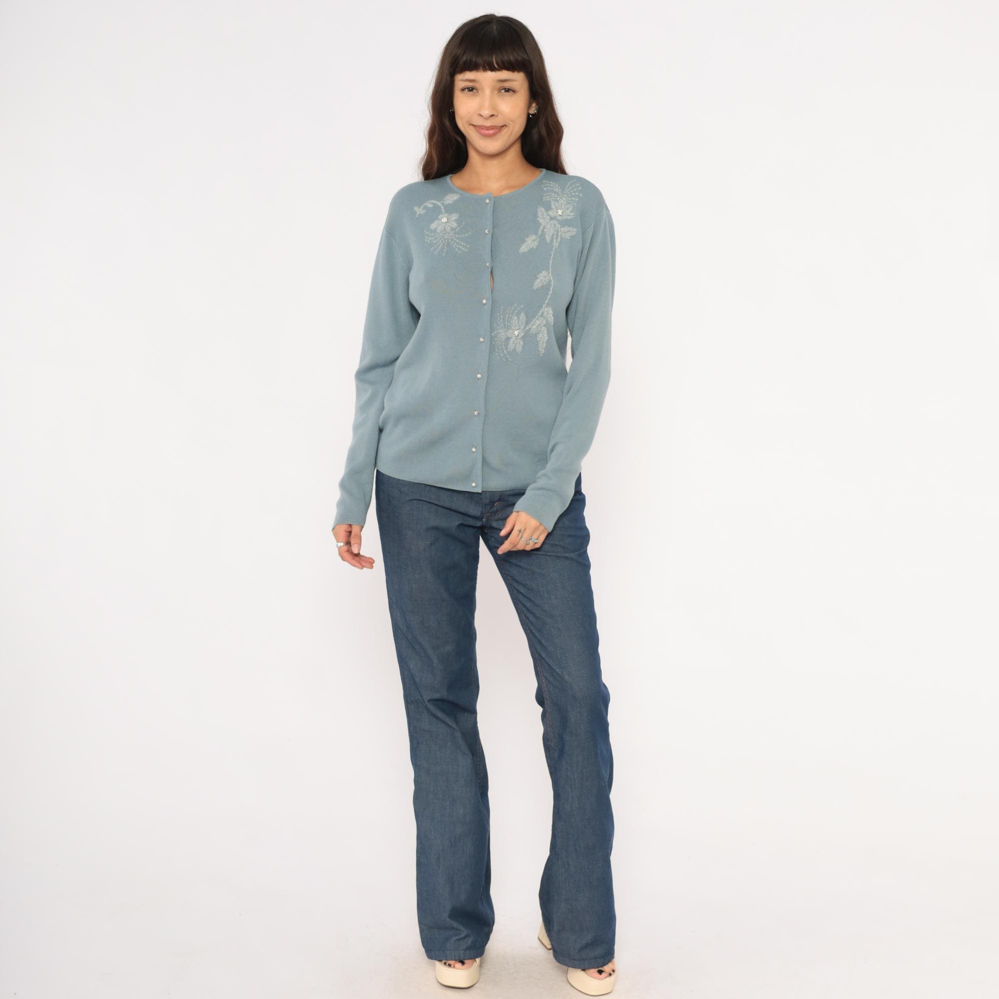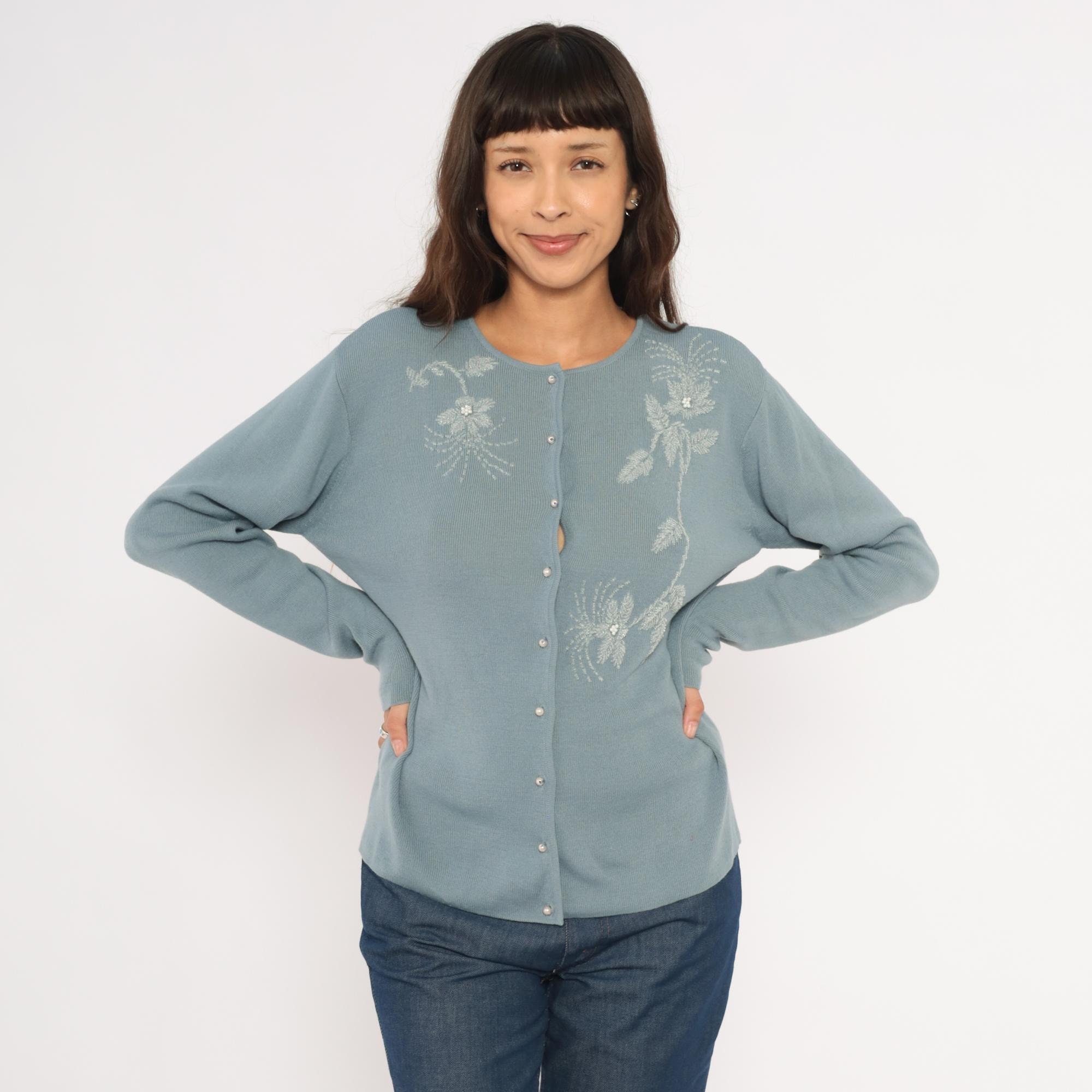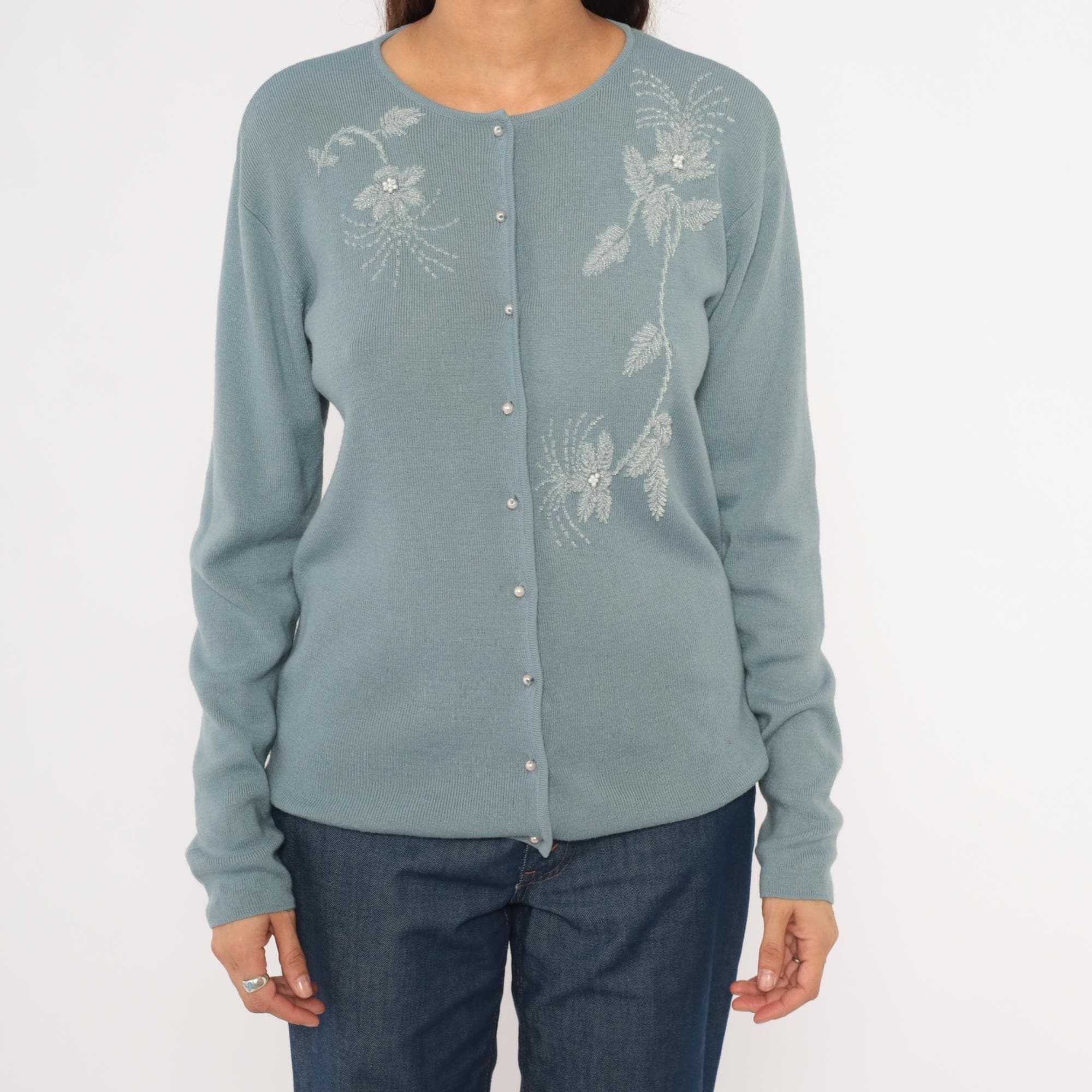 90s powder blue button-front cardigan from Saks Fifth Avenue with embroidered floral vine motifs across the chest in white and silver-toned thread. Small pearl-like buttons down the center front and a round crew neckline. Long sleeves with ribbed cuffs and a straight hem, with beaded flower centers accenting the embroidery on both sides.
