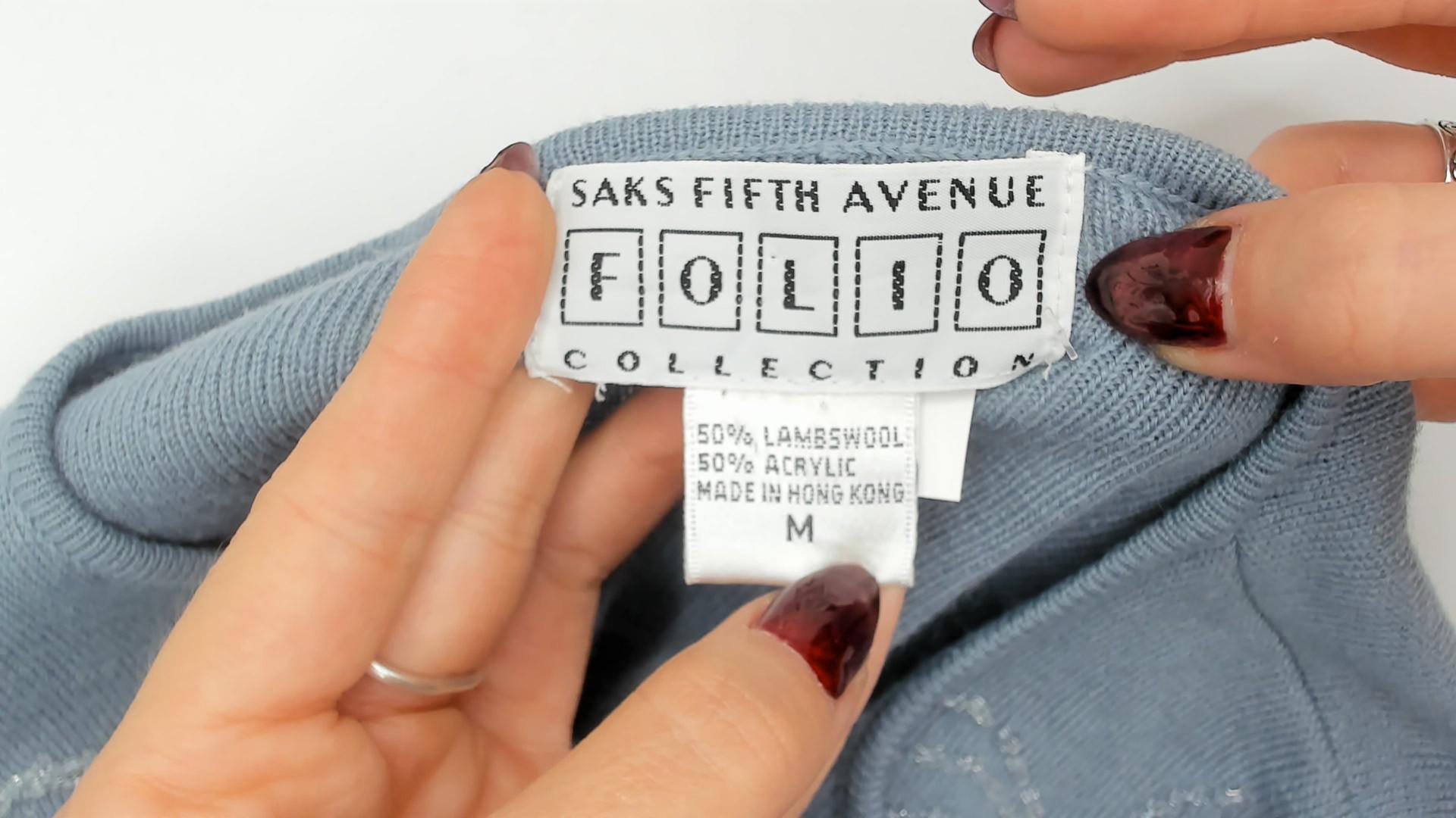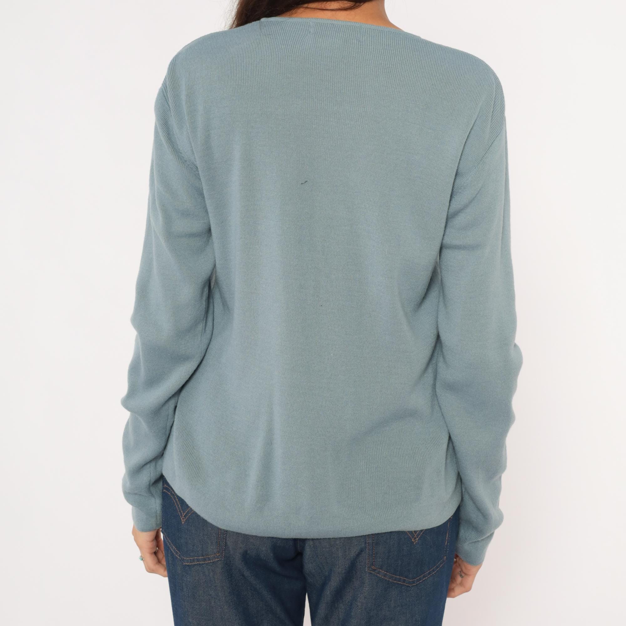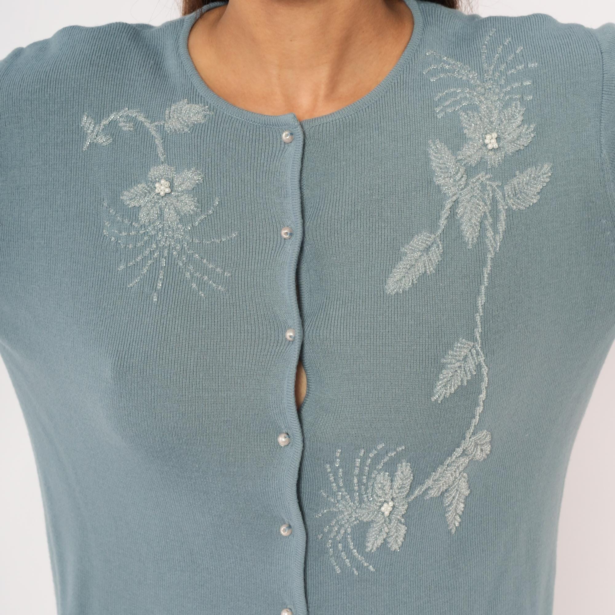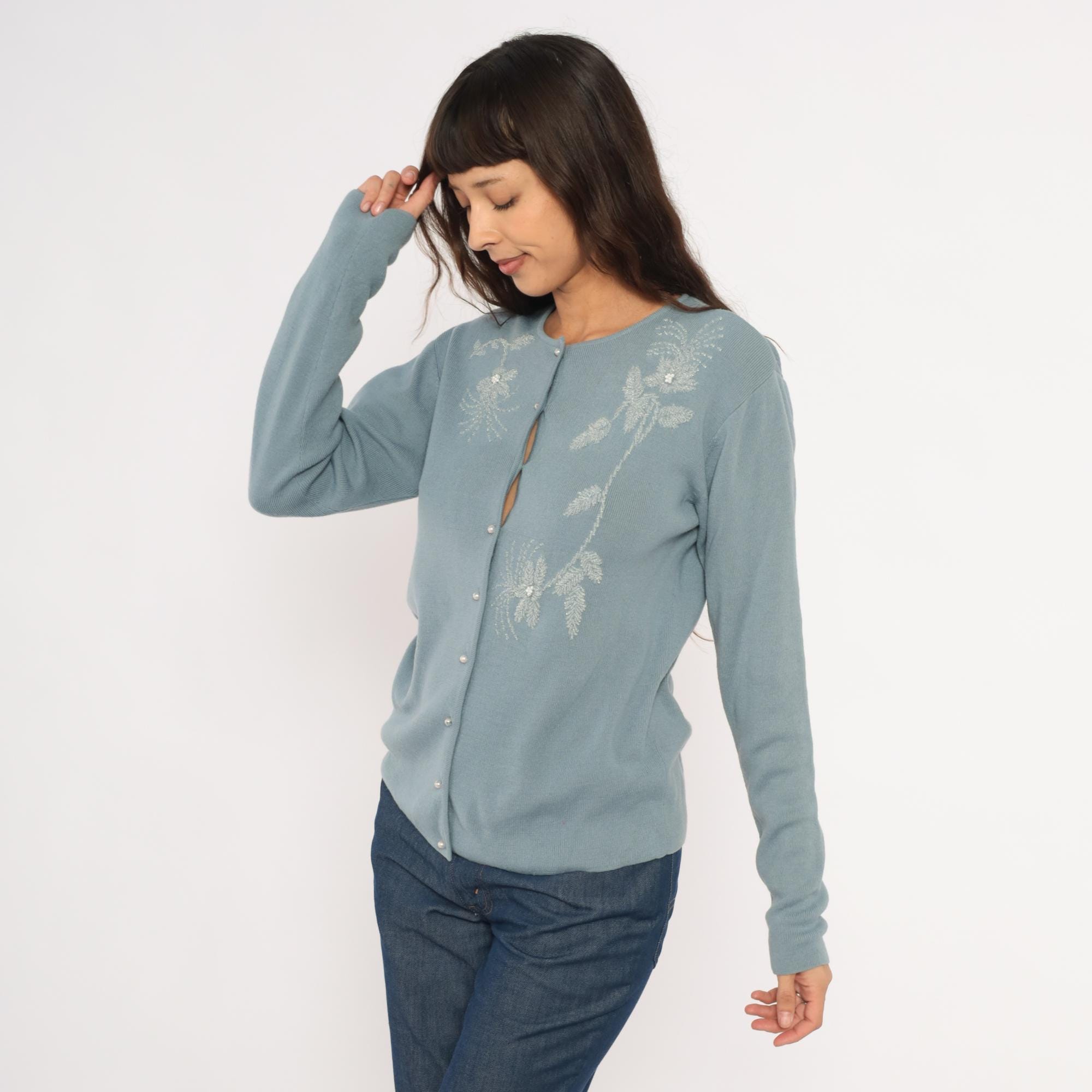 90s powder blue button-front cardigan from Saks Fifth Avenue with embroidered floral vine motifs across the chest in white and silver-toned thread. Small pearl-like buttons down the center front and a round crew neckline. Long sleeves with ribbed cuffs and a straight hem, with beaded flower centers accenting the embroidery on both sides.