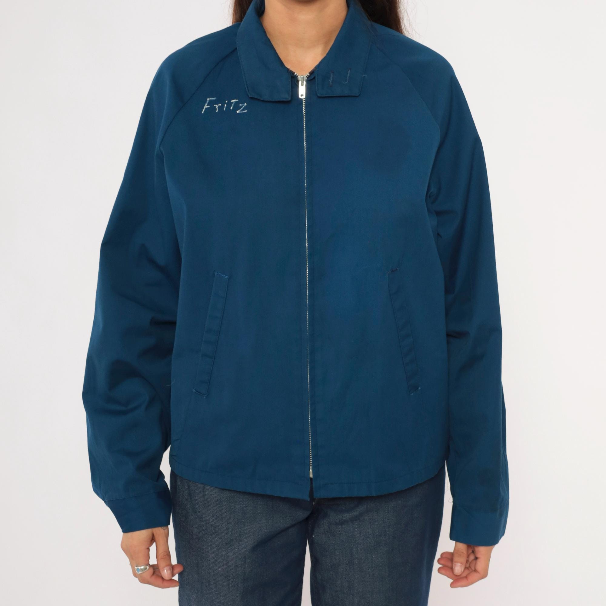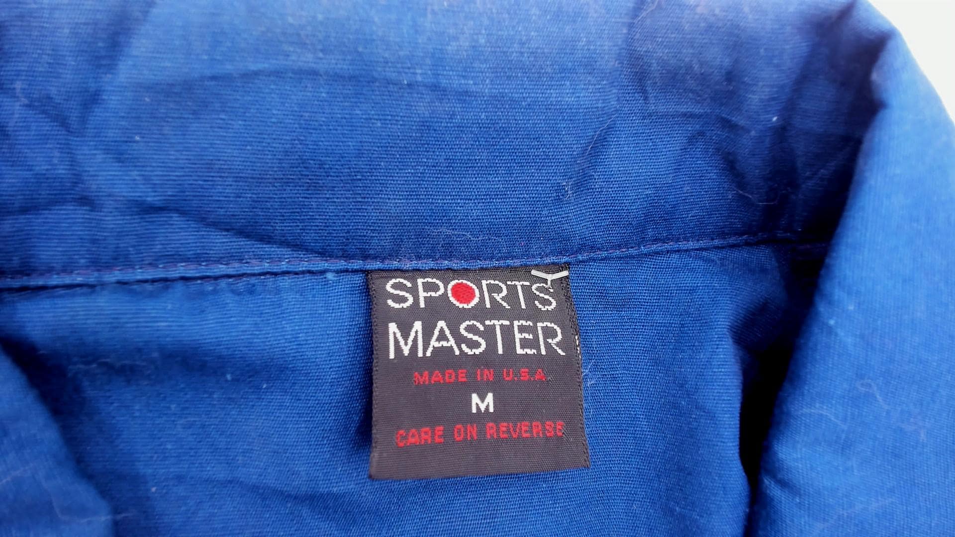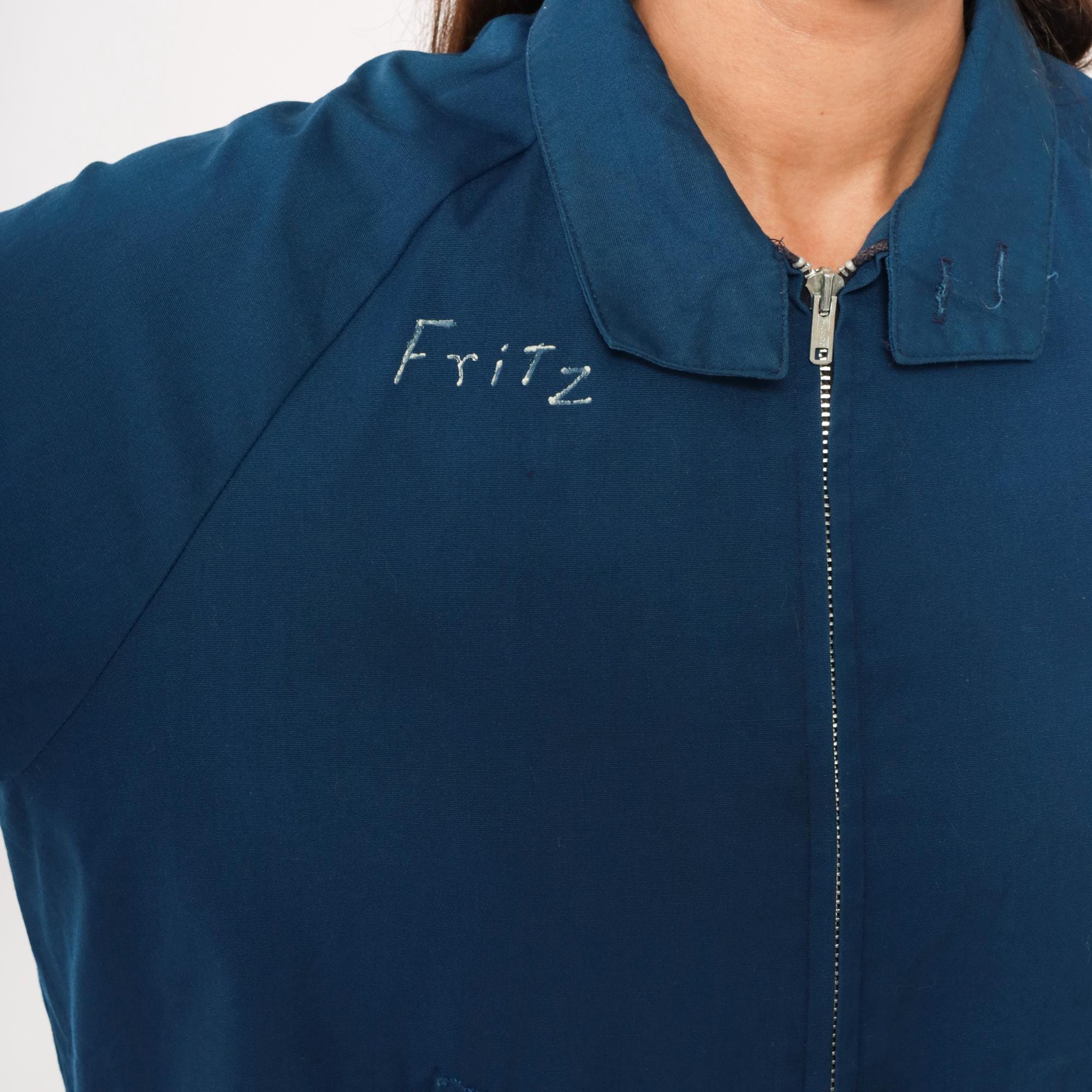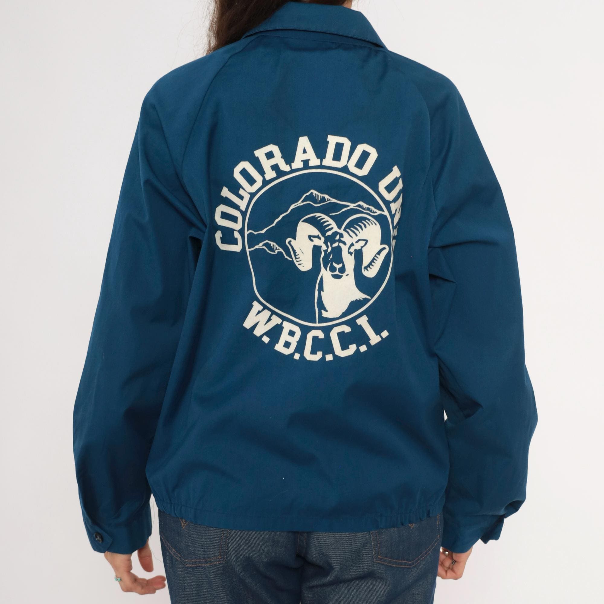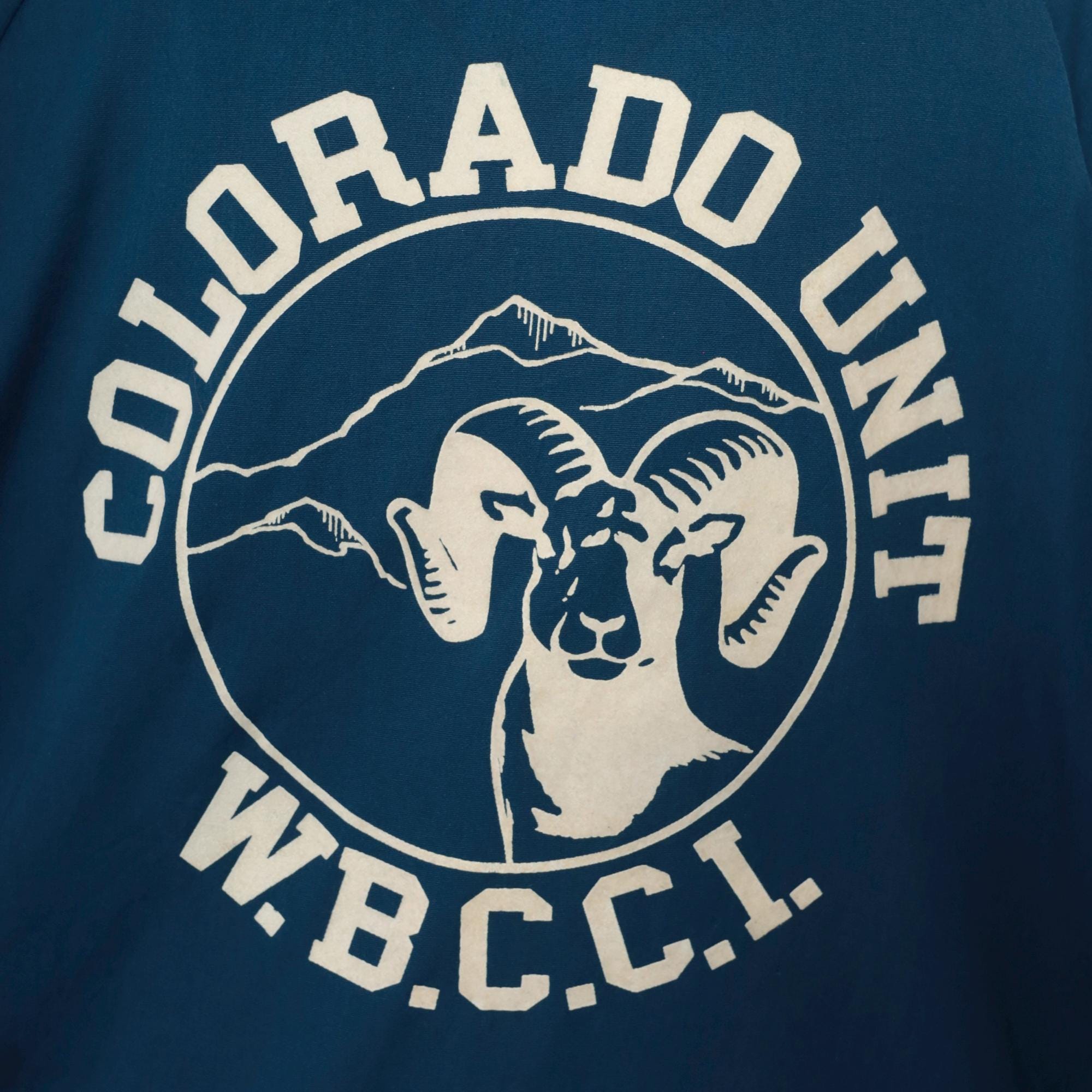 80s navy zip front jacket from Sports Master with a fold-down collar and snap tab closure at the neck. "Fritz" embroidered in cursive on the right chest panel. Large white screen-printed Colorado Unit W.B.C.C.I. graphic on the back with a bighorn ram and mountain scene inside a circular badge. Side seam pockets on both sides, straight hem, and long sleeves.