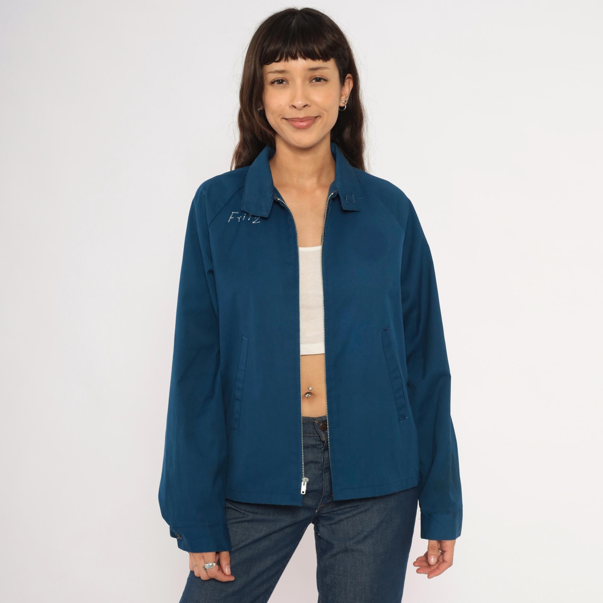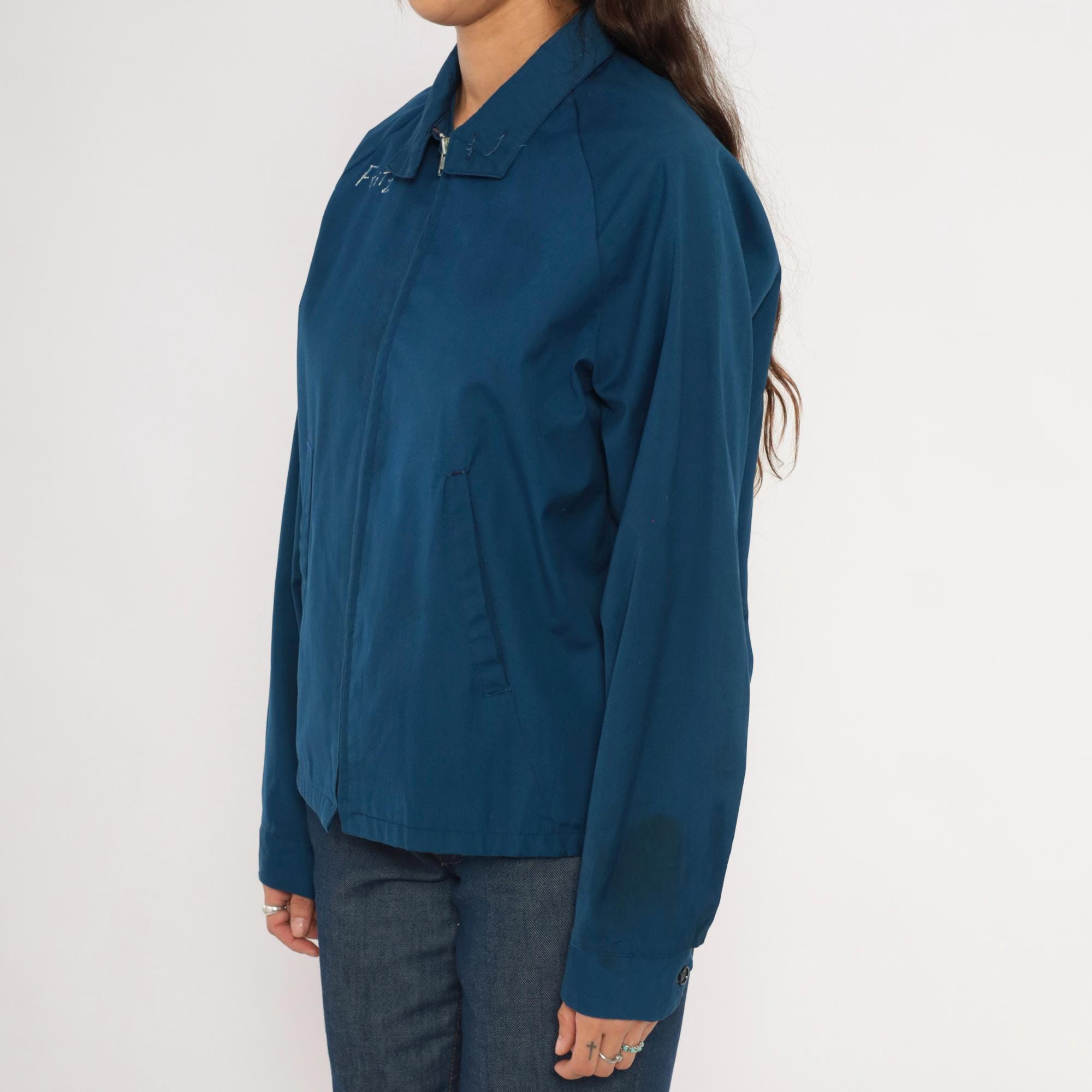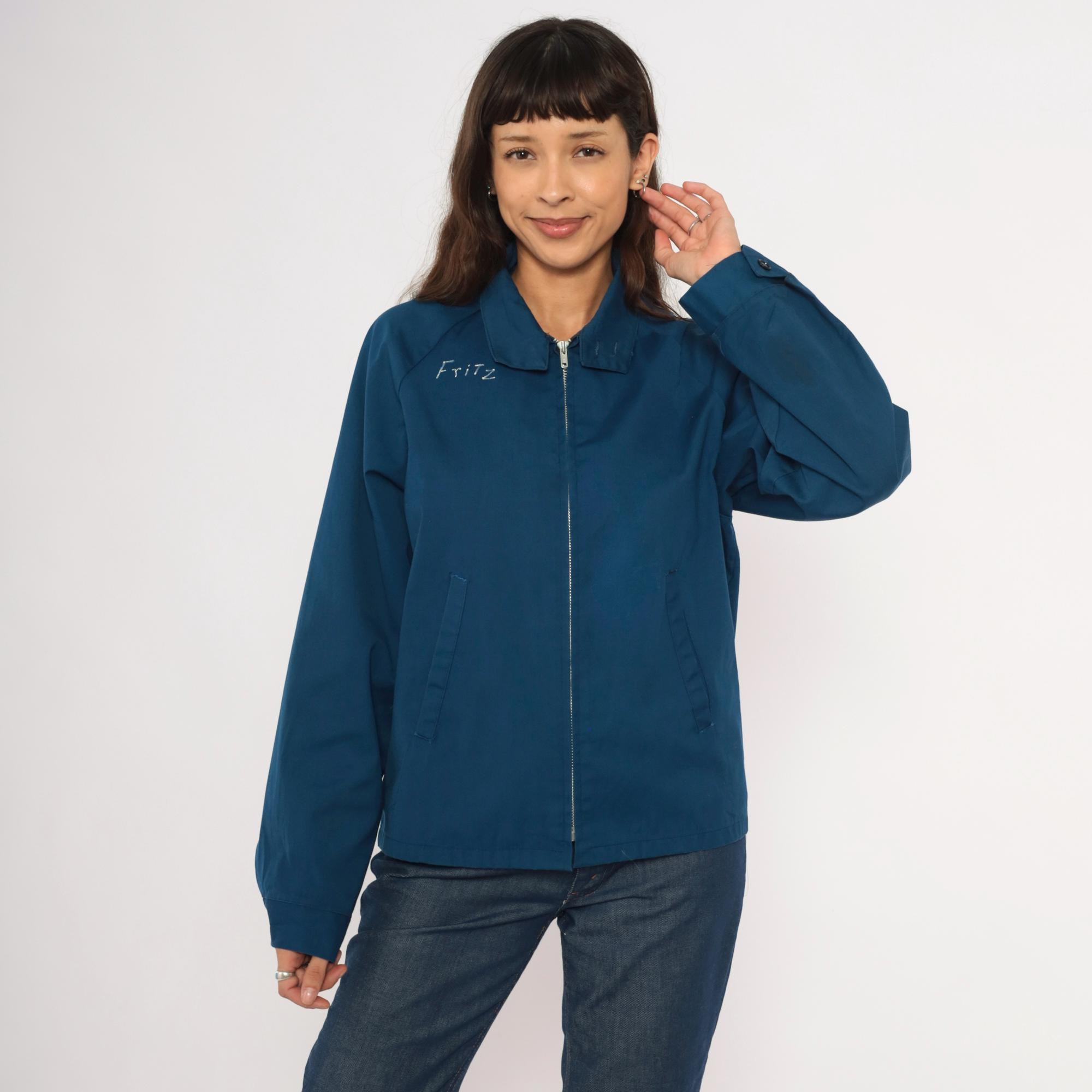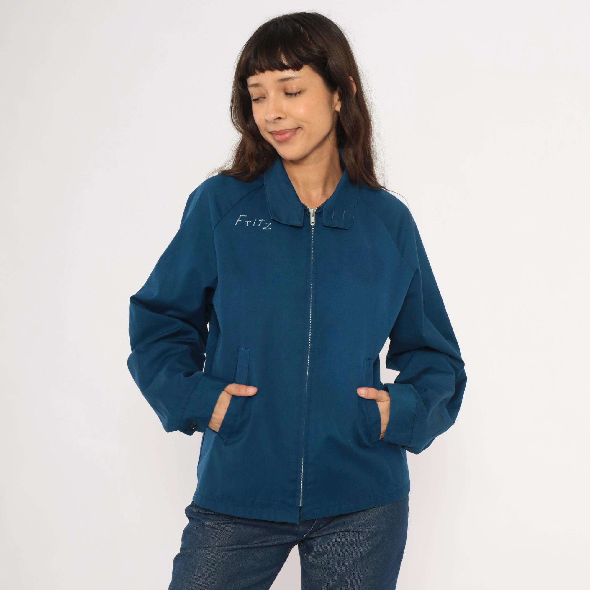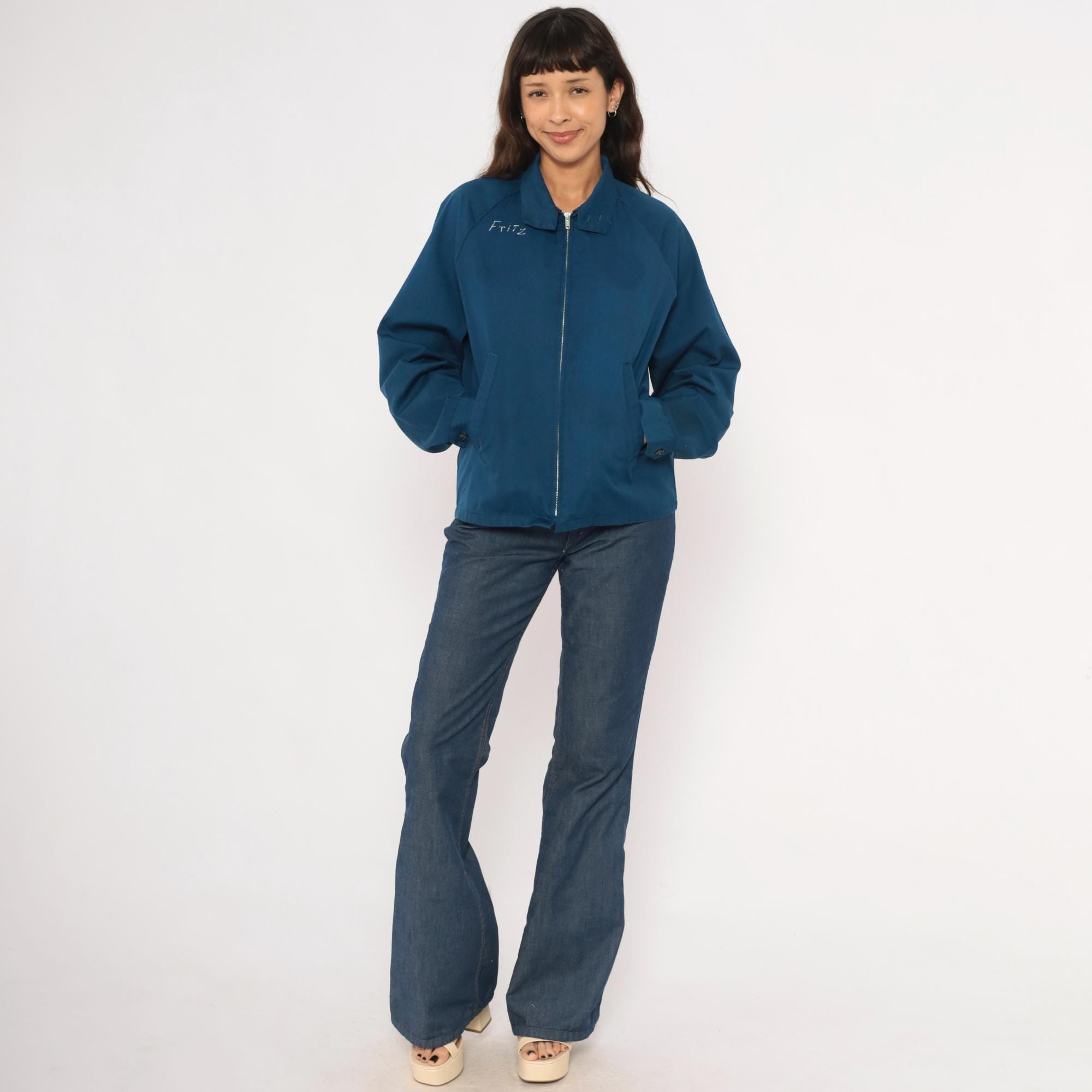 80s navy zip front jacket from Sports Master with a fold-down collar and snap tab closure at the neck. "Fritz" embroidered in cursive on the right chest panel. Large white screen-printed Colorado Unit W.B.C.C.I. graphic on the back with a bighorn ram and mountain scene inside a circular badge. Side seam pockets on both sides, straight hem, and long sleeves.