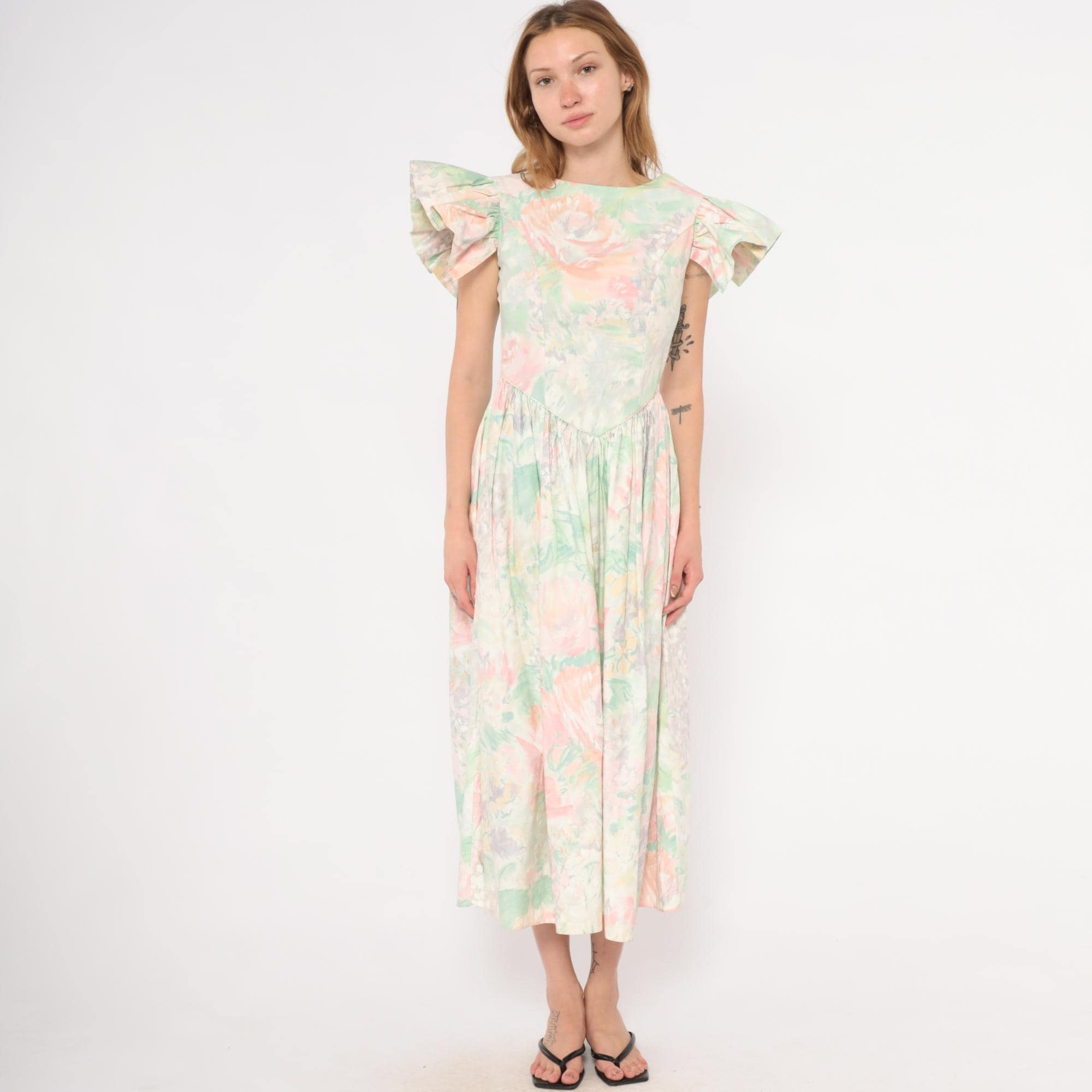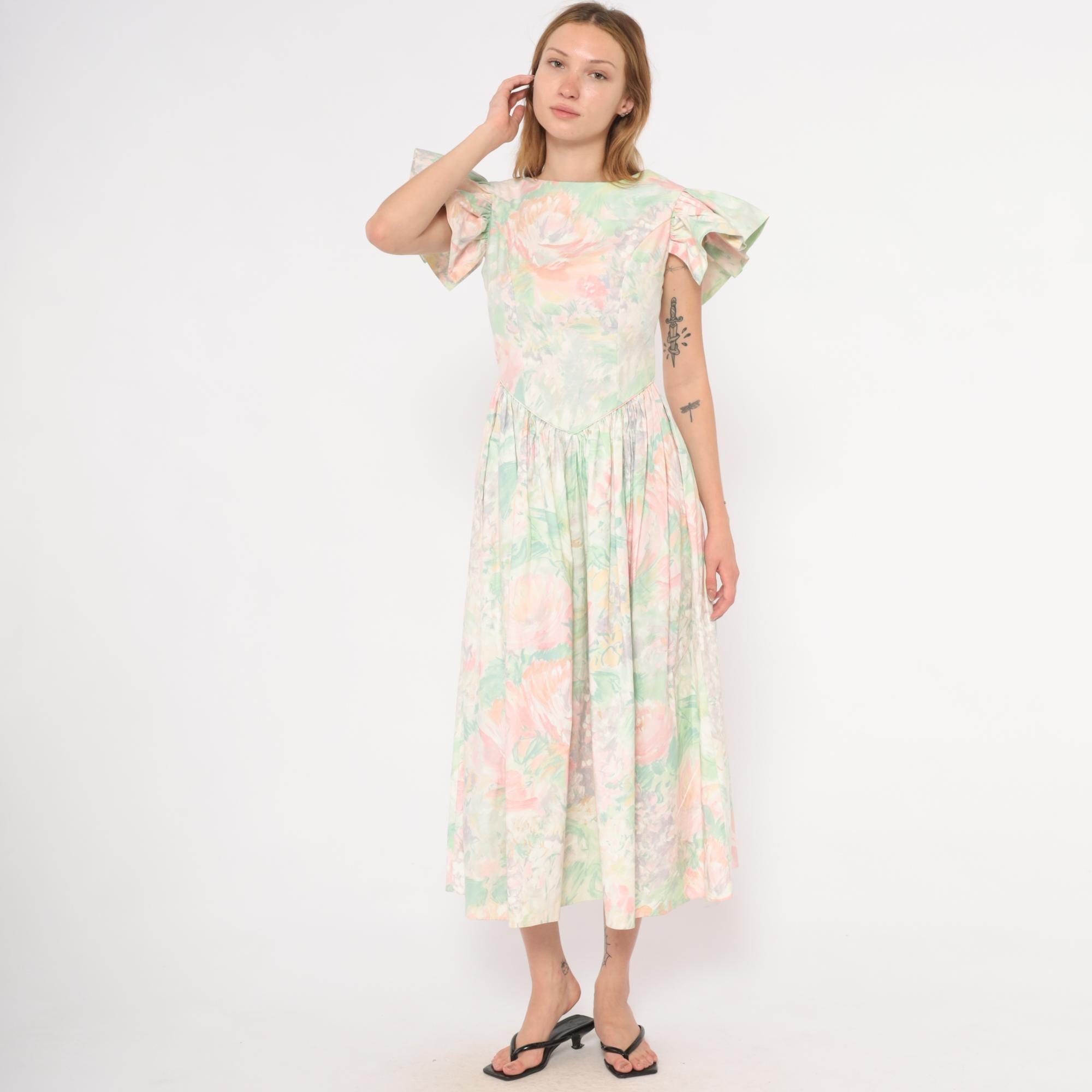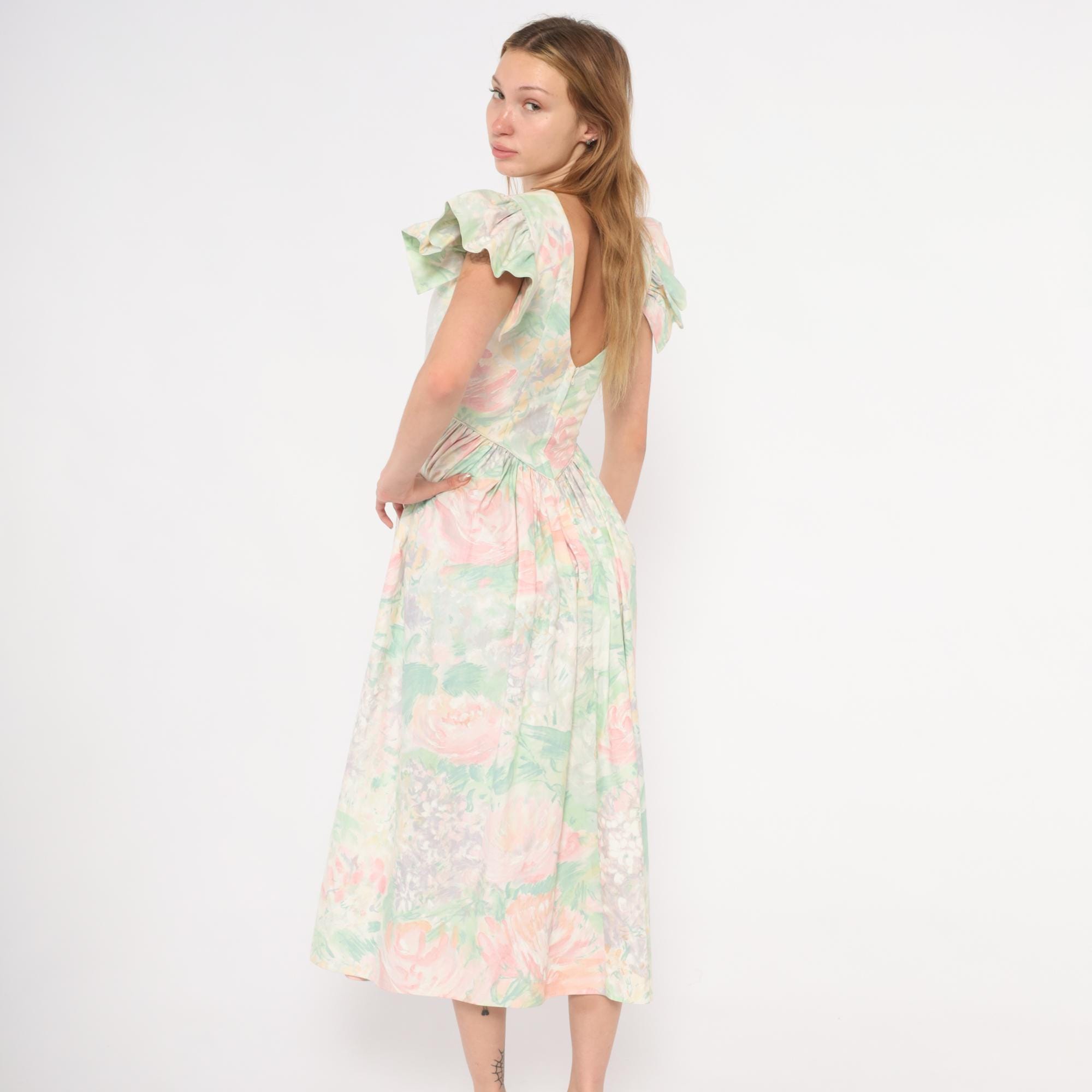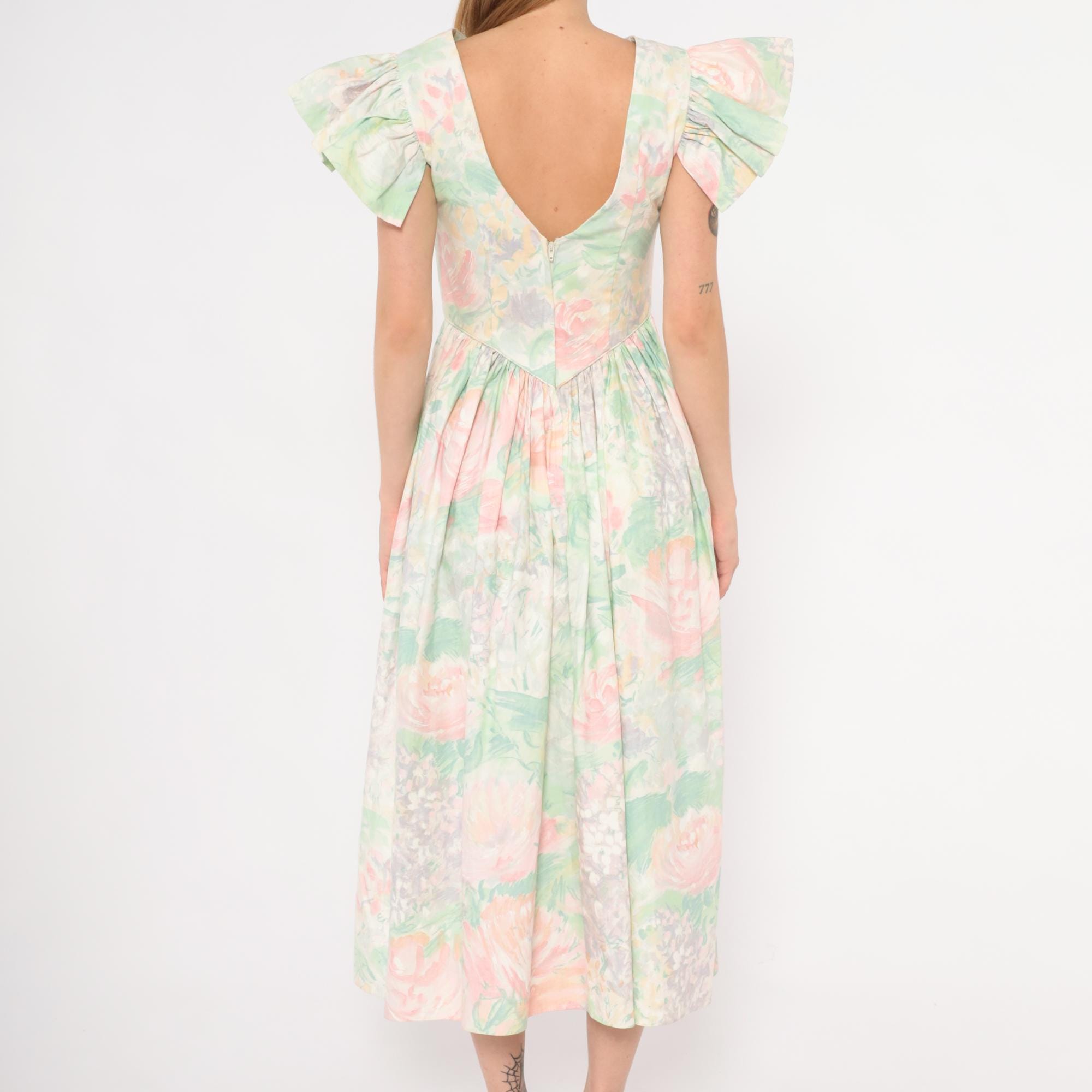 90s pastel floral midi dress from JCPenney with a watercolor rose print in pink, mint green, and lavender across an ivory base. Fitted bodice with a pointed basque waistline, gathered full skirt, and dramatic flutter cap sleeves. Scoop neckline at the front with a V-shaped open back and zipper closure. No pockets.