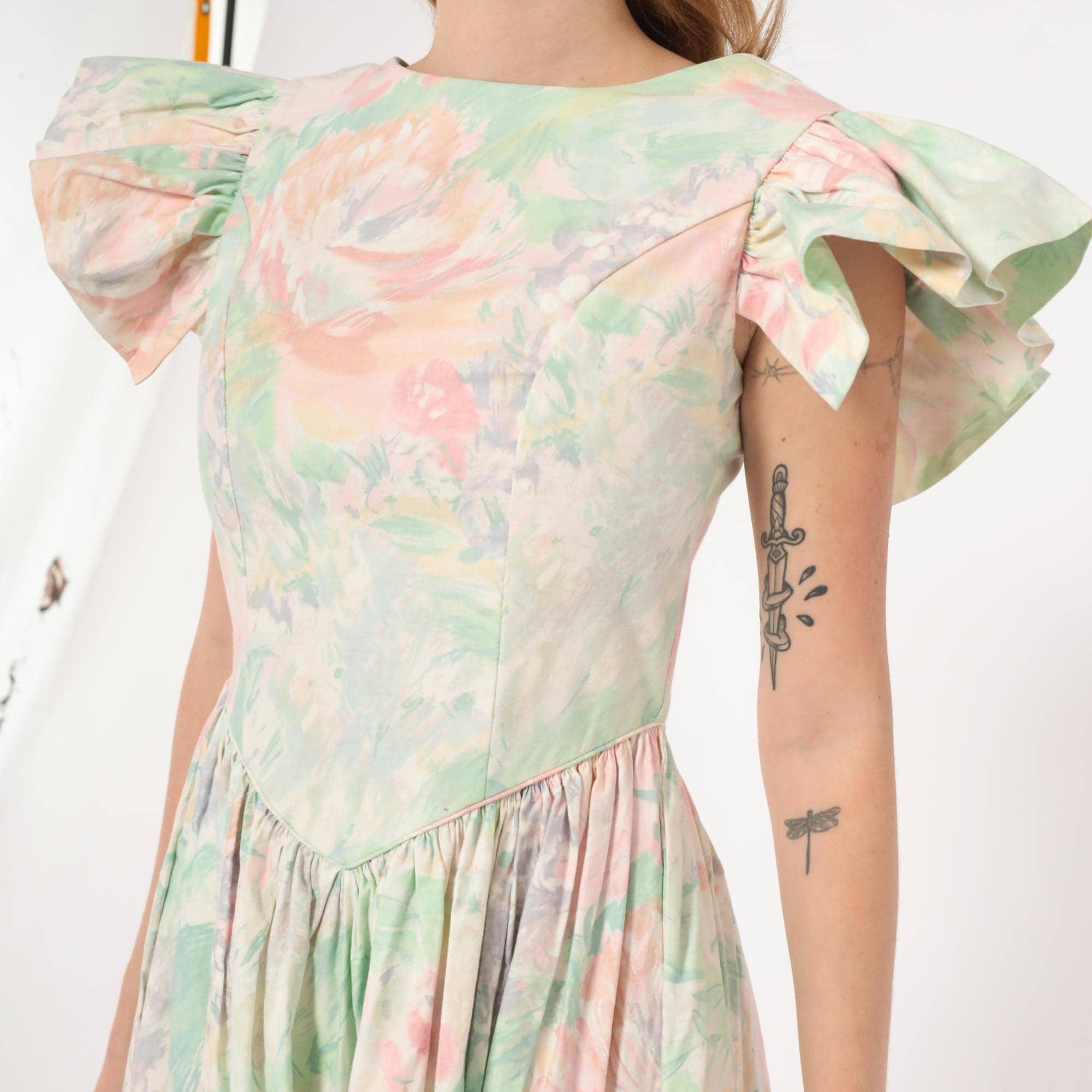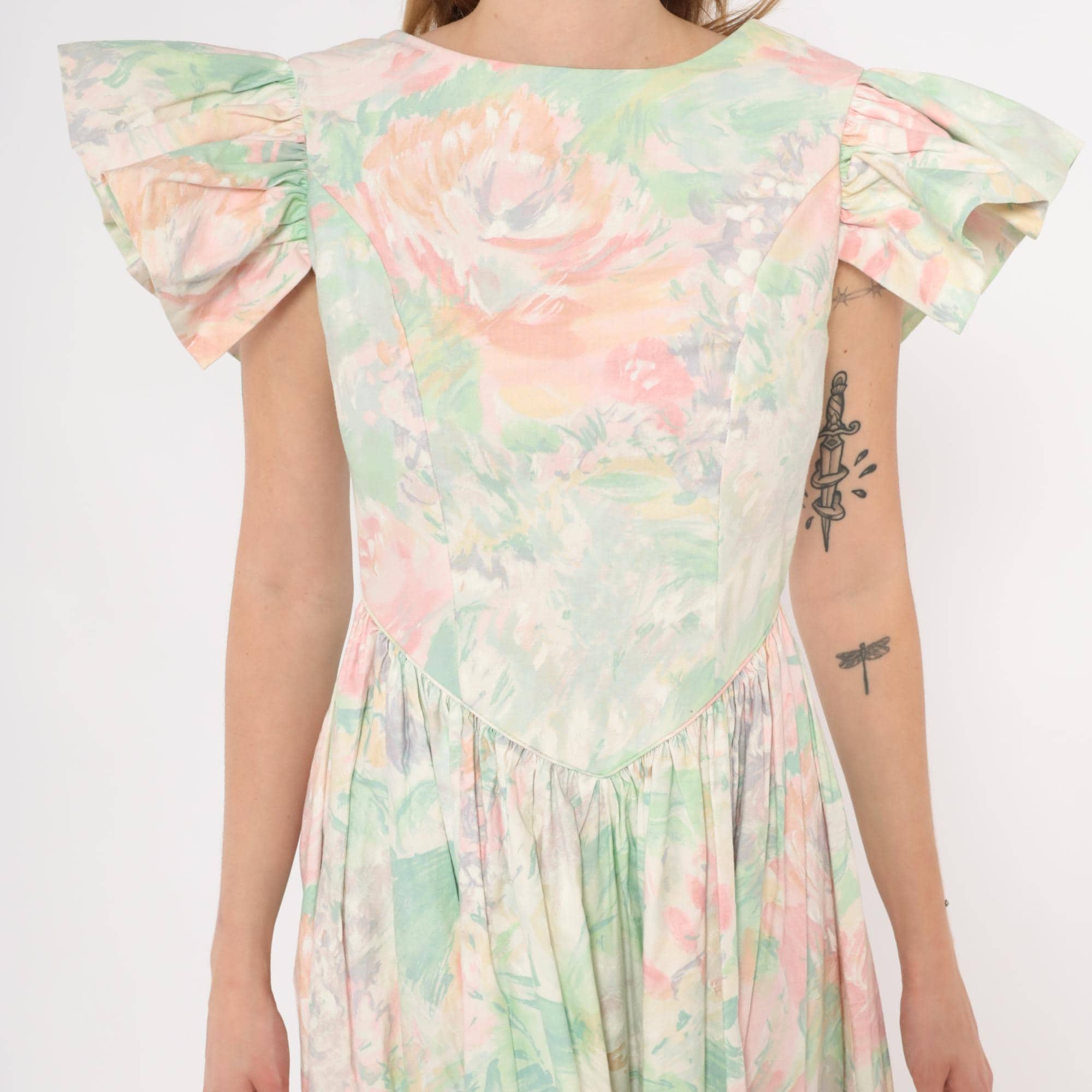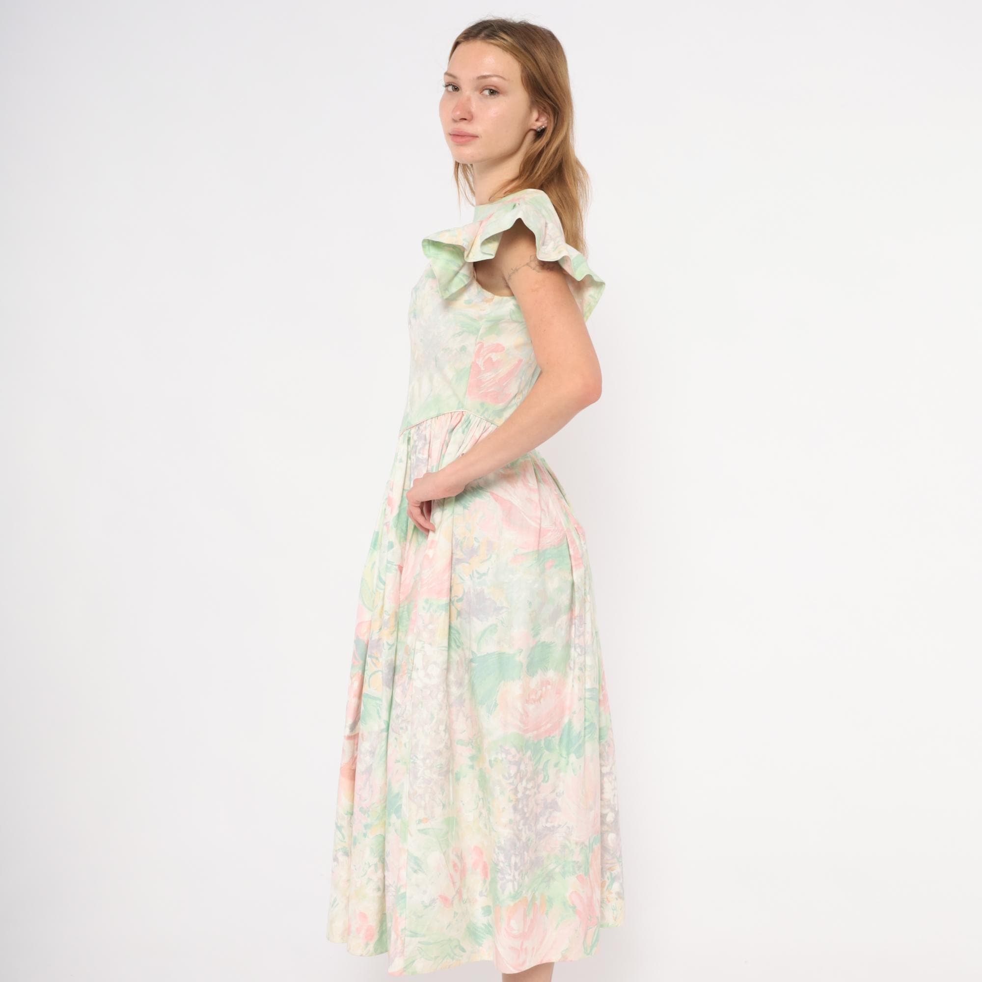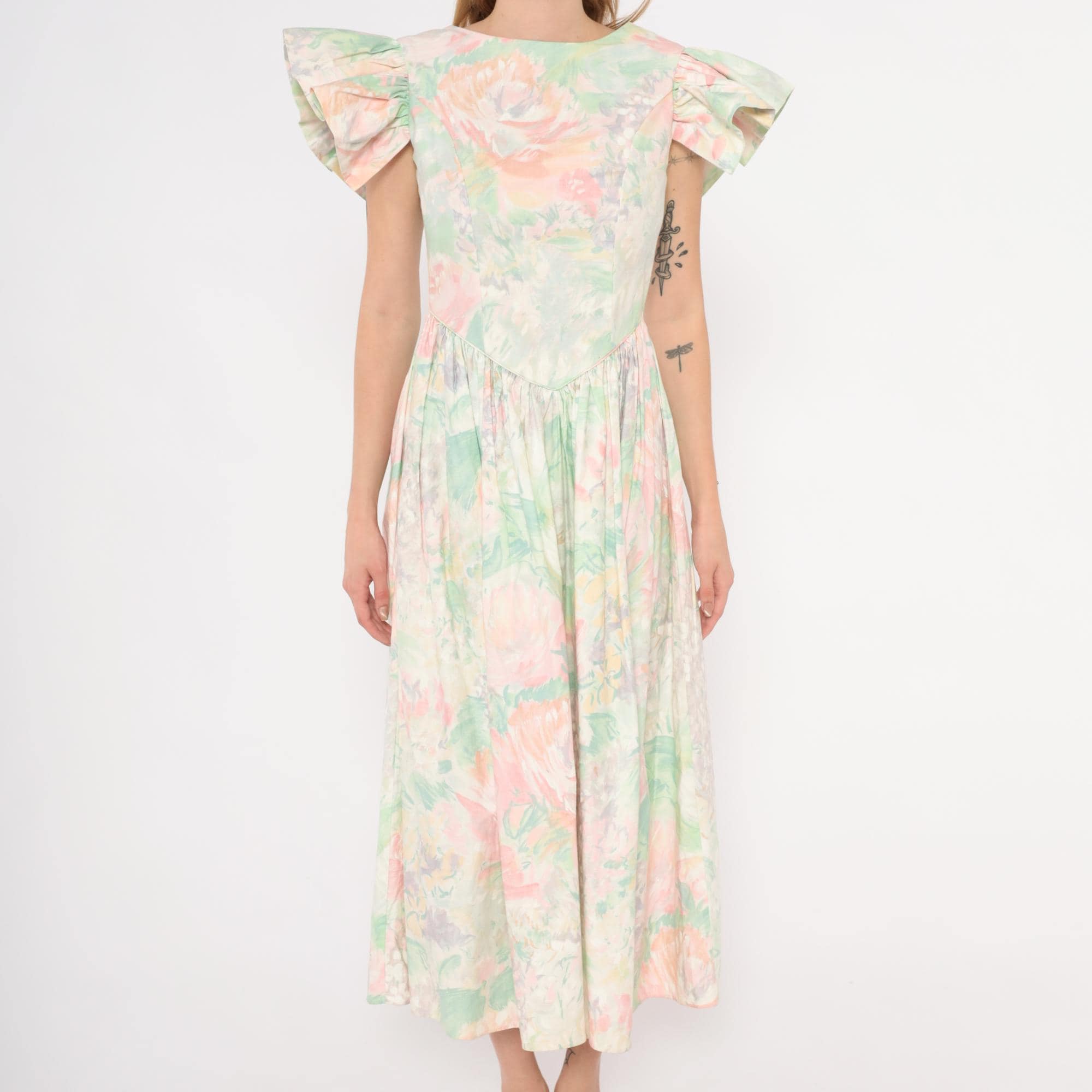 90s pastel floral midi dress from JCPenney with a watercolor rose print in pink, mint green, and lavender across an ivory base. Fitted bodice with a pointed basque waistline, gathered full skirt, and dramatic flutter cap sleeves. Scoop neckline at the front with a V-shaped open back and zipper closure. No pockets.