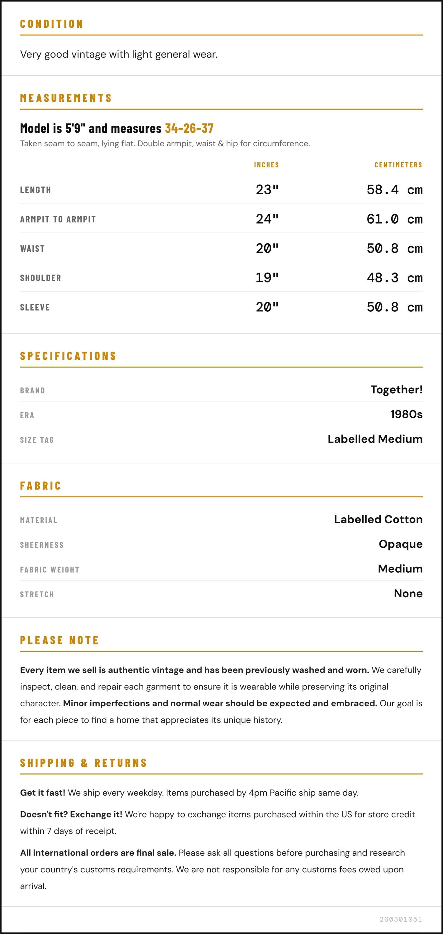✨ Please see measurements and condition below. Every garment we sell is authentic vintage and one-of-a-kind! You will receive the exact item photographed.