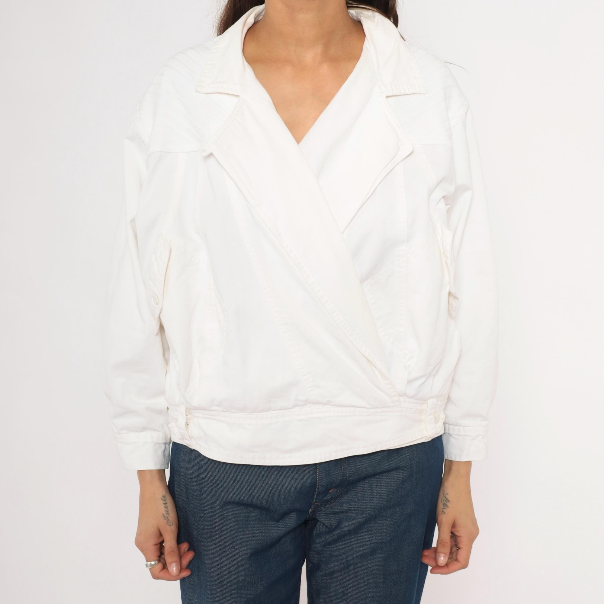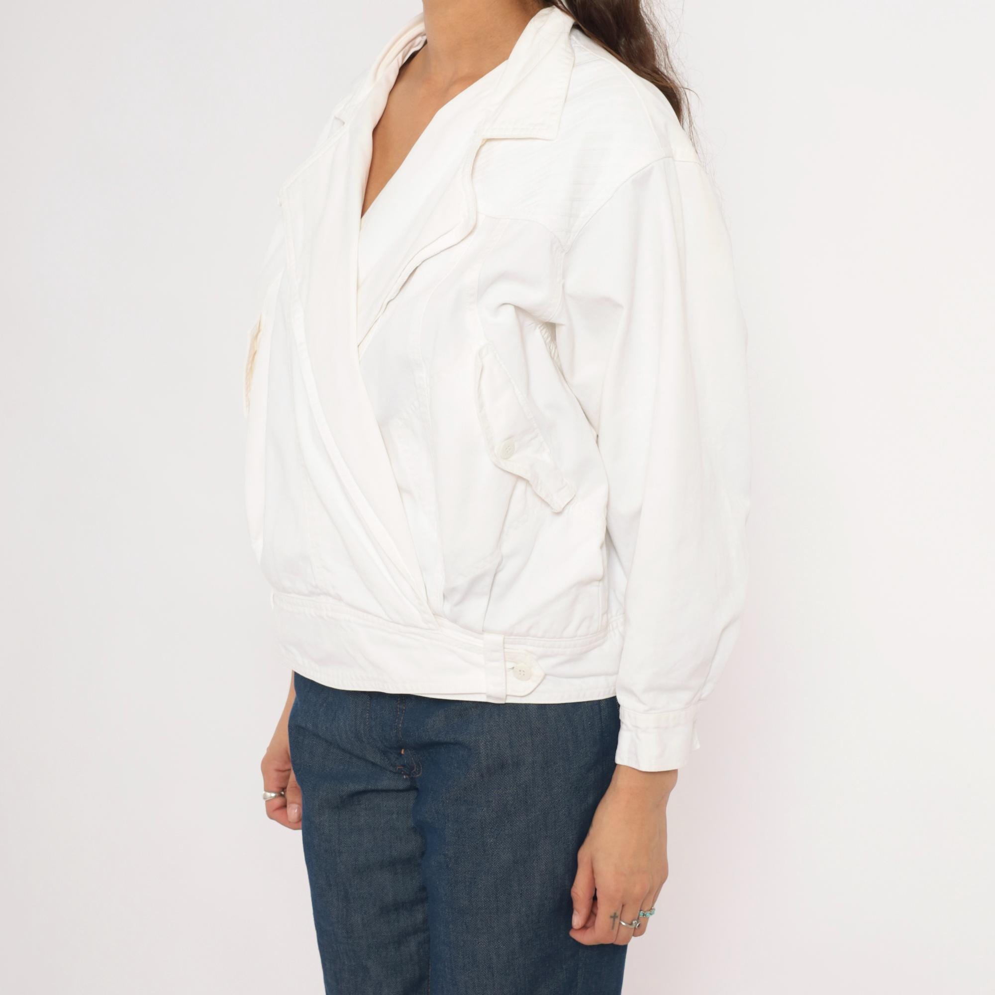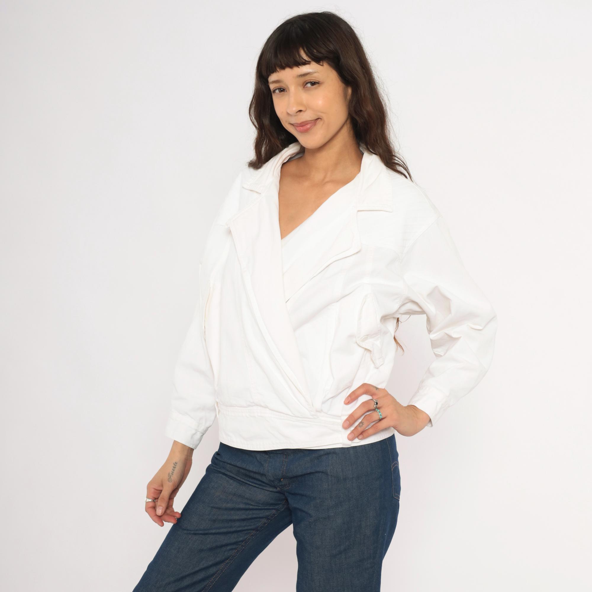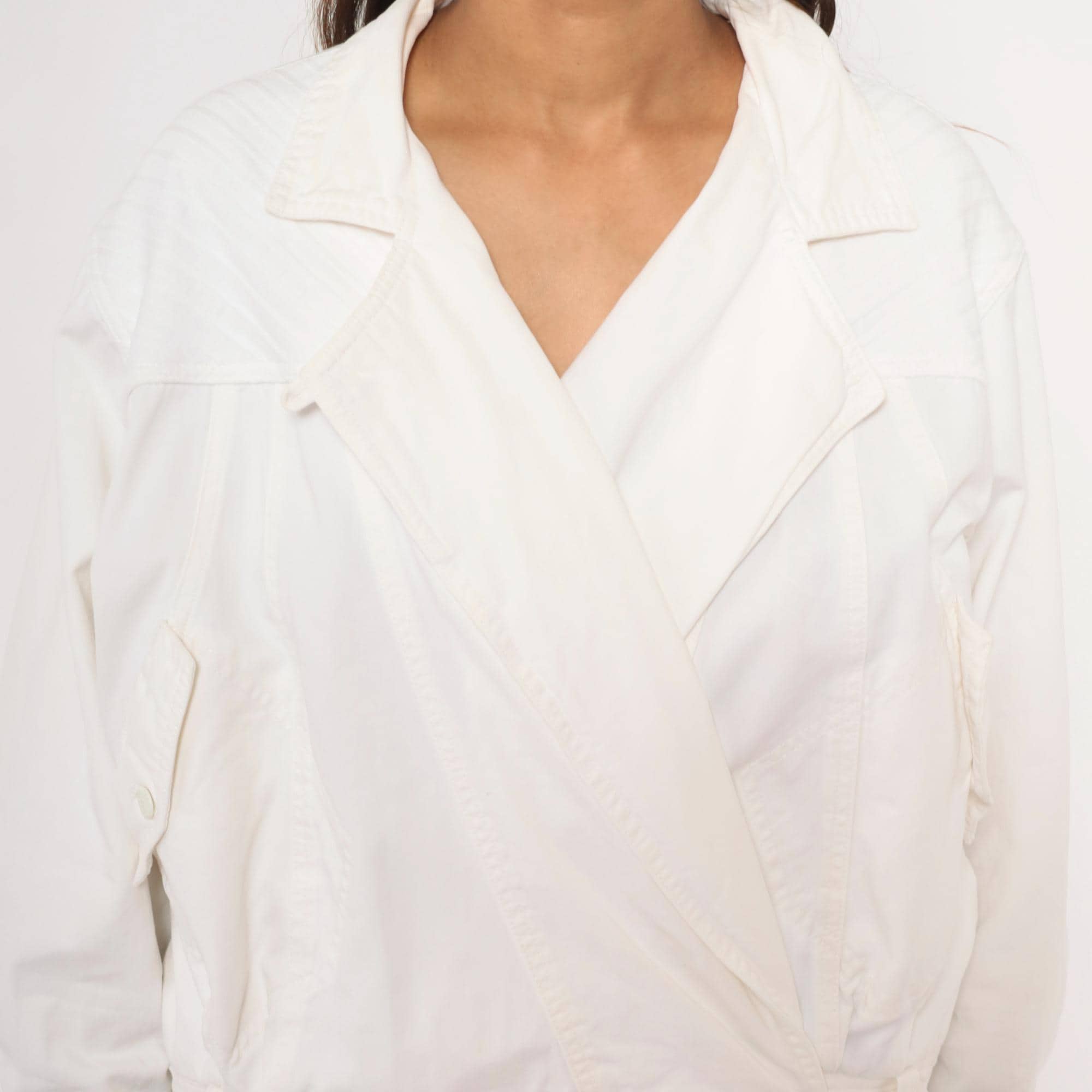 80s wrap front jacket from Together! in white with a notched lapel collar and deep V neckline. Cross-over front closure with button detail, front patch pockets, and quilted stitching on the shoulder panels. Cropped blouson body with an elasticized waistband and long sleeves gathered at the cuffs.