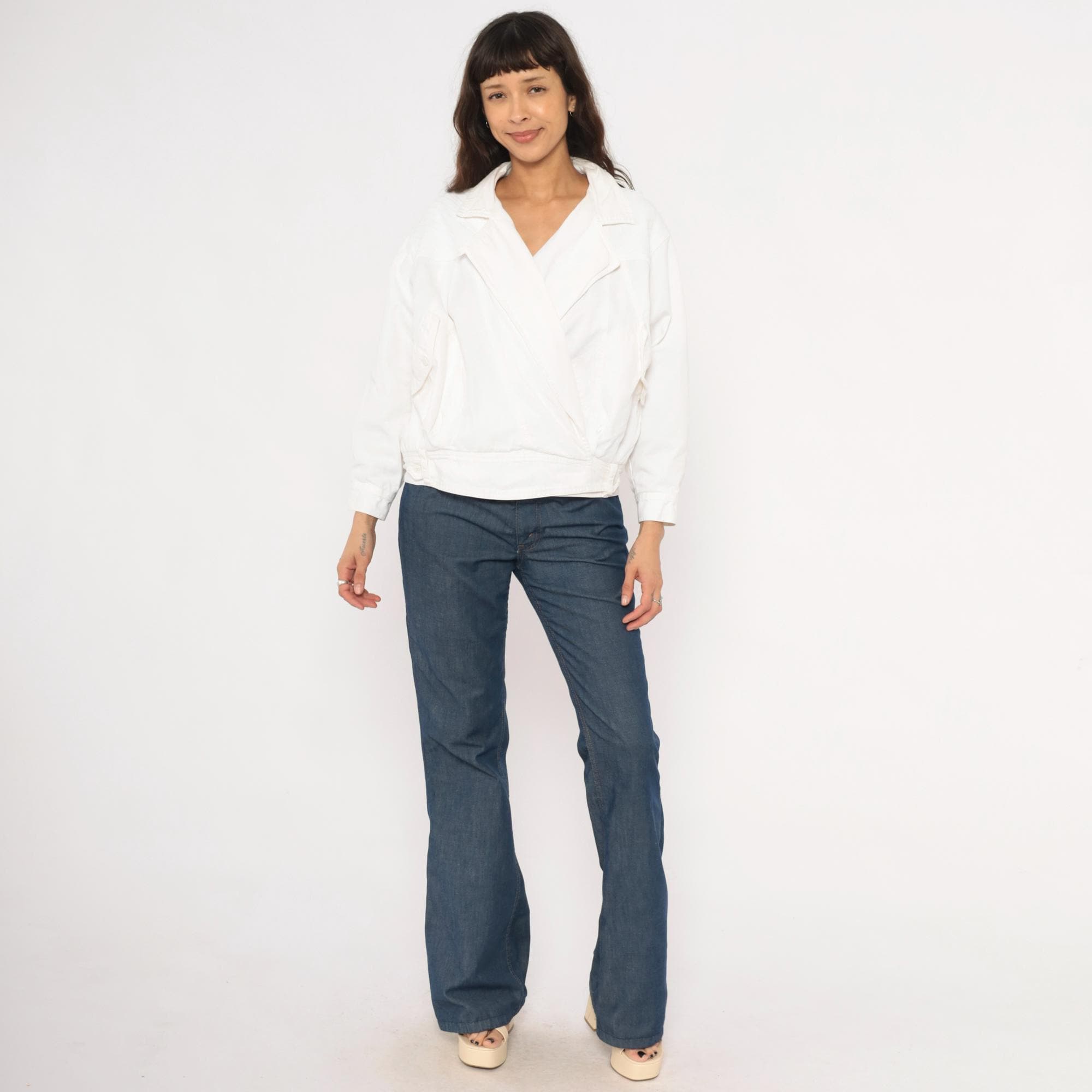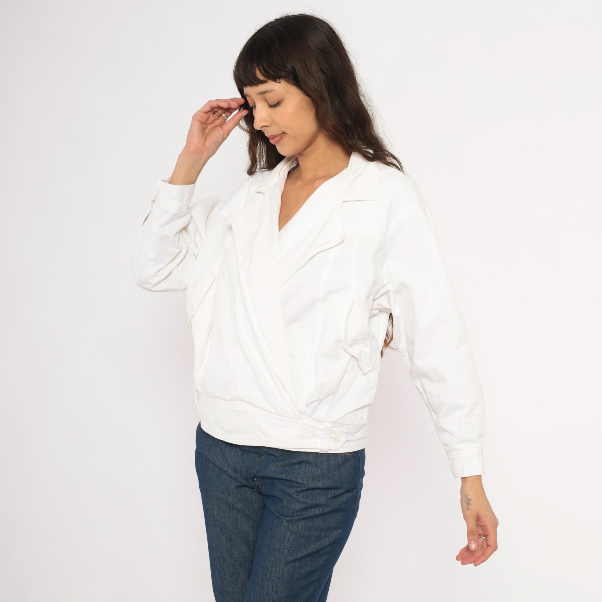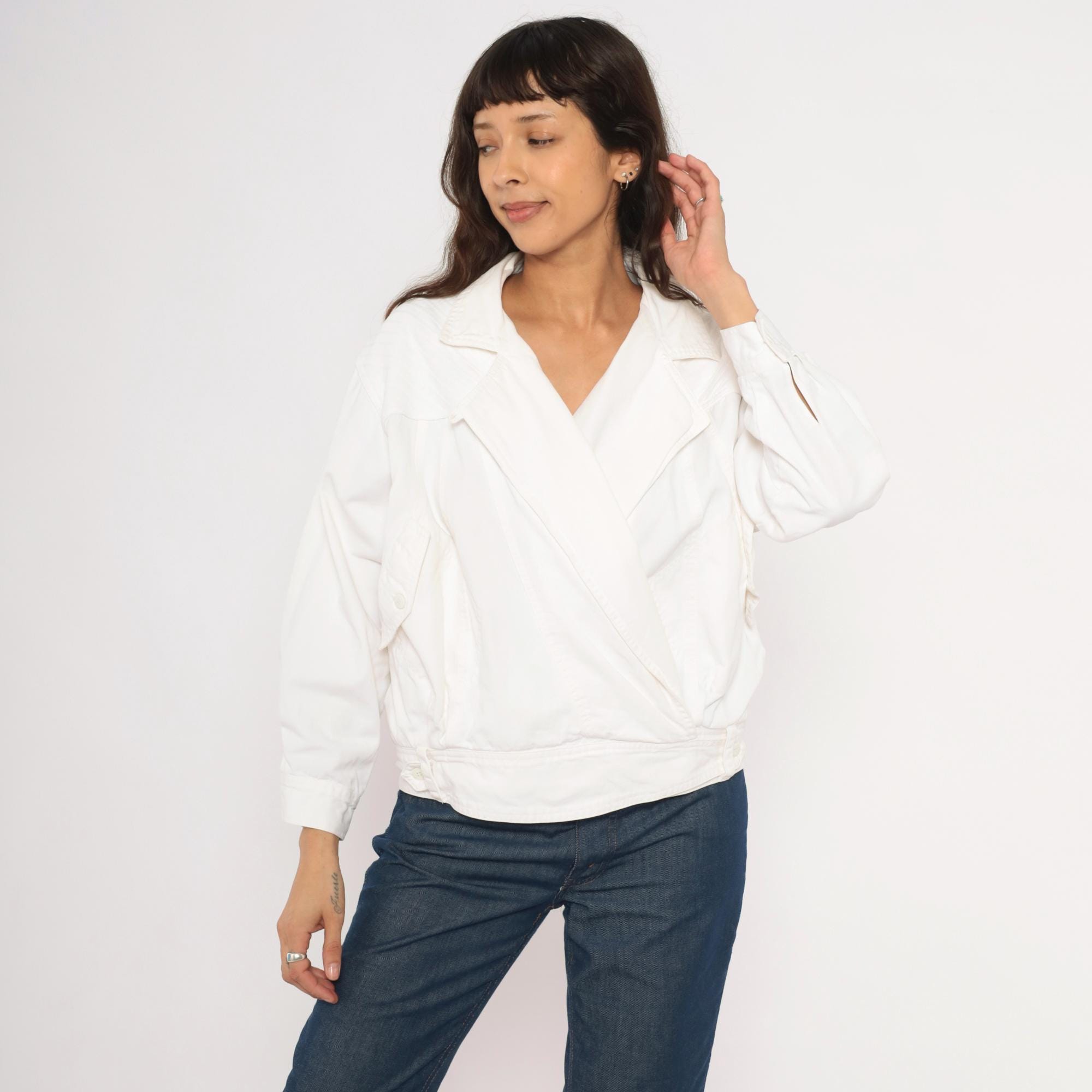 80s wrap front jacket from Together! in white with a notched lapel collar and deep V neckline. Cross-over front closure with button detail, front patch pockets, and quilted stitching on the shoulder panels. Cropped blouson body with an elasticized waistband and long sleeves gathered at the cuffs.