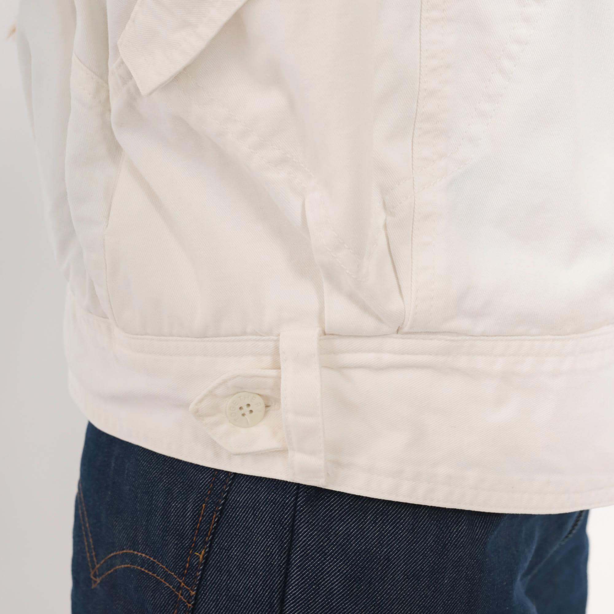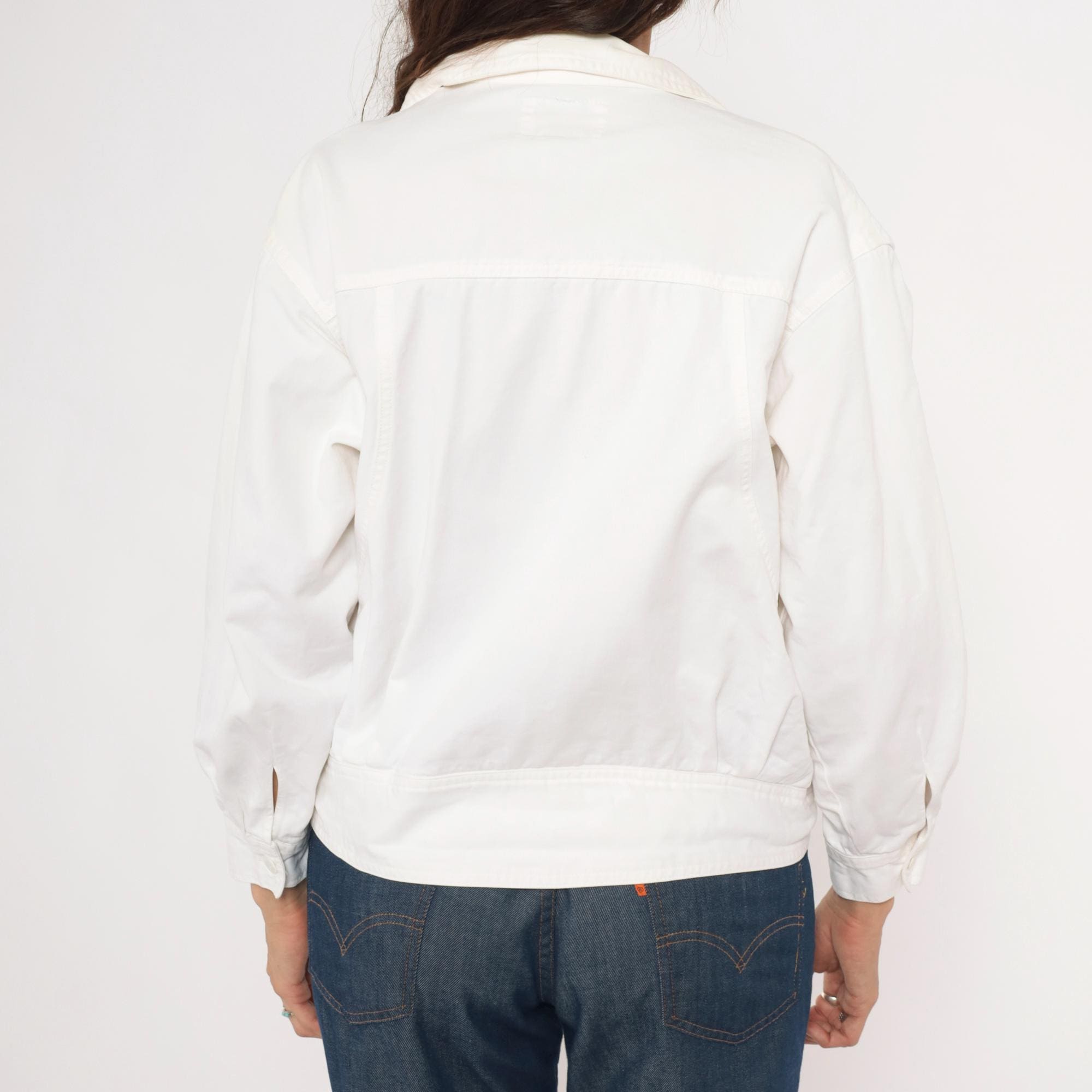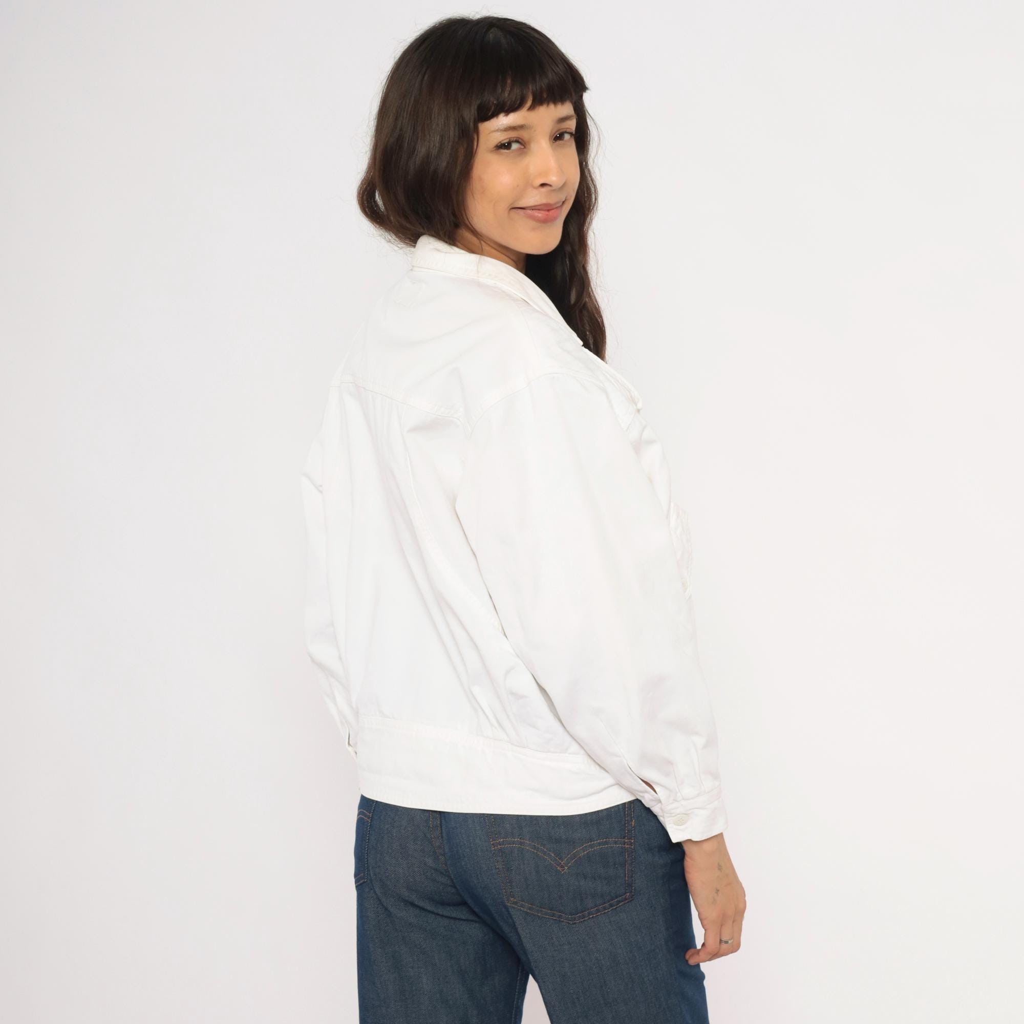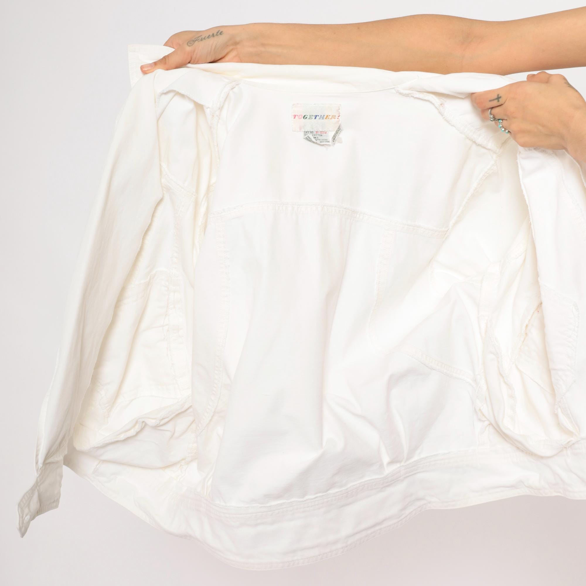80s wrap front jacket from Together! in white with a notched lapel collar and deep V neckline. Cross-over front closure with button detail, front patch pockets, and quilted stitching on the shoulder panels. Cropped blouson body with an elasticized waistband and long sleeves gathered at the cuffs.