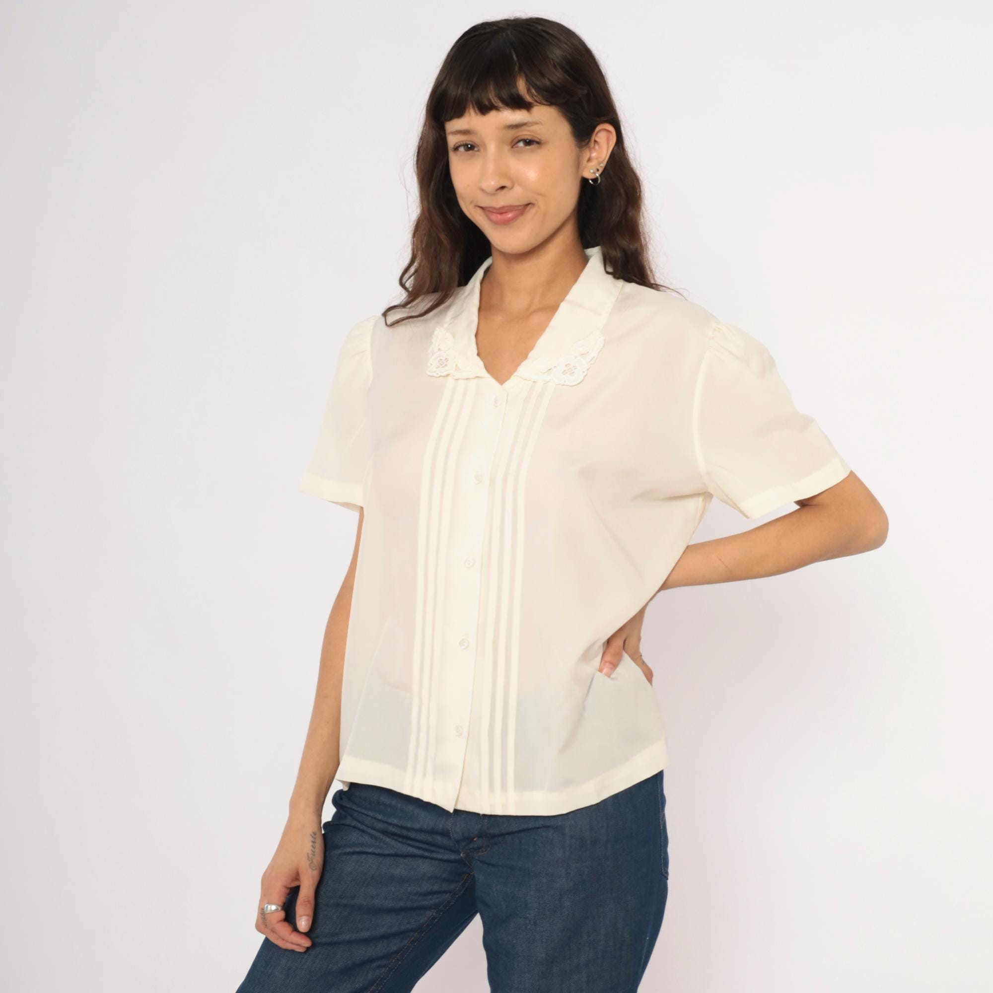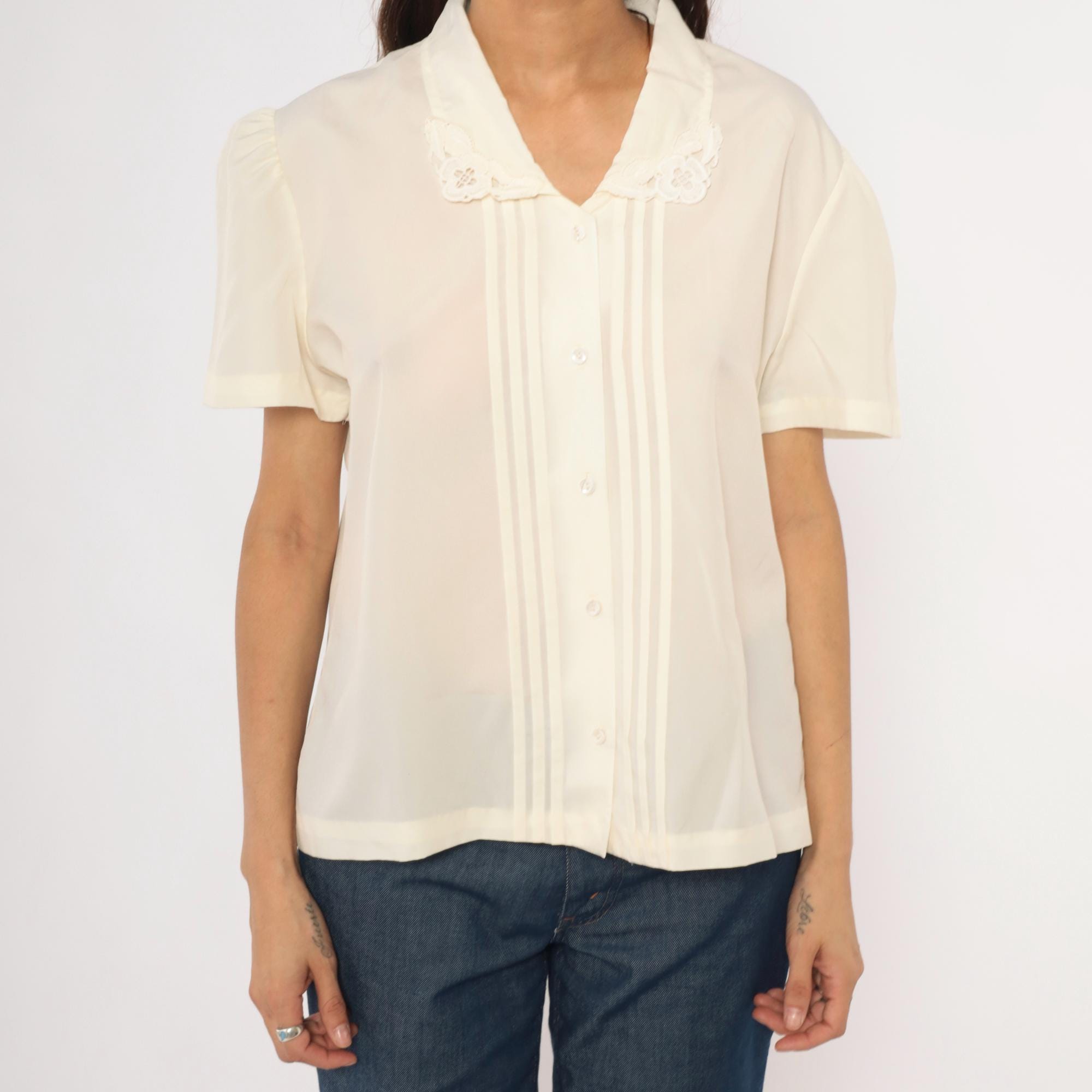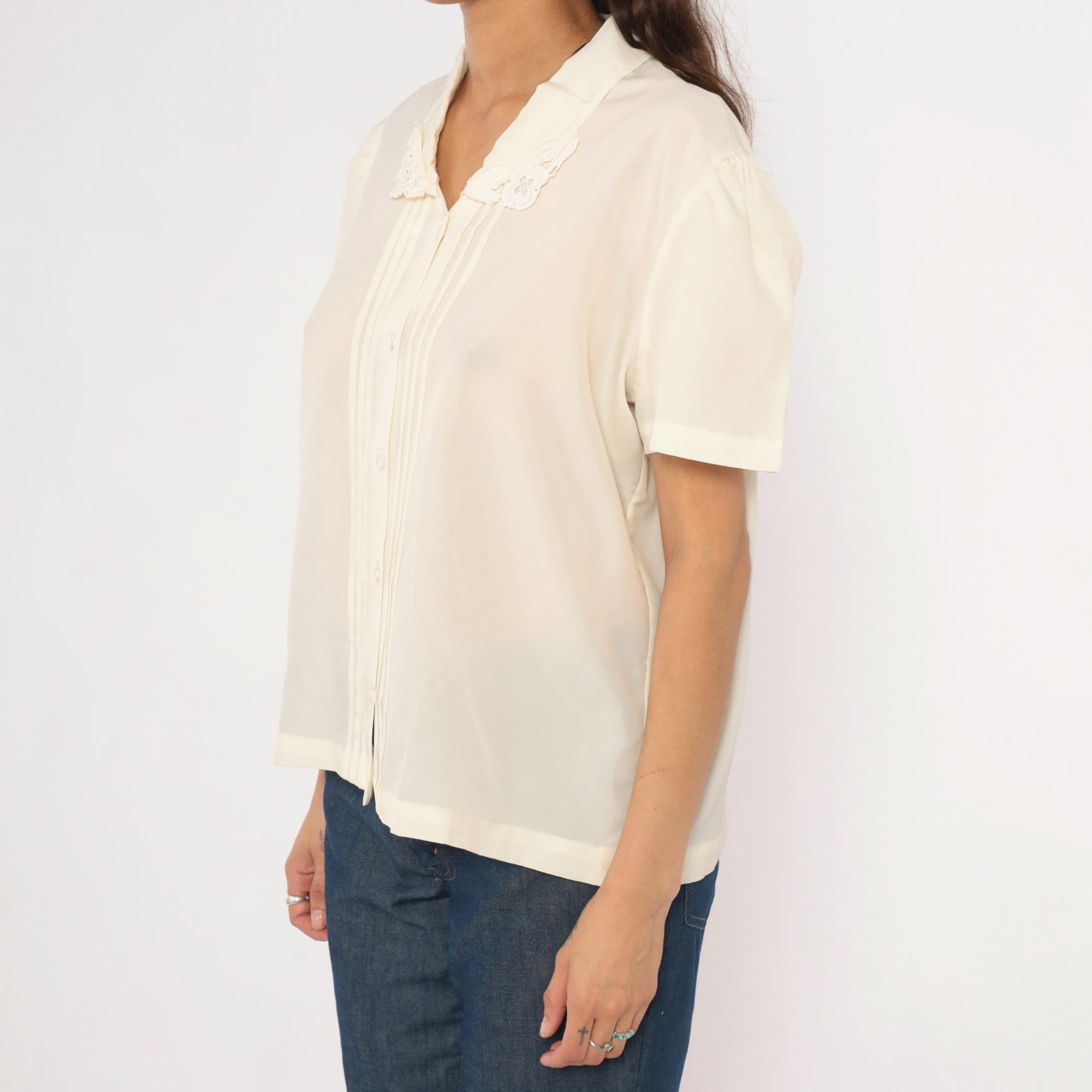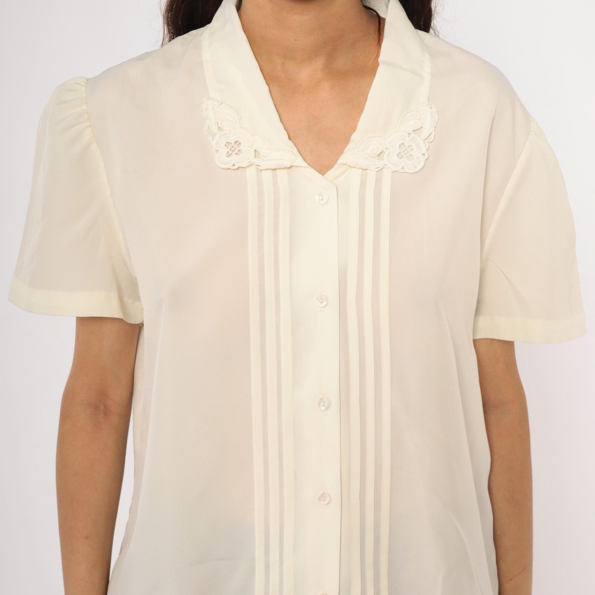 70s cream button front blouse with a V-neck lace collar trimmed in scalloped embroidered floral cutwork. Vertical pintuck pleats run down the center front placket, with gathered puff sleeves at the shoulders. Clear matching buttons close the front, and the back is plain with a relaxed, straight body.