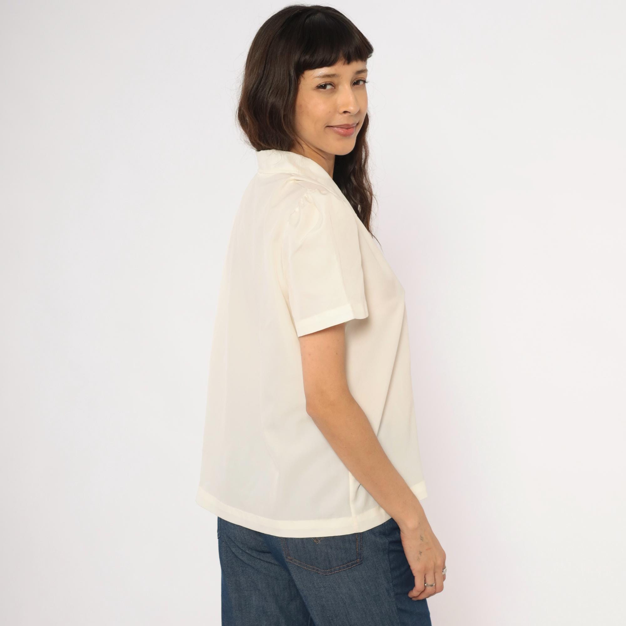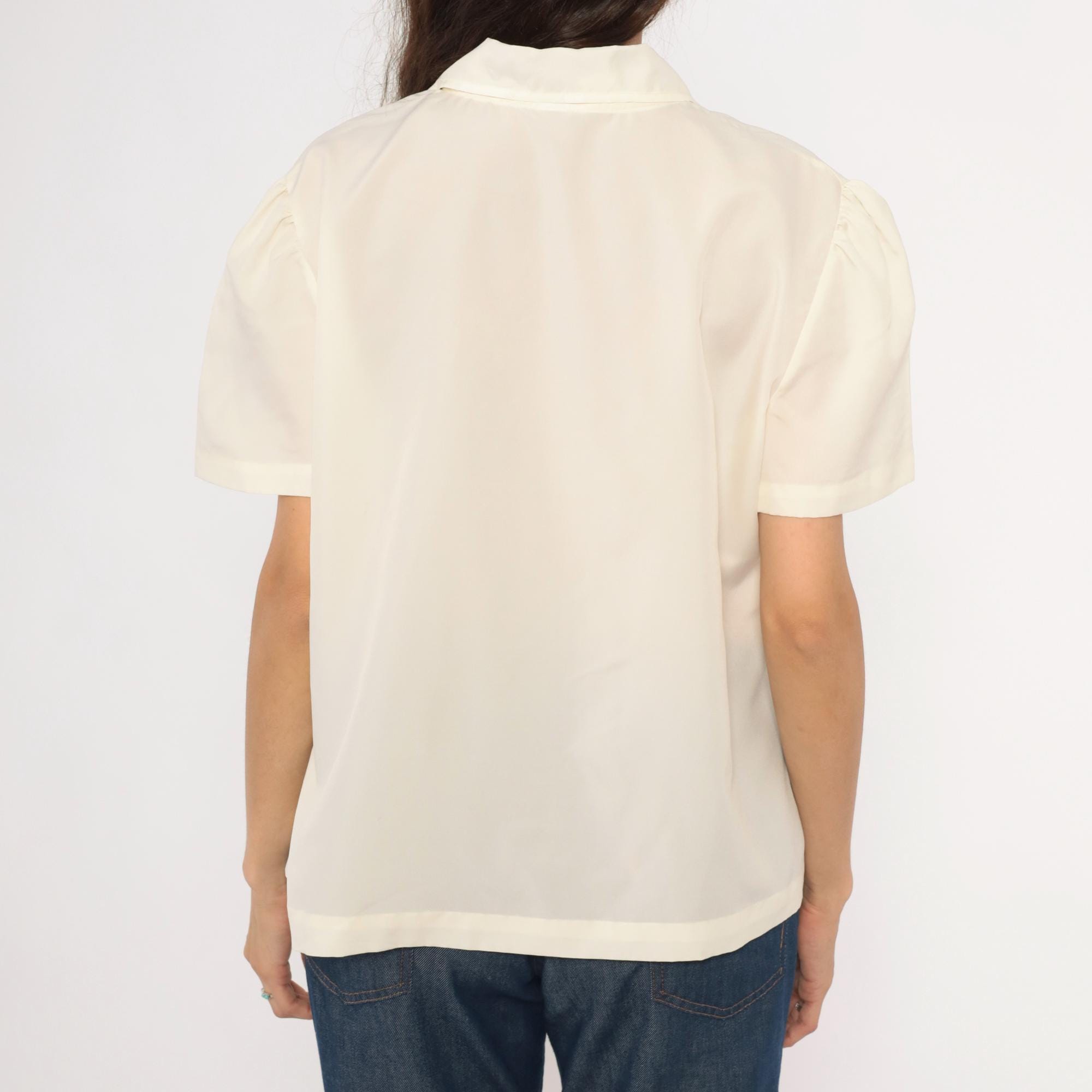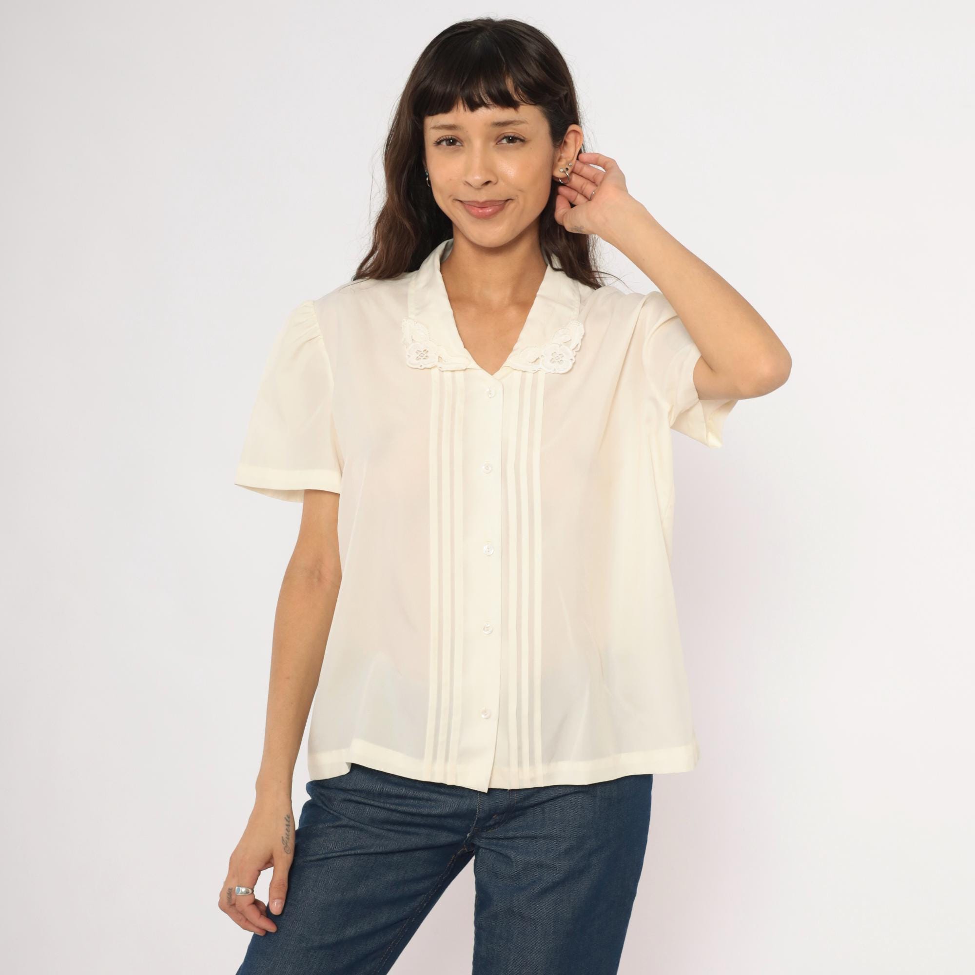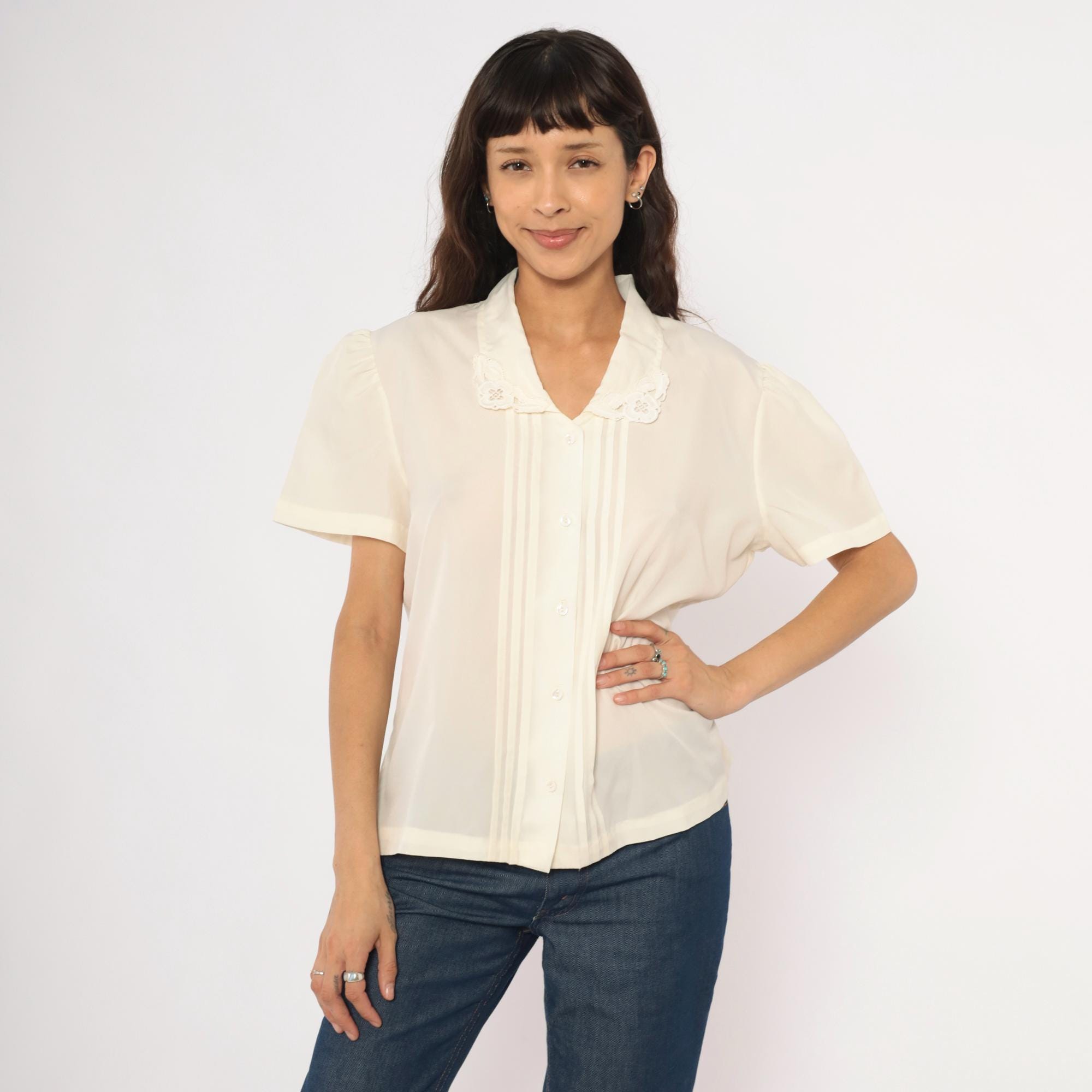 70s cream button front blouse with a V-neck lace collar trimmed in scalloped embroidered floral cutwork. Vertical pintuck pleats run down the center front placket, with gathered puff sleeves at the shoulders. Clear matching buttons close the front, and the back is plain with a relaxed, straight body.