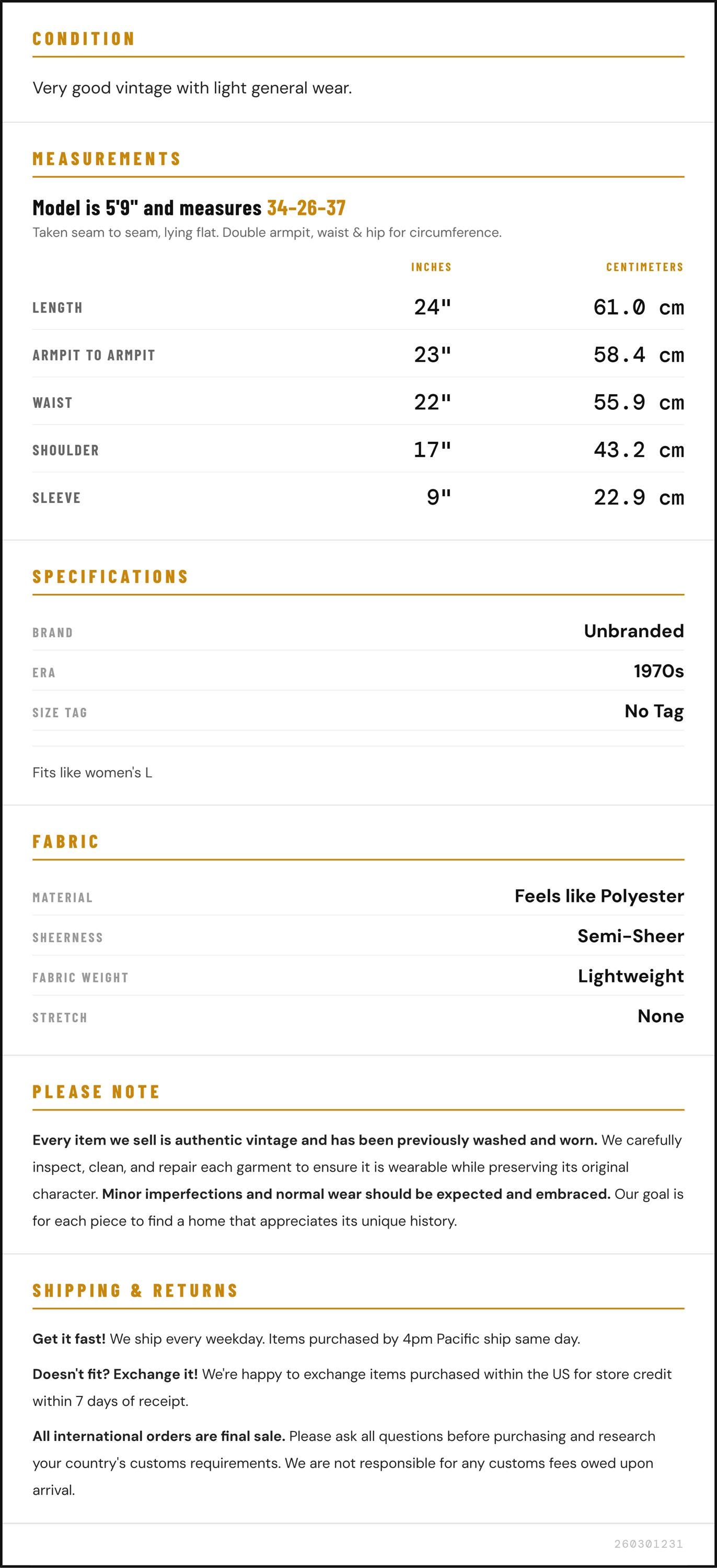 Measurements are taken laying flat and should be doubled where applicable. The "best fits" size is just an estimate, and vintage sizing can vary from modern sizing. Please use measurements to ensure proper fit. The best thing to do is measure a similar item of your own, and compare. When an item has stretch, we will list the unstretched dimensions with the stretched measurement afterwards.