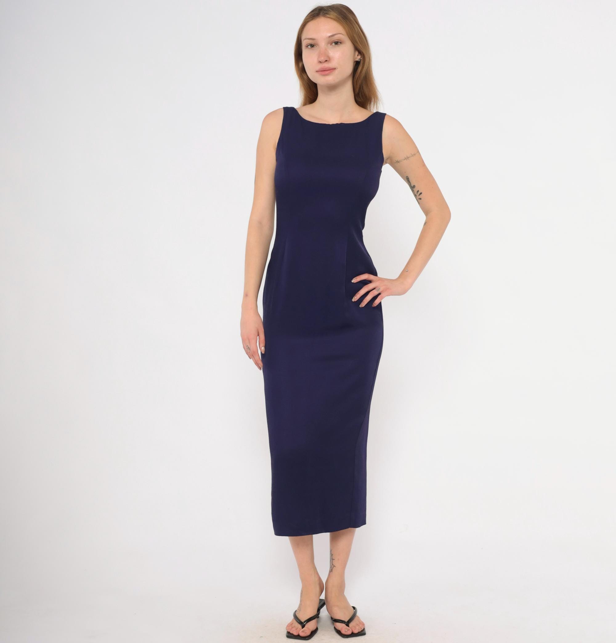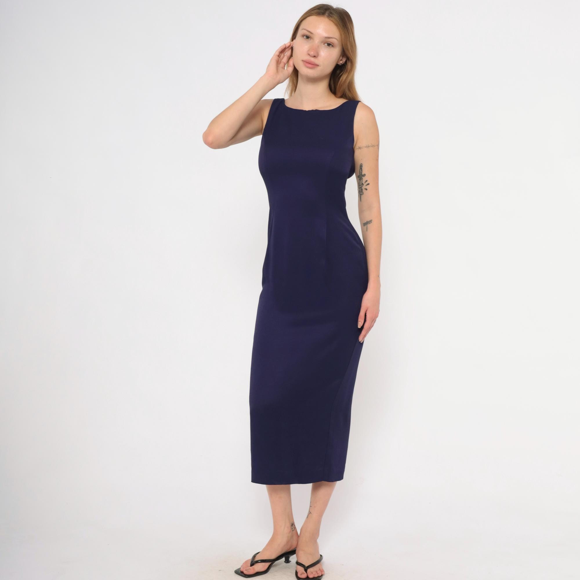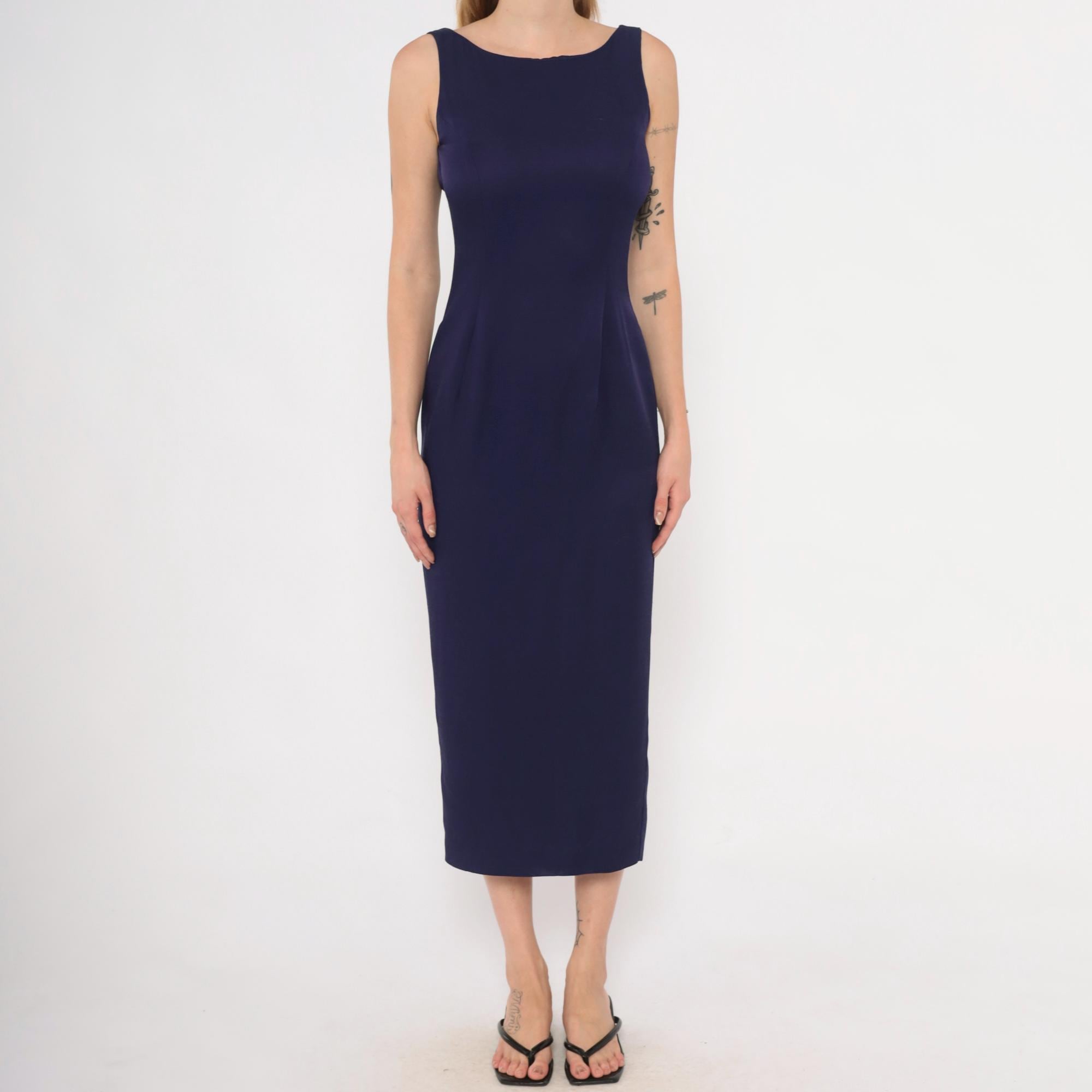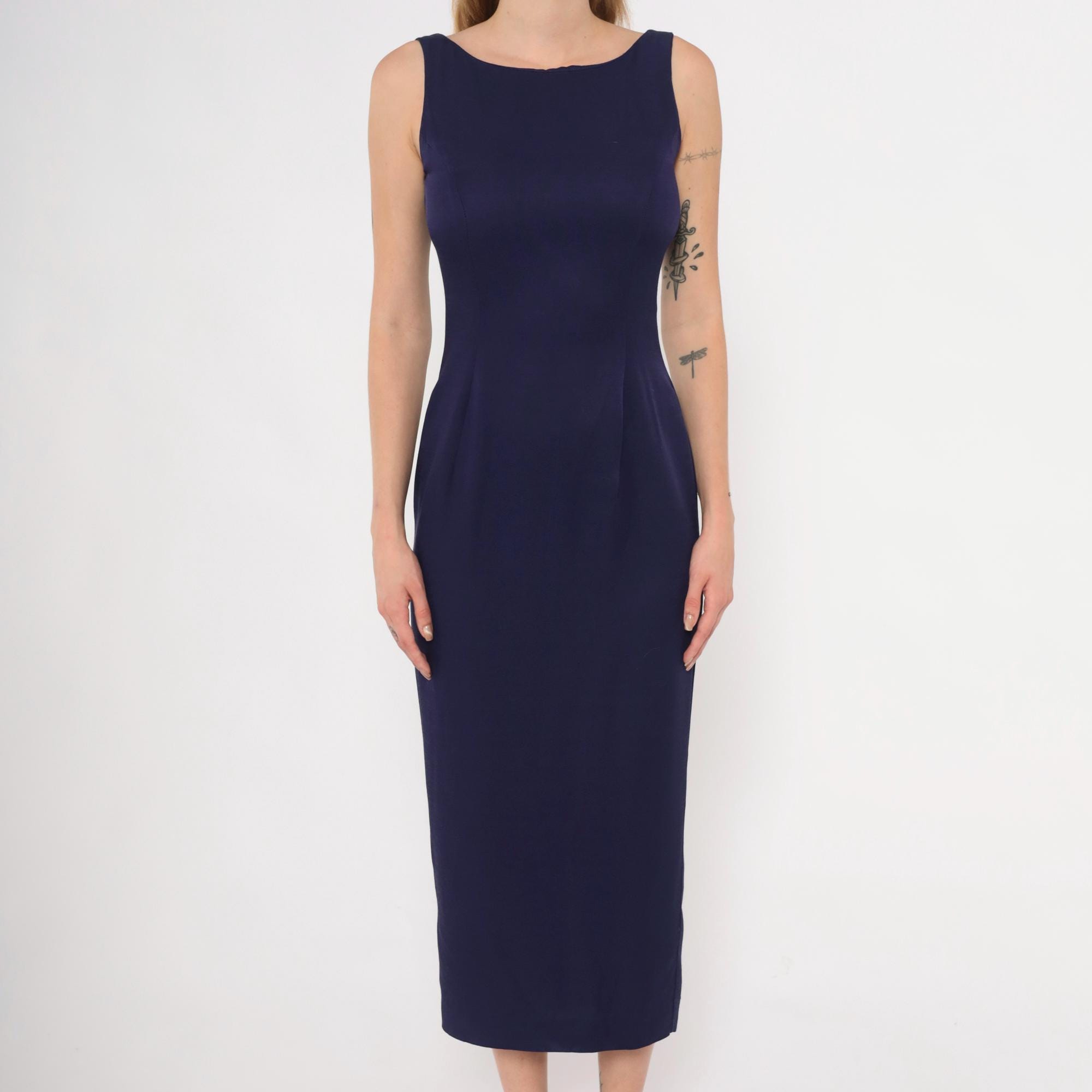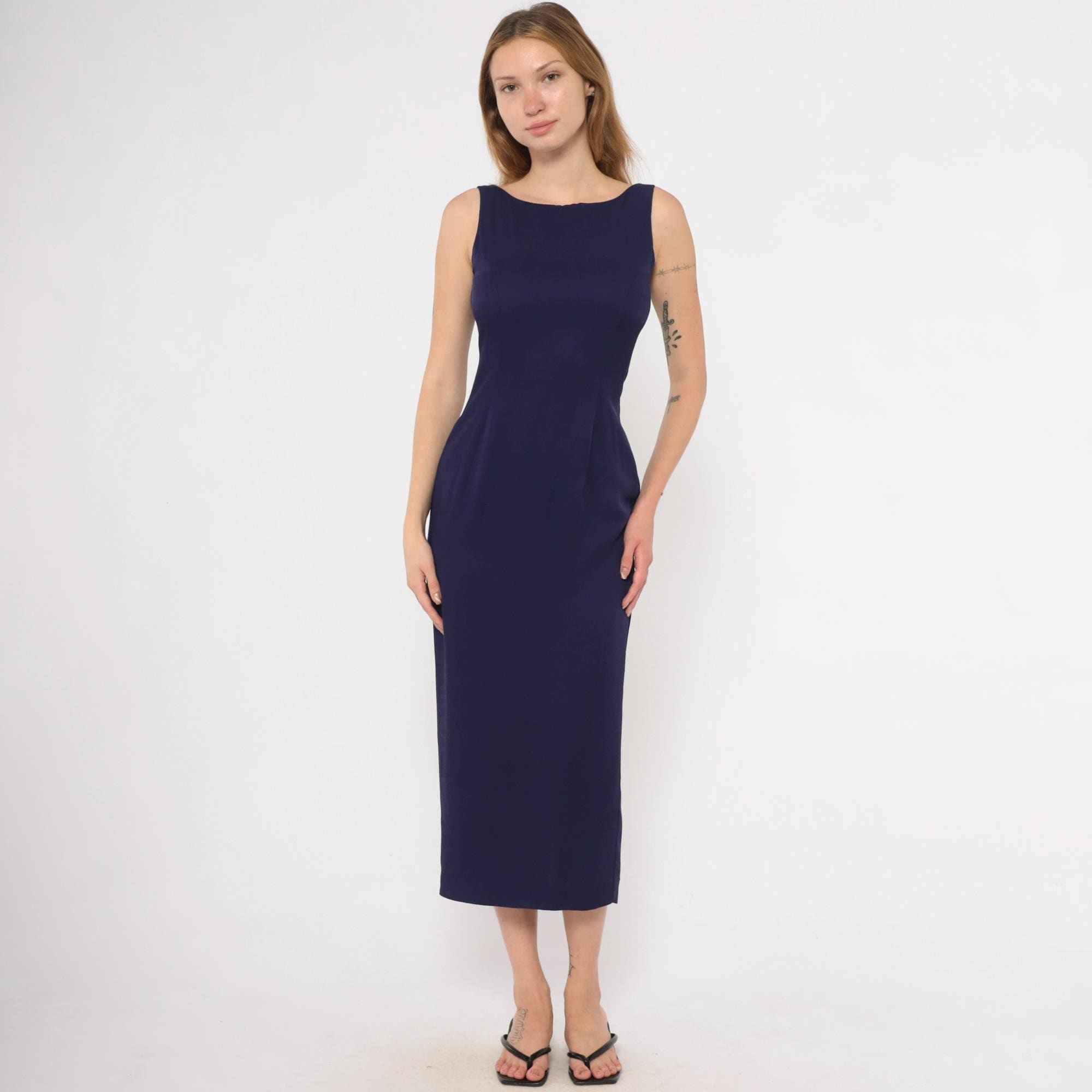 90s purple sheath dress from Scott McClintock with a high boat neckline and wide-set shoulder straps. Deep open back with a center back zipper closure. Fitted silhouette through the bodice, waist, and hips in a plum-navy tone, falling to mid-calf length.
