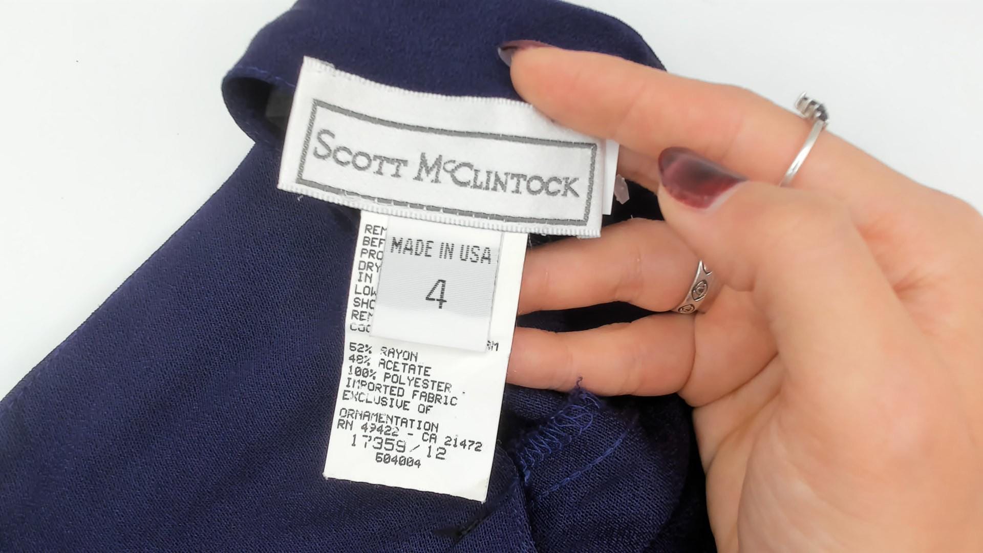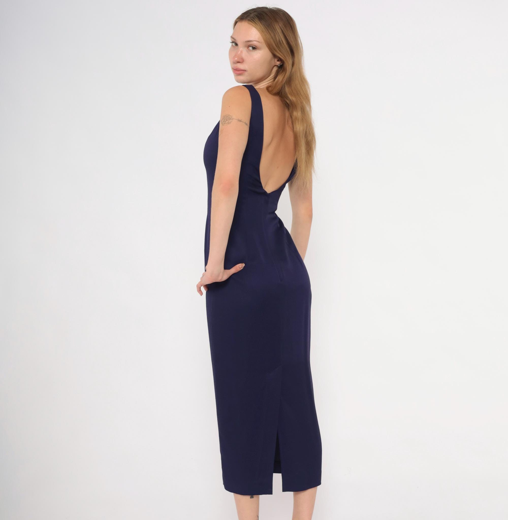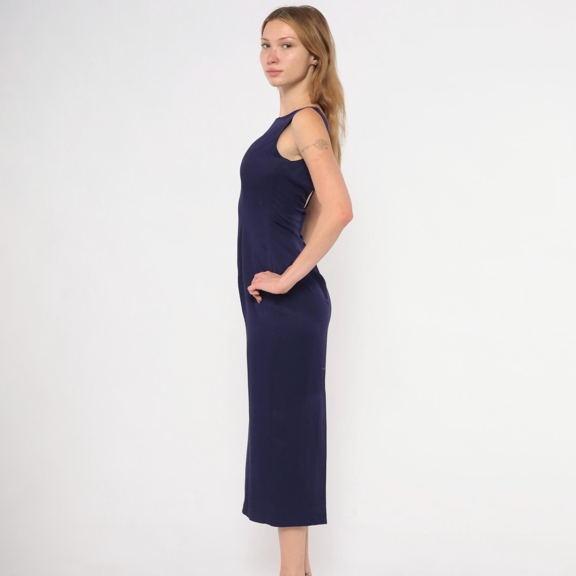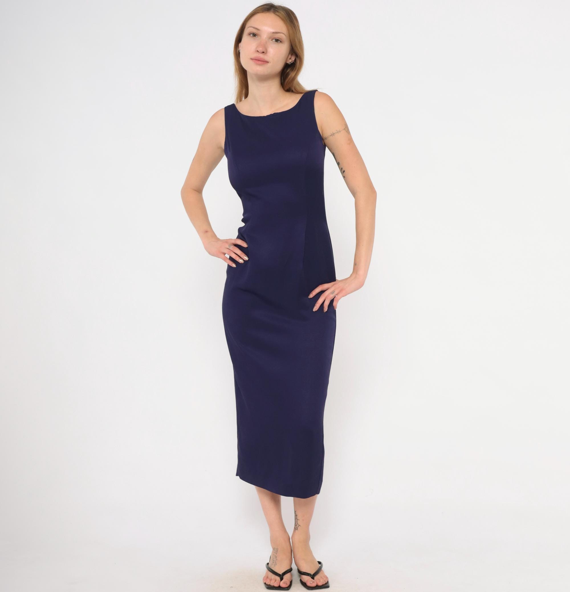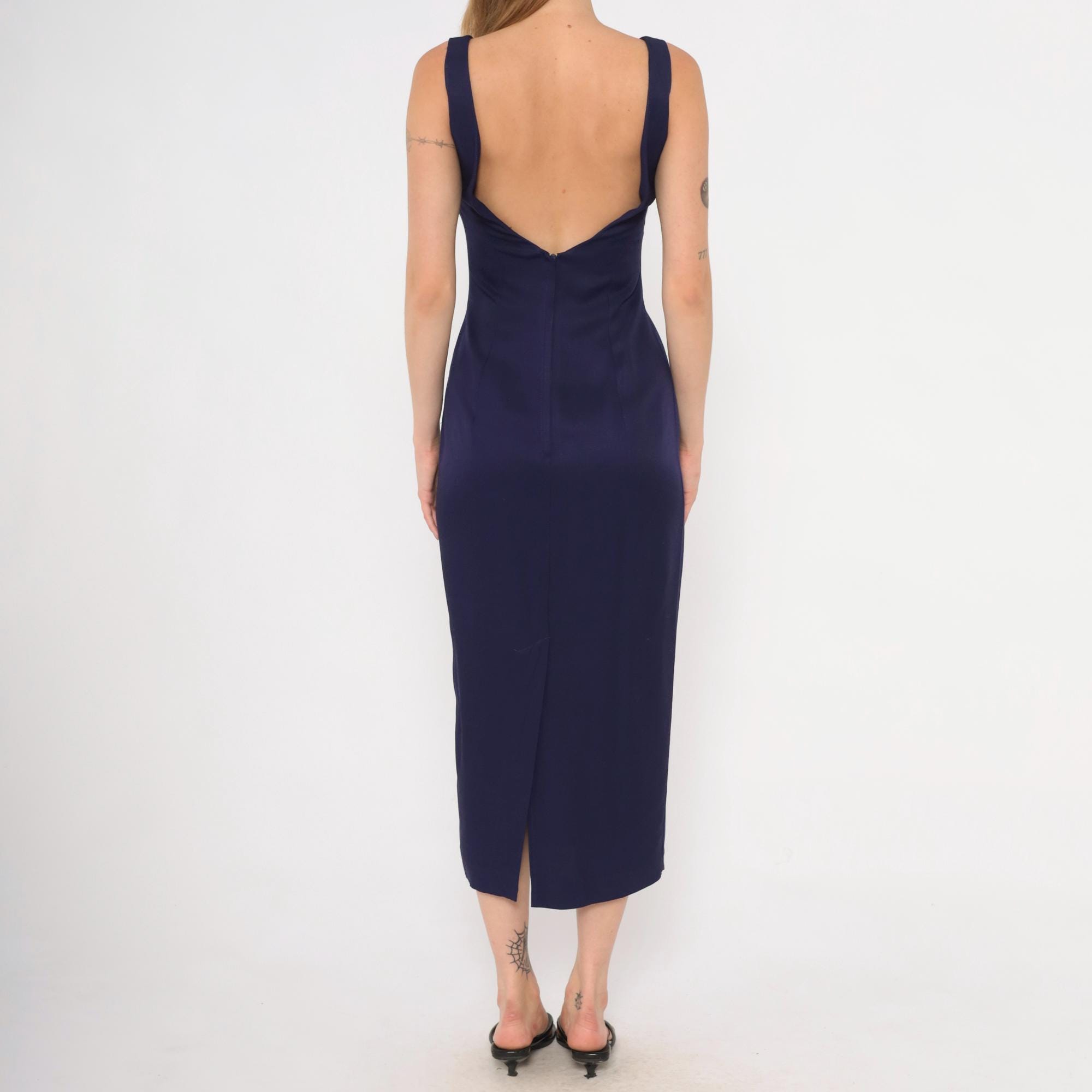 90s purple sheath dress from Scott McClintock with a high boat neckline and wide-set shoulder straps. Deep open back with a center back zipper closure. Fitted silhouette through the bodice, waist, and hips in a plum-navy tone, falling to mid-calf length.
