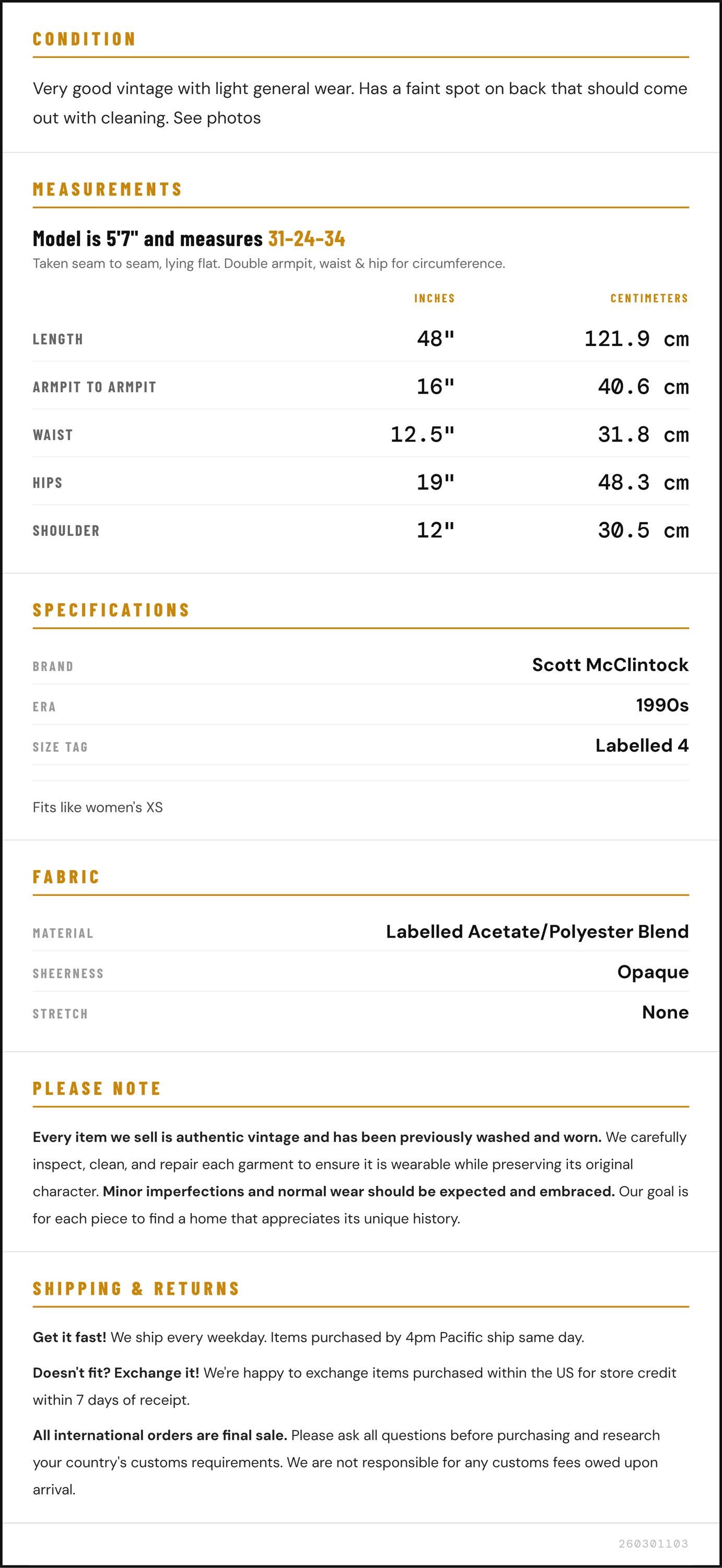 Vintage denim was usually made without any stretch, unlike modern jeans. Check the measurements to ensure proper fit, and remember to give yourself a little wiggle room in the waist and hips, depending on your preferred fit.