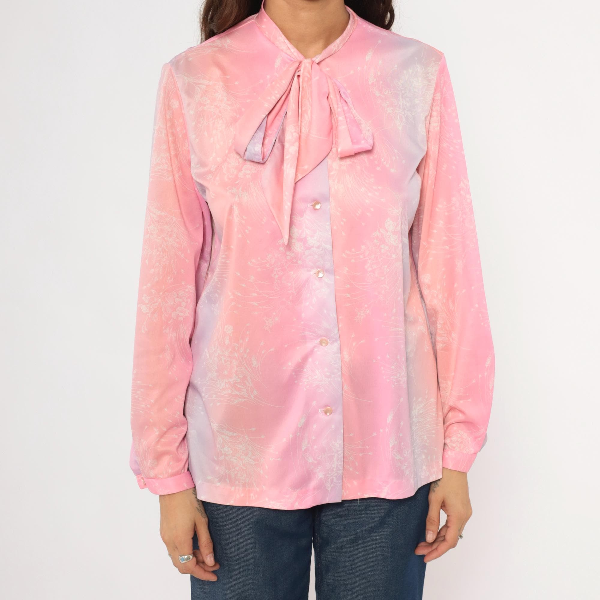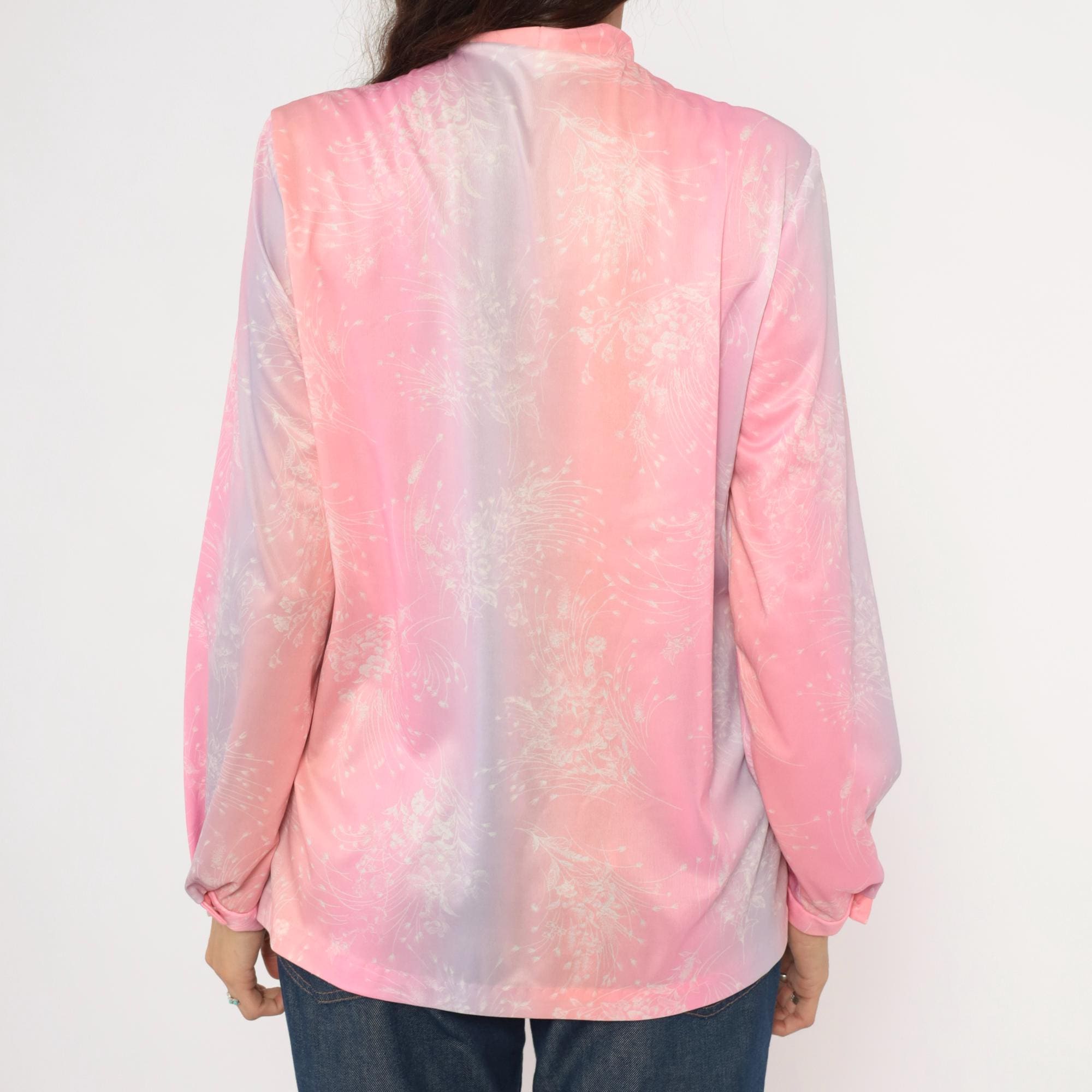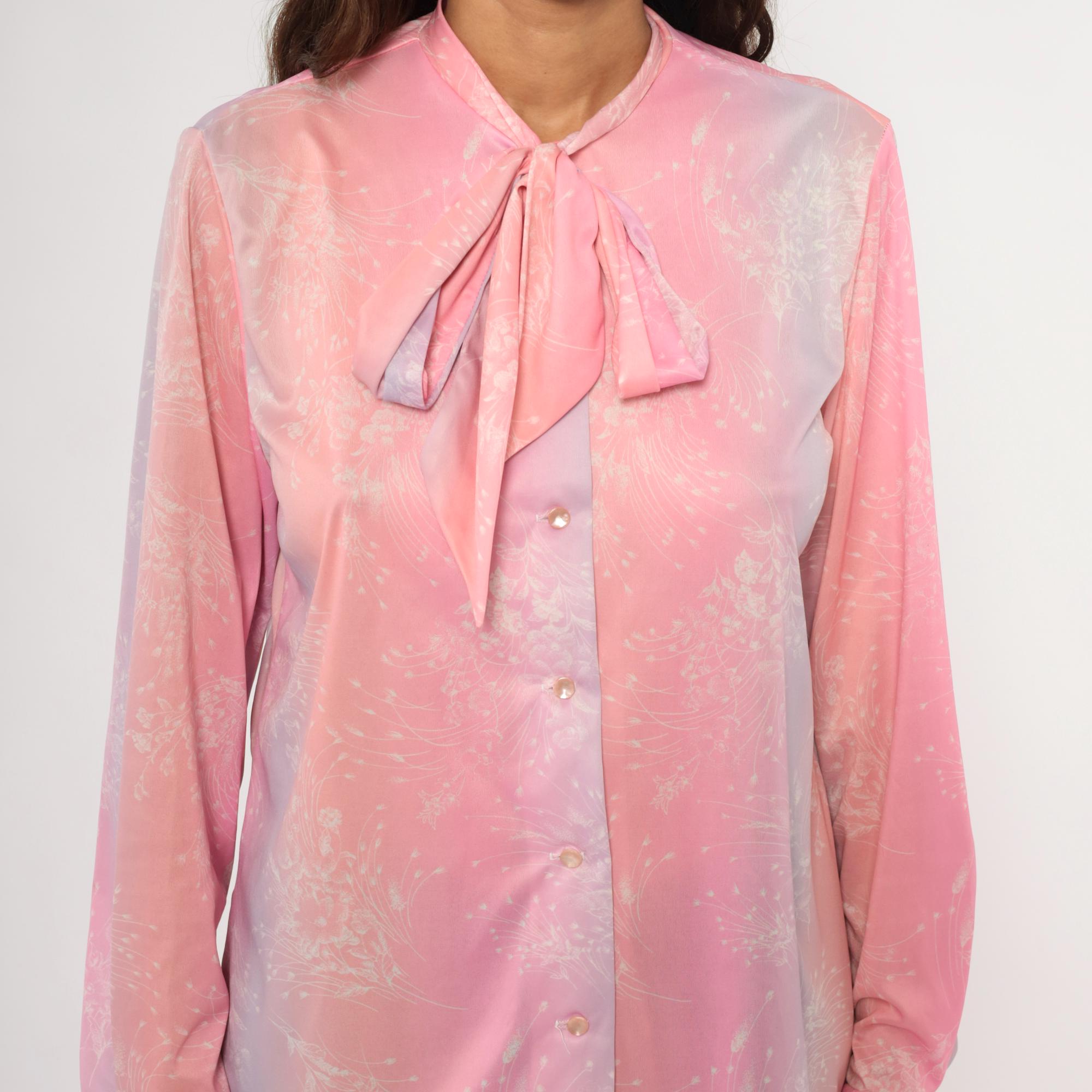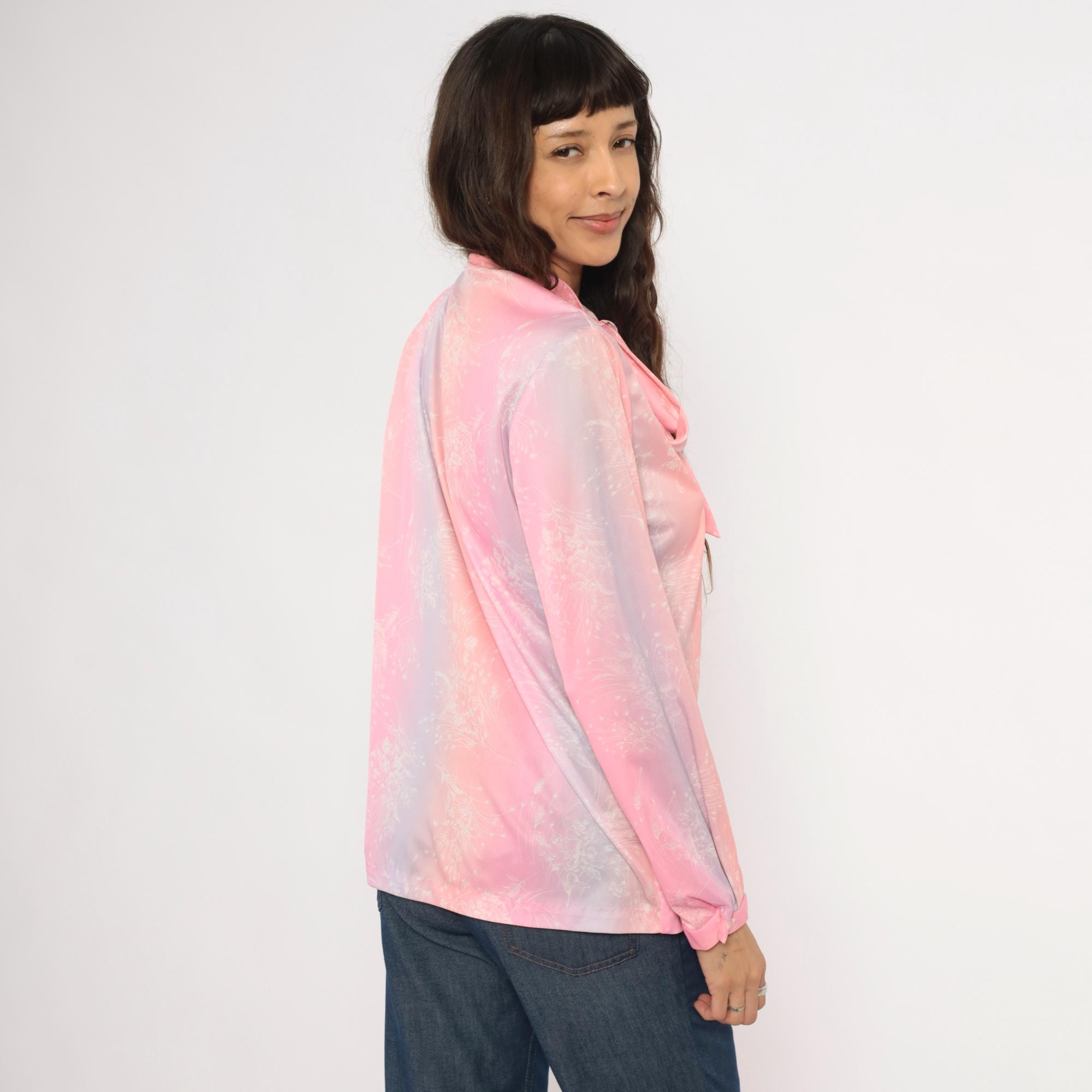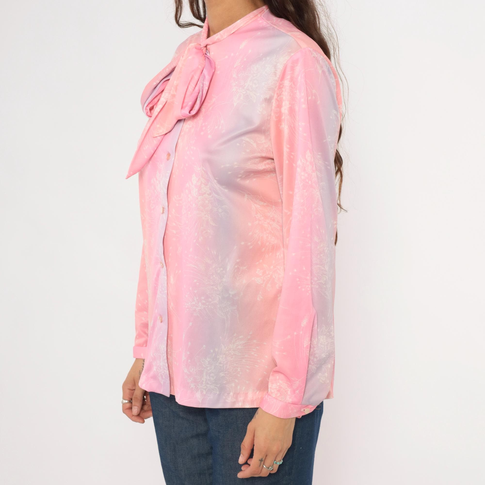 70s pink and lavender pussy bow blouse with a white floral print across the fabric in swirling botanical motifs. Button front closure with pearl-style snap buttons, long sleeves with banded cuffs, and a tied bow at the neckline. The color shifts between rose pink and soft lilac in an ombre-like gradient pattern.
