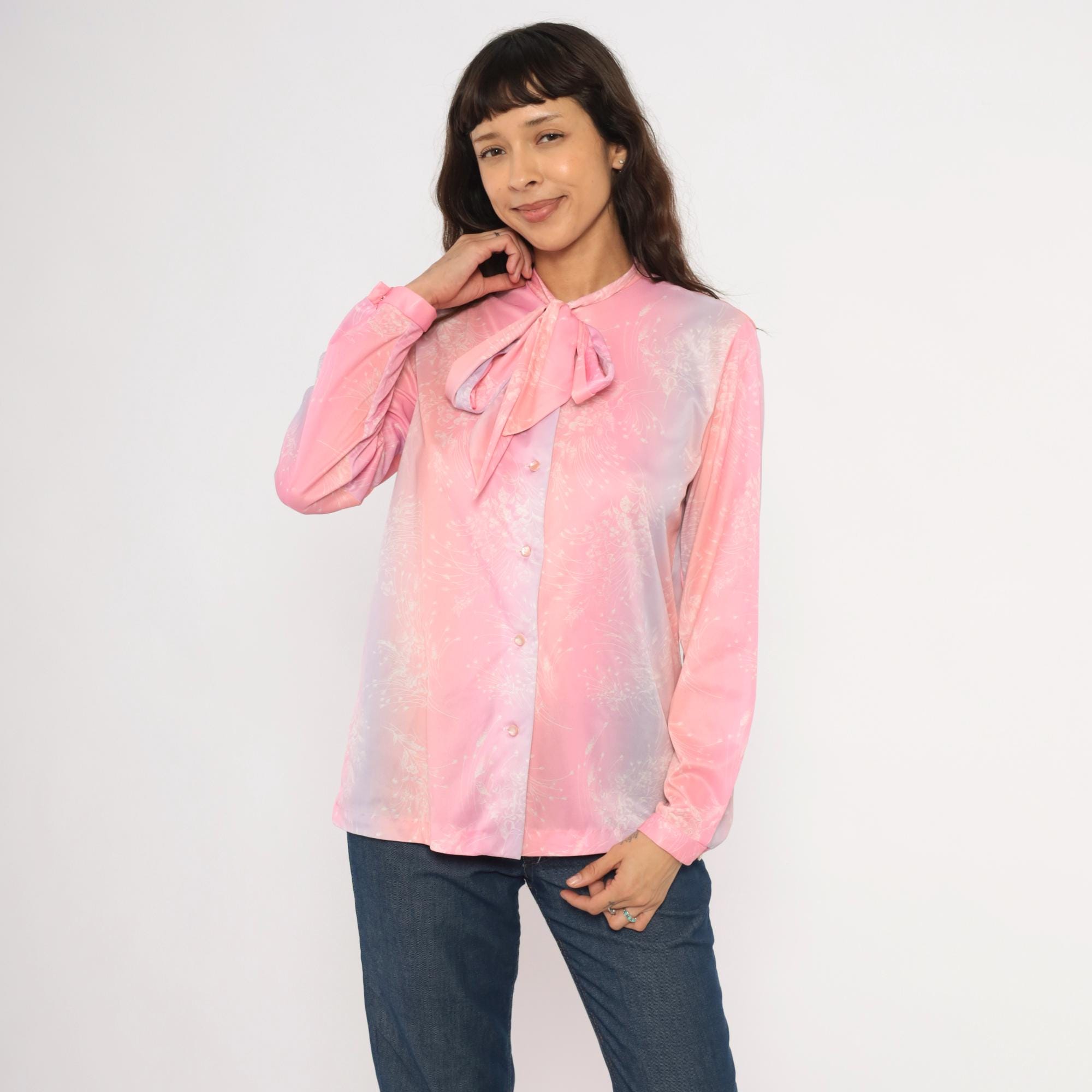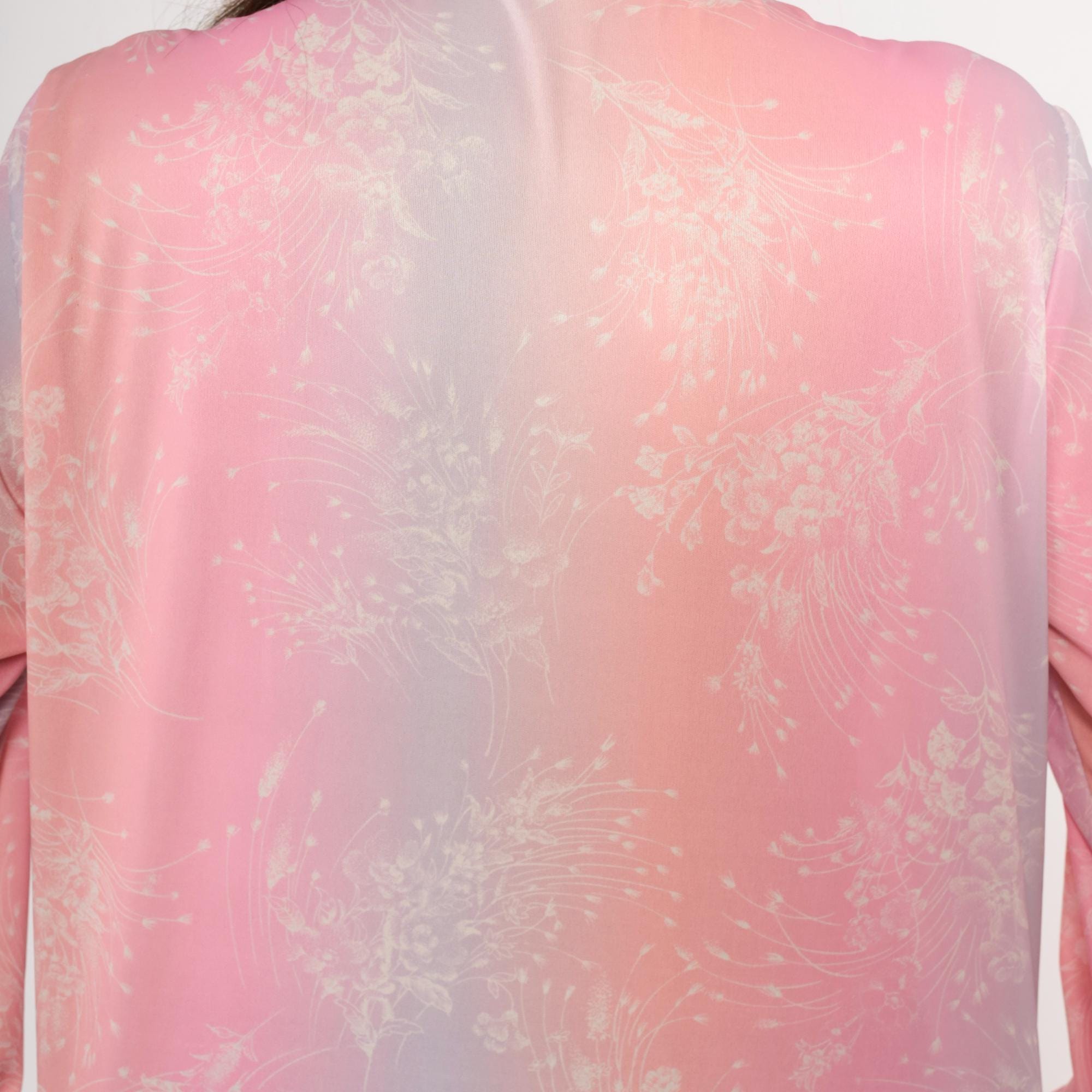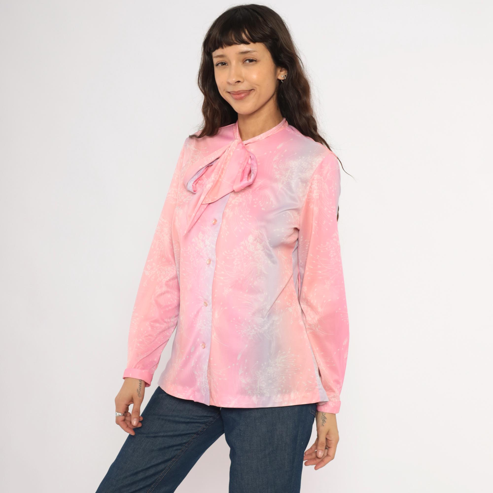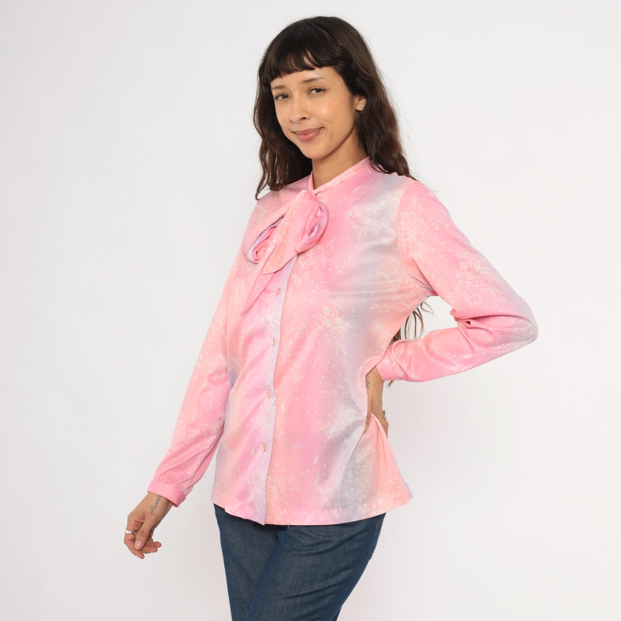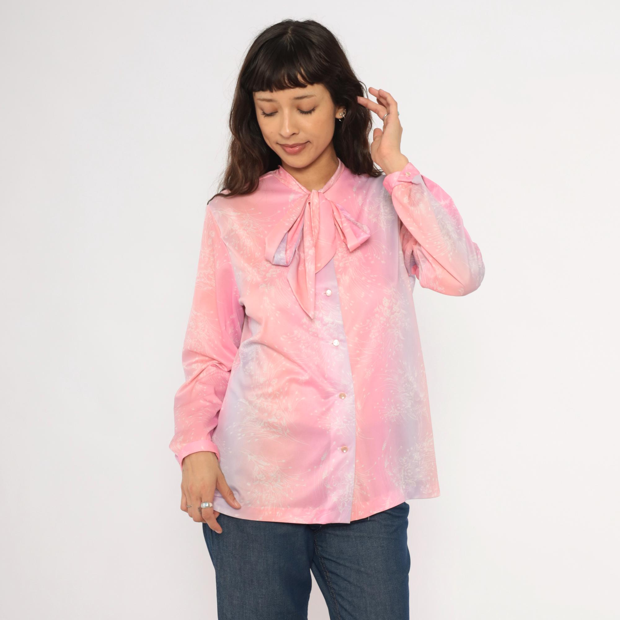 70s pink and lavender pussy bow blouse with a white floral print across the fabric in swirling botanical motifs. Button front closure with pearl-style snap buttons, long sleeves with banded cuffs, and a tied bow at the neckline. The color shifts between rose pink and soft lilac in an ombre-like gradient pattern.