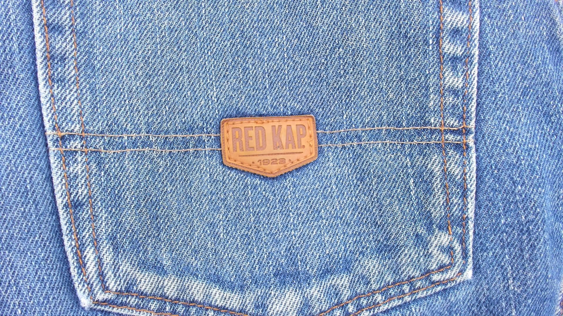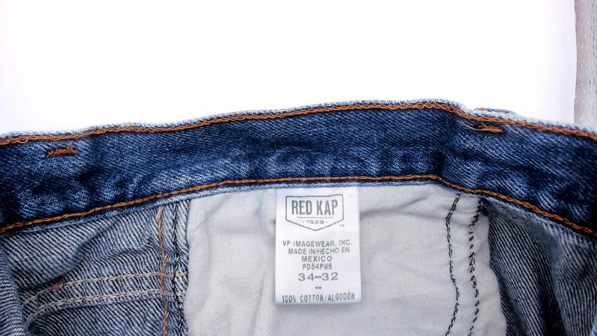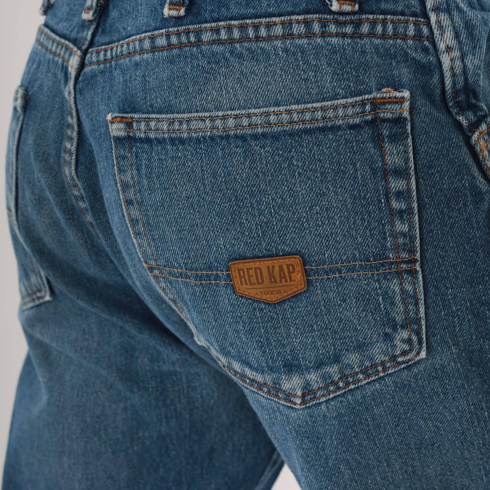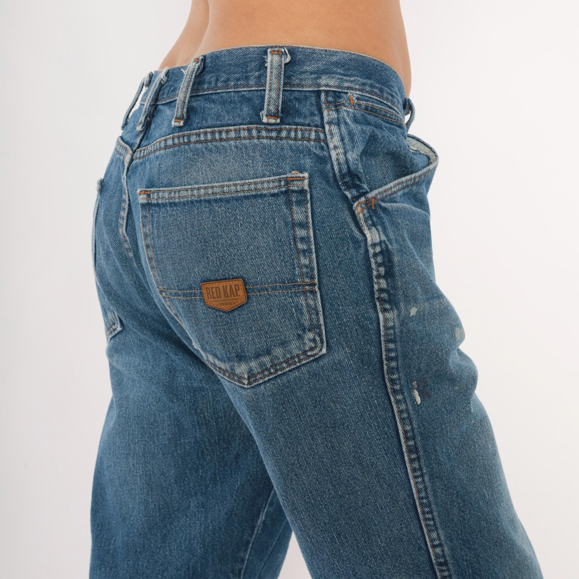 2000s Red Kap workwear jeans in a medium blue faded wash with natural distressing and paint marks throughout. Straight leg silhouette with a mid-rise waist, zip fly with metal button closure, and belt loops. Five-pocket construction with two front slash pockets, a small coin pocket, and two back patch pockets with the leather Red Kap brand patch on the left rear pocket.