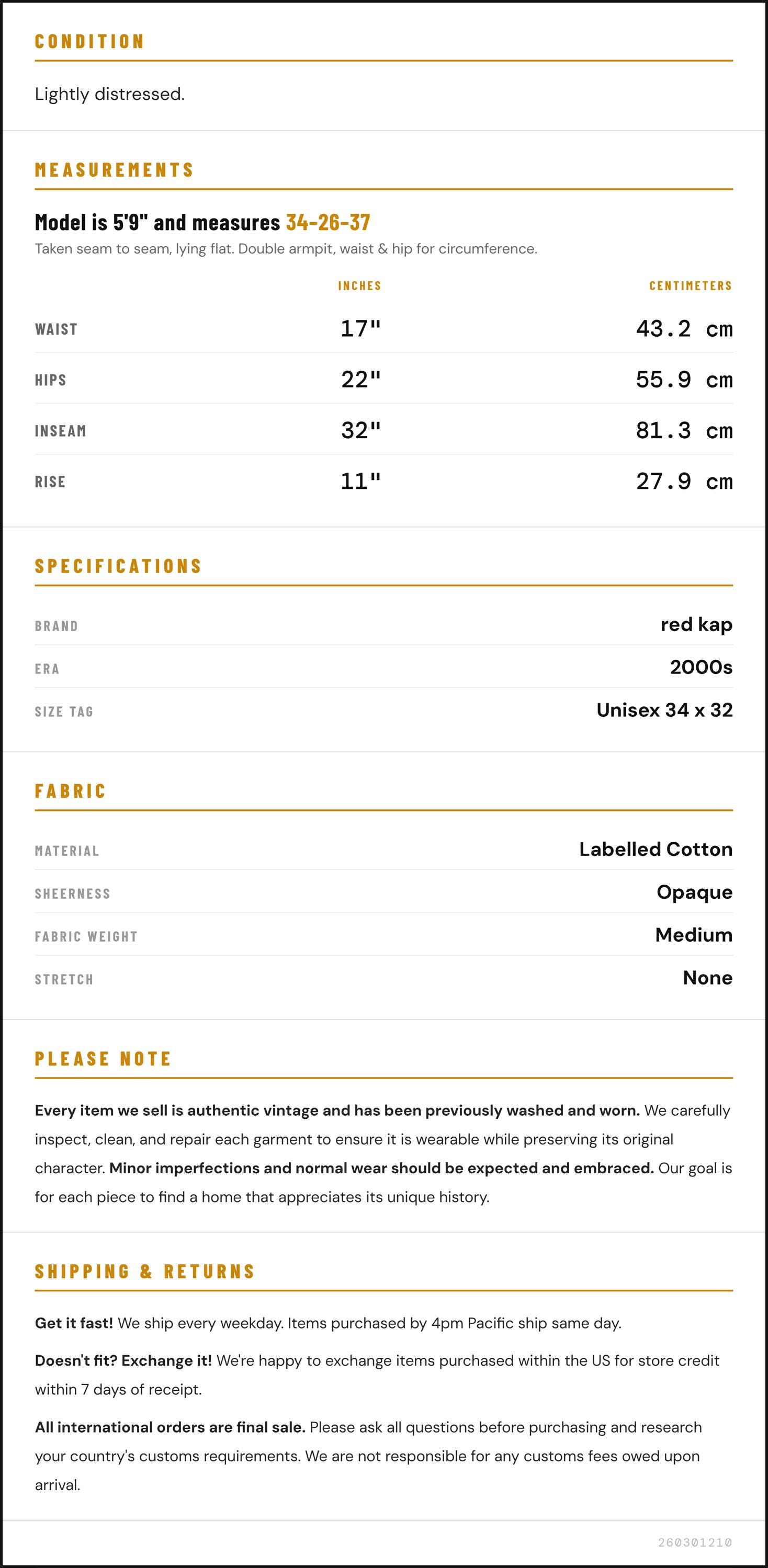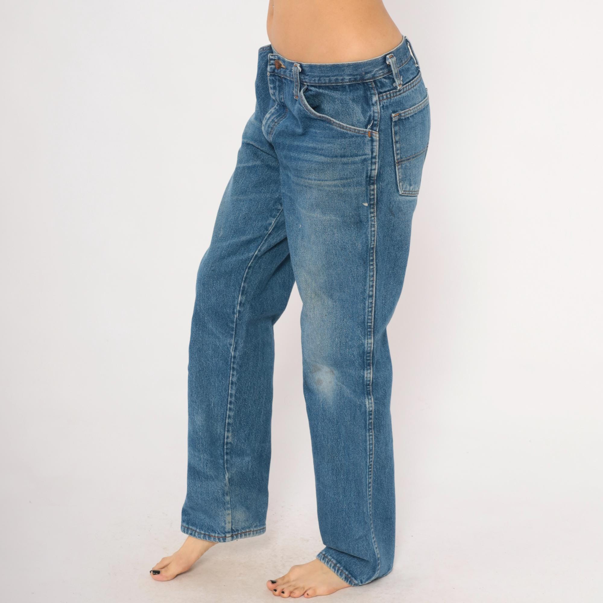 Vintage denim was usually made without any stretch, unlike modern jeans. Check the measurements to ensure proper fit, and remember to give yourself a little wiggle room in the waist and hips, depending on your preferred fit.