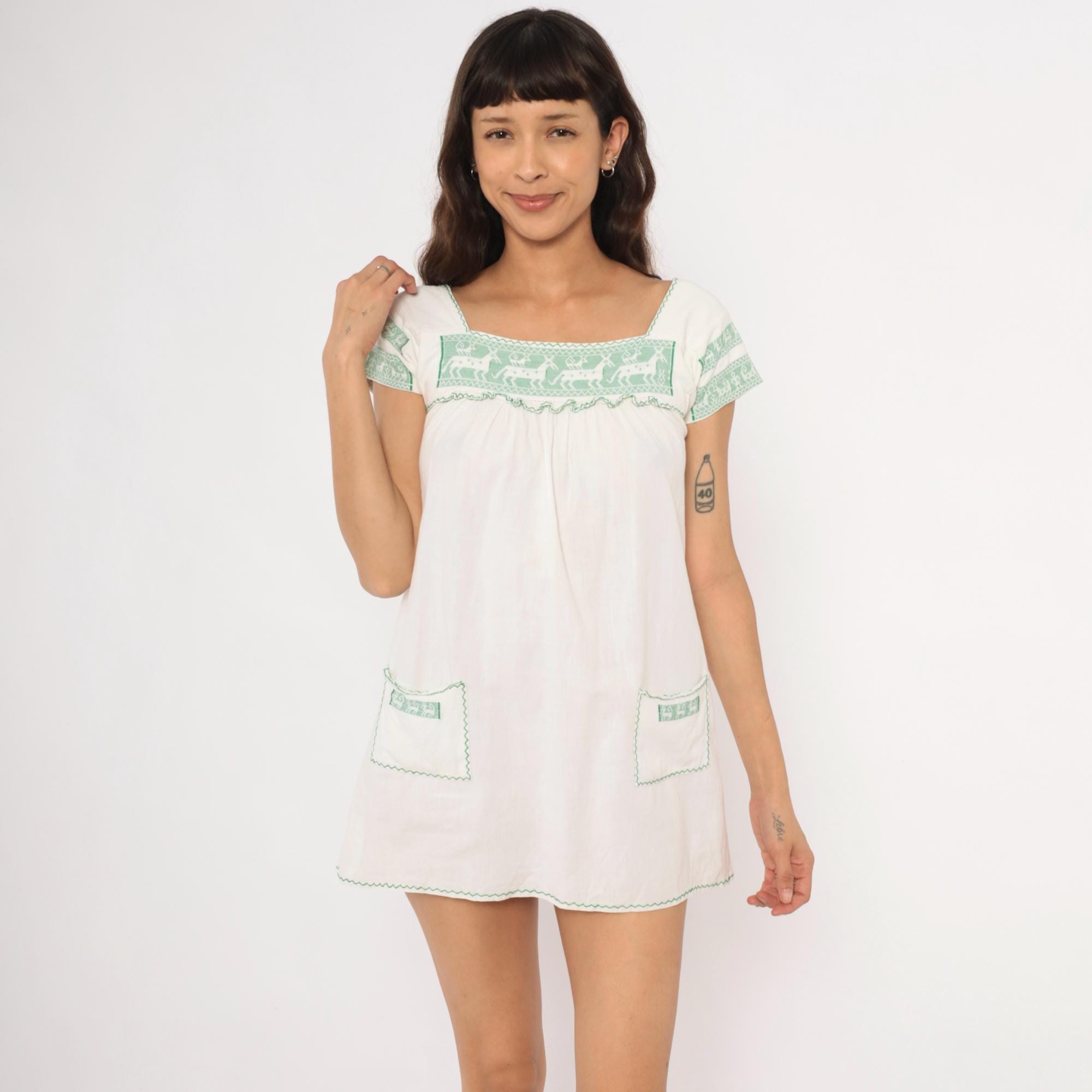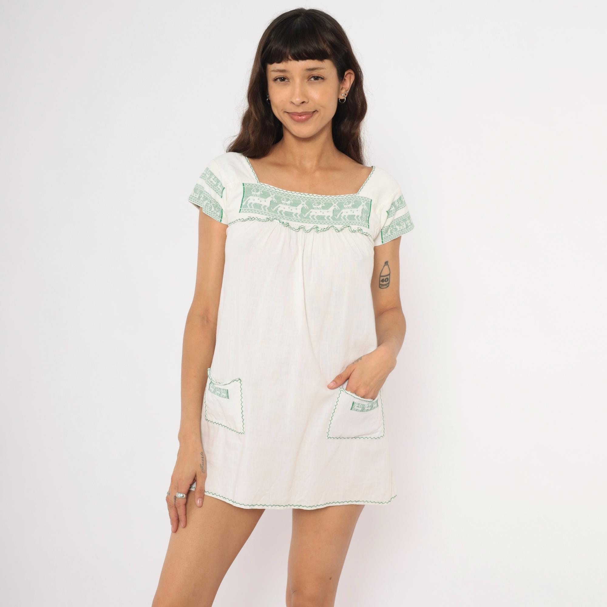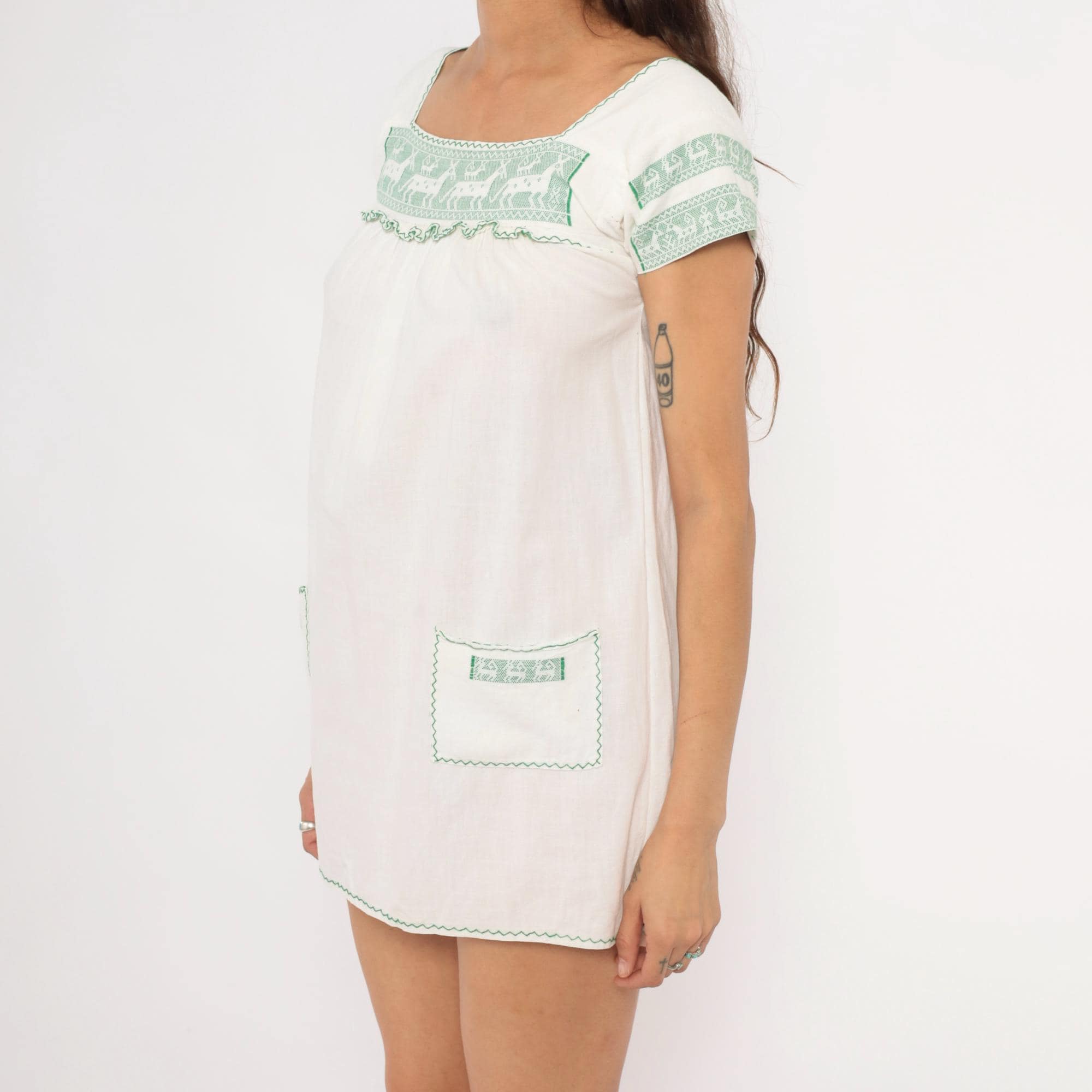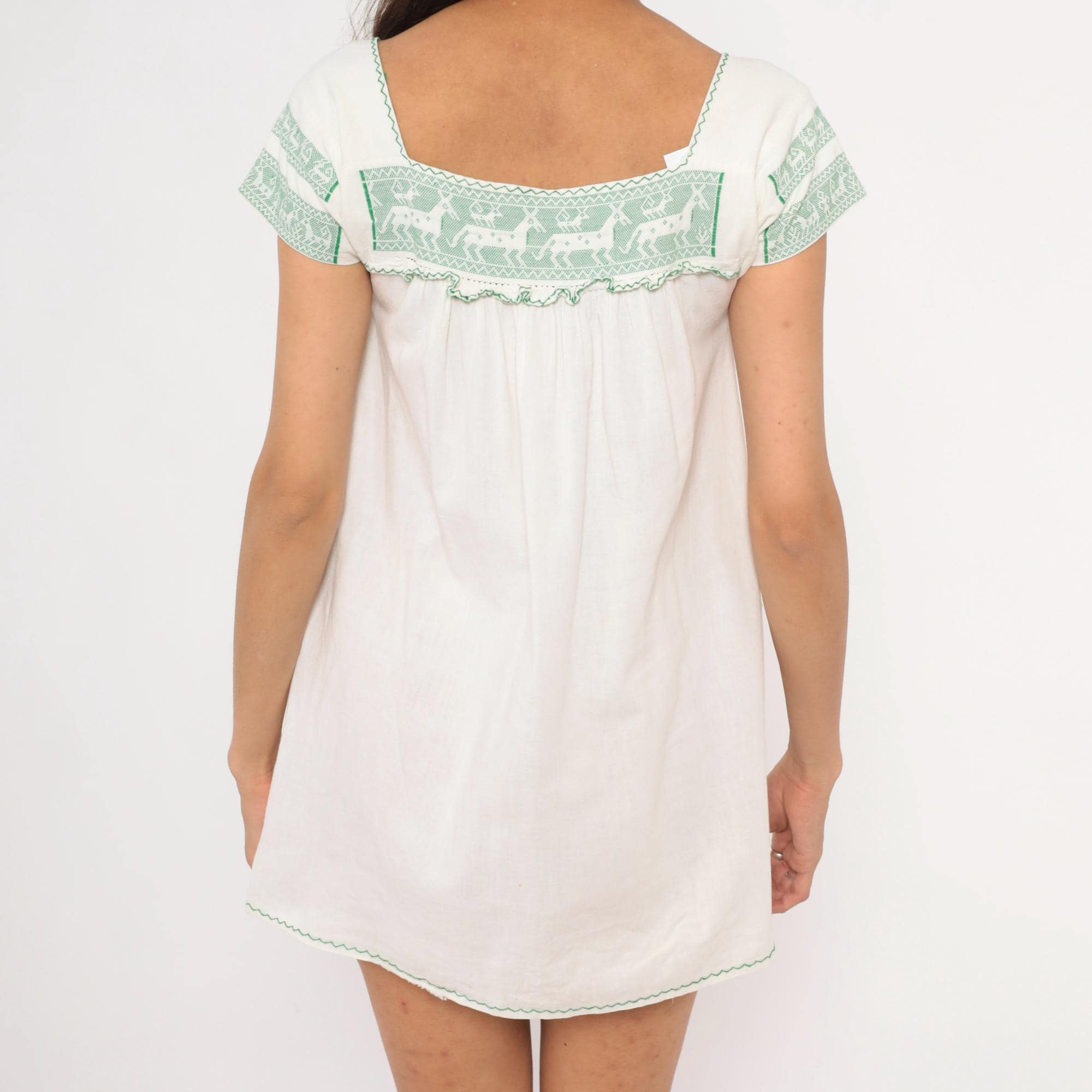 80s white and green mini dress with cross-stitch embroidered deer motifs across the square neckline yoke and sleeve bands. Gathered bodice below the yoke with a ruffled trim edge, puff cap sleeves, and two patch pockets near the hem with matching green embroidered accents. Zigzag stitching outlines the neckline, pocket flaps, and scalloped hemline in a pullover construction.