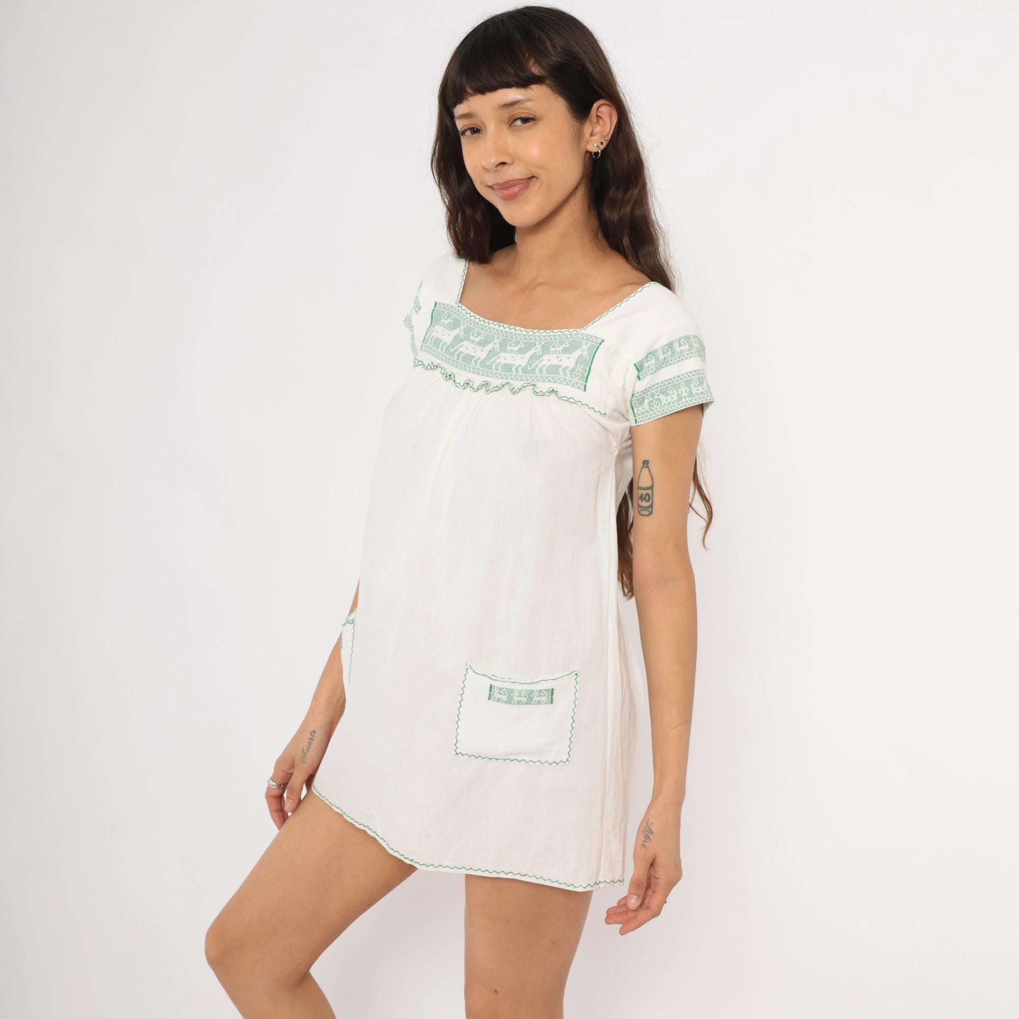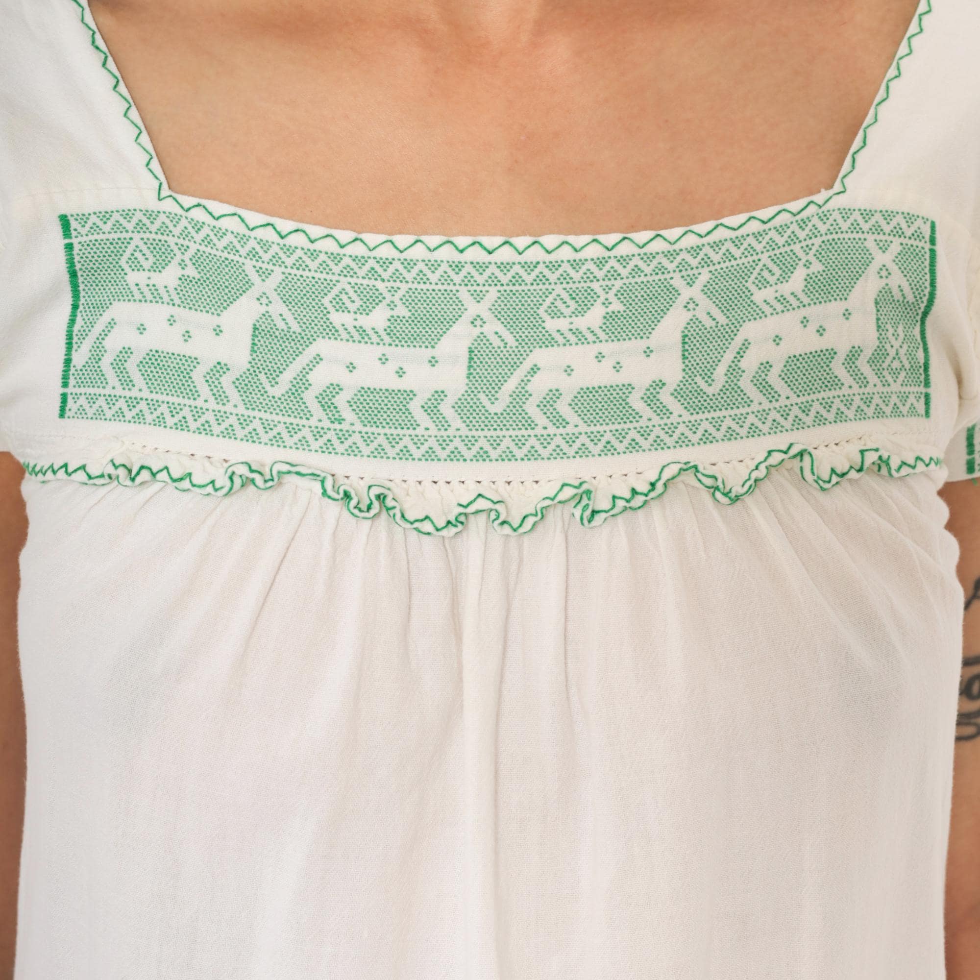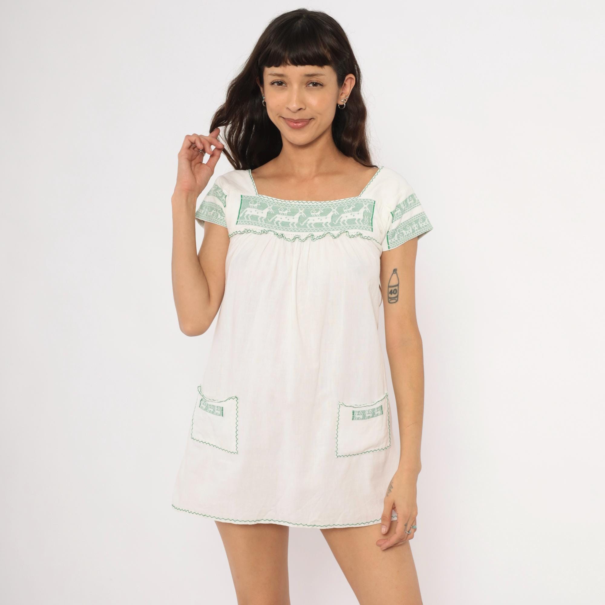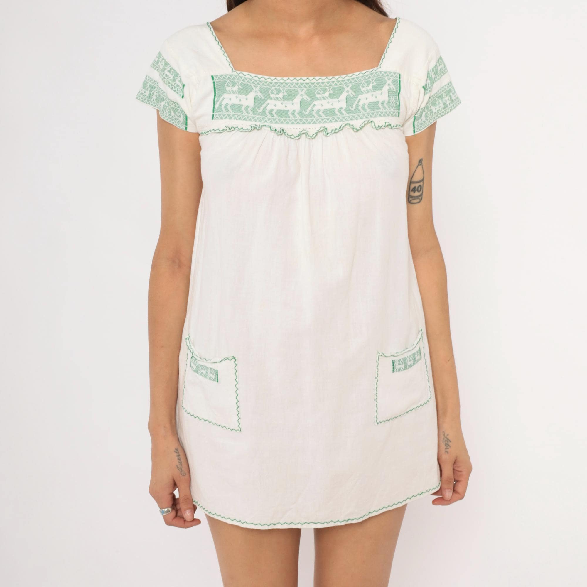 80s white and green mini dress with cross-stitch embroidered deer motifs across the square neckline yoke and sleeve bands. Gathered bodice below the yoke with a ruffled trim edge, puff cap sleeves, and two patch pockets near the hem with matching green embroidered accents. Zigzag stitching outlines the neckline, pocket flaps, and scalloped hemline in a pullover construction.