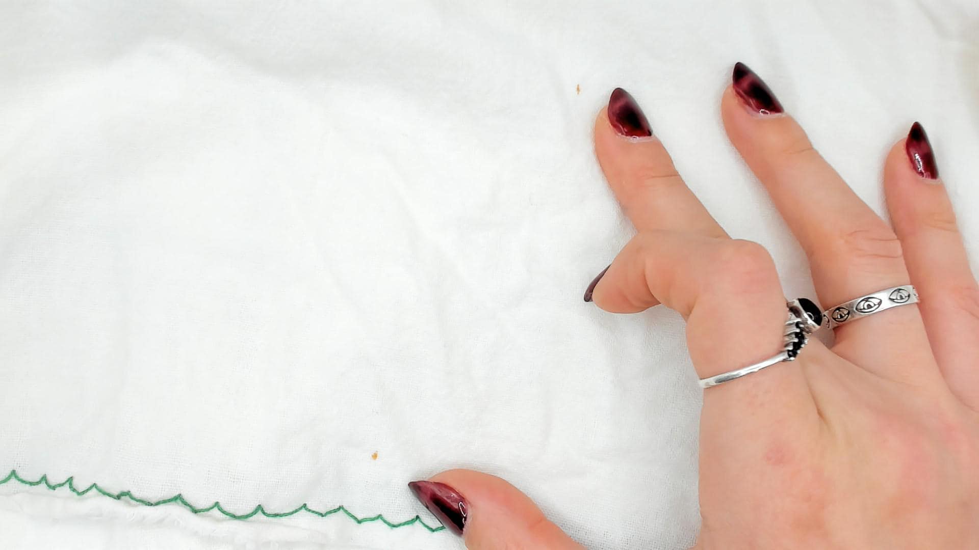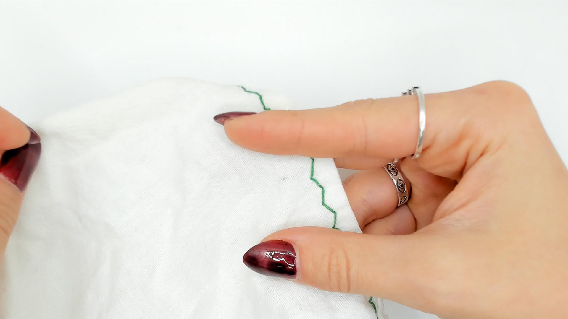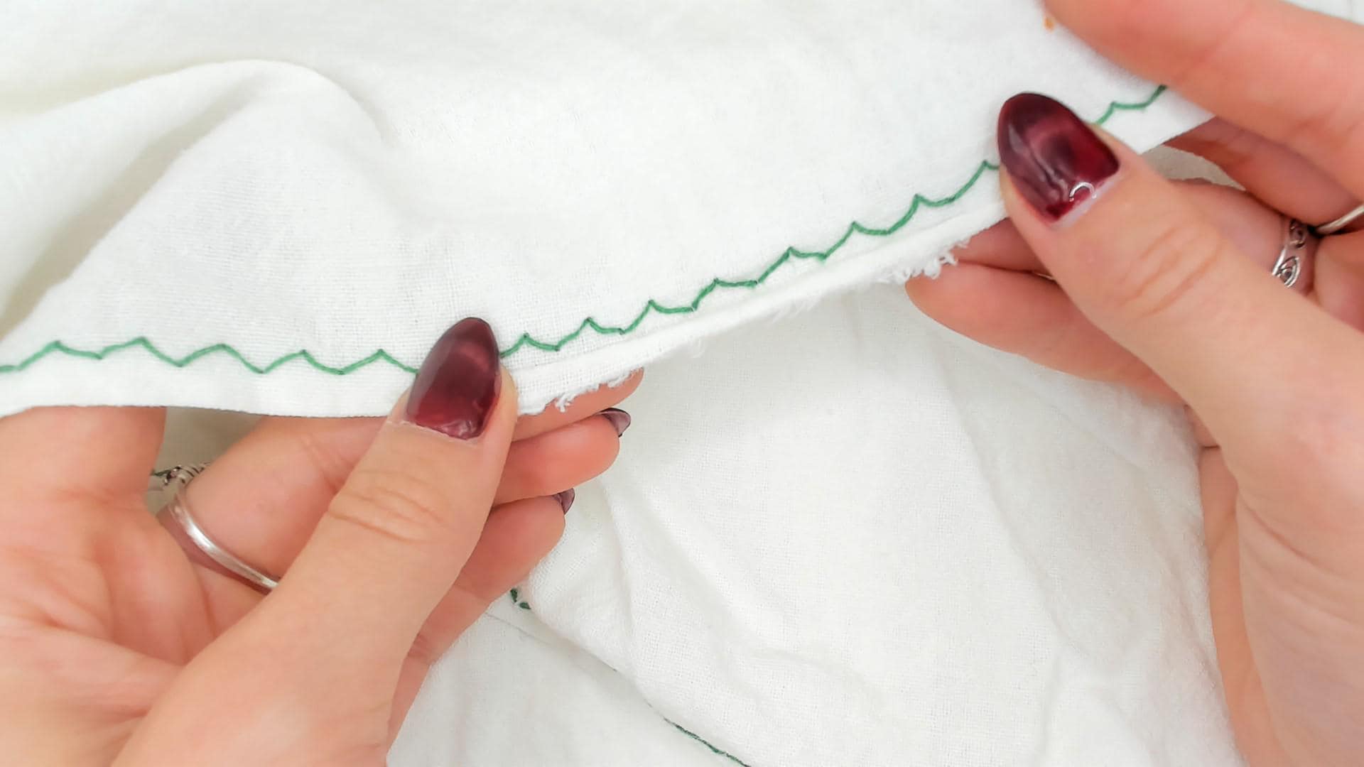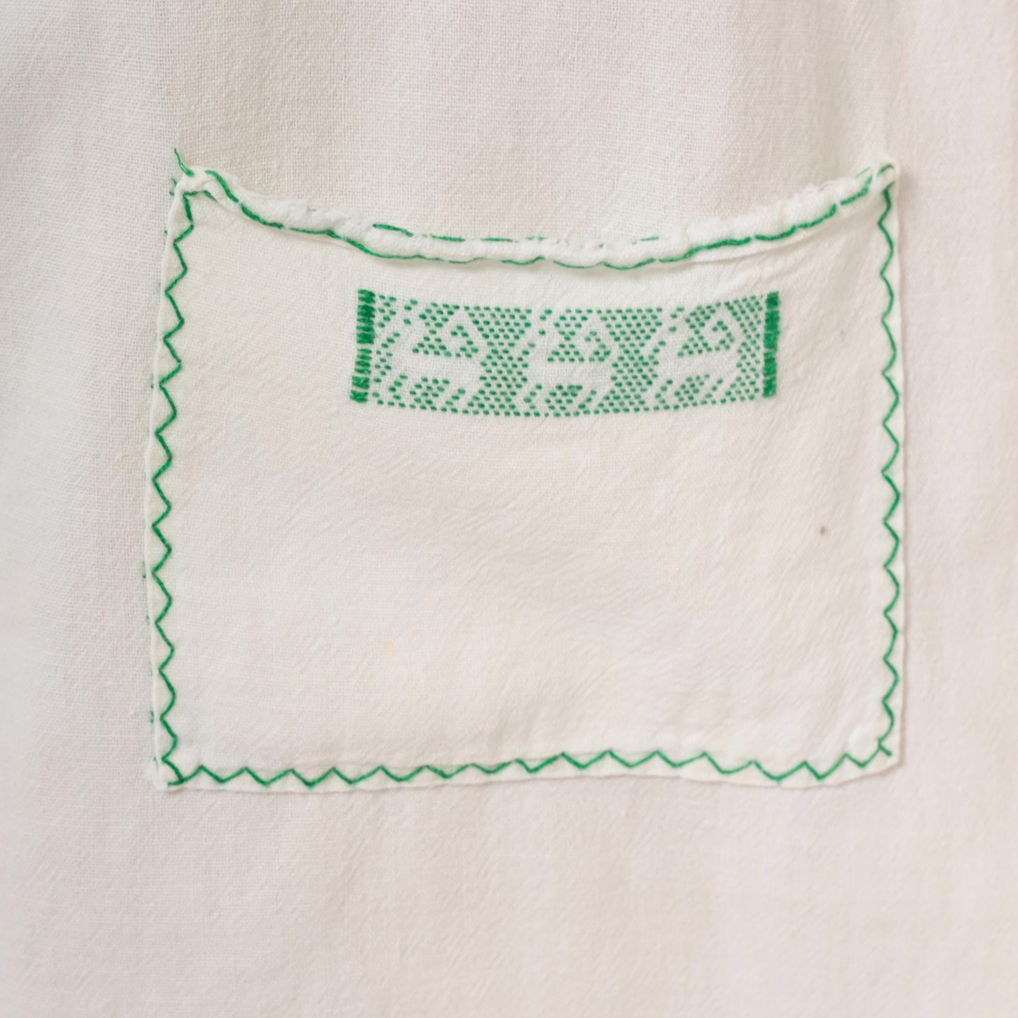 80s white and green mini dress with cross-stitch embroidered deer motifs across the square neckline yoke and sleeve bands. Gathered bodice below the yoke with a ruffled trim edge, puff cap sleeves, and two patch pockets near the hem with matching green embroidered accents. Zigzag stitching outlines the neckline, pocket flaps, and scalloped hemline in a pullover construction.