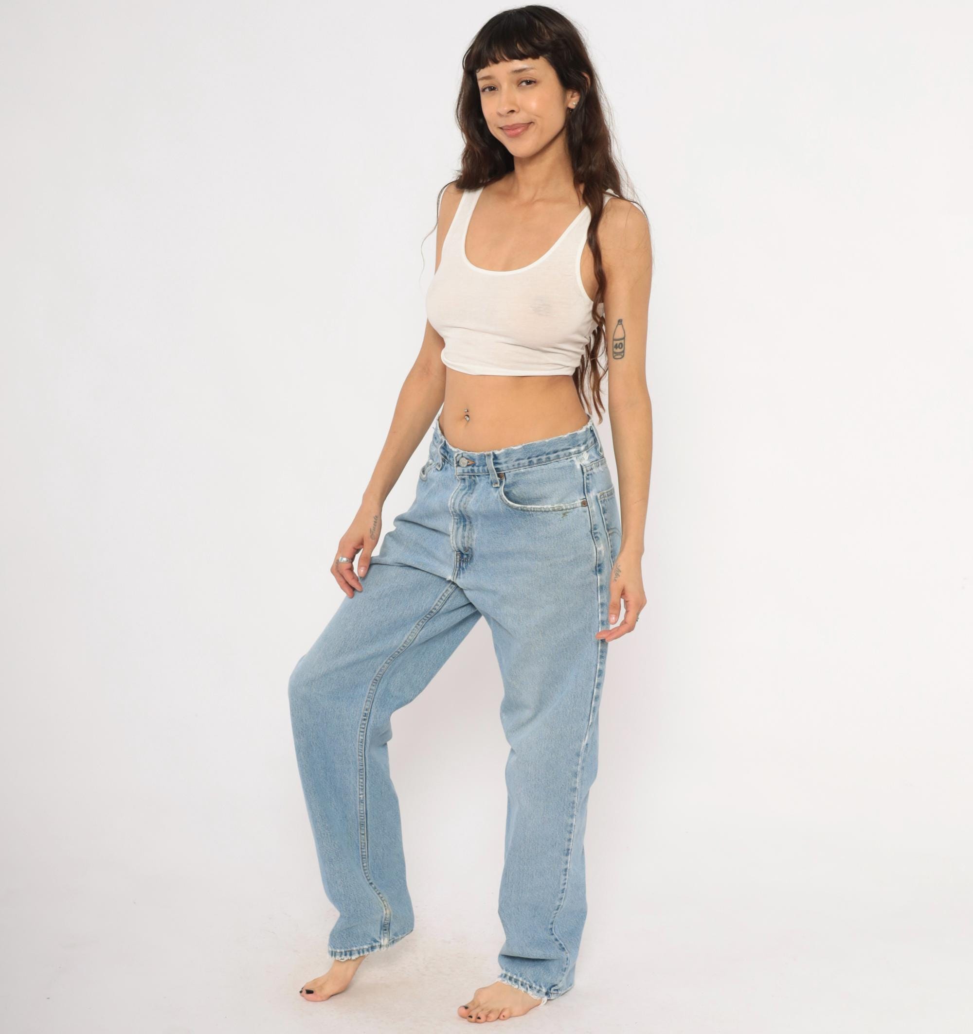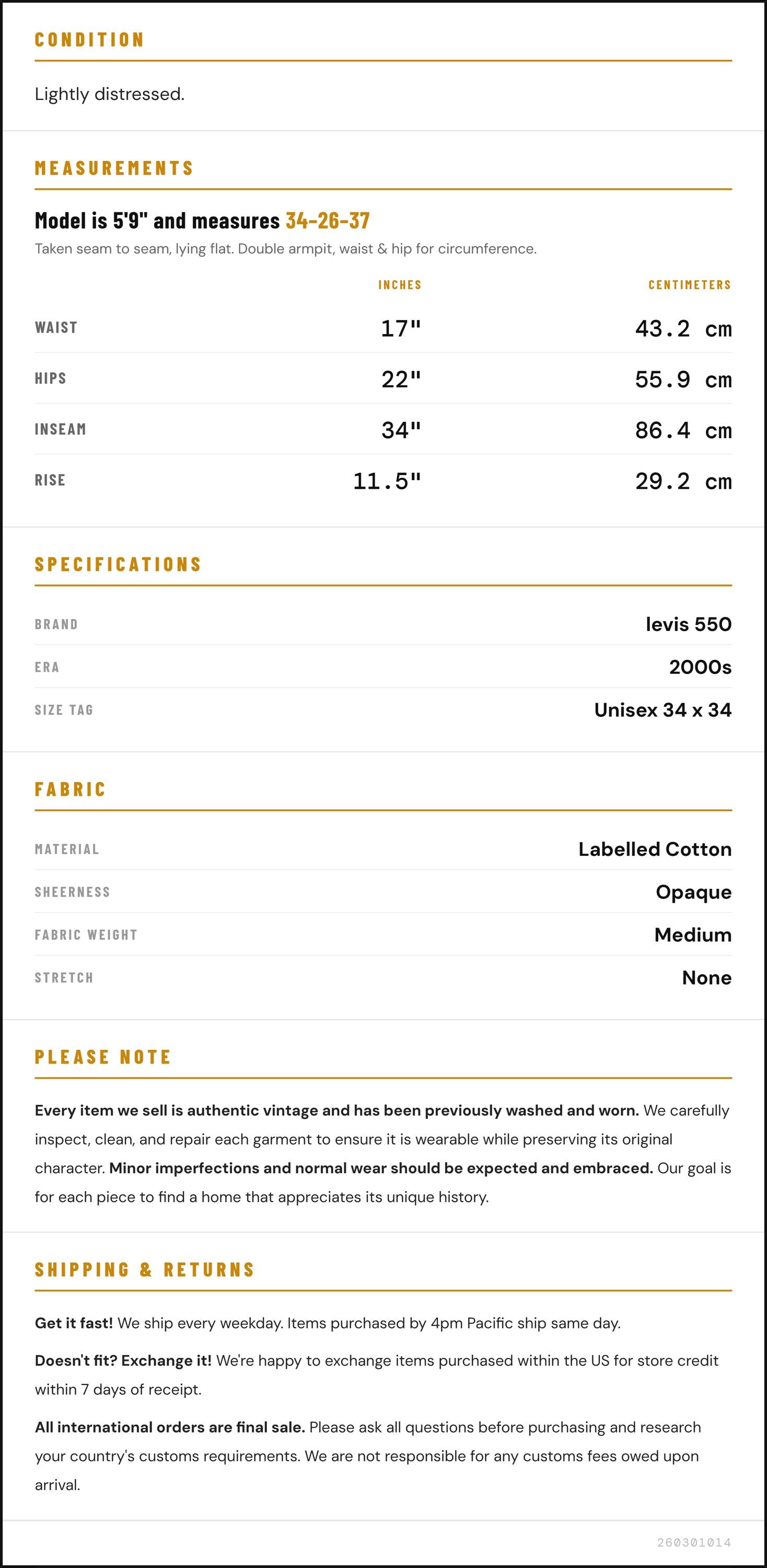 Vintage denim was usually made without any stretch, unlike modern jeans. Check the measurements to ensure proper fit, and remember to give yourself a little wiggle room in the waist and hips, depending on your preferred fit.
