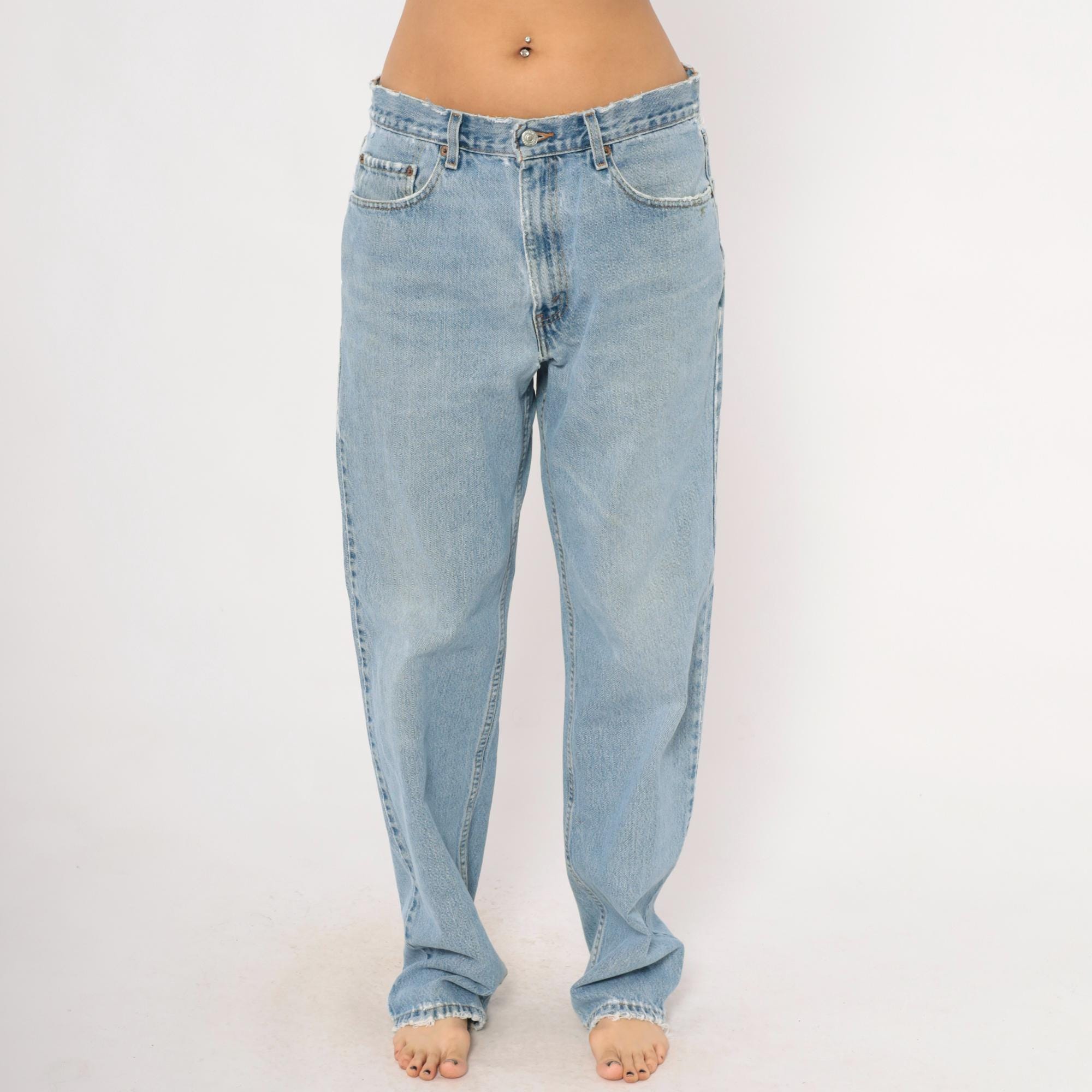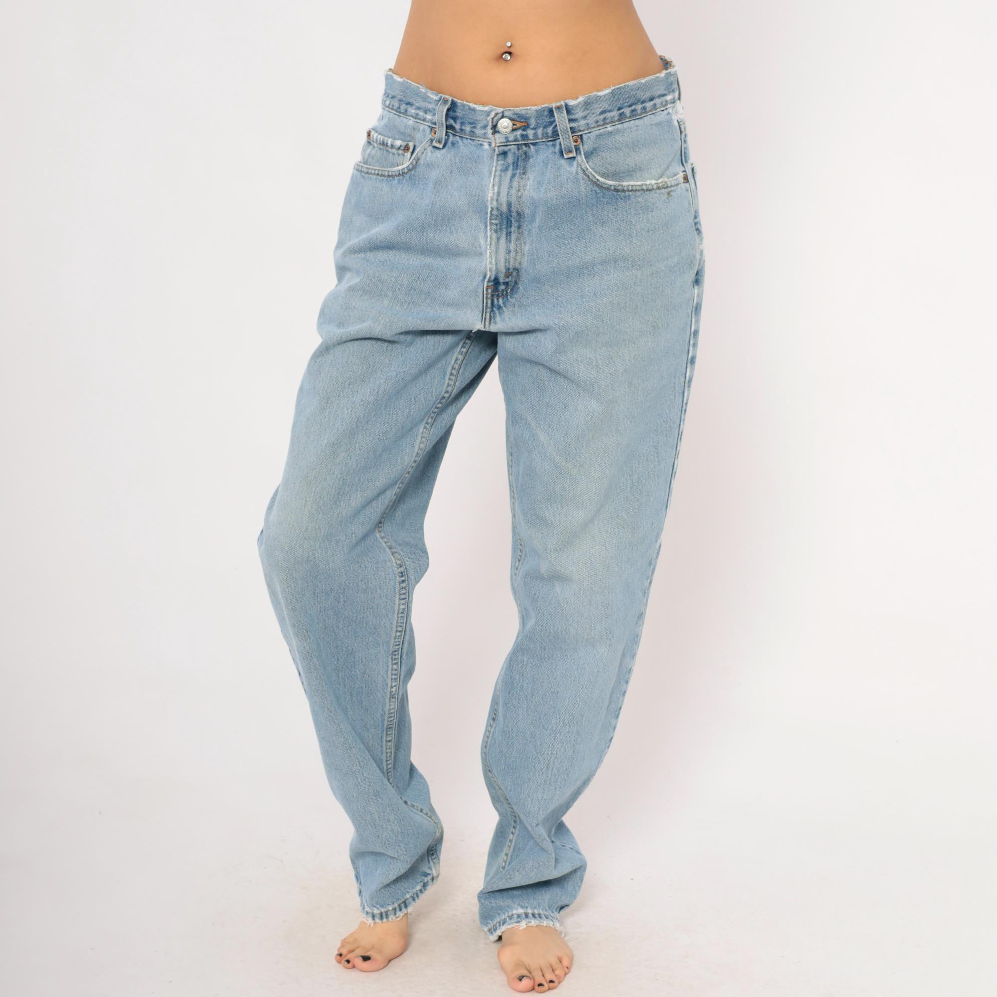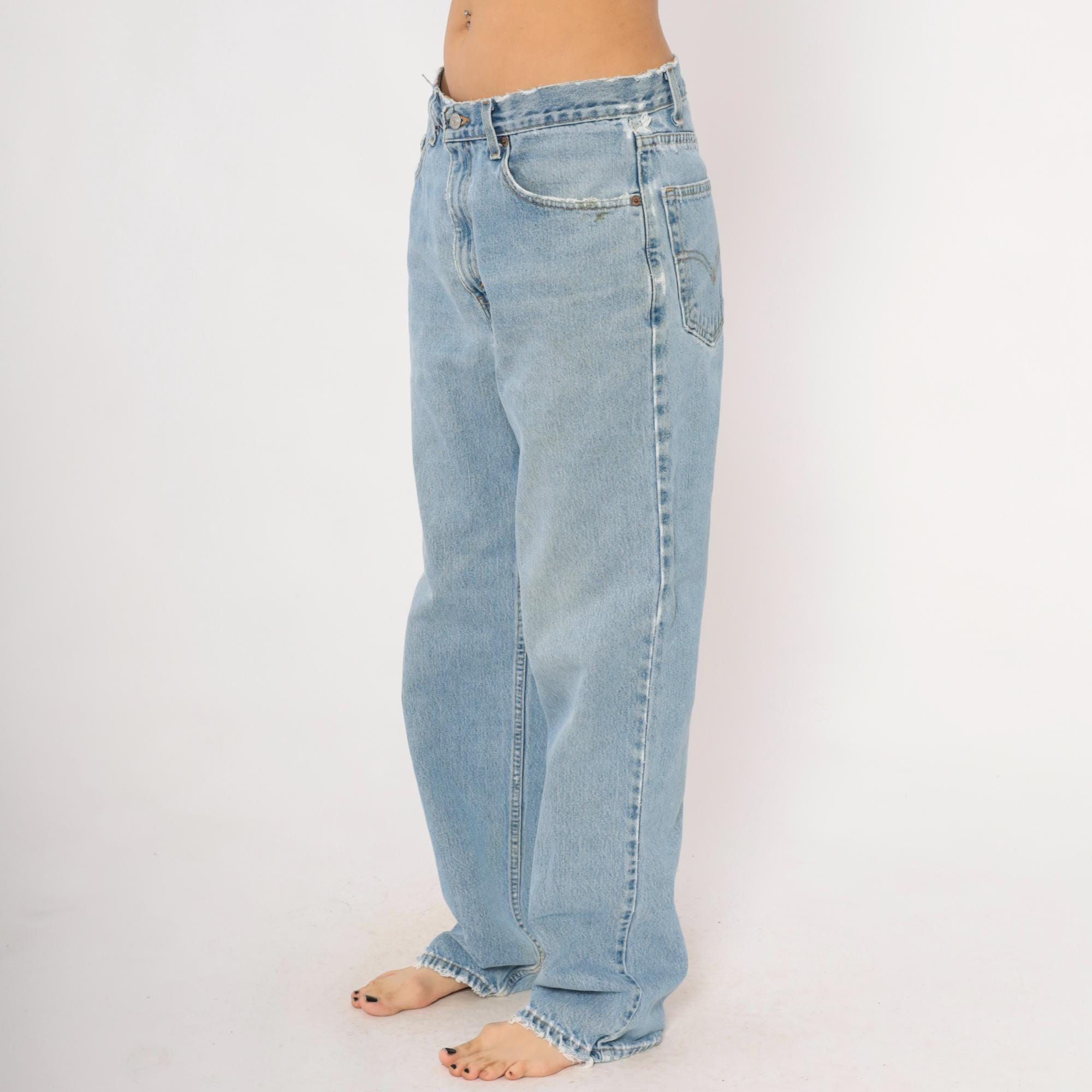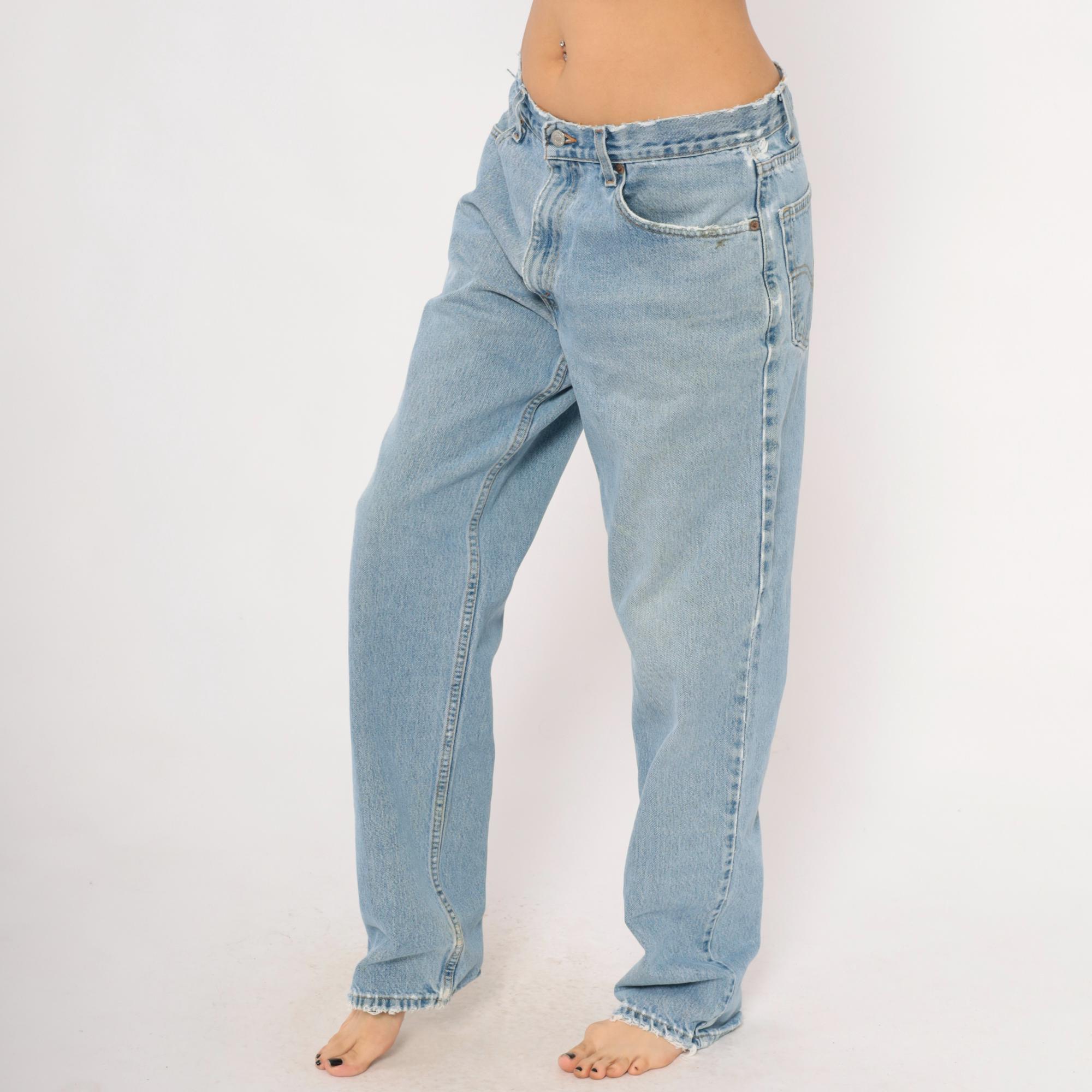 Levi's 550 relaxed fit jeans in a light stonewash blue with faded whiskering at the hips and thighs. Five-pocket construction with copper rivets, front zipper closure, and a single metal button at the waist. Raw cut waistband edge and slightly frayed hems, straight leg silhouette from hip to ankle.