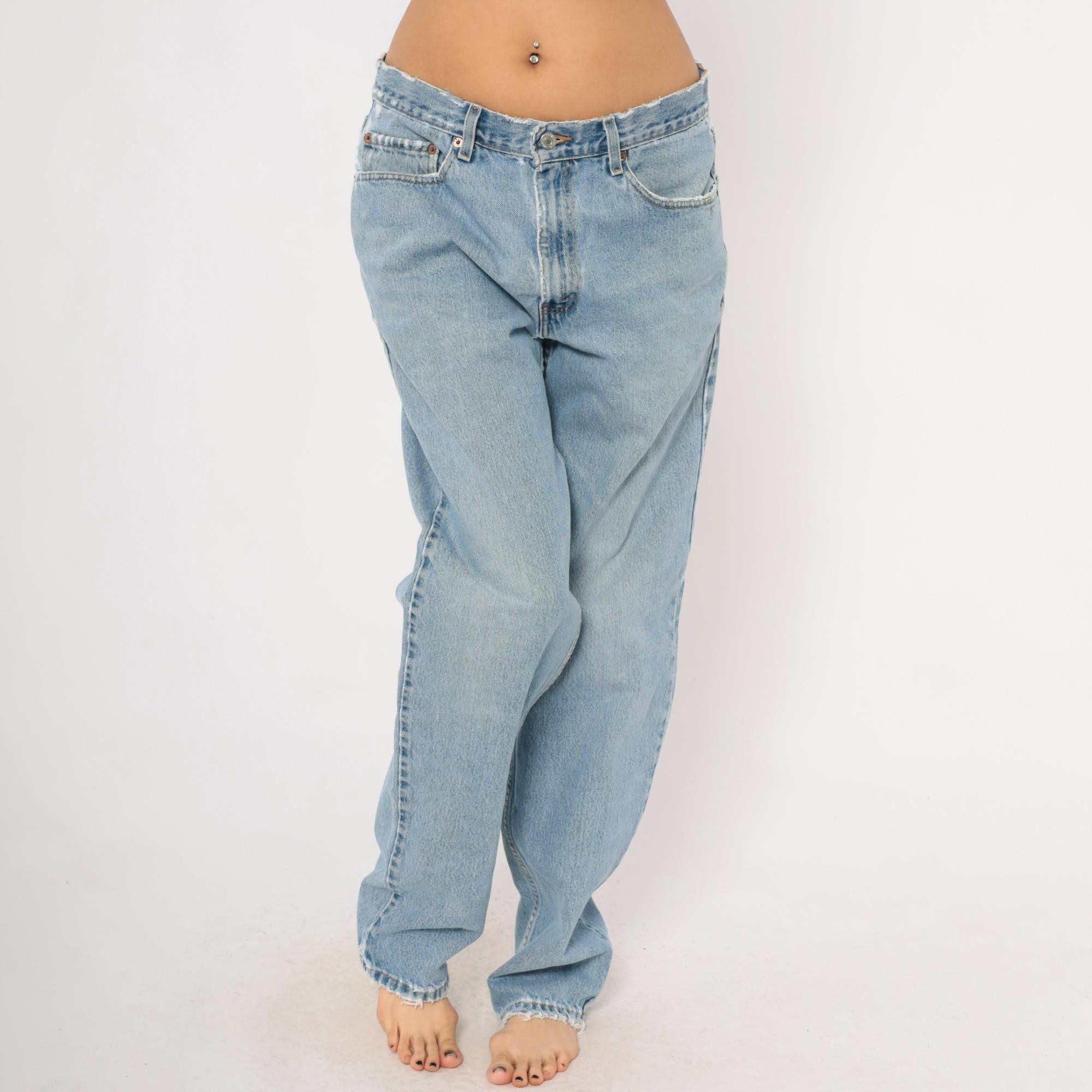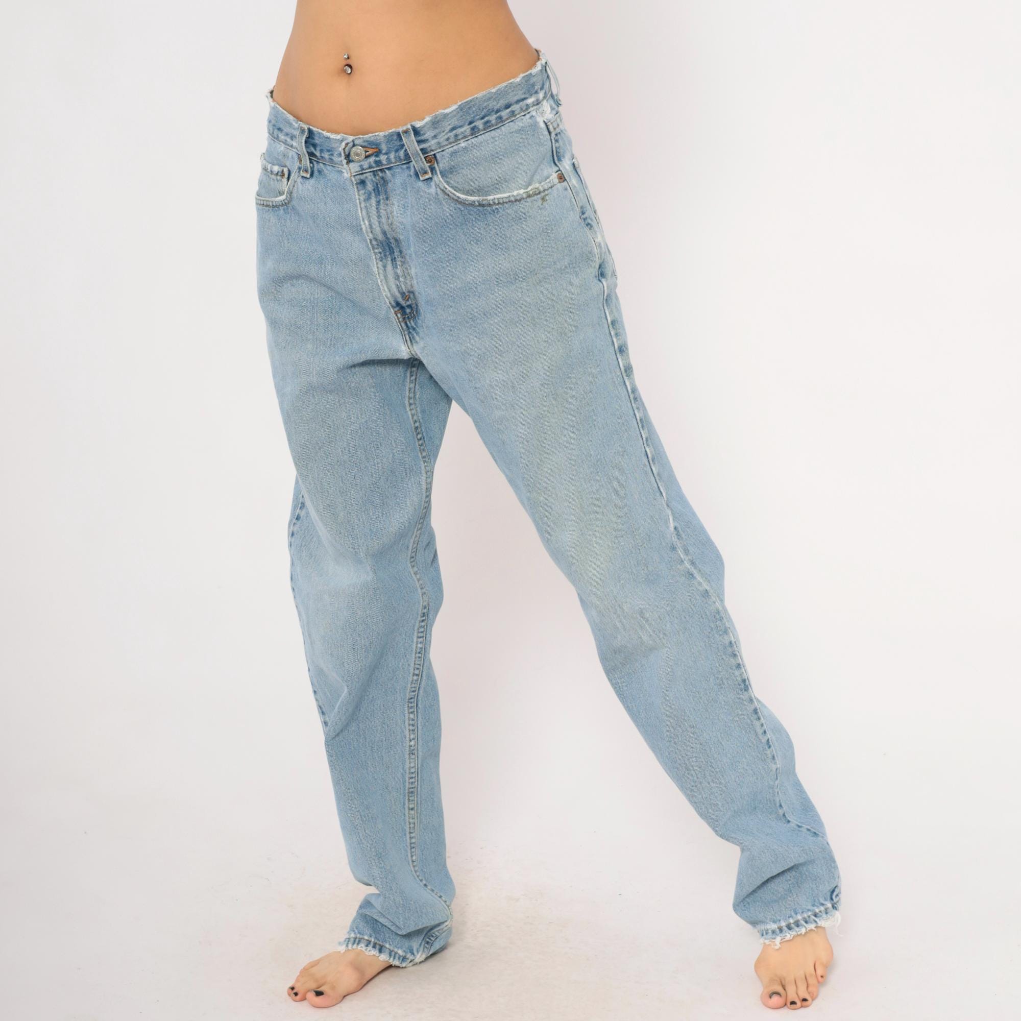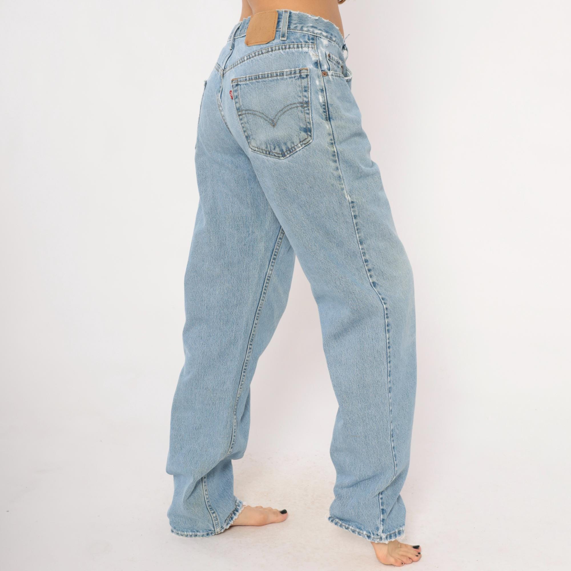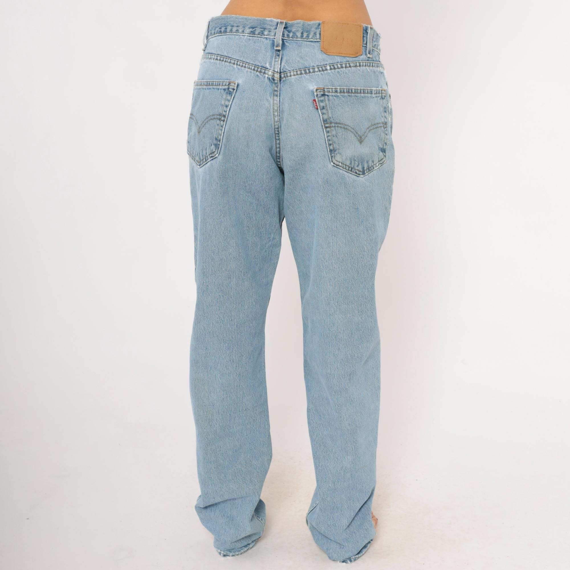 Levi's 550 relaxed fit jeans in a light stonewash blue with faded whiskering at the hips and thighs. Five-pocket construction with copper rivets, front zipper closure, and a single metal button at the waist. Raw cut waistband edge and slightly frayed hems, straight leg silhouette from hip to ankle.