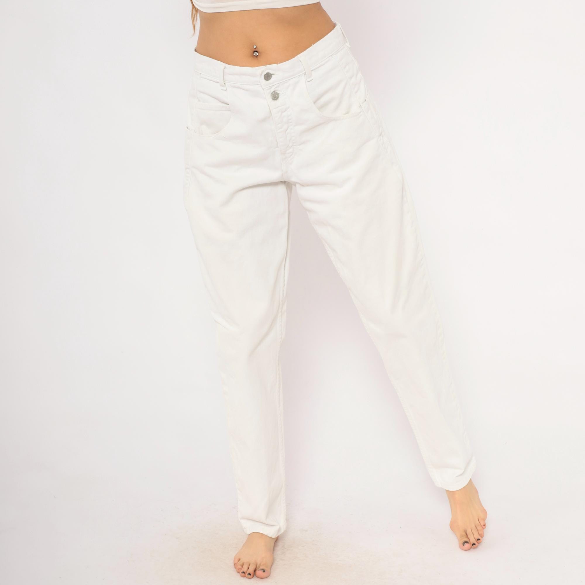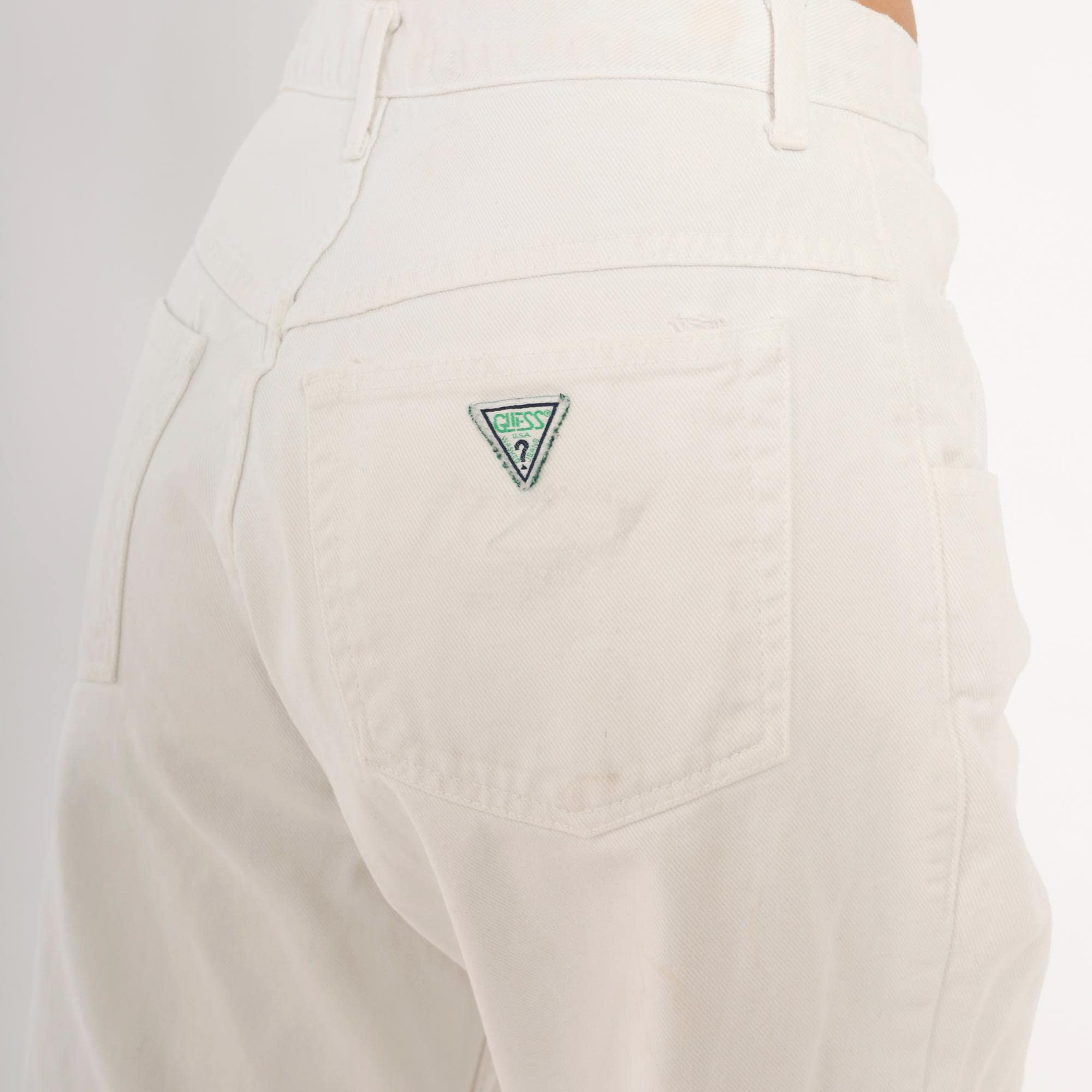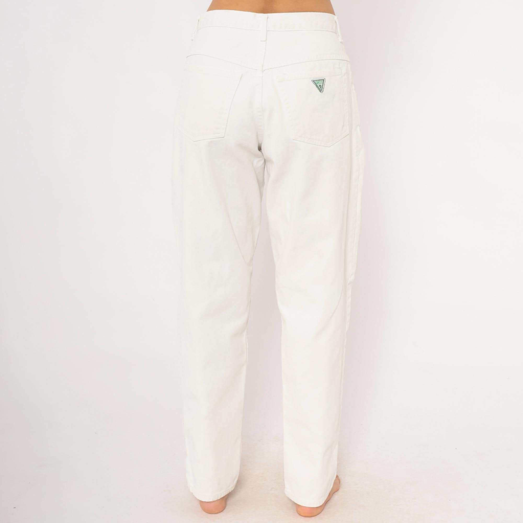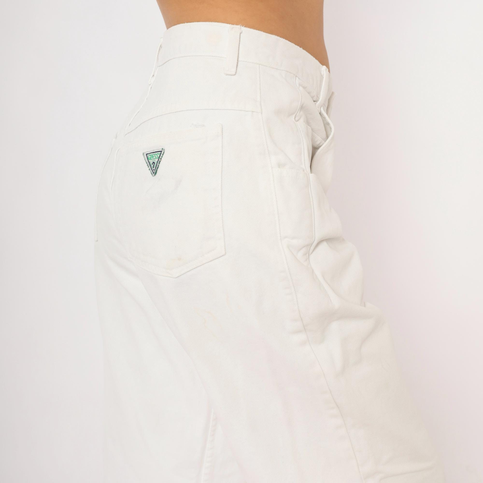 90s white Guess jeans with a high-rise waist, straight tapered leg, and front zipper closure with double button waistband. Five-pocket construction with two front patch pockets, two back pockets, and a side seam pocket. The signature Guess green triangle logo patch sits on the back right pocket, with belt loops along the waistband.