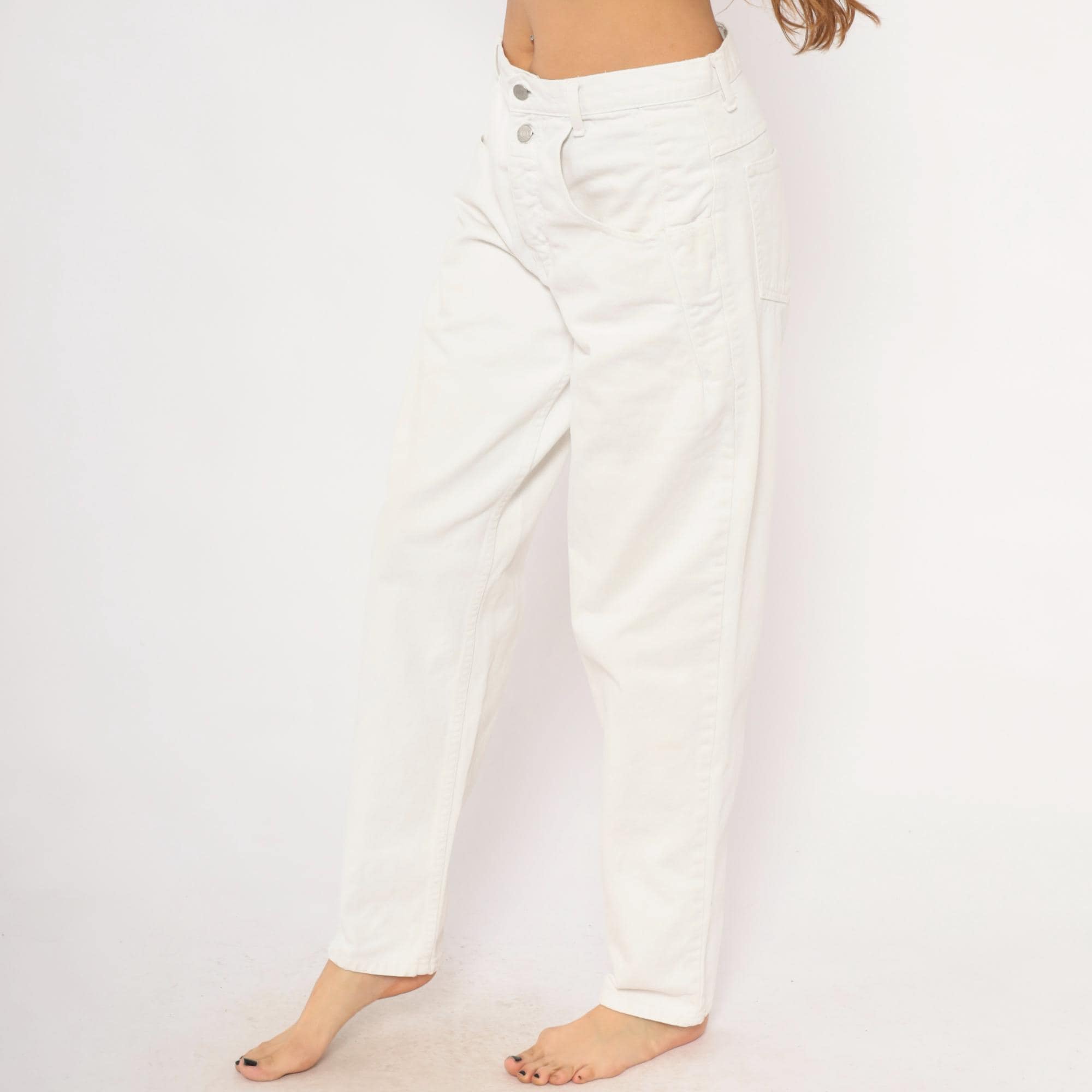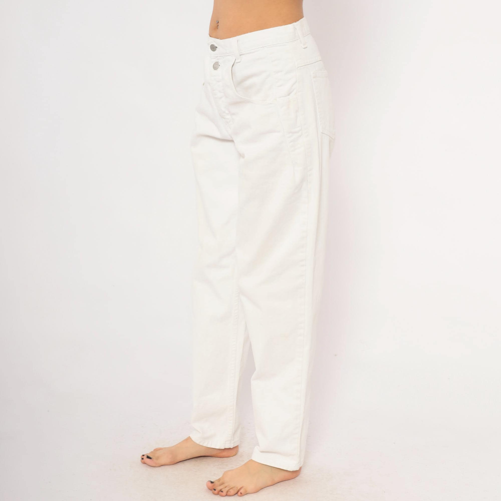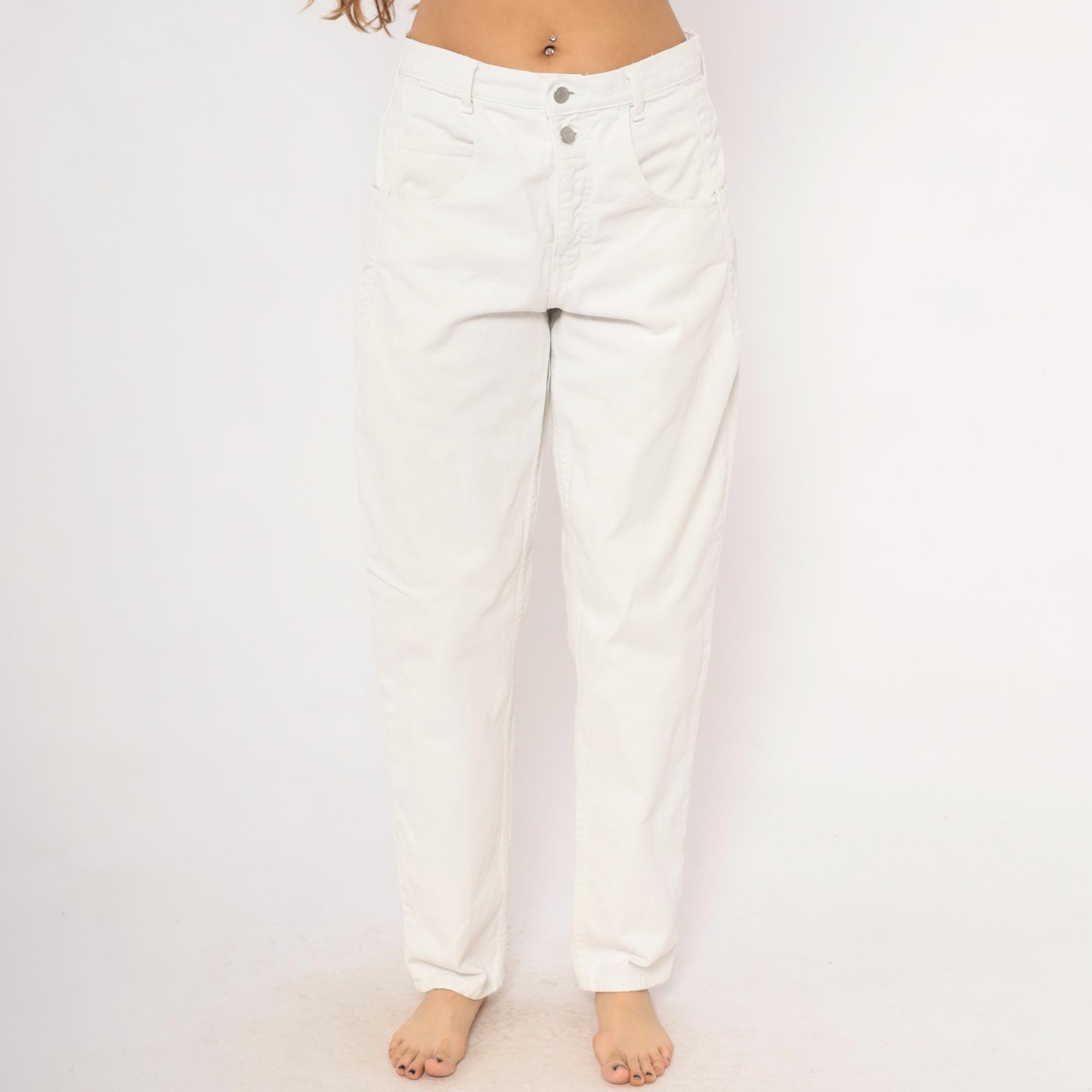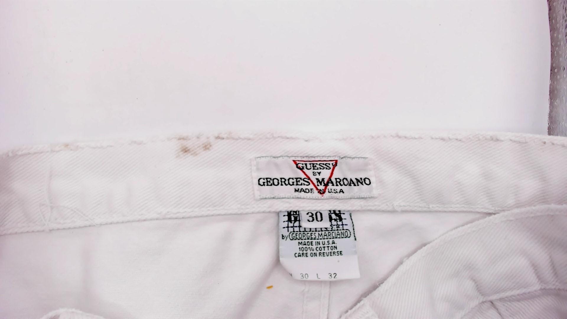 90s white Guess jeans with a high-rise waist, straight tapered leg, and front zipper closure with double button waistband. Five-pocket construction with two front patch pockets, two back pockets, and a side seam pocket. The signature Guess green triangle logo patch sits on the back right pocket, with belt loops along the waistband.
