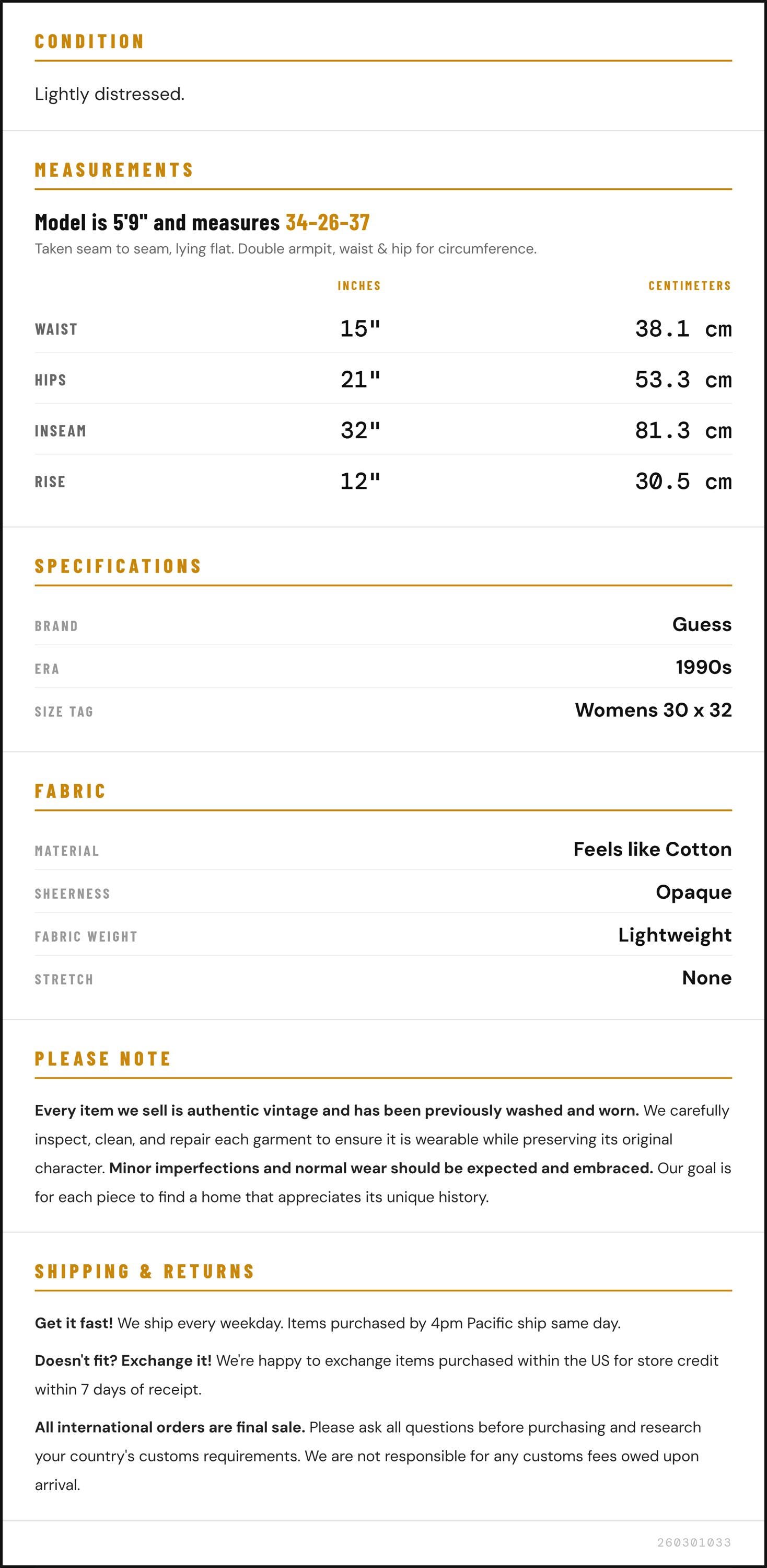Vintage denim was usually made without any stretch, unlike modern jeans. Check the measurements to ensure proper fit, and remember to give yourself a little wiggle room in the waist and hips, depending on your preferred fit.