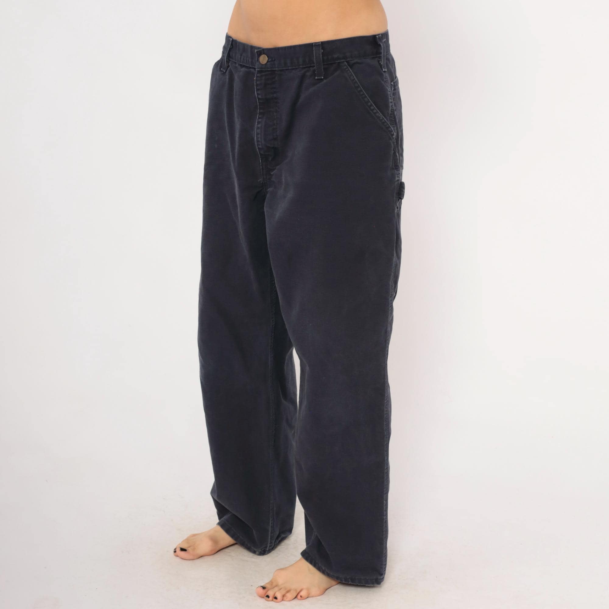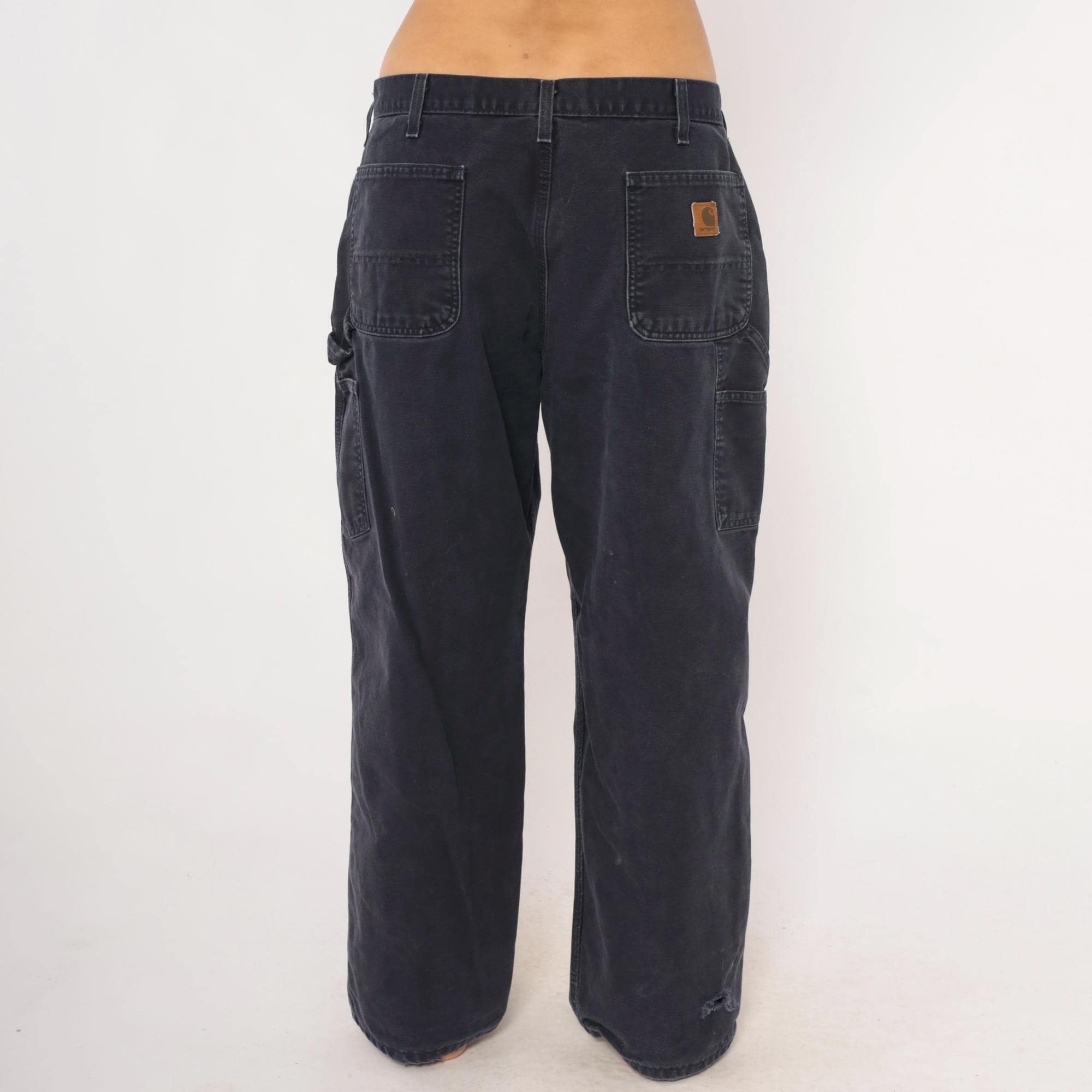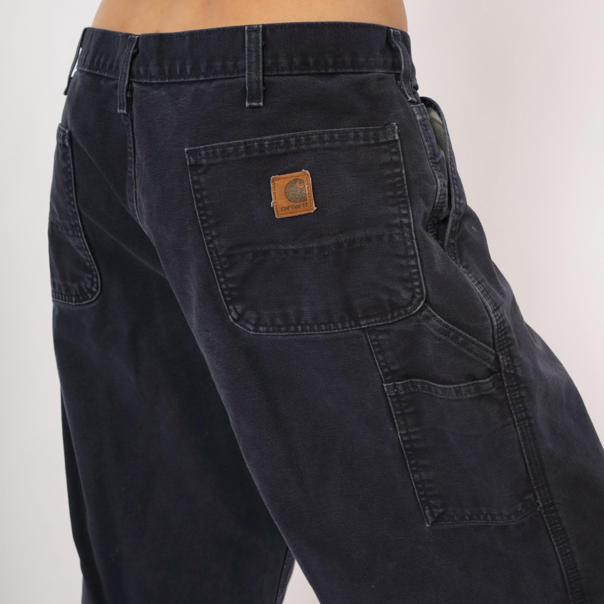 2000s Carhartt carpenter pants in a faded navy blue with a straight leg silhouette and mid-rise waist. Front zipper closure with a single brass button, belt loops, side seam pockets, front patch pockets, and back pockets. Right leg tool pocket with a hammer loop on the side. The Carhartt leather logo patch sits on the back right pocket.