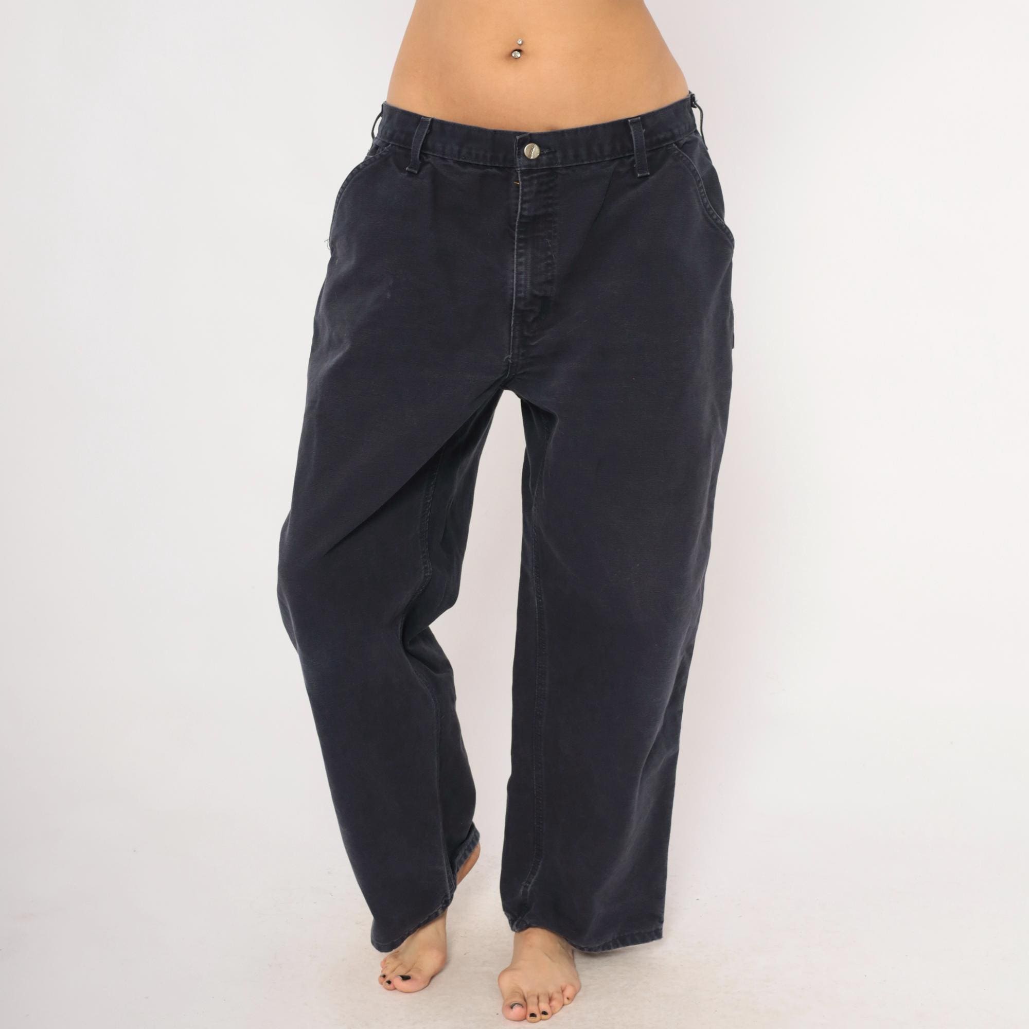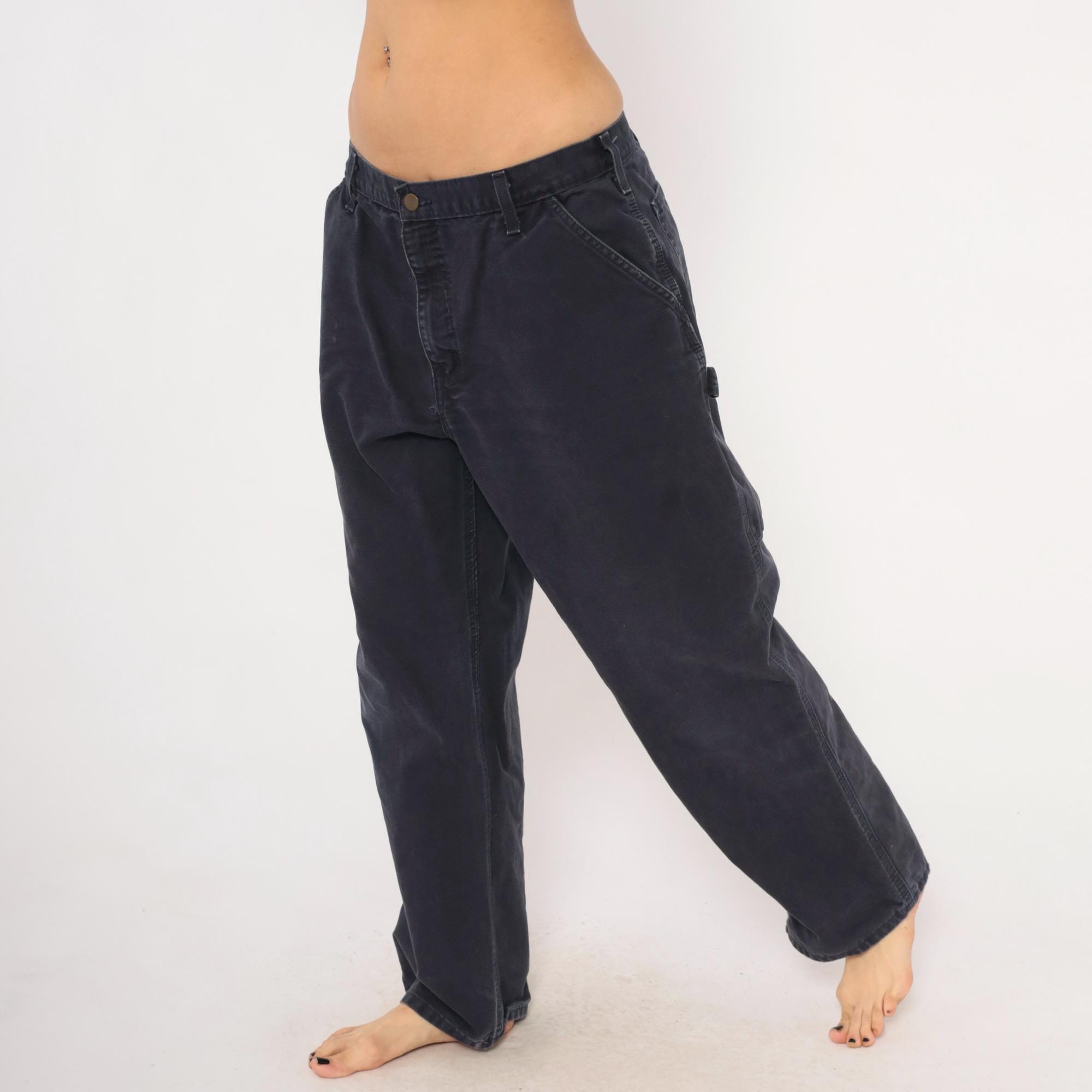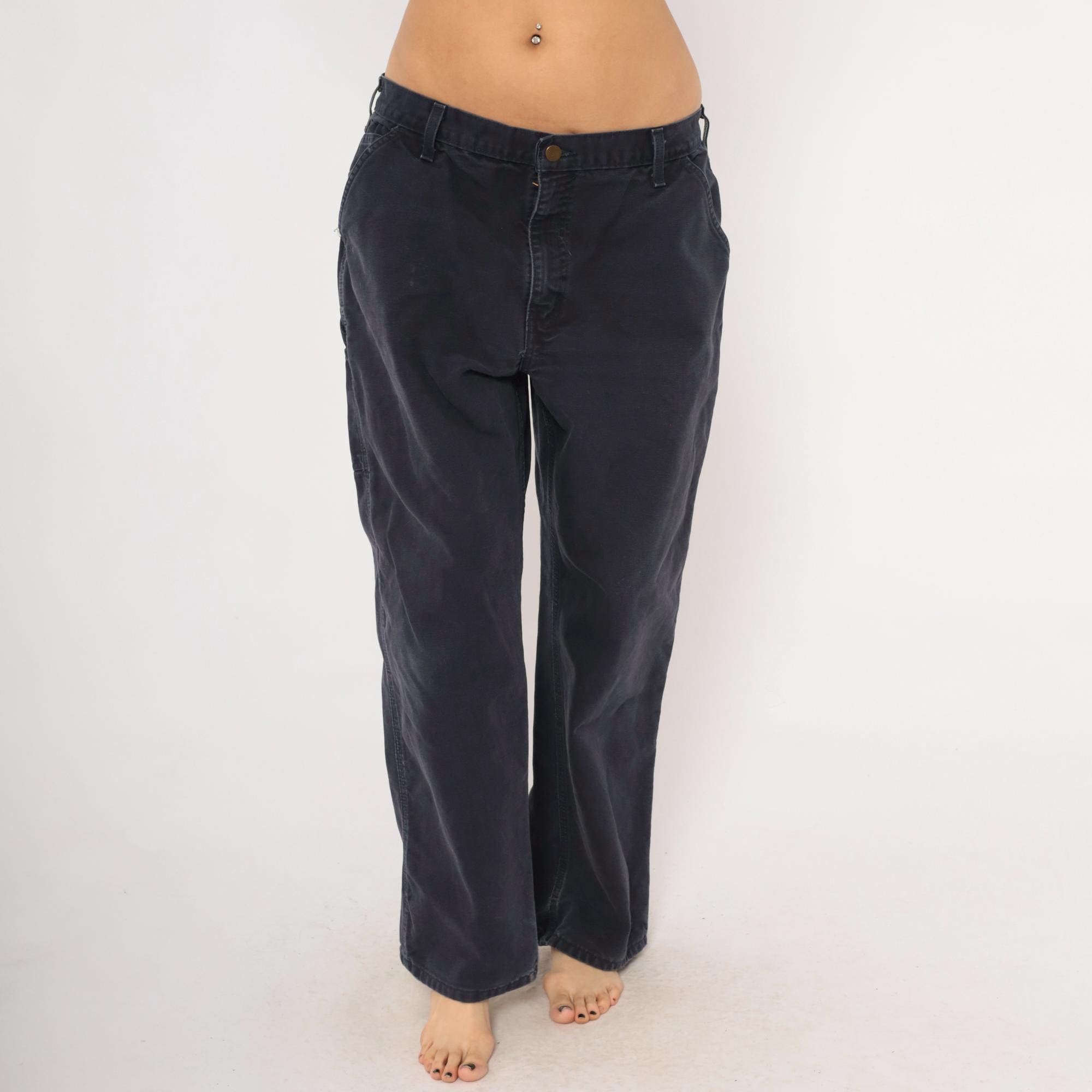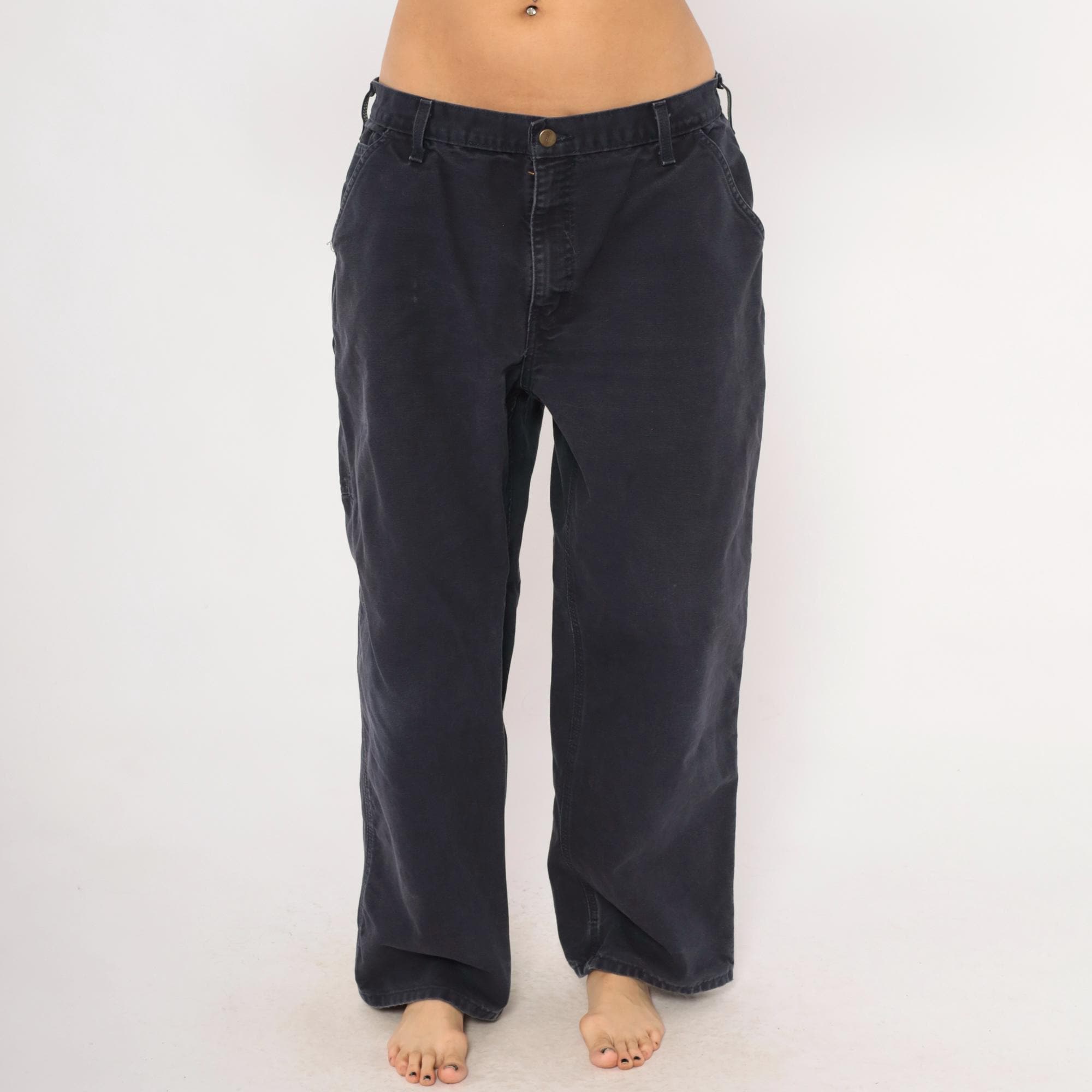 2000s Carhartt carpenter pants in a faded navy blue with a straight leg silhouette and mid-rise waist. Front zipper closure with a single brass button, belt loops, side seam pockets, front patch pockets, and back pockets. Right leg tool pocket with a hammer loop on the side. The Carhartt leather logo patch sits on the back right pocket.