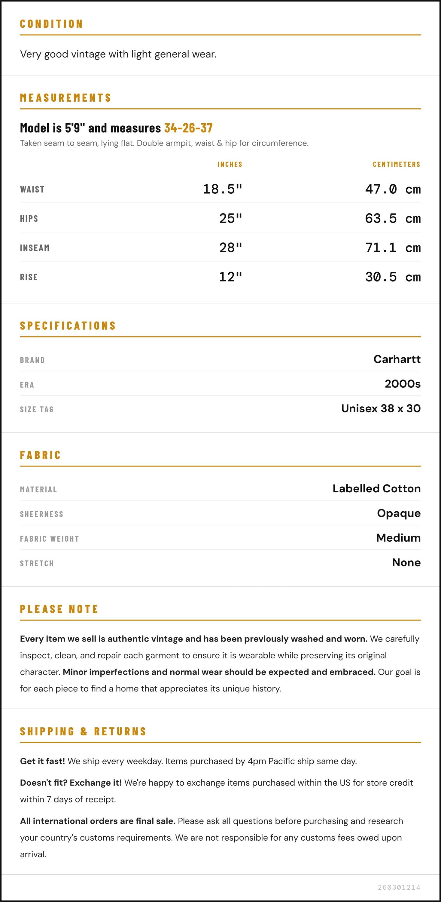 Vintage denim was usually made without any stretch, unlike modern jeans. Check the measurements to ensure proper fit, and remember to give yourself a little wiggle room in the waist and hips, depending on your preferred fit.
