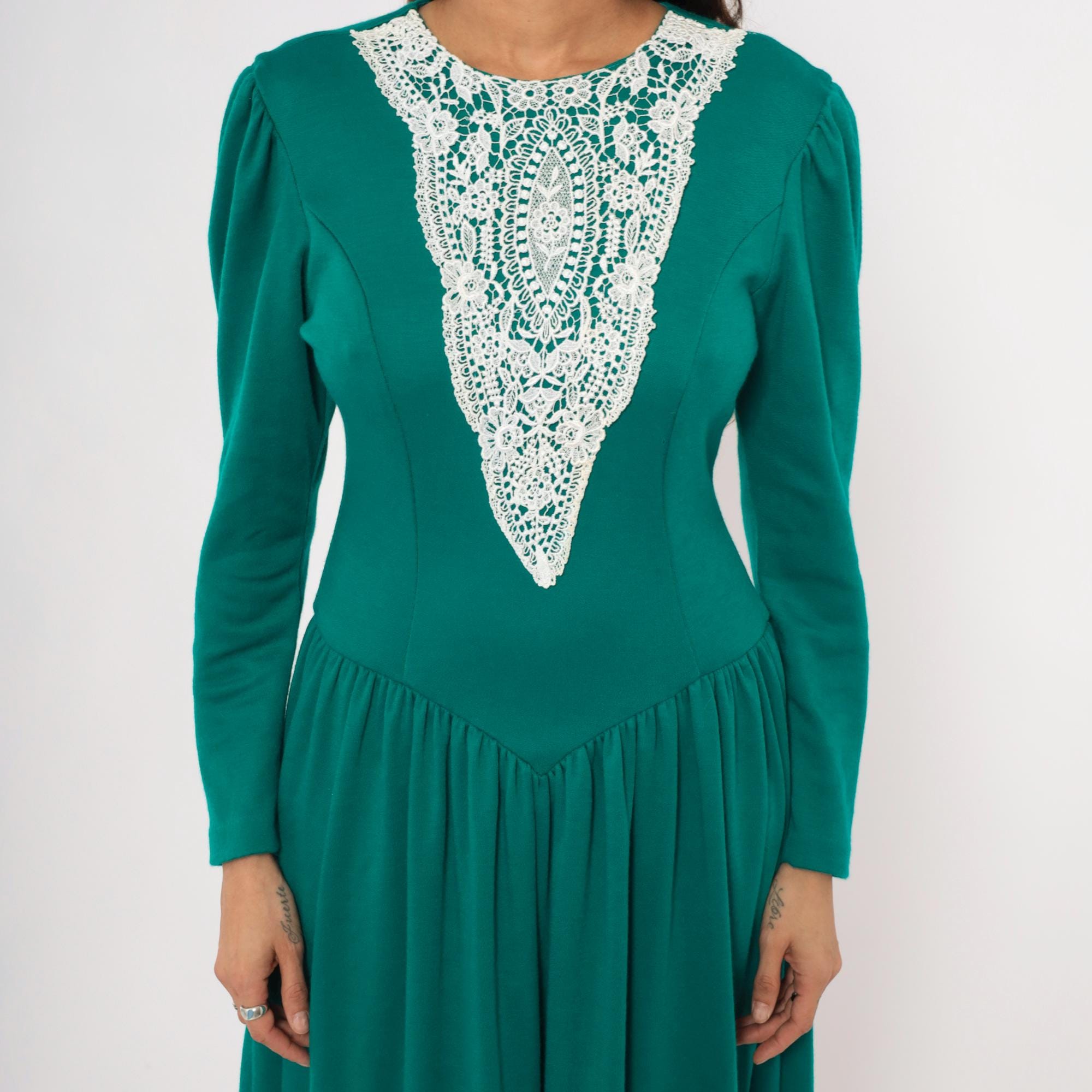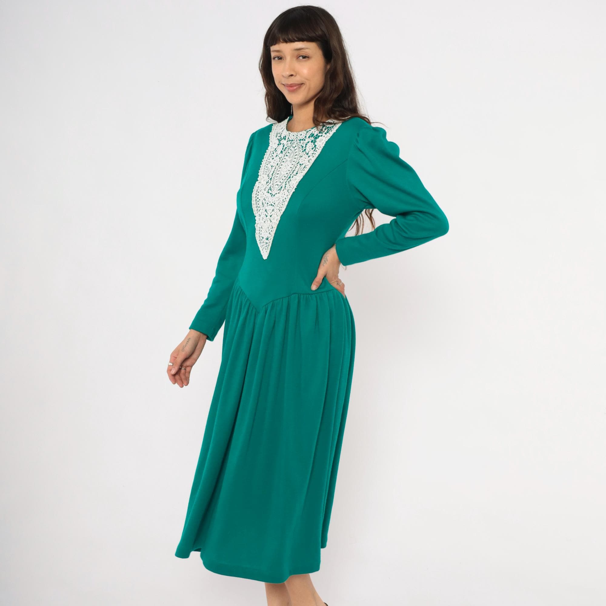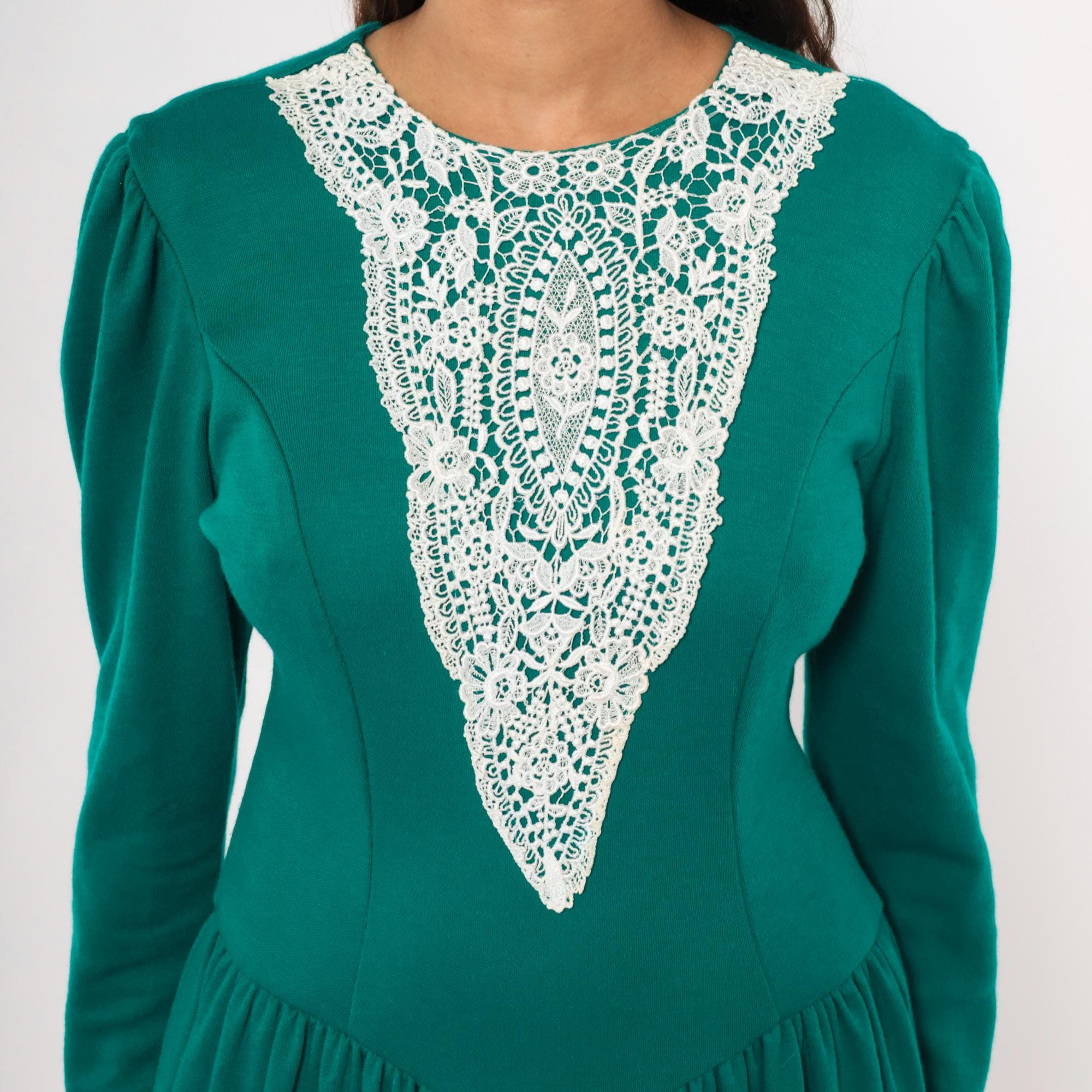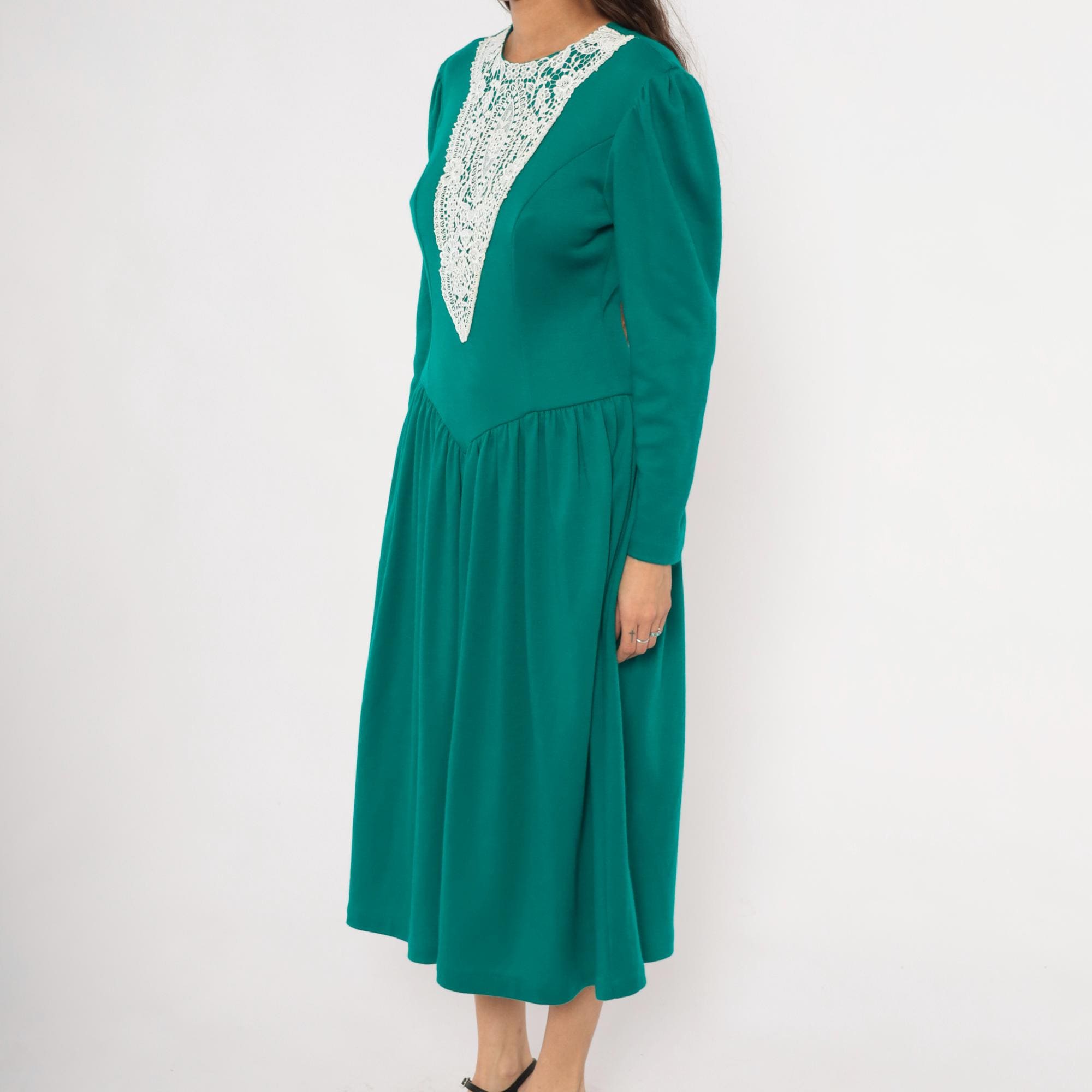 80s teal midi dress from Expo with a large white lace bib appliqué in a V-shaped panel at the front bodice, extending from the rounded crew neckline to the natural waist. Puff shoulders taper into fitted long sleeves, and princess seam darts run through the fitted bodice.