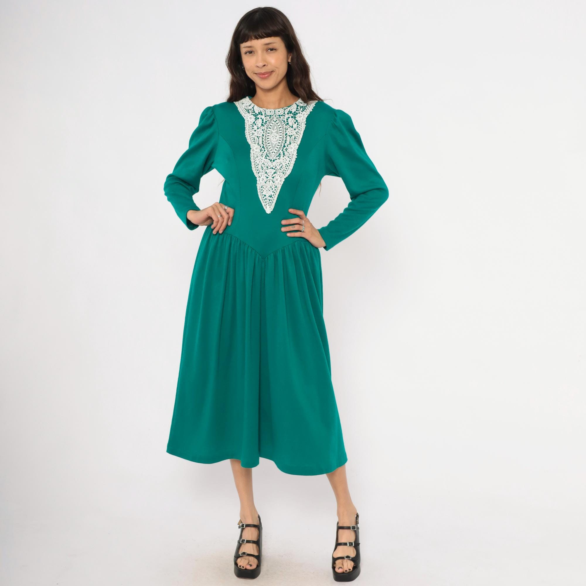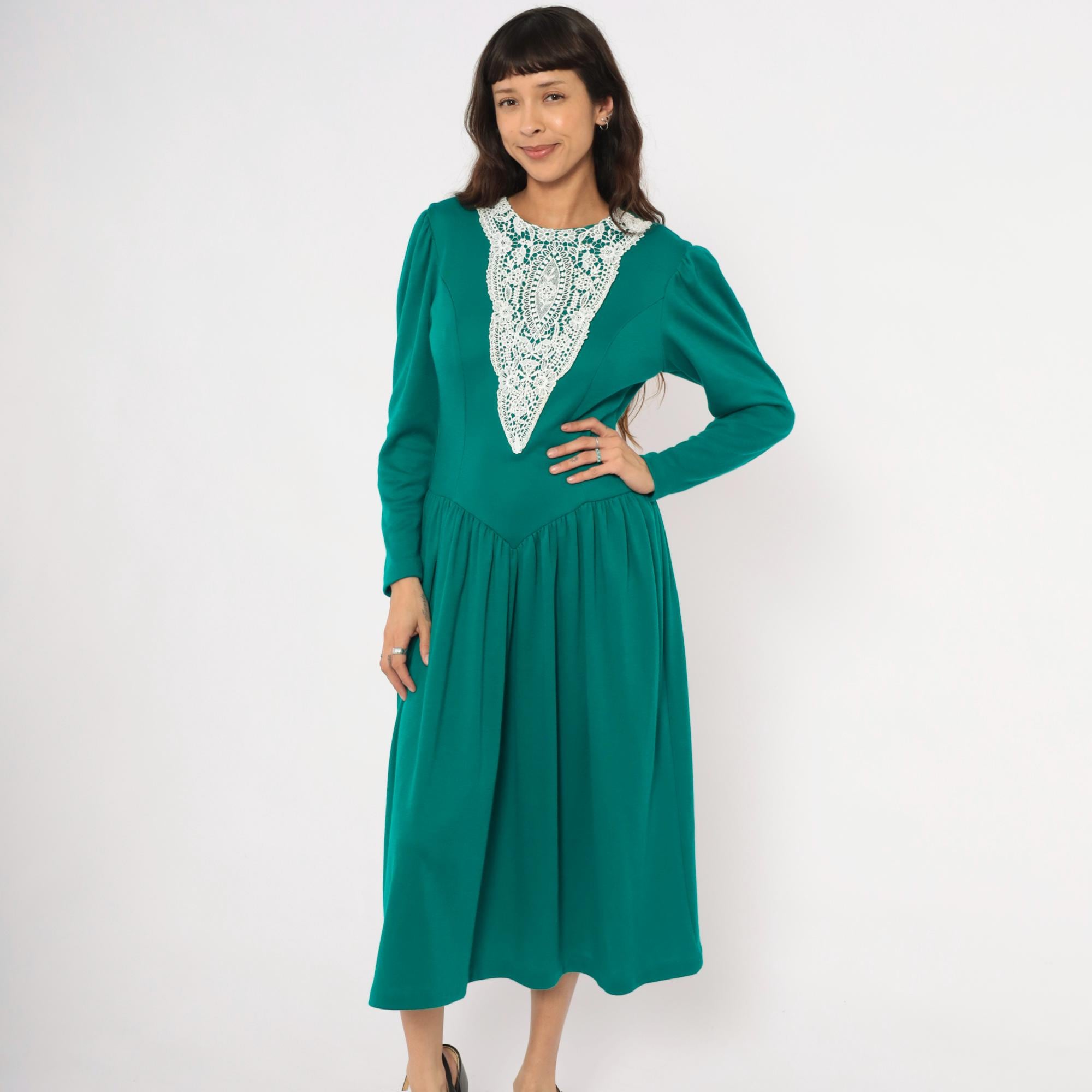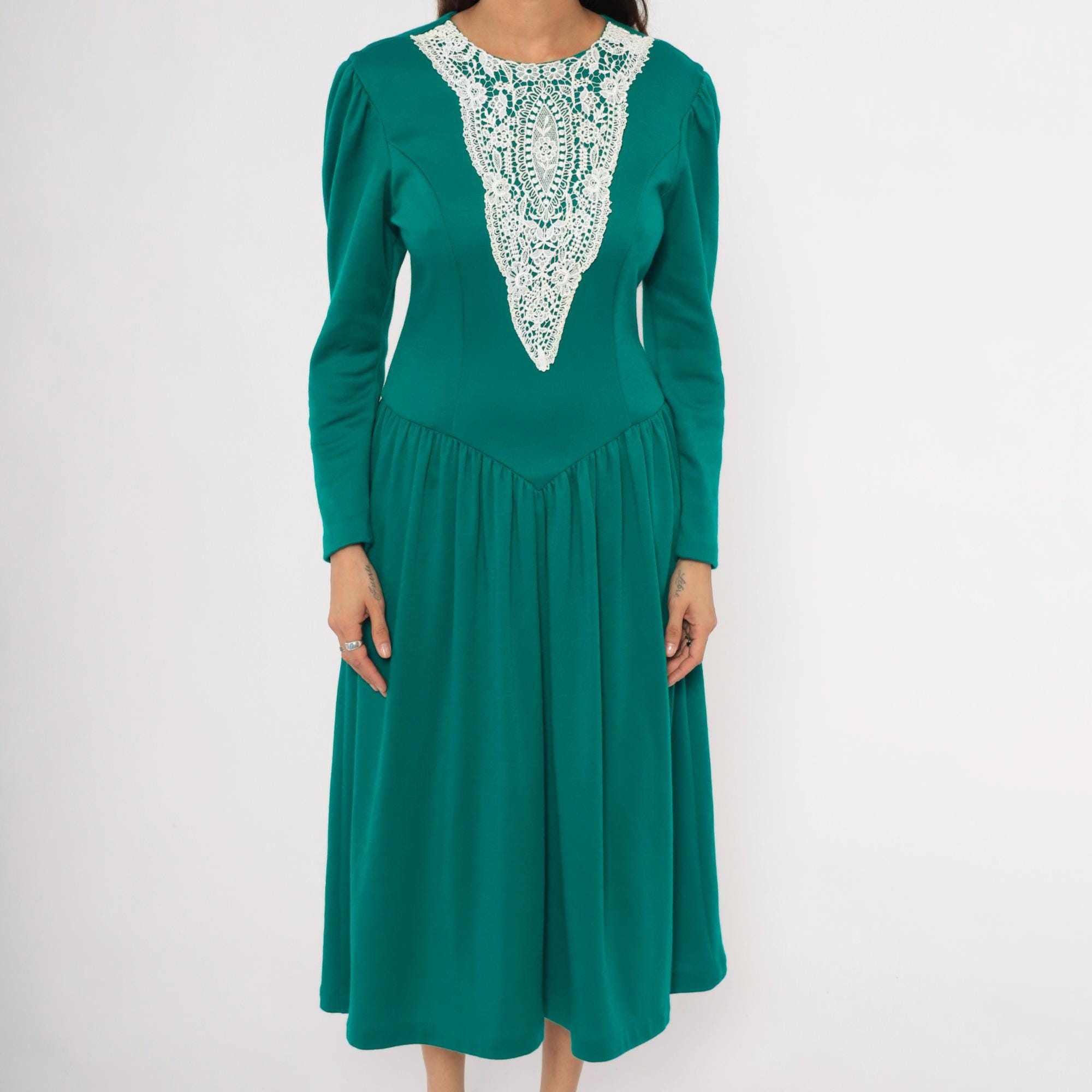 80s teal midi dress from Expo with a large white lace bib appliqué in a V-shaped panel at the front bodice, extending from the rounded crew neckline to the natural waist. Puff shoulders taper into fitted long sleeves, and princess seam darts run through the fitted bodice.