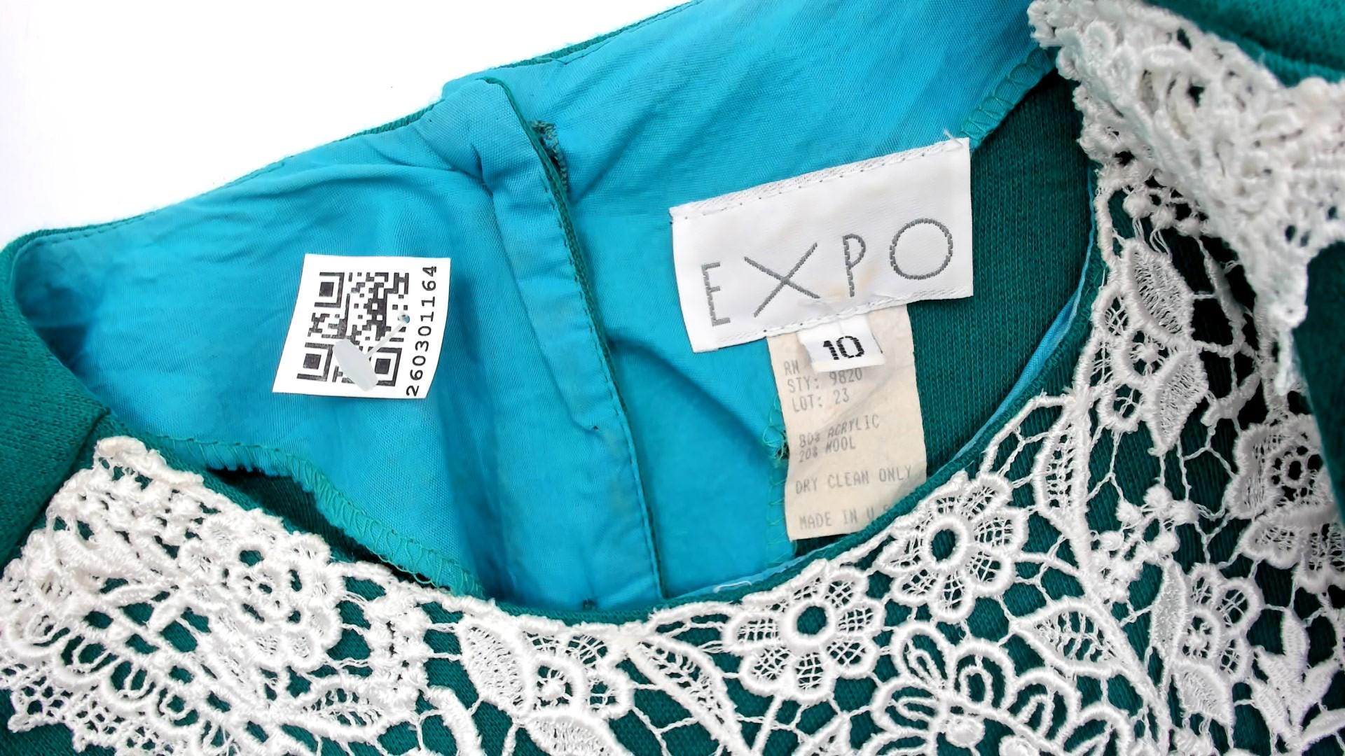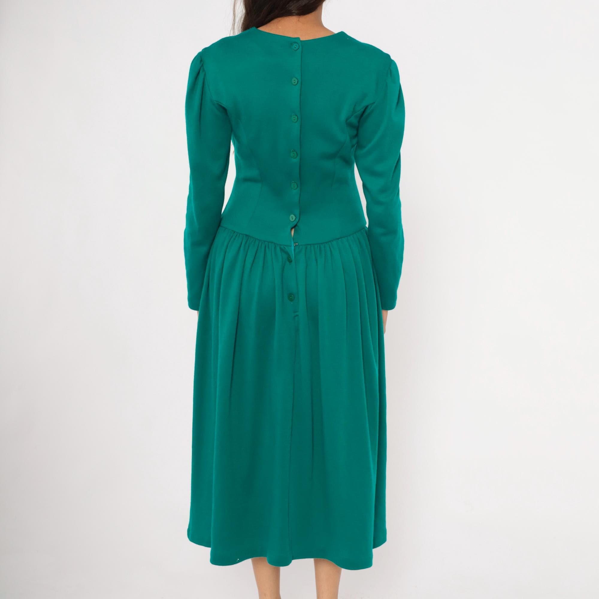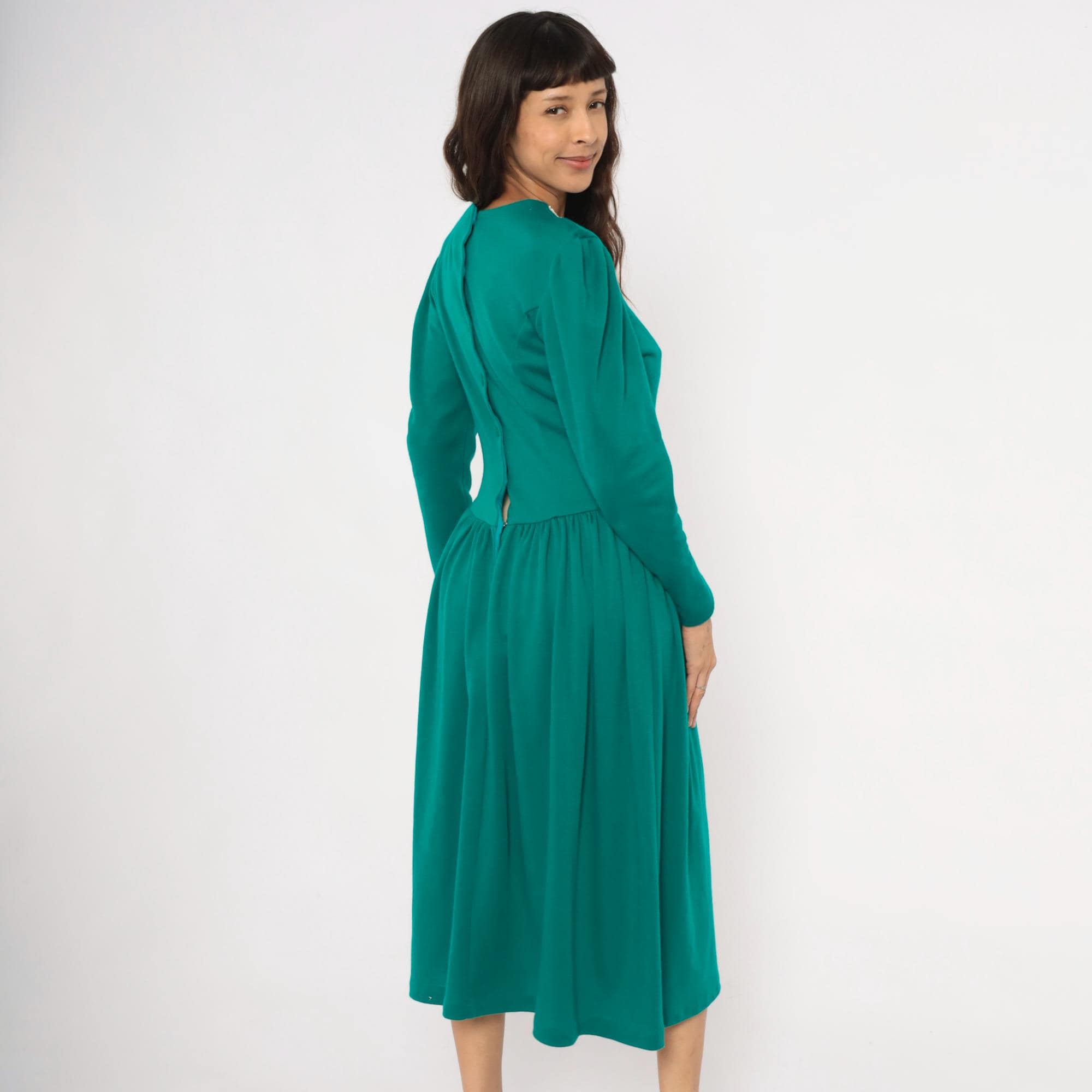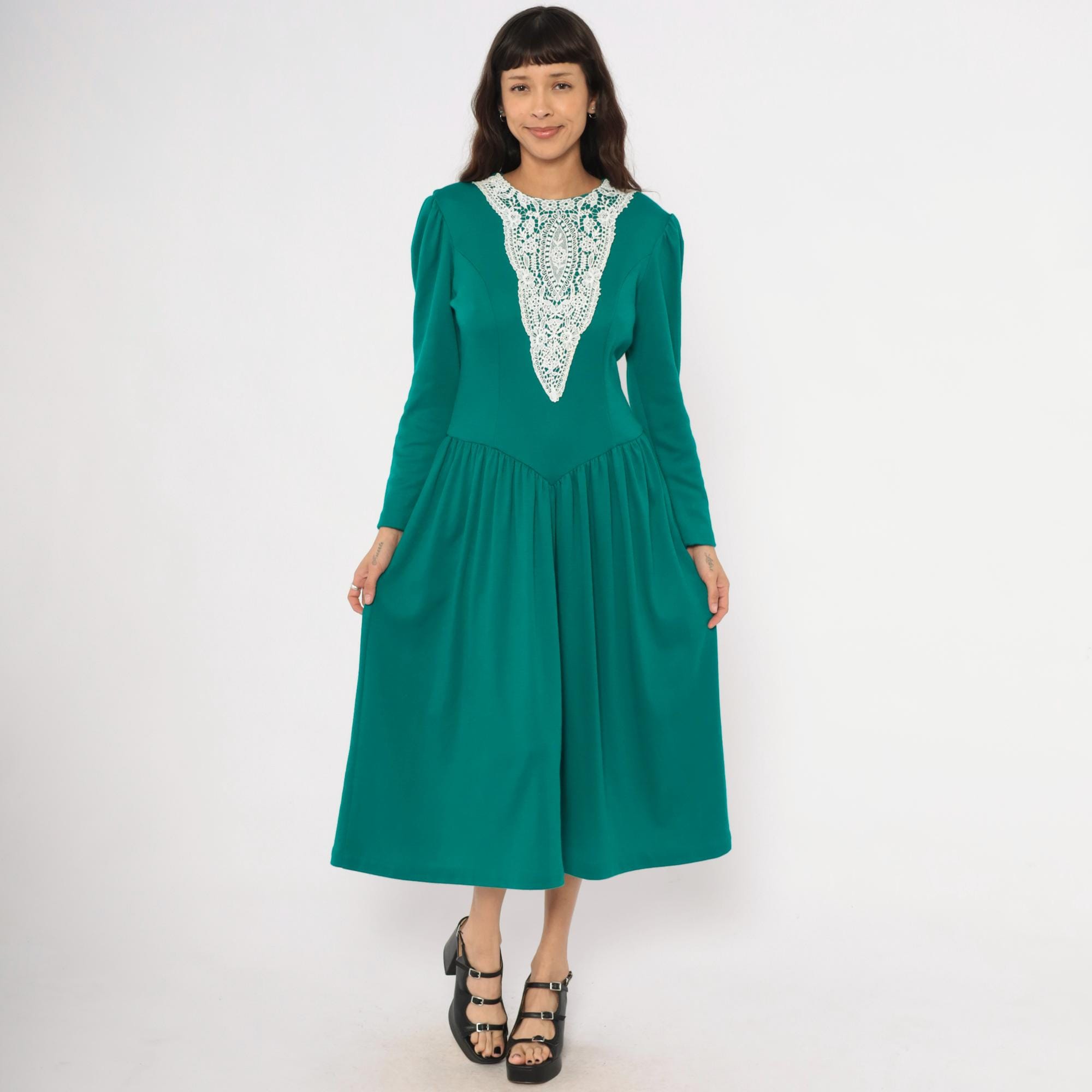 80s teal midi dress from Expo with a large white lace bib appliqué in a V-shaped panel at the front bodice, extending from the rounded crew neckline to the natural waist. Puff shoulders taper into fitted long sleeves, and princess seam darts run through the fitted bodice.