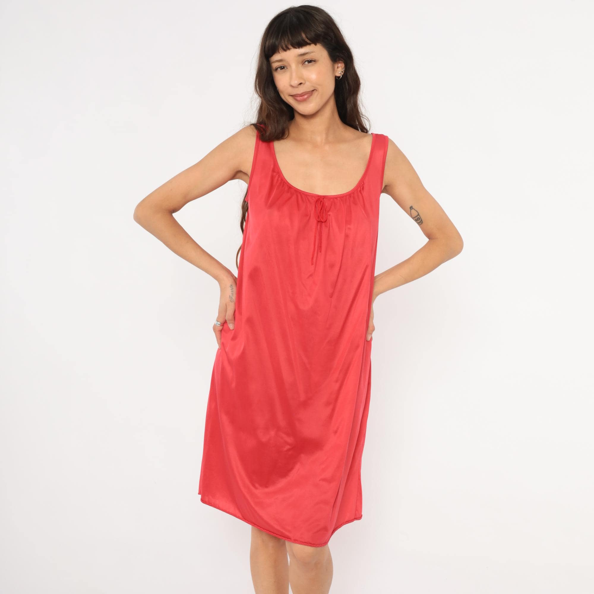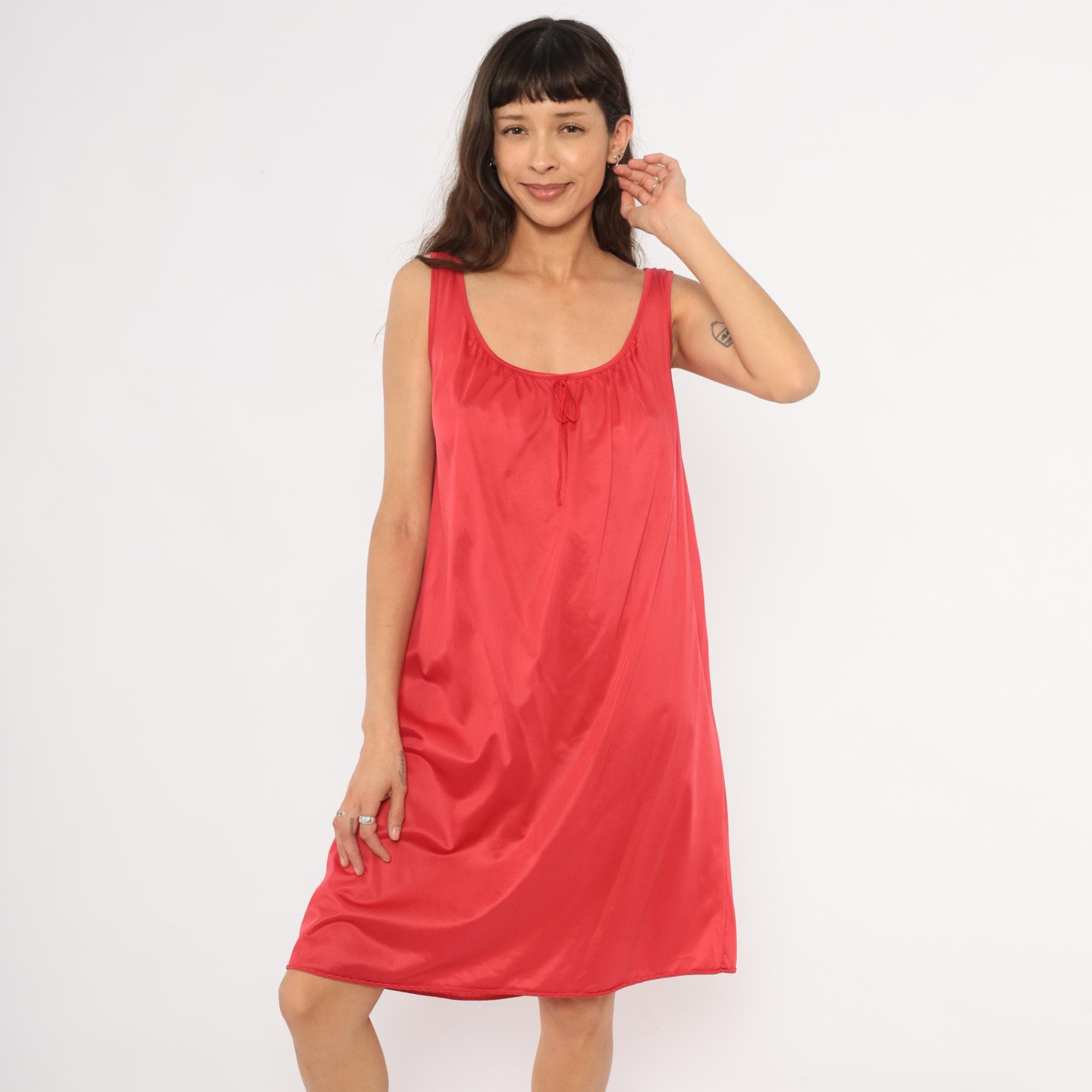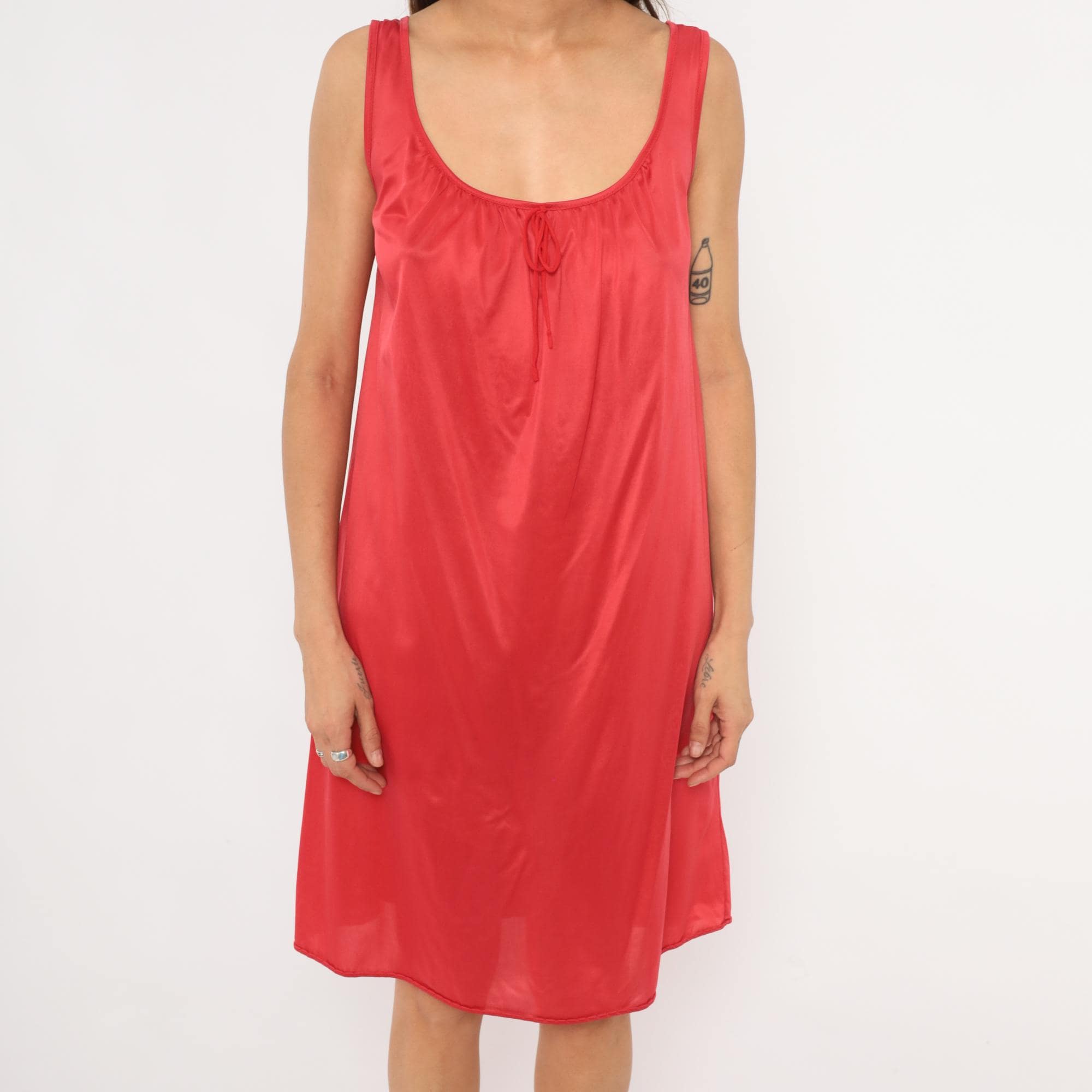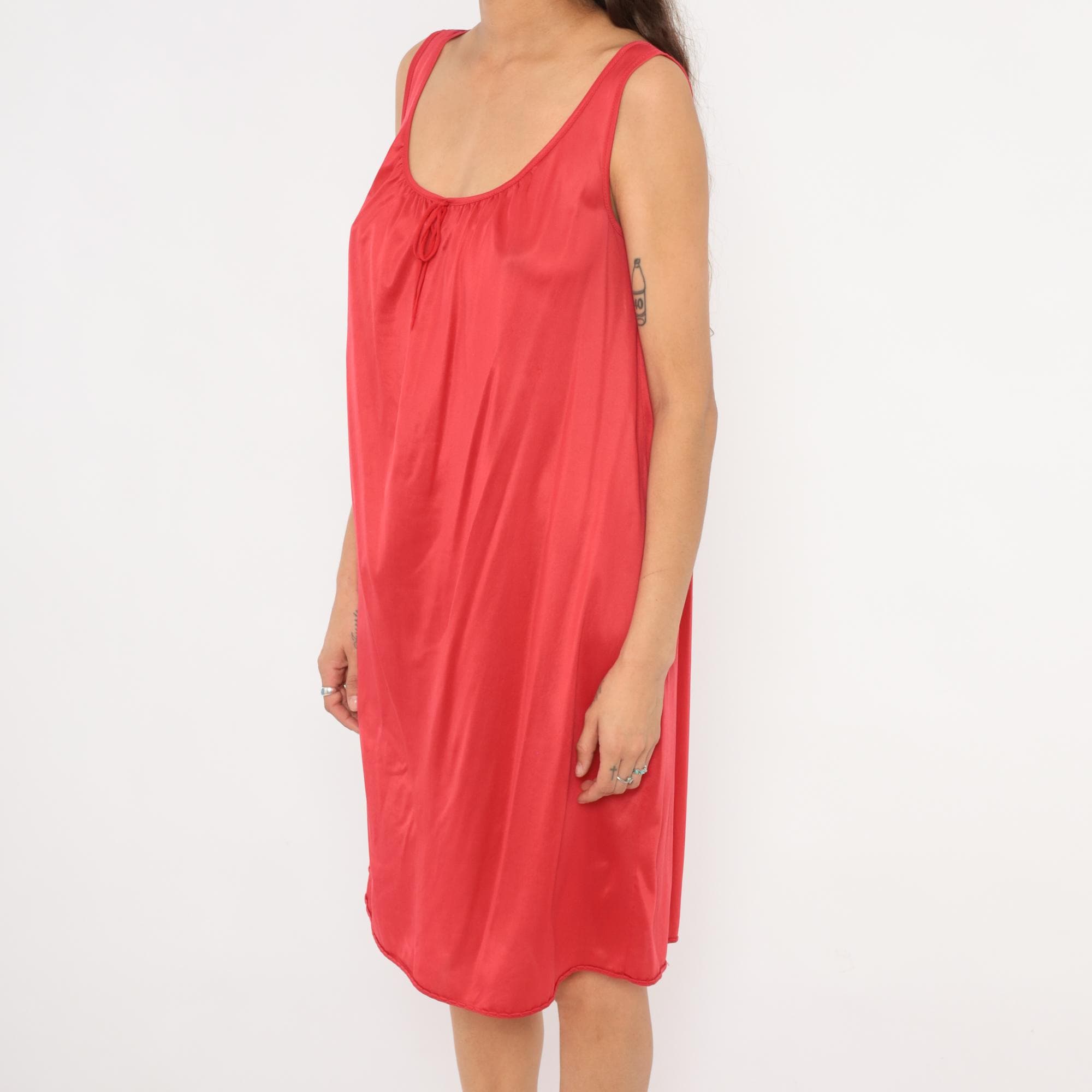 80s red nightgown from Eve Moral with a deep scoop neckline on both front and back, gathered bust with a center tie detail. Wide tank-style shoulder straps and a loose, straight body falling to knee length. Satin-finish fabric in a rich cherry red tone throughout.