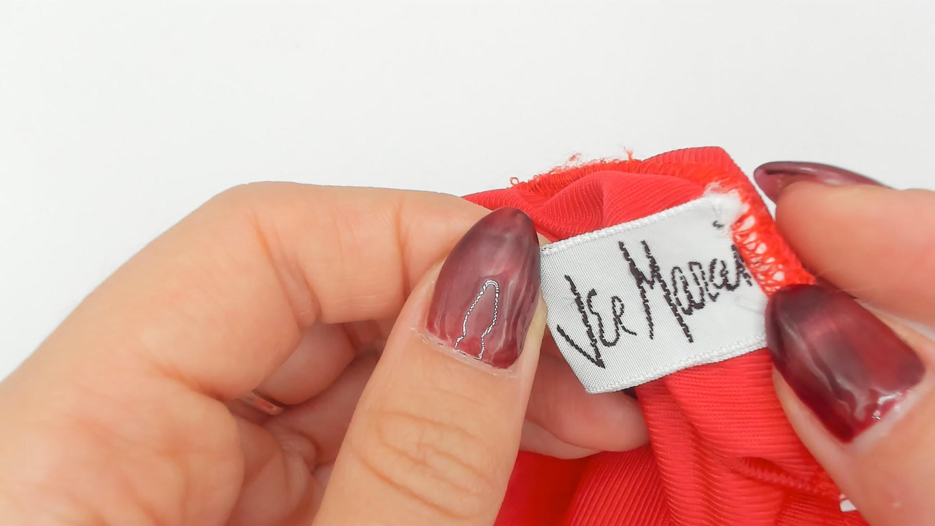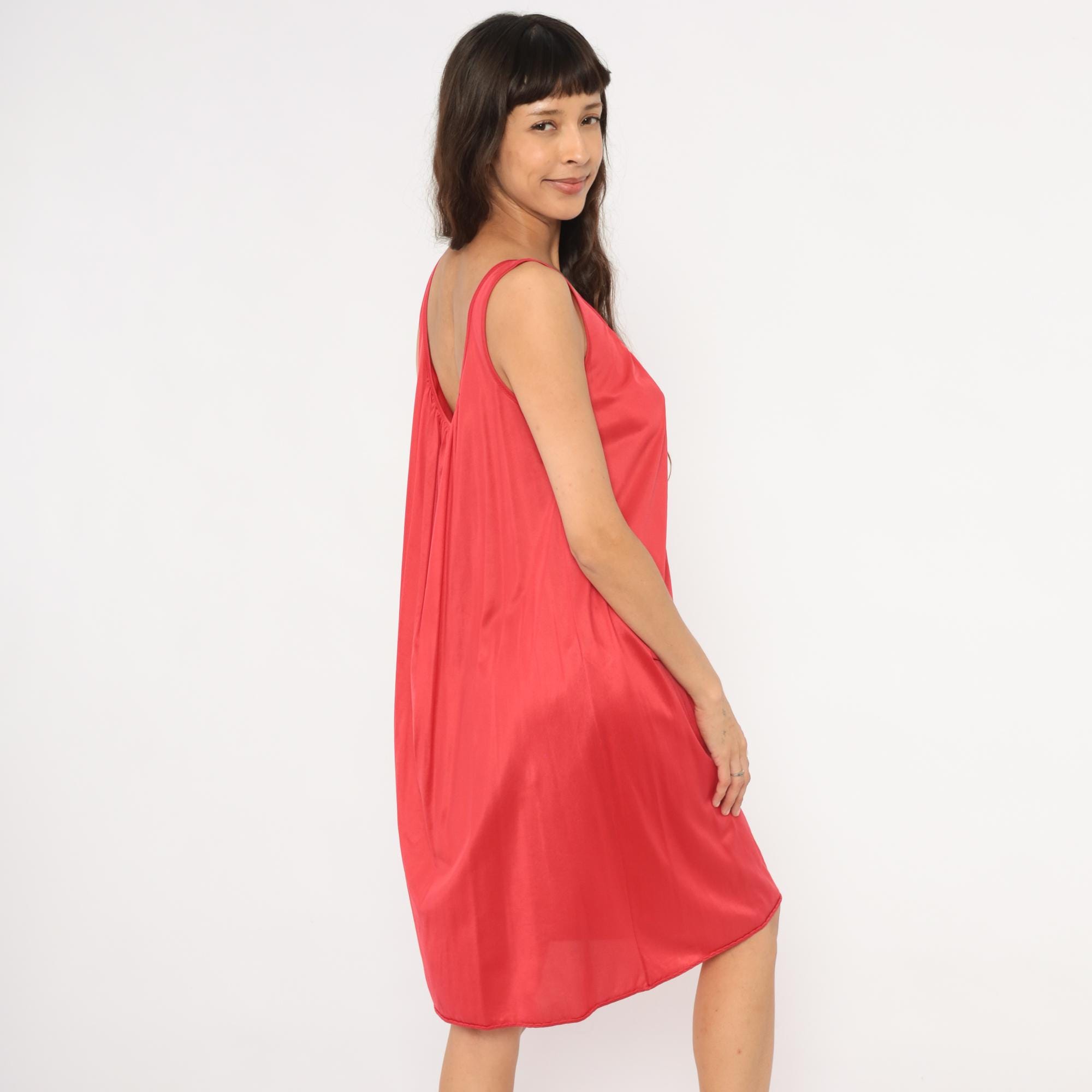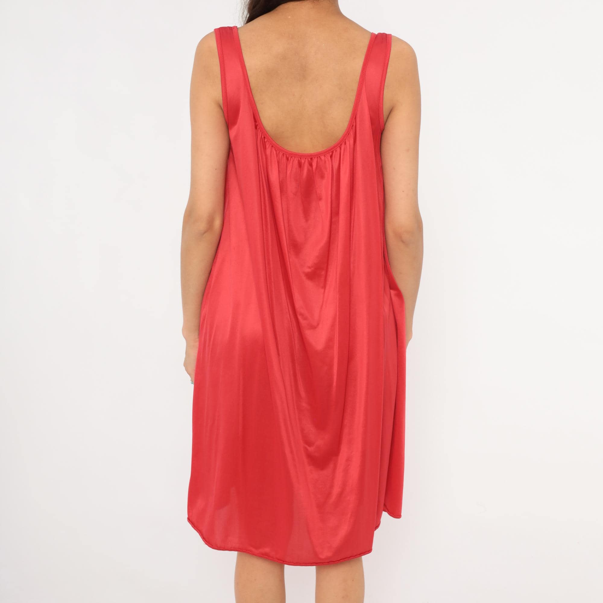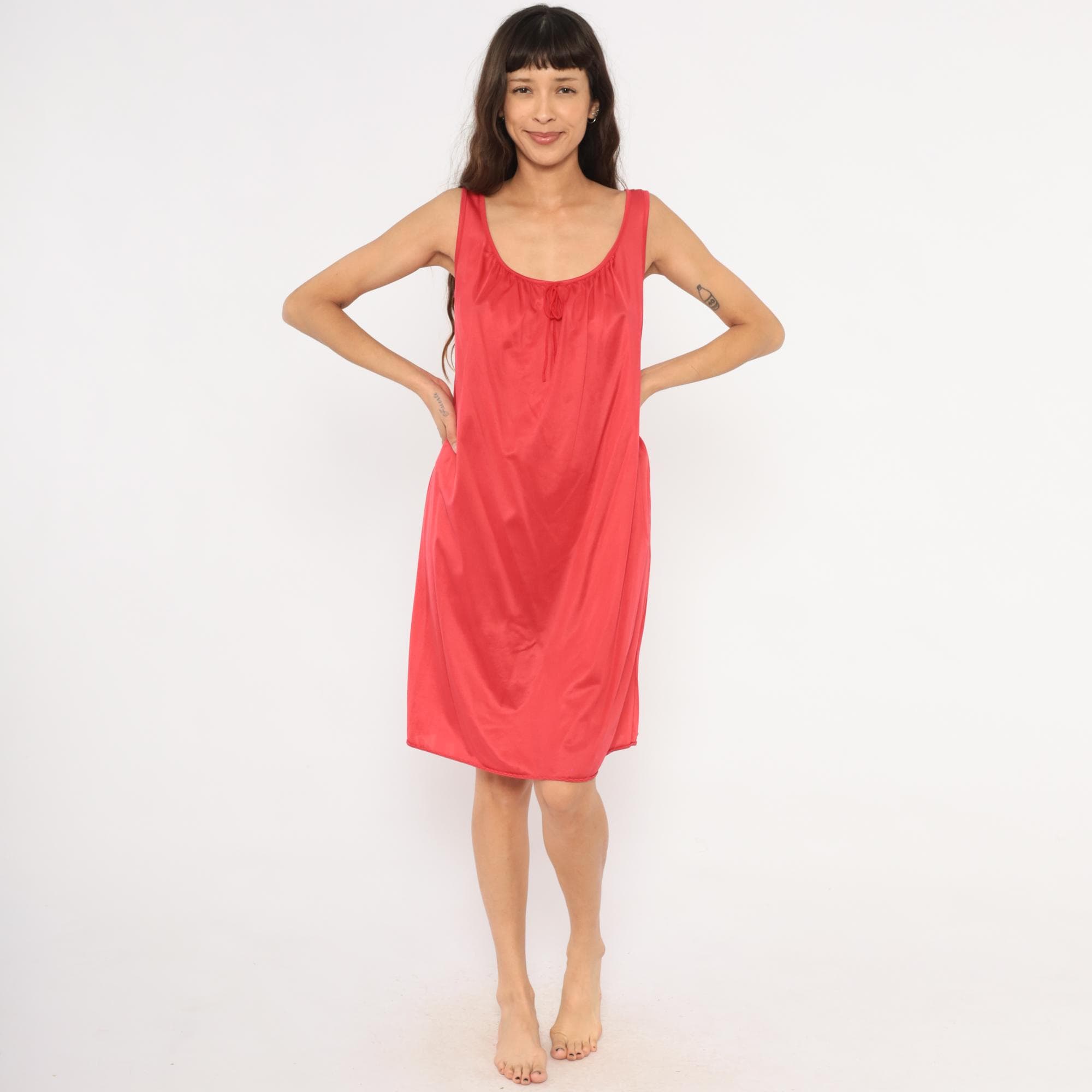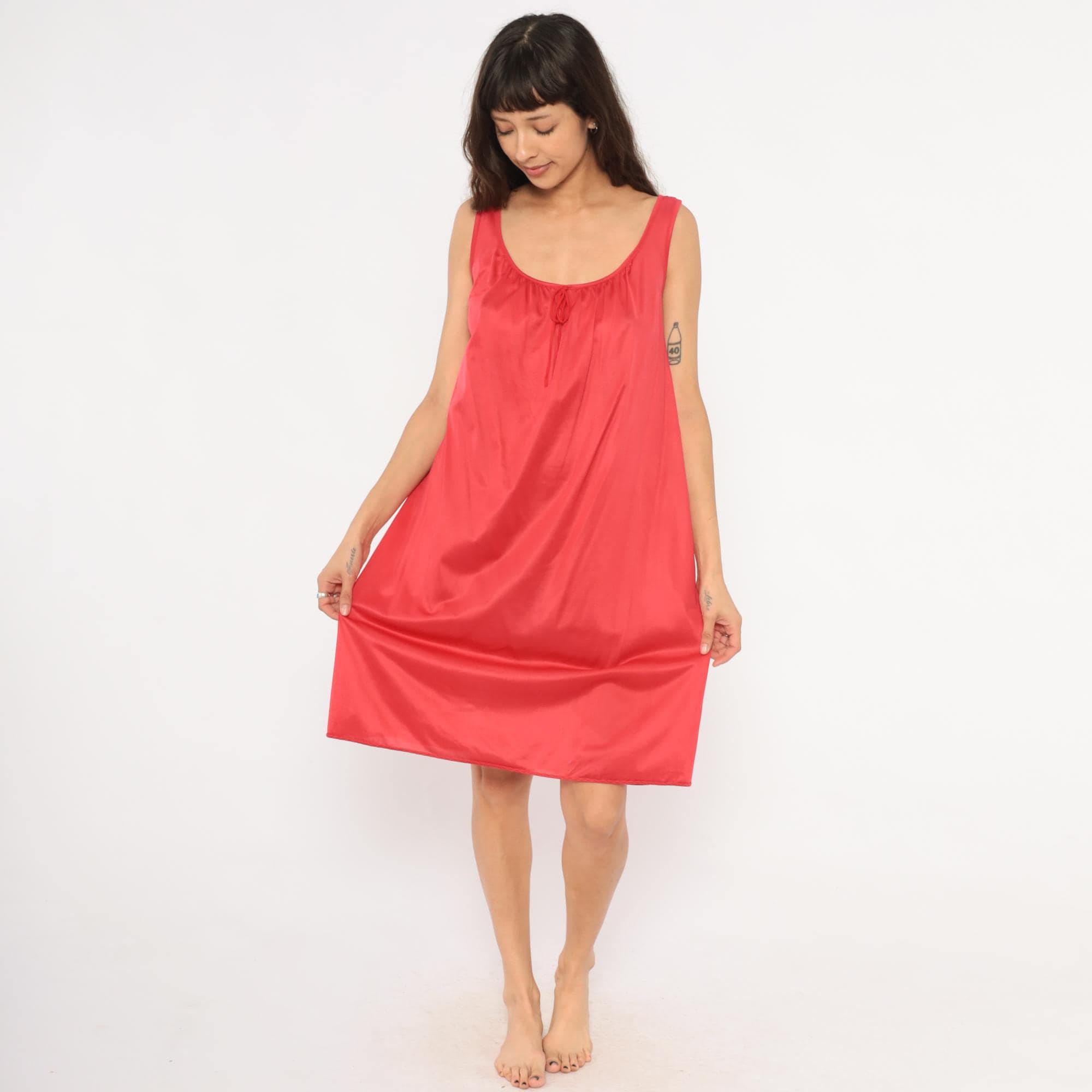80s red nightgown from Eve Moral with a deep scoop neckline on both front and back, gathered bust with a center tie detail. Wide tank-style shoulder straps and a loose, straight body falling to knee length. Satin-finish fabric in a rich cherry red tone throughout.