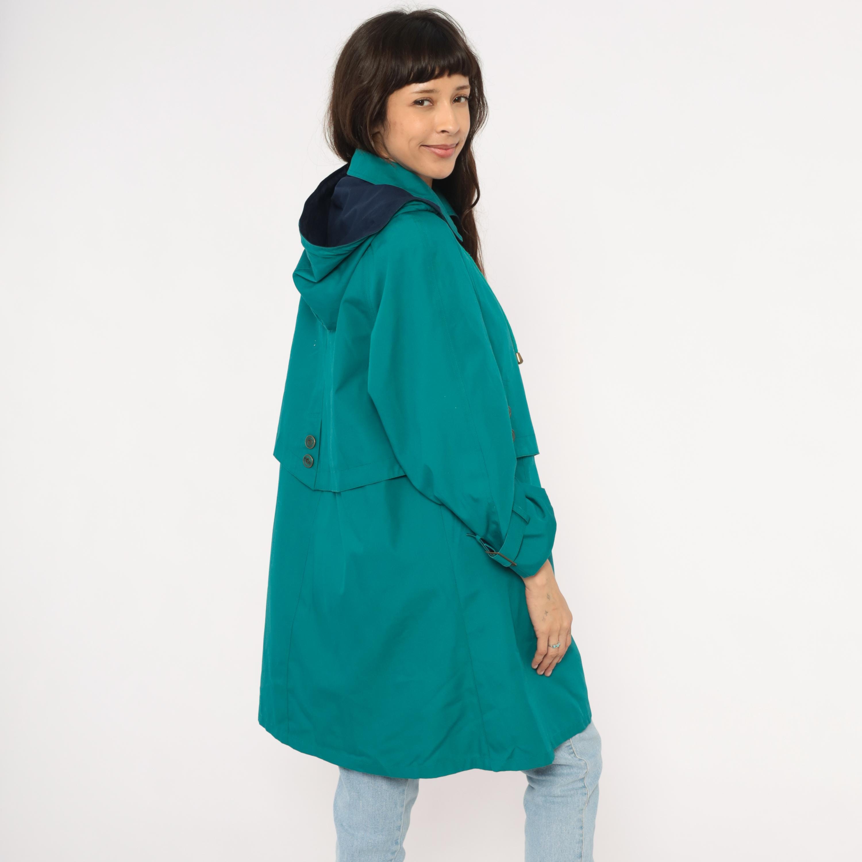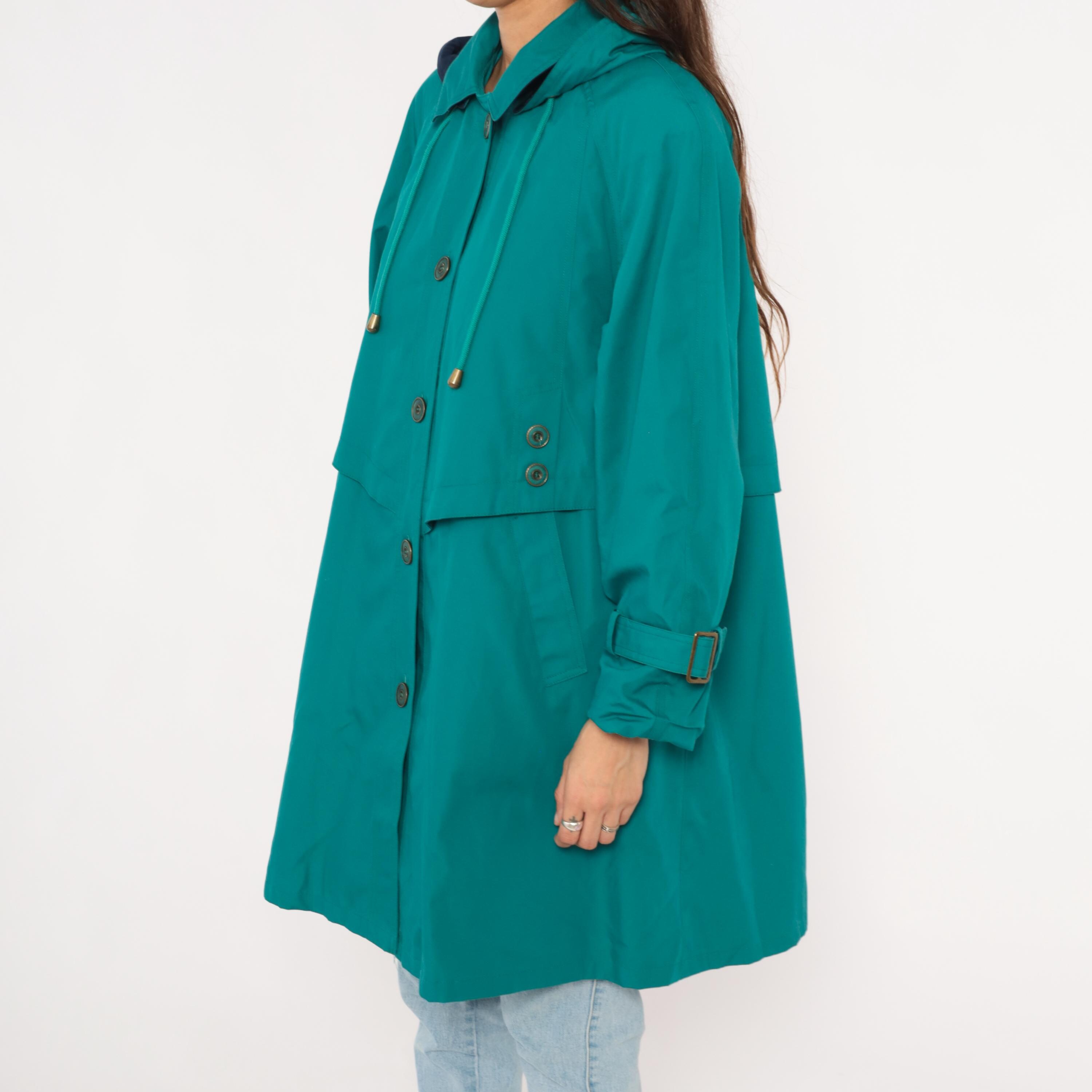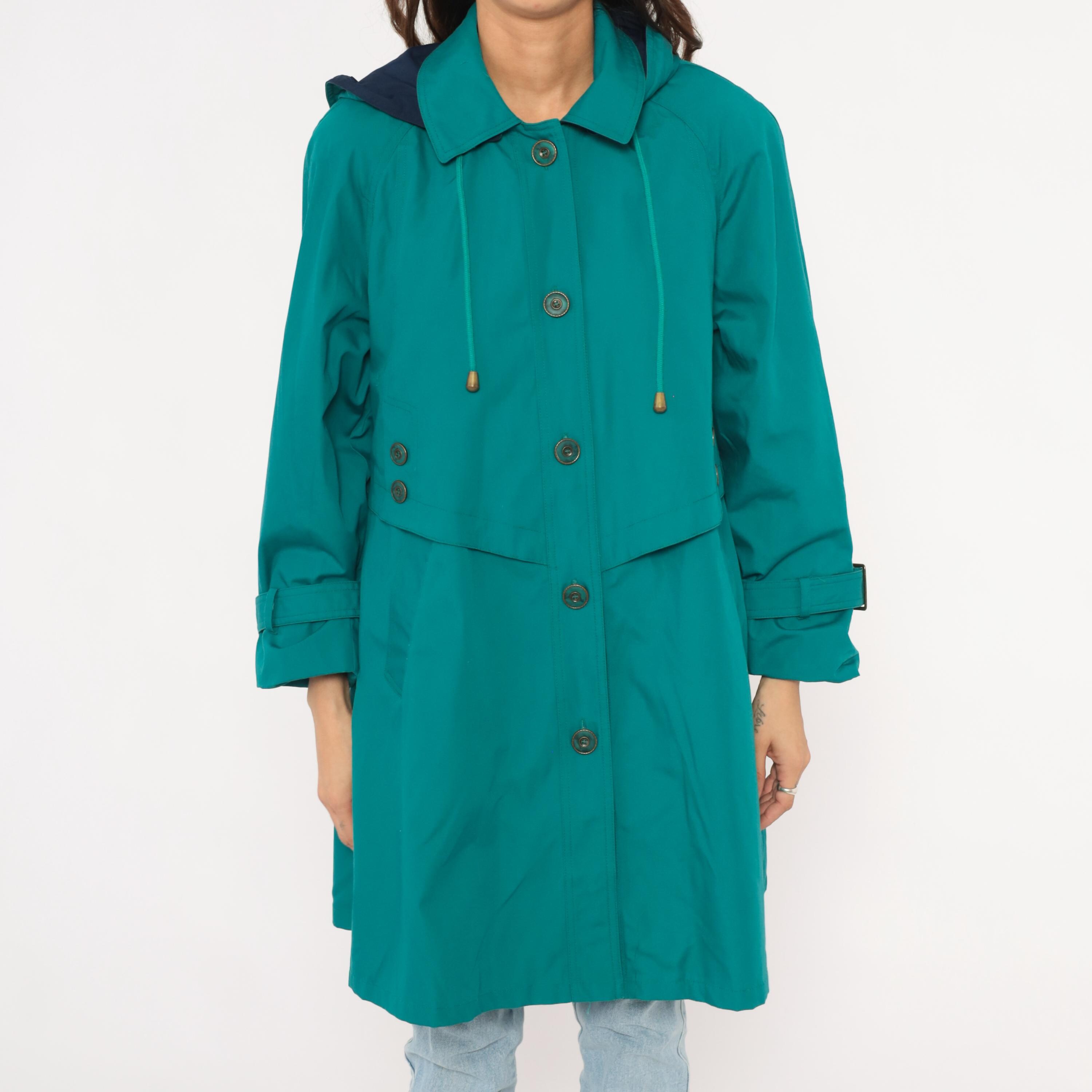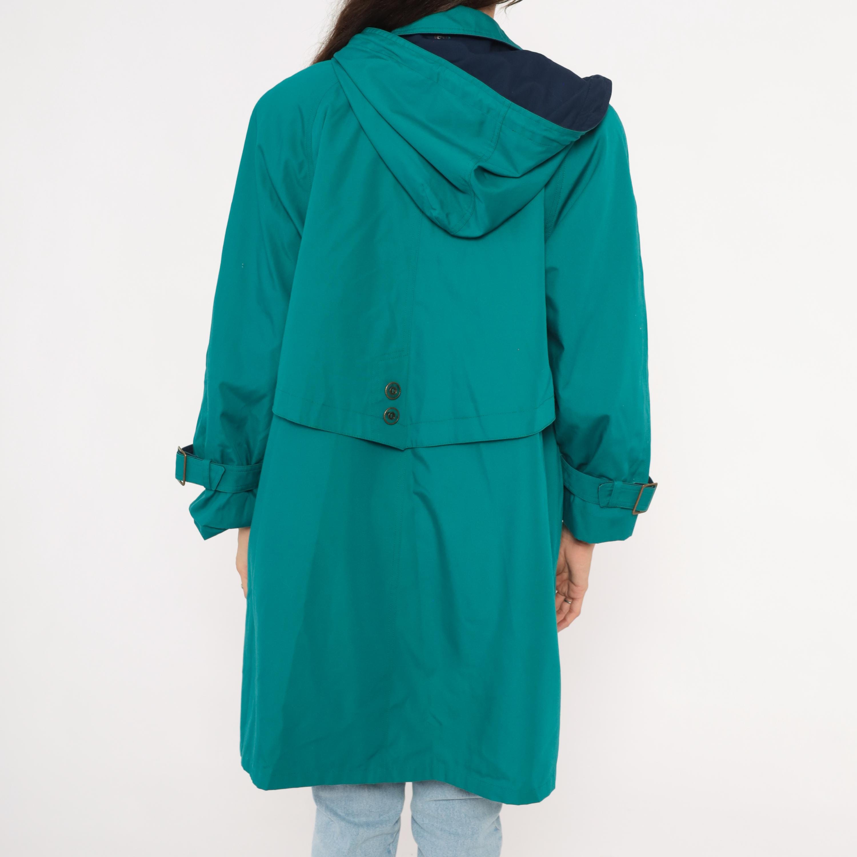 80s teal trench coat from Misty Harbor with a navy-lined attached hood and drawstring cord with toggle ends. Button front closure with a layered storm flap across the chest and back, spread collar, and buckle-strap cuff tabs. Side seam pockets and an A-line silhouette from the waist down, hitting at knee length.