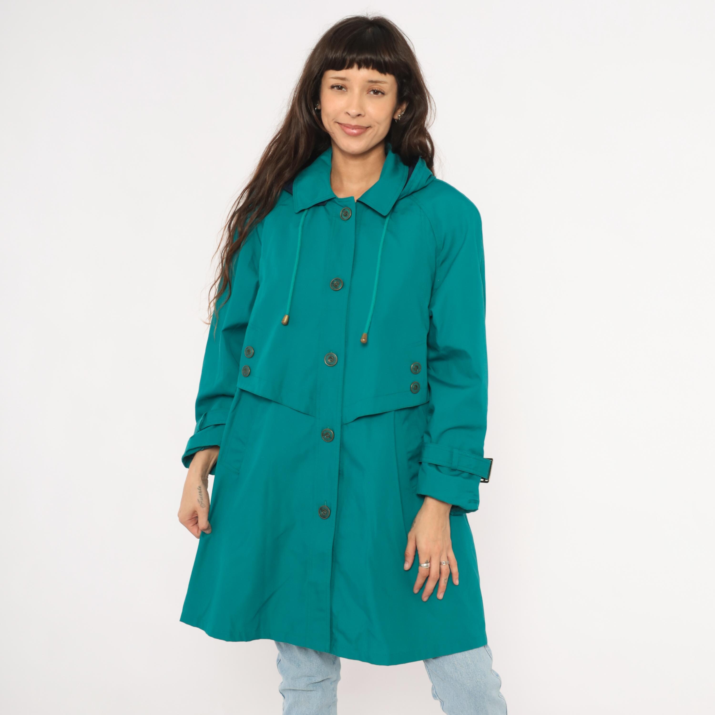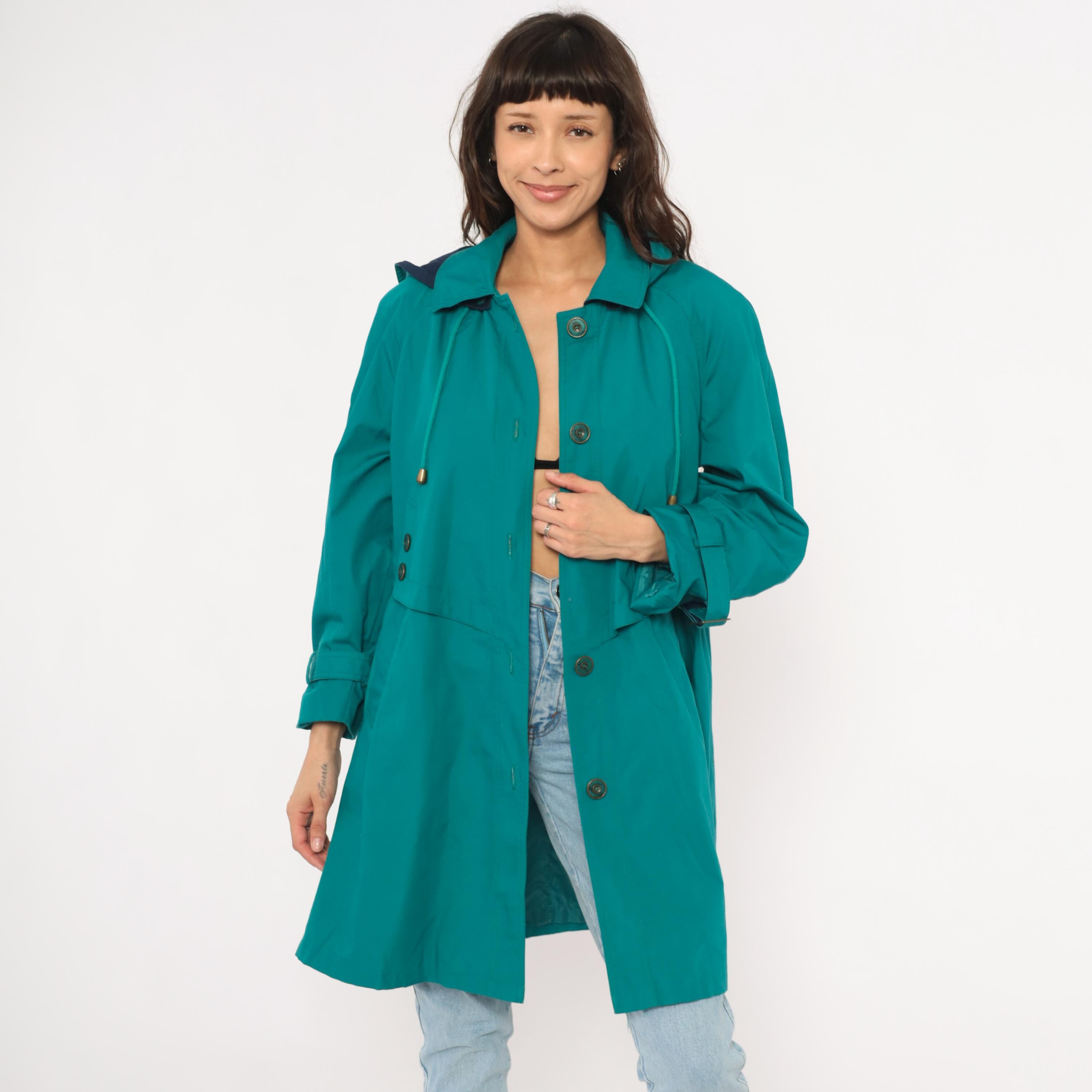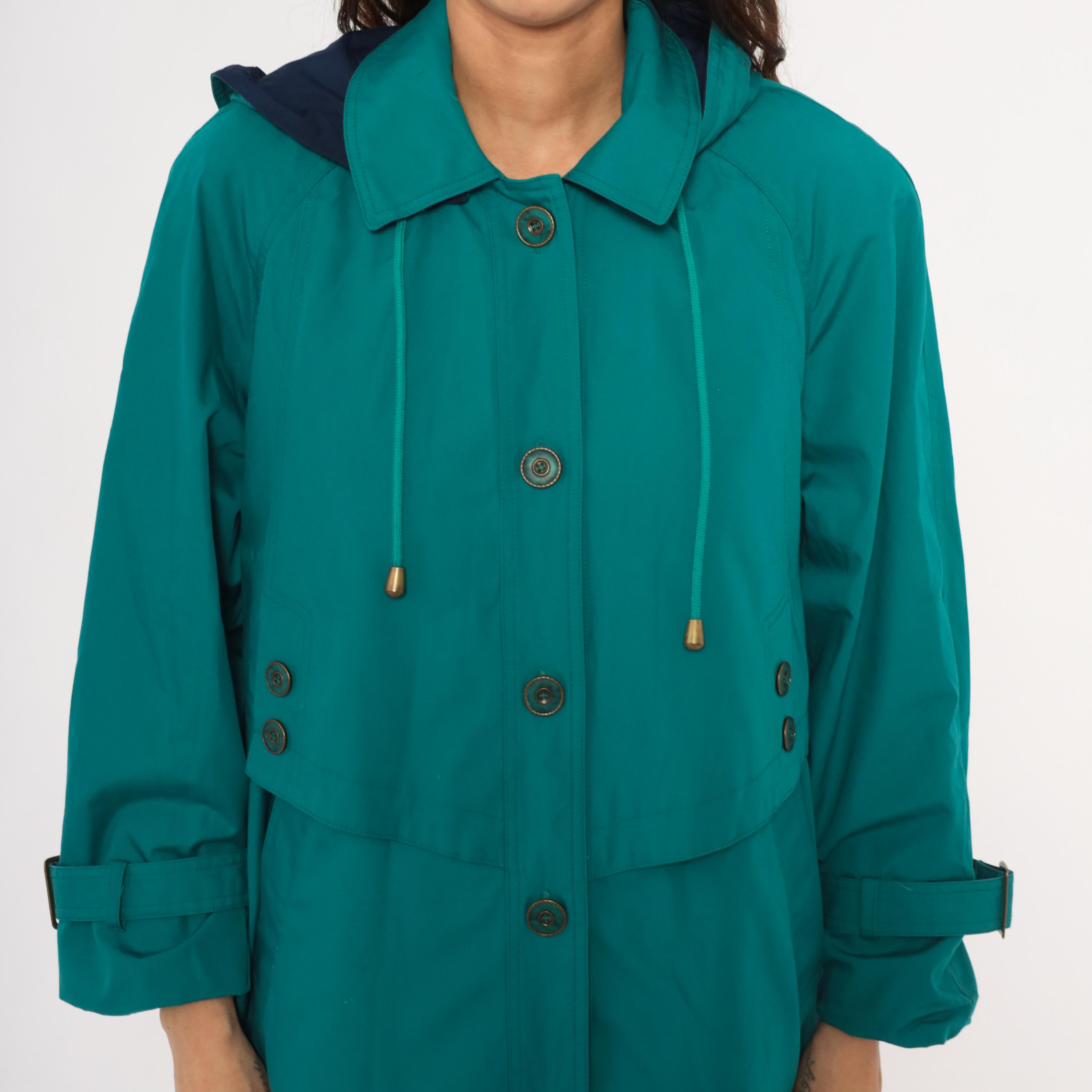 80s teal trench coat from Misty Harbor with a navy-lined attached hood and drawstring cord with toggle ends. Button front closure with a layered storm flap across the chest and back, spread collar, and buckle-strap cuff tabs. Side seam pockets and an A-line silhouette from the waist down, hitting at knee length.
