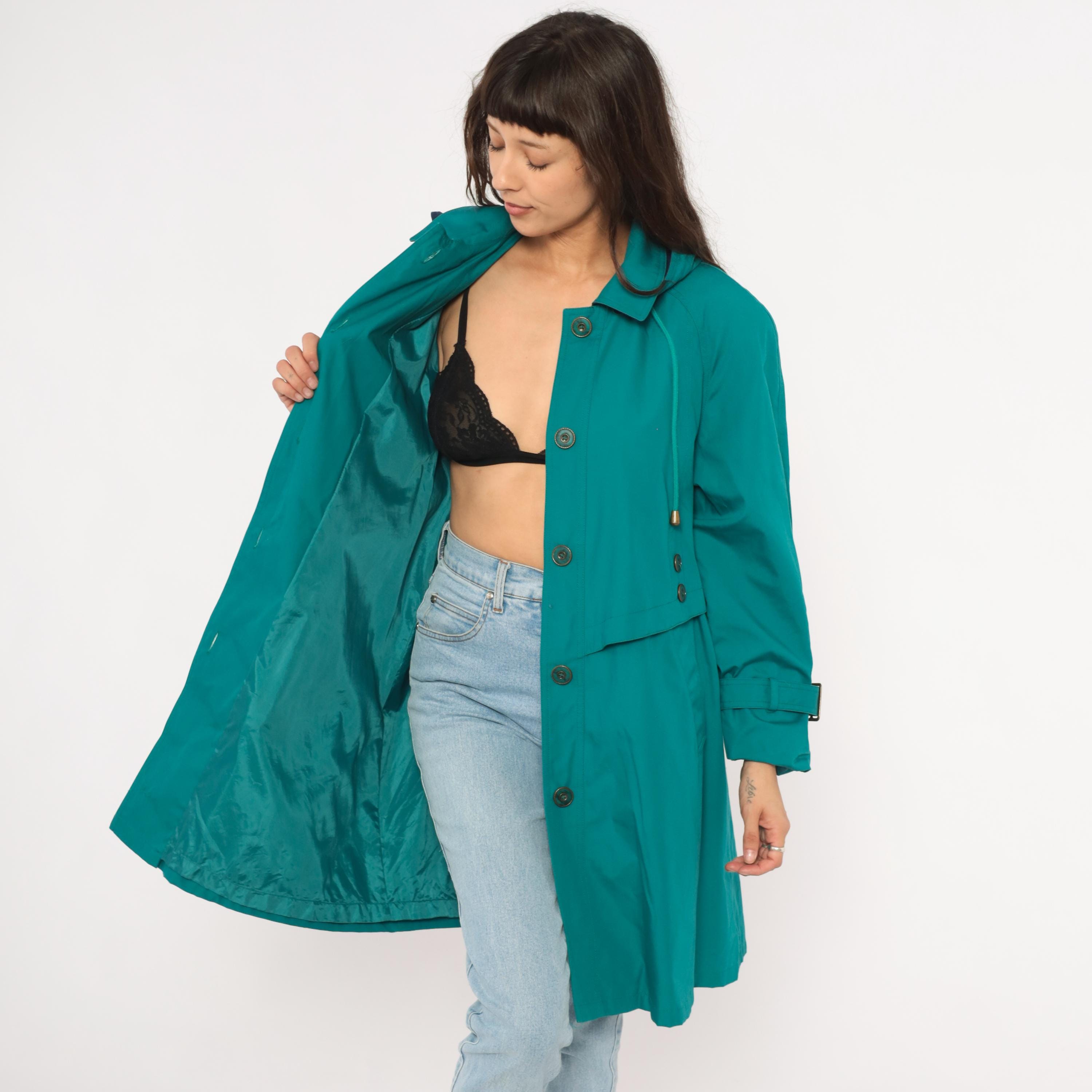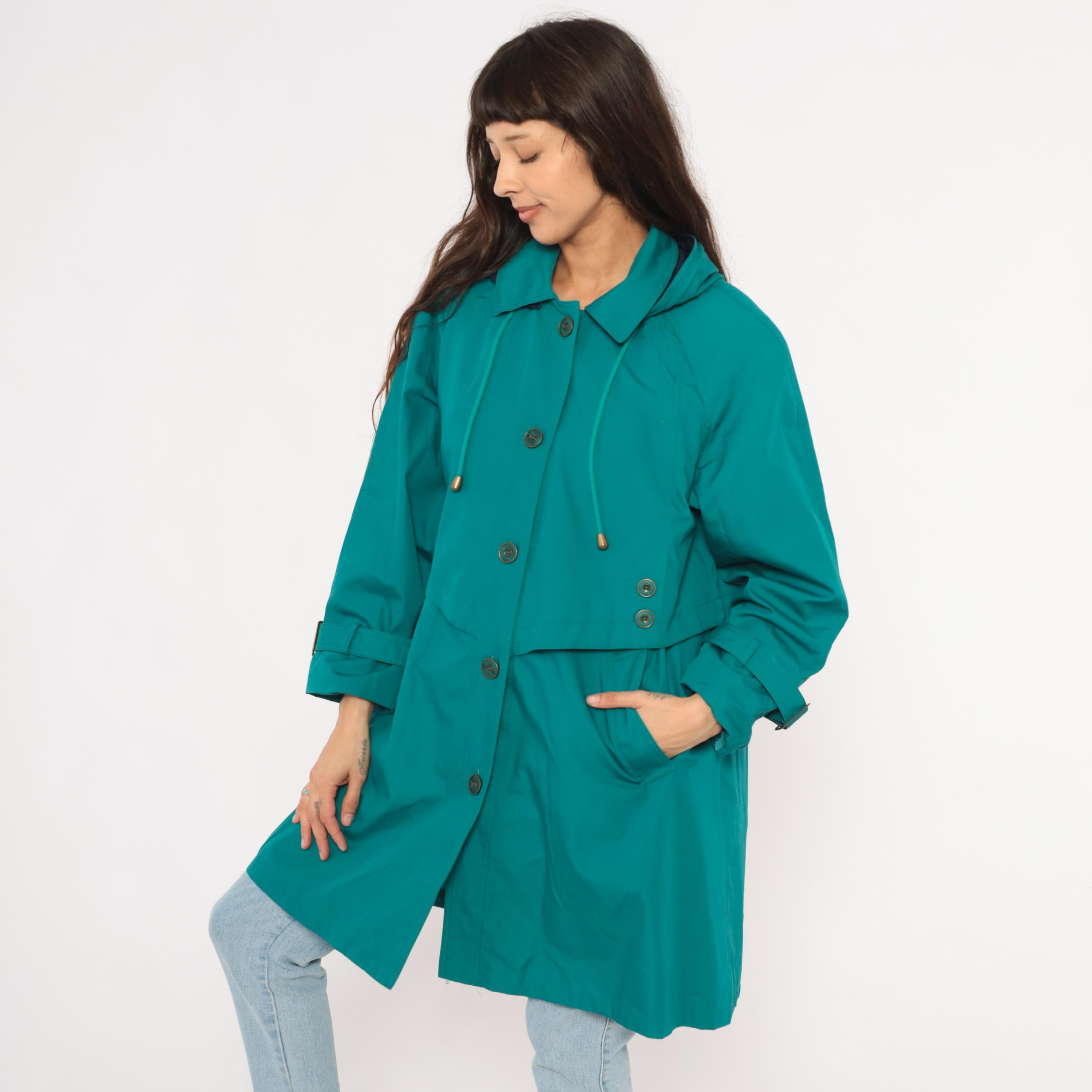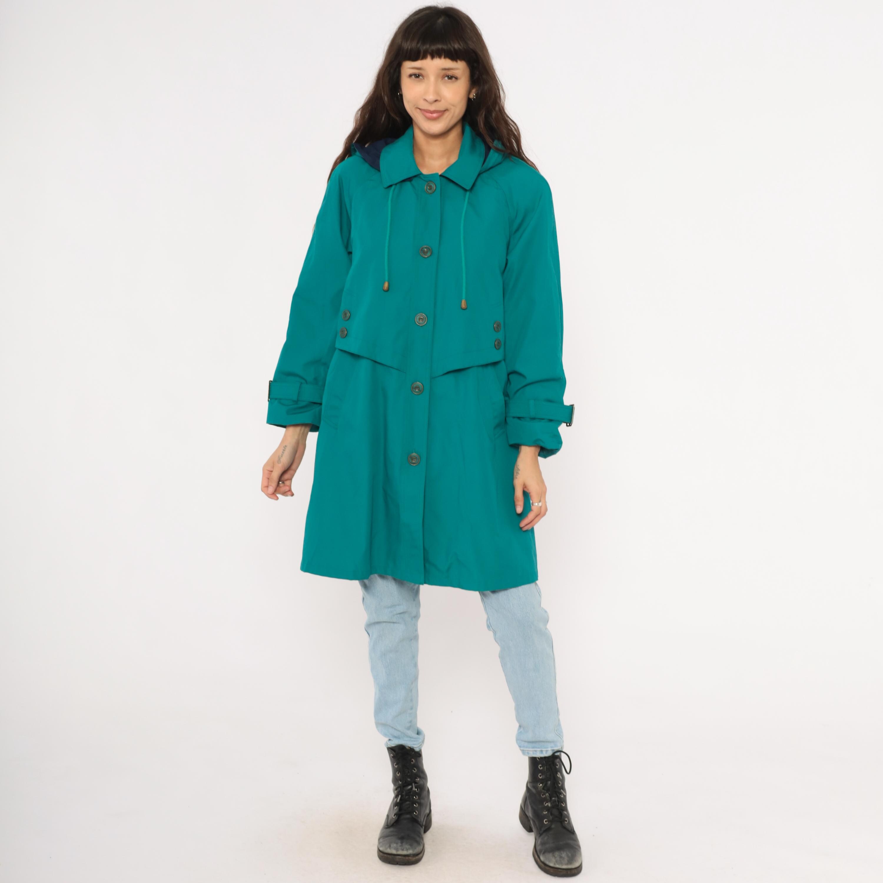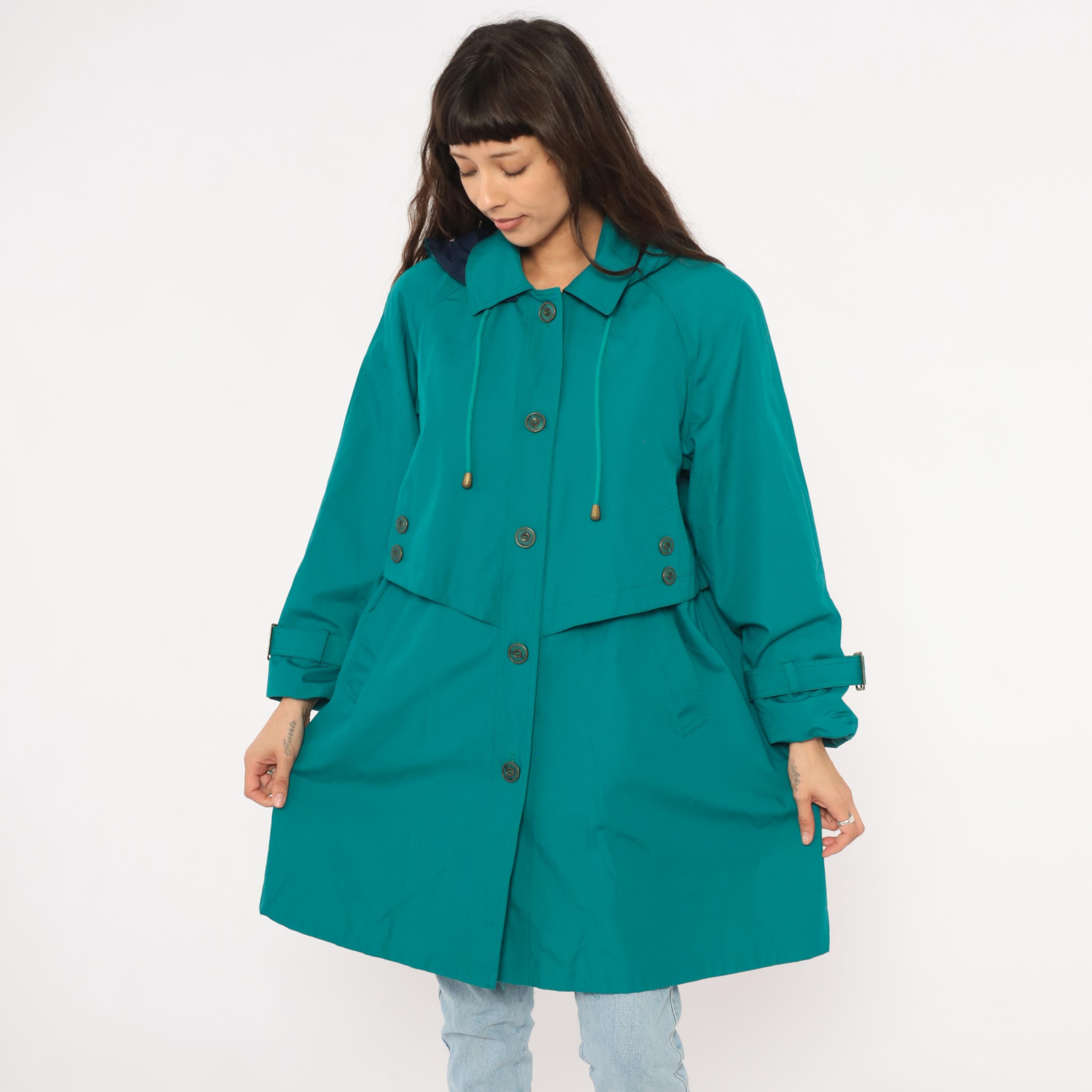80s teal trench coat from Misty Harbor with a navy-lined attached hood and drawstring cord with toggle ends. Button front closure with a layered storm flap across the chest and back, spread collar, and buckle-strap cuff tabs. Side seam pockets and an A-line silhouette from the waist down, hitting at knee length.