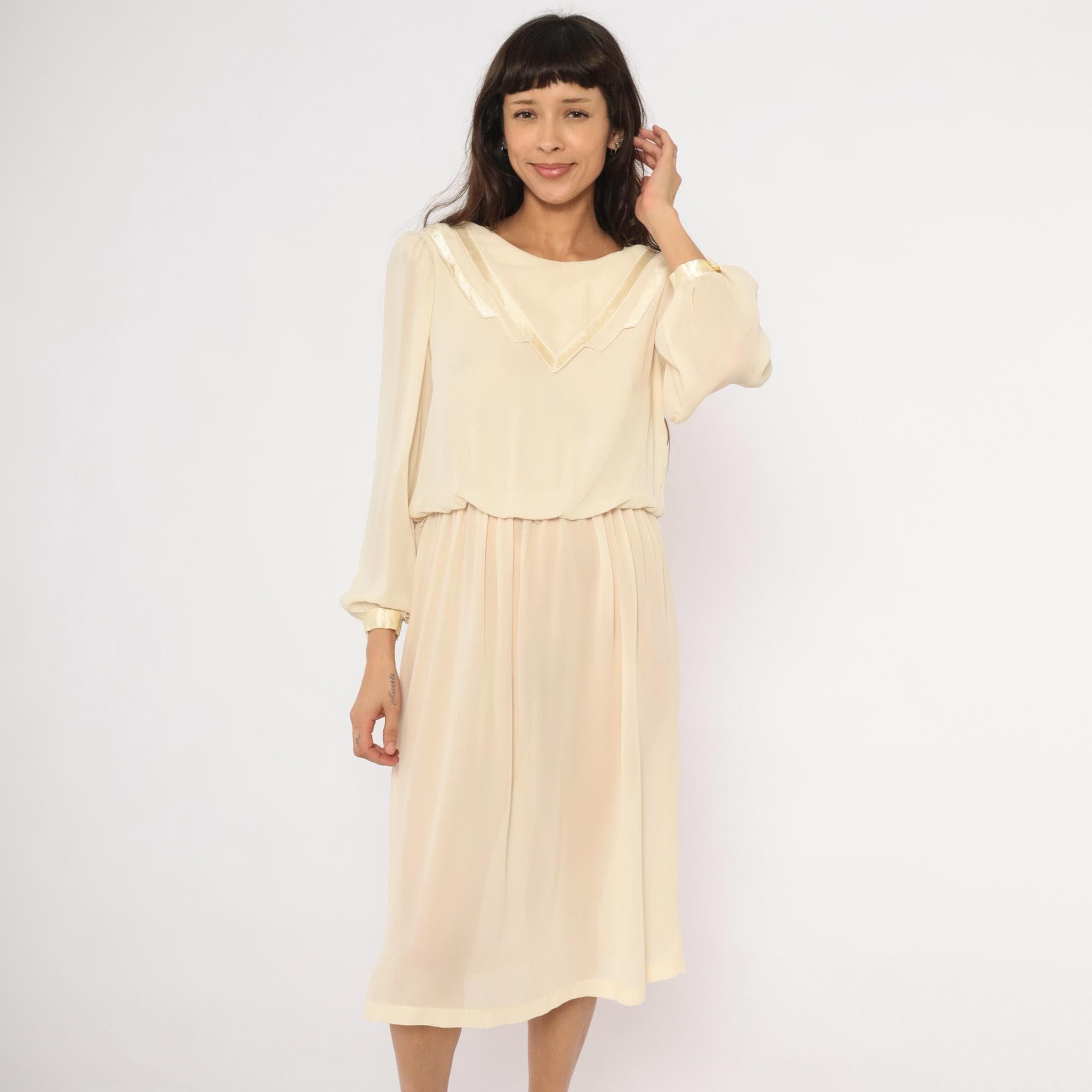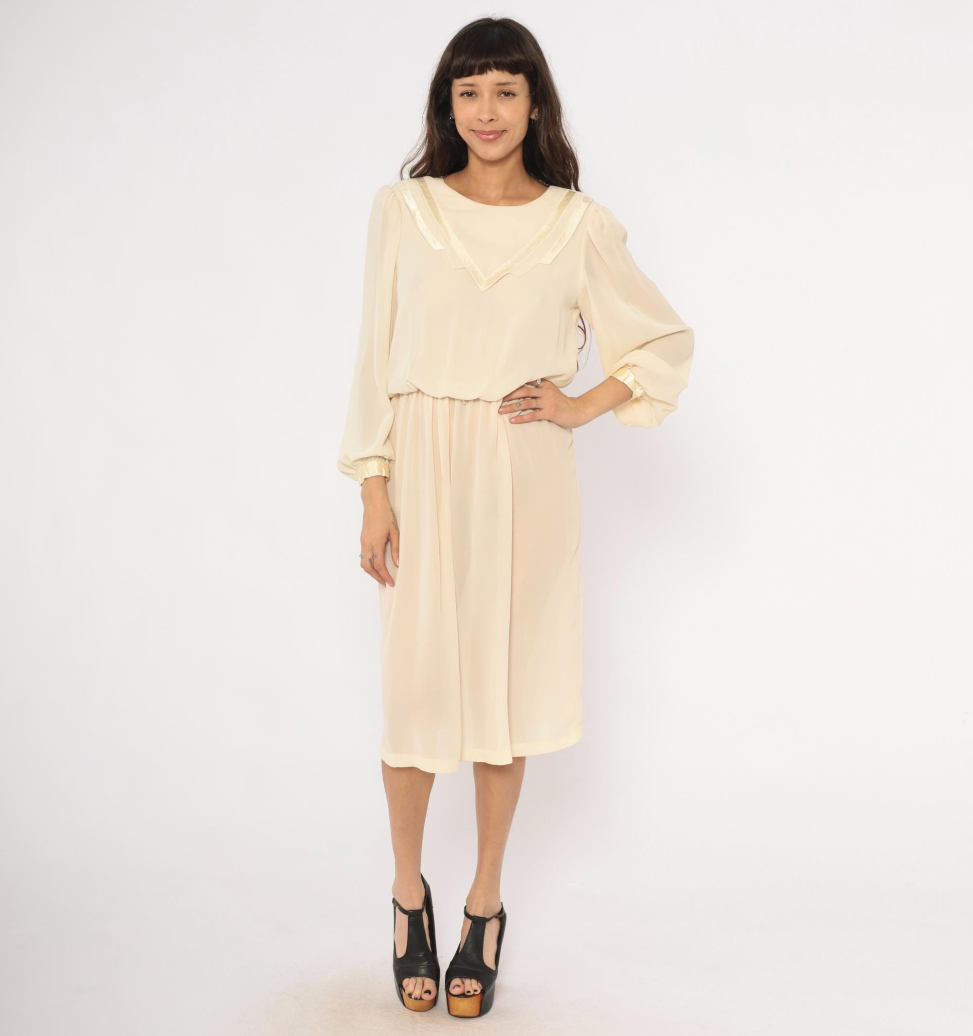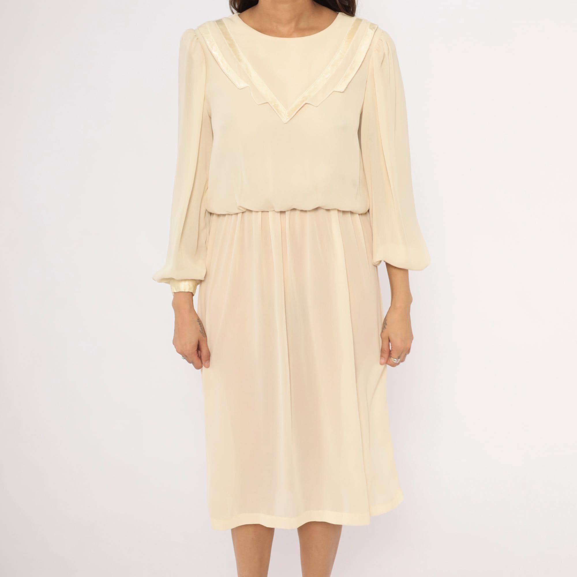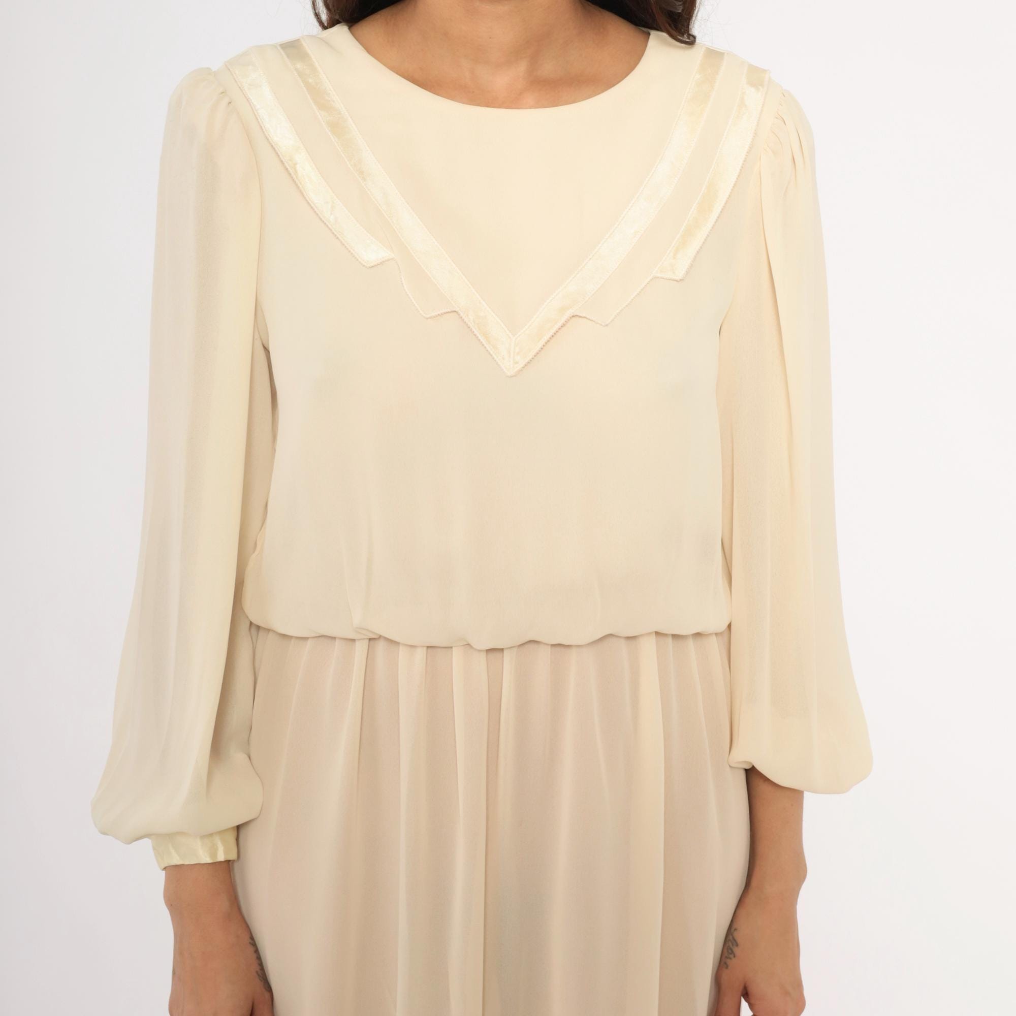 80s cream chiffon dress from Street Scene with a round neckline and double satin V-shaped trim across the chest. Blouson bodice with an elasticized waist and gathered skirt falling to knee length. Bishop sleeves with satin cuffs and a single button closure at the back neckline. Semi-sheer fabric throughout with a soft ivory and blush tone.