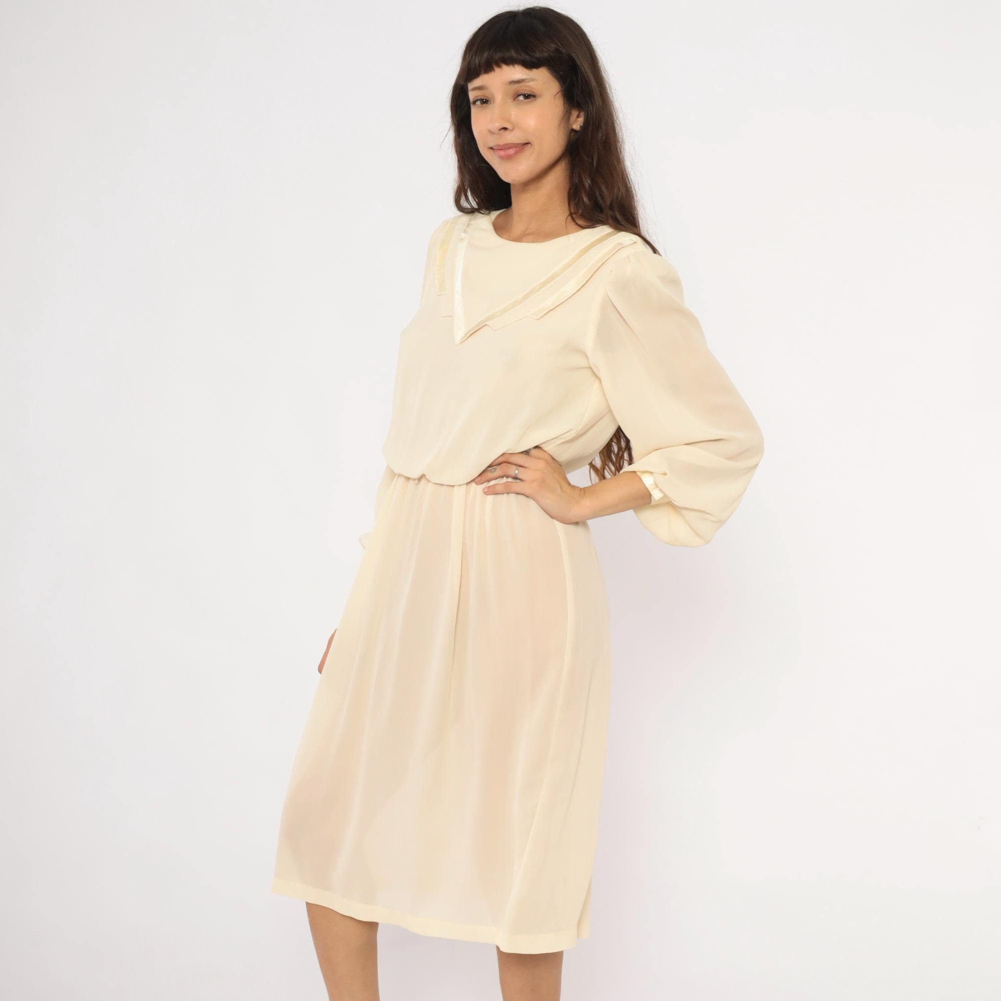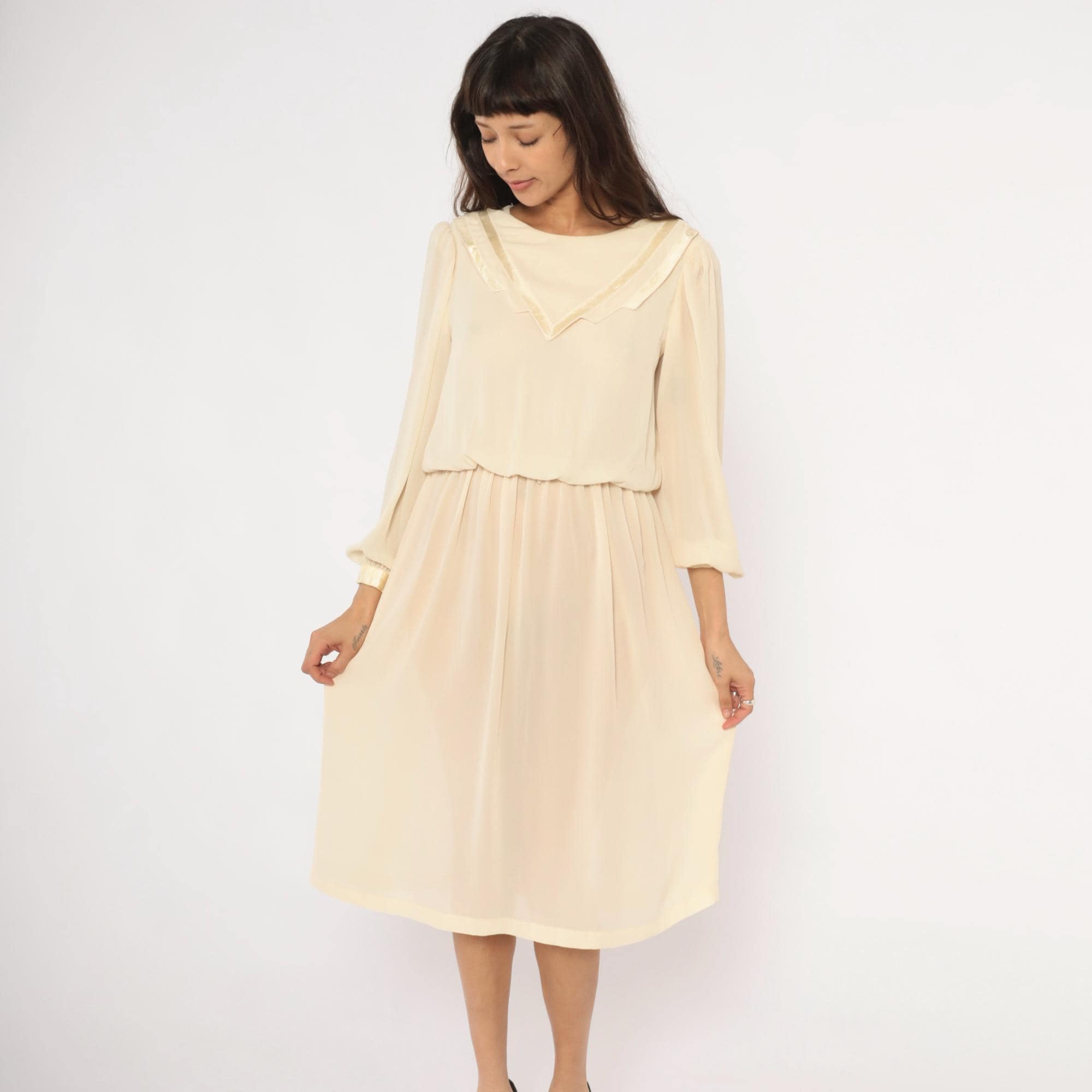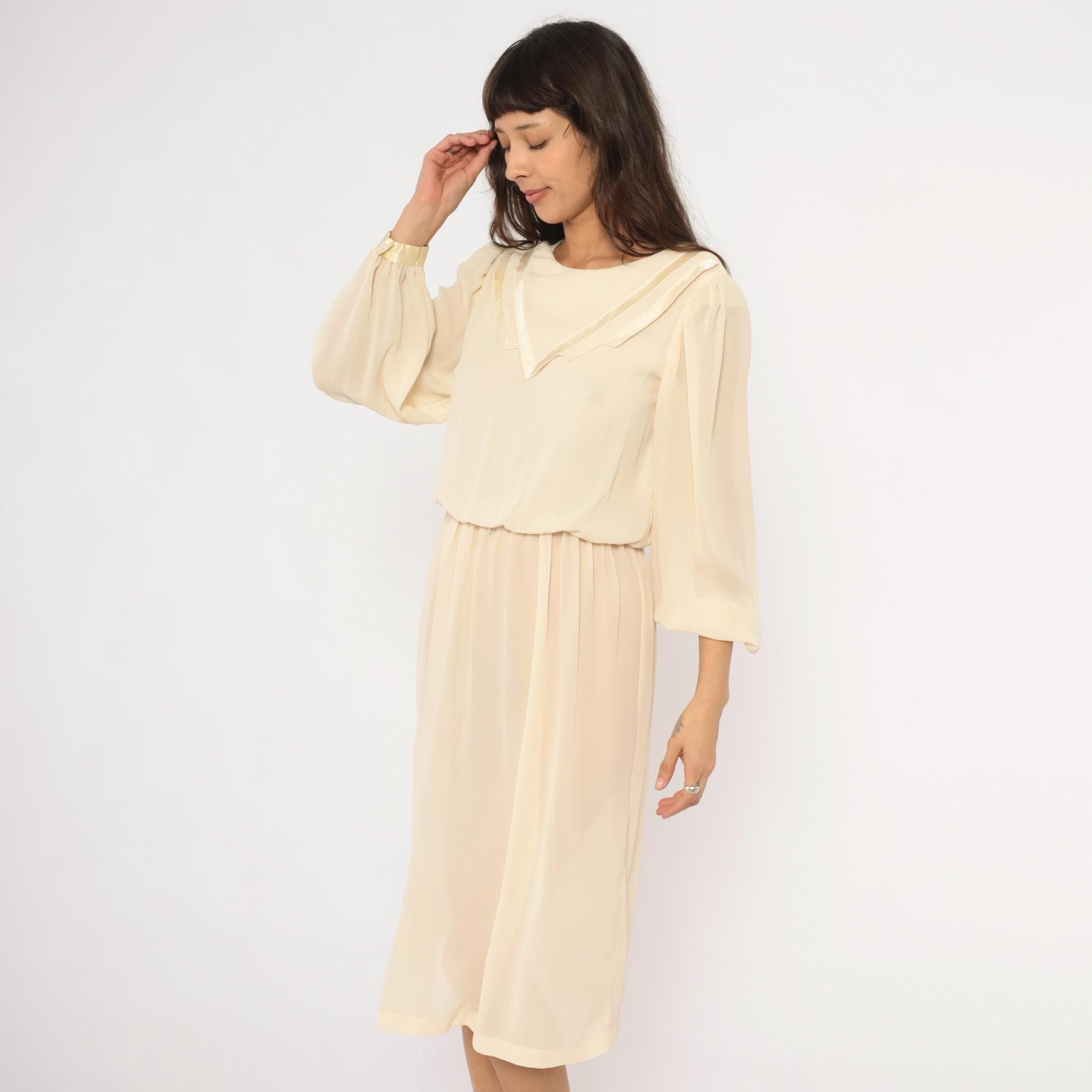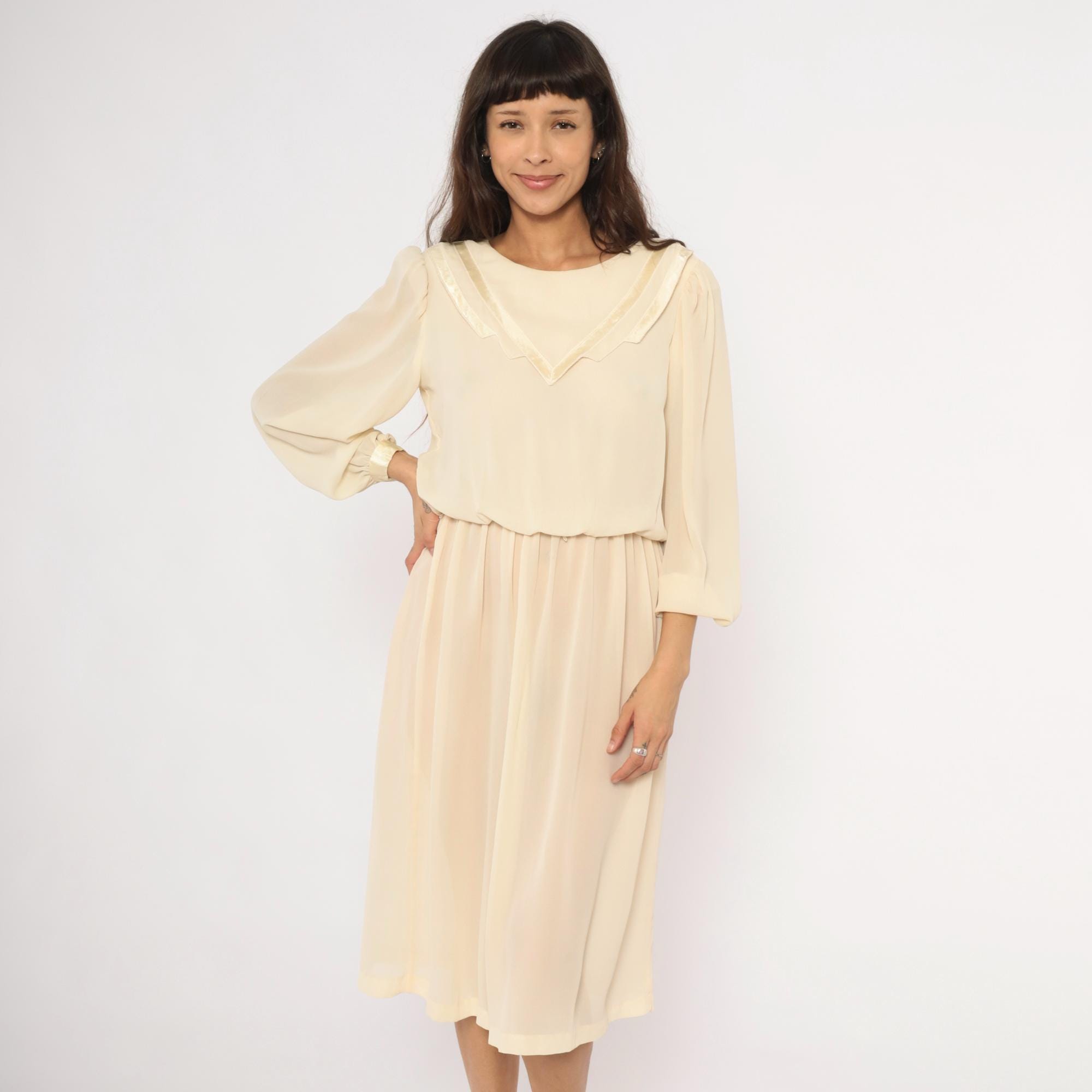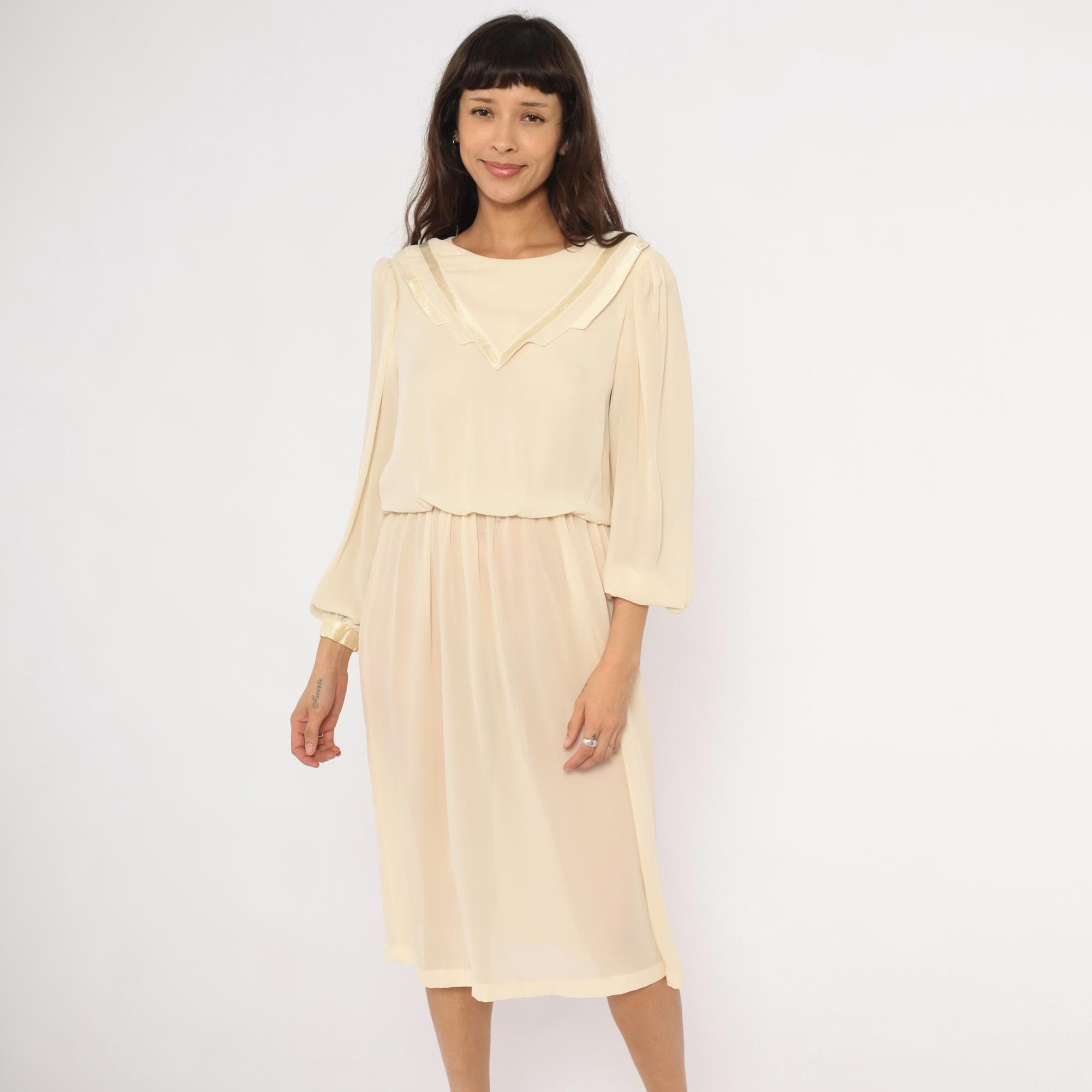 80s cream chiffon dress from Street Scene with a round neckline and double satin V-shaped trim across the chest. Blouson bodice with an elasticized waist and gathered skirt falling to knee length. Bishop sleeves with satin cuffs and a single button closure at the back neckline. Semi-sheer fabric throughout with a soft ivory and blush tone.