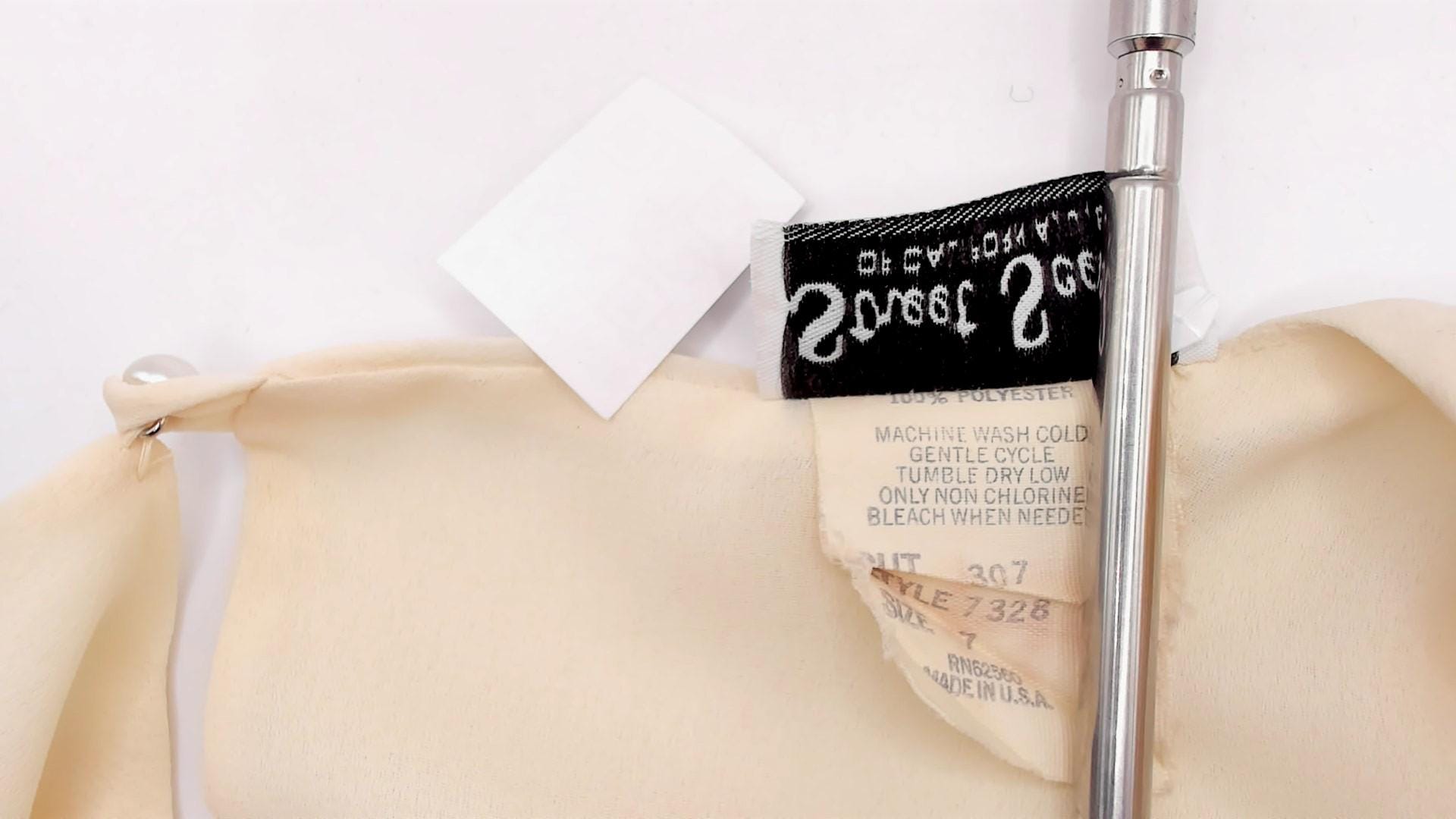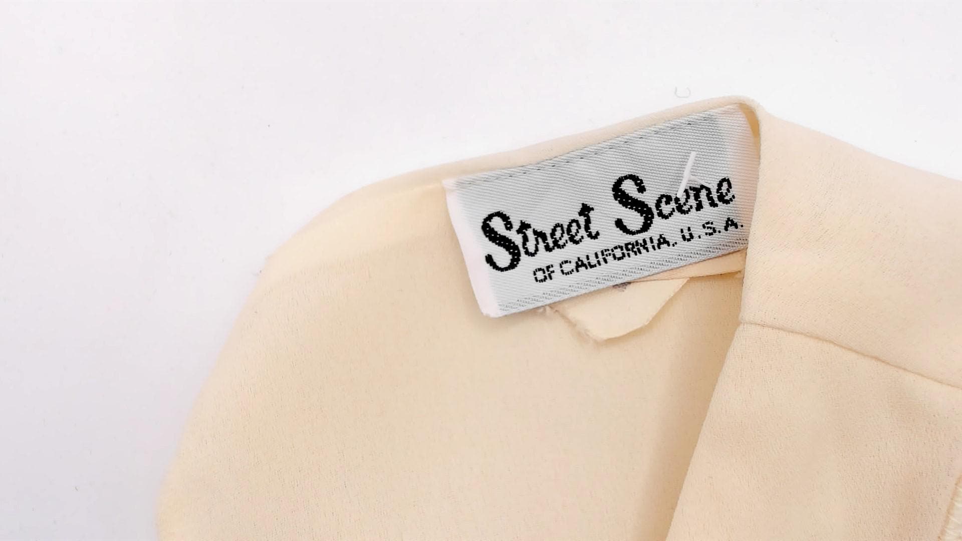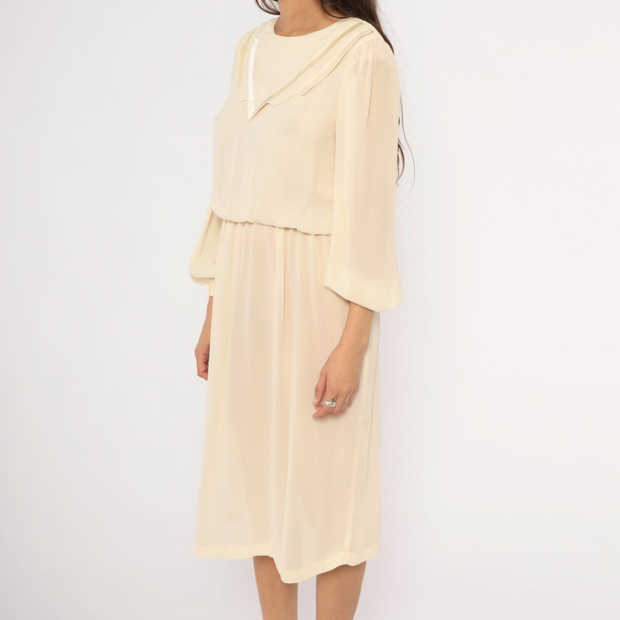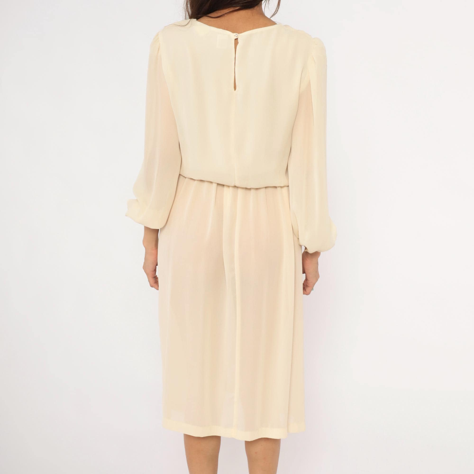80s cream chiffon dress from Street Scene with a round neckline and double satin V-shaped trim across the chest. Blouson bodice with an elasticized waist and gathered skirt falling to knee length. Bishop sleeves with satin cuffs and a single button closure at the back neckline. Semi-sheer fabric throughout with a soft ivory and blush tone.
