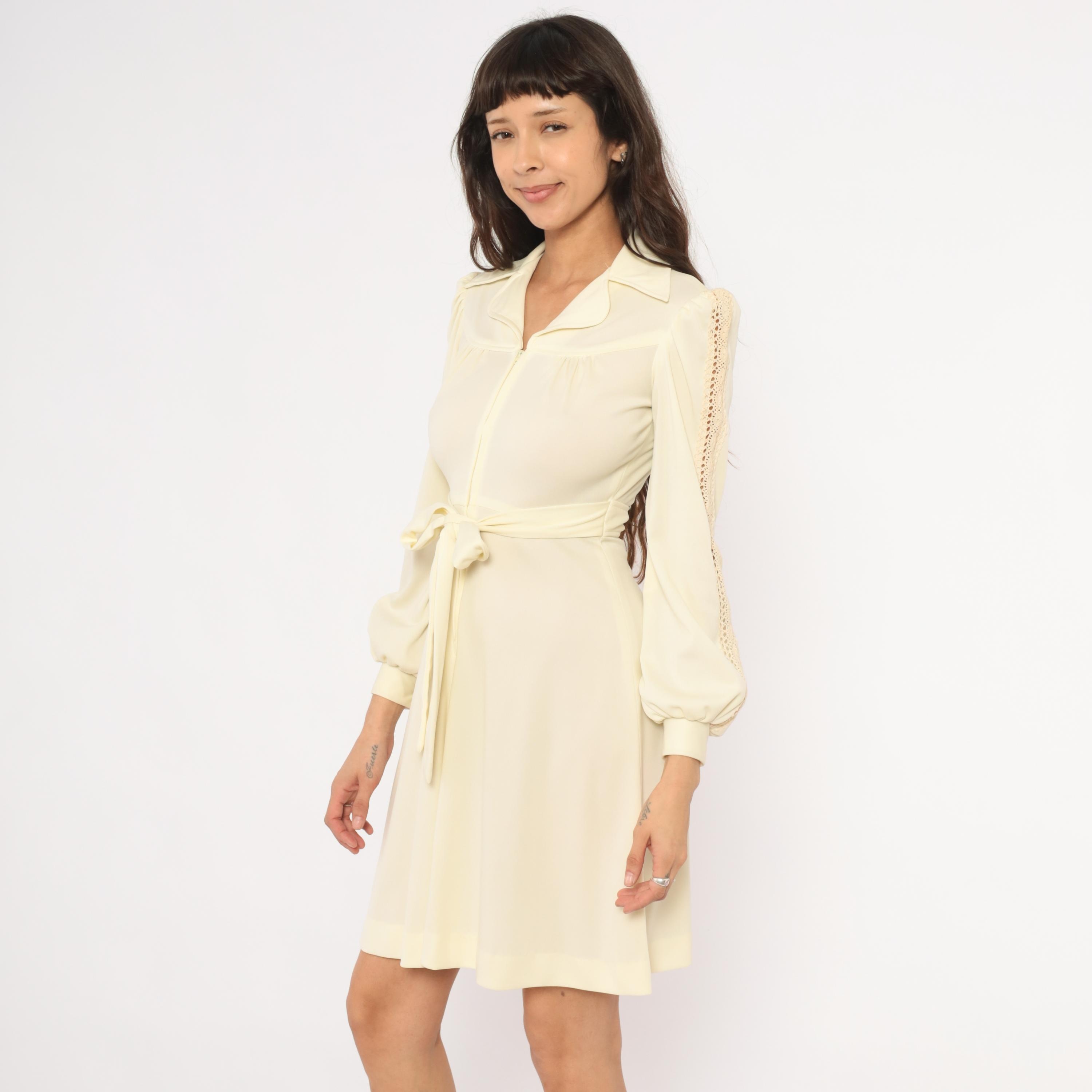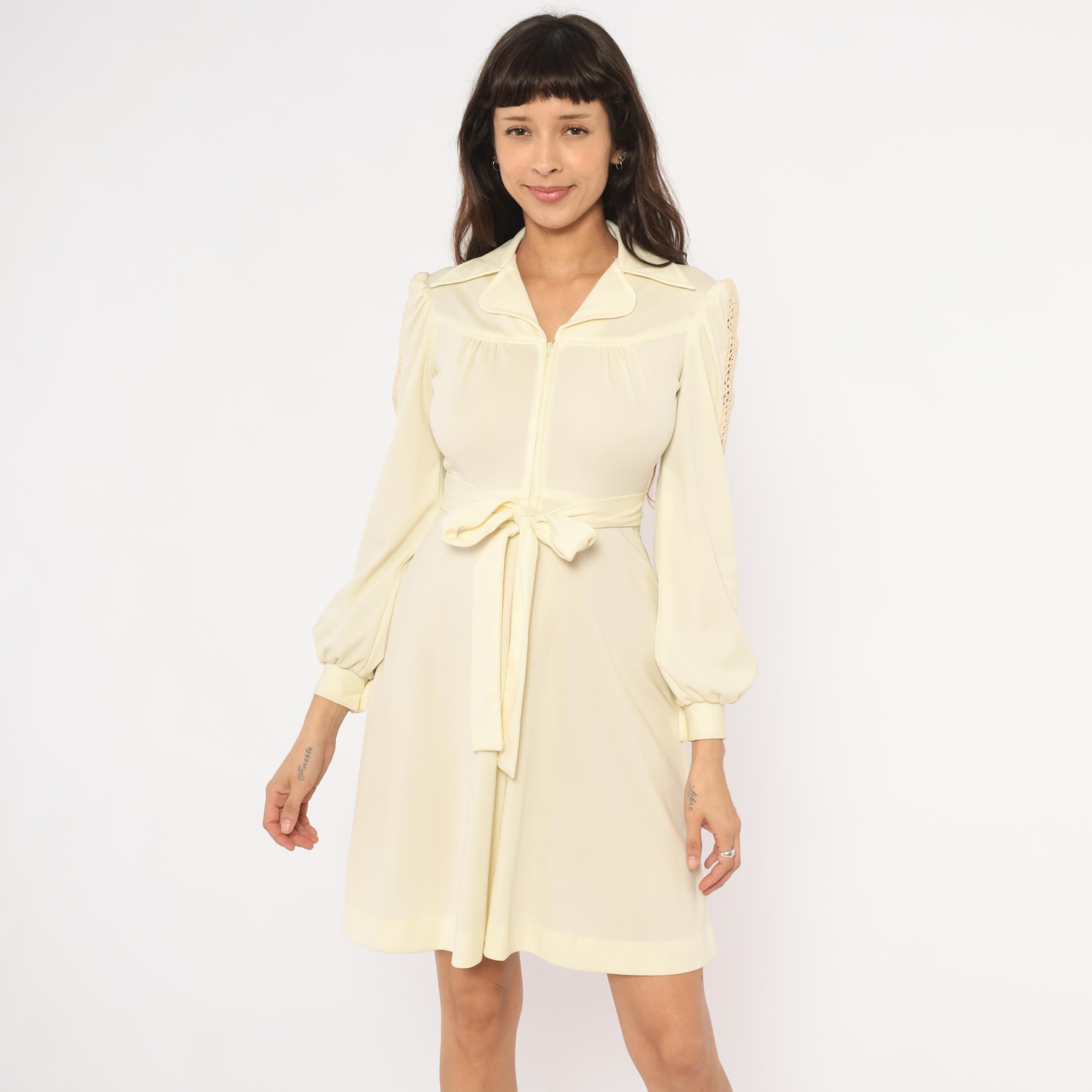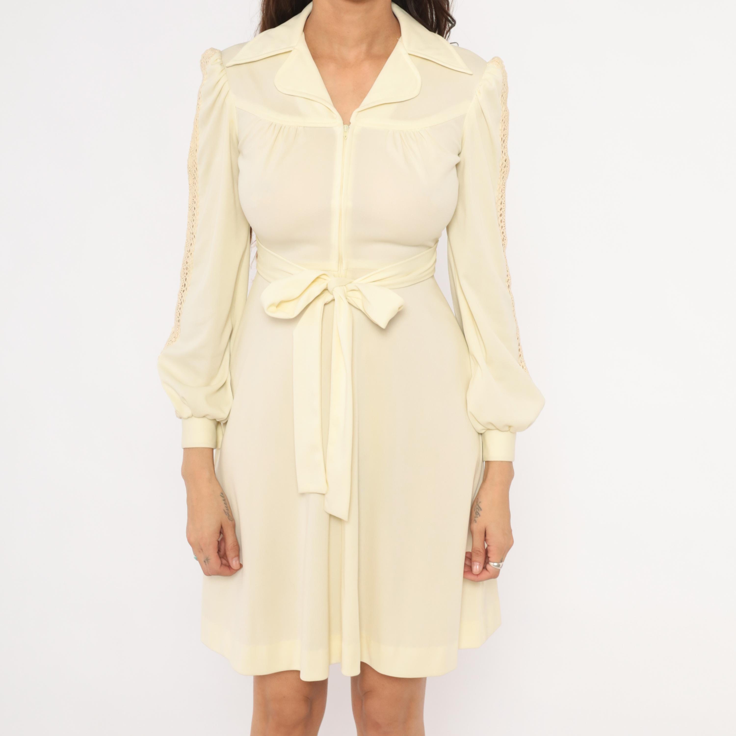 70s cream zip-front dress with a wide pointed collar, gathered bust, and a self-tie sash belt at the waist. Long bishop sleeves with open crochet lace insets running from shoulder to cuff, elasticized balloon volume, and buttoned cuffs. A-line skirt from the waist, knee-length hem, and slightly sheer upper bodice with an opaque body.