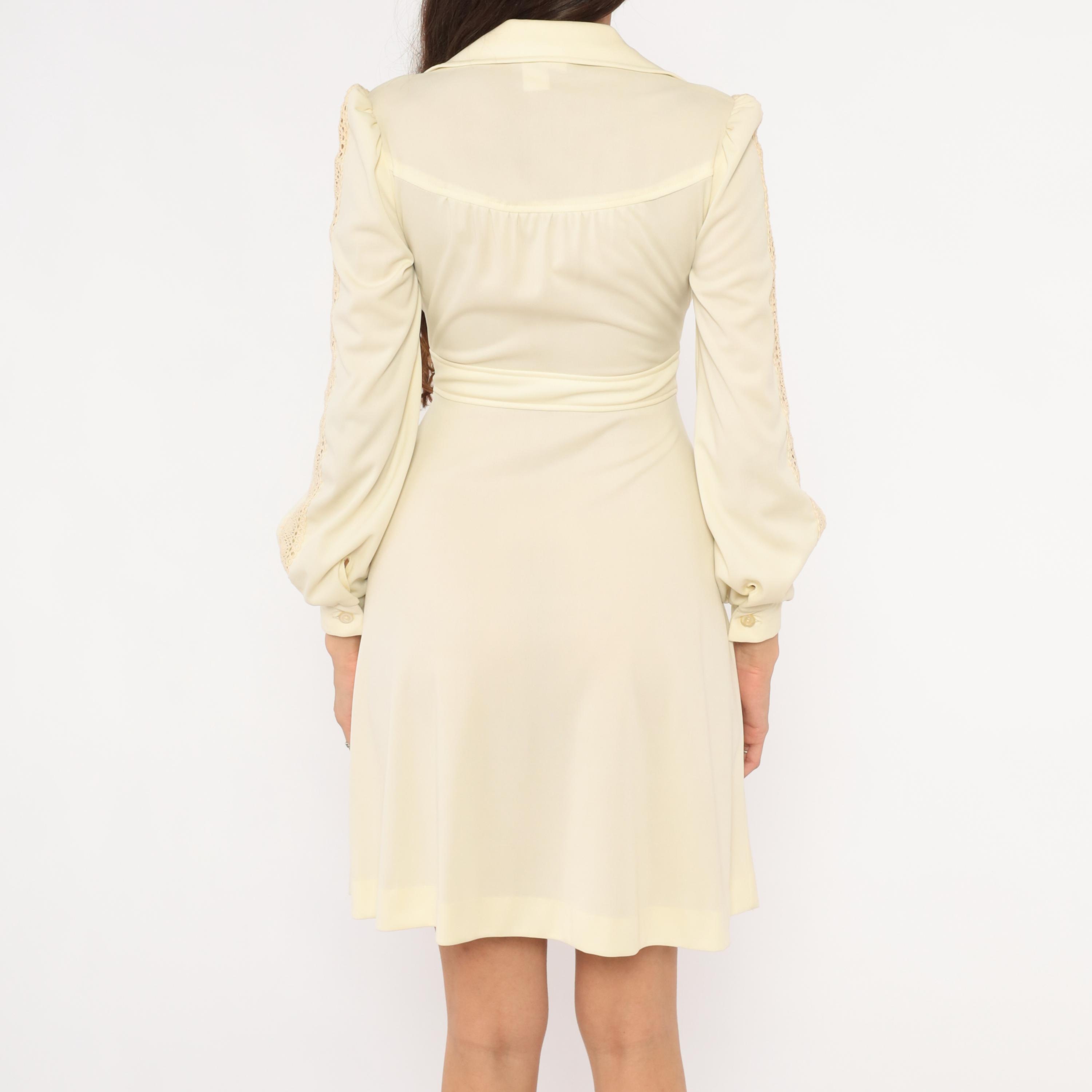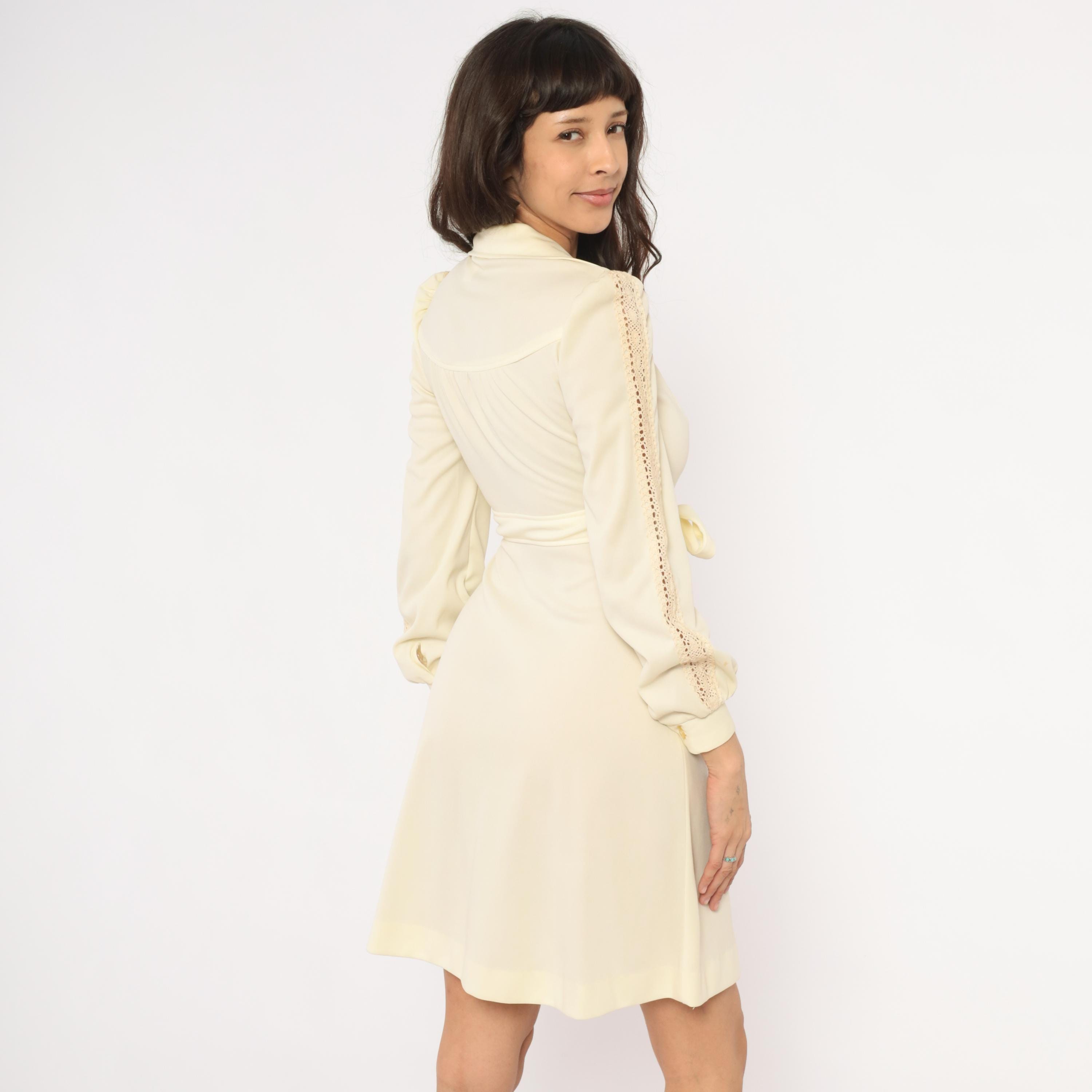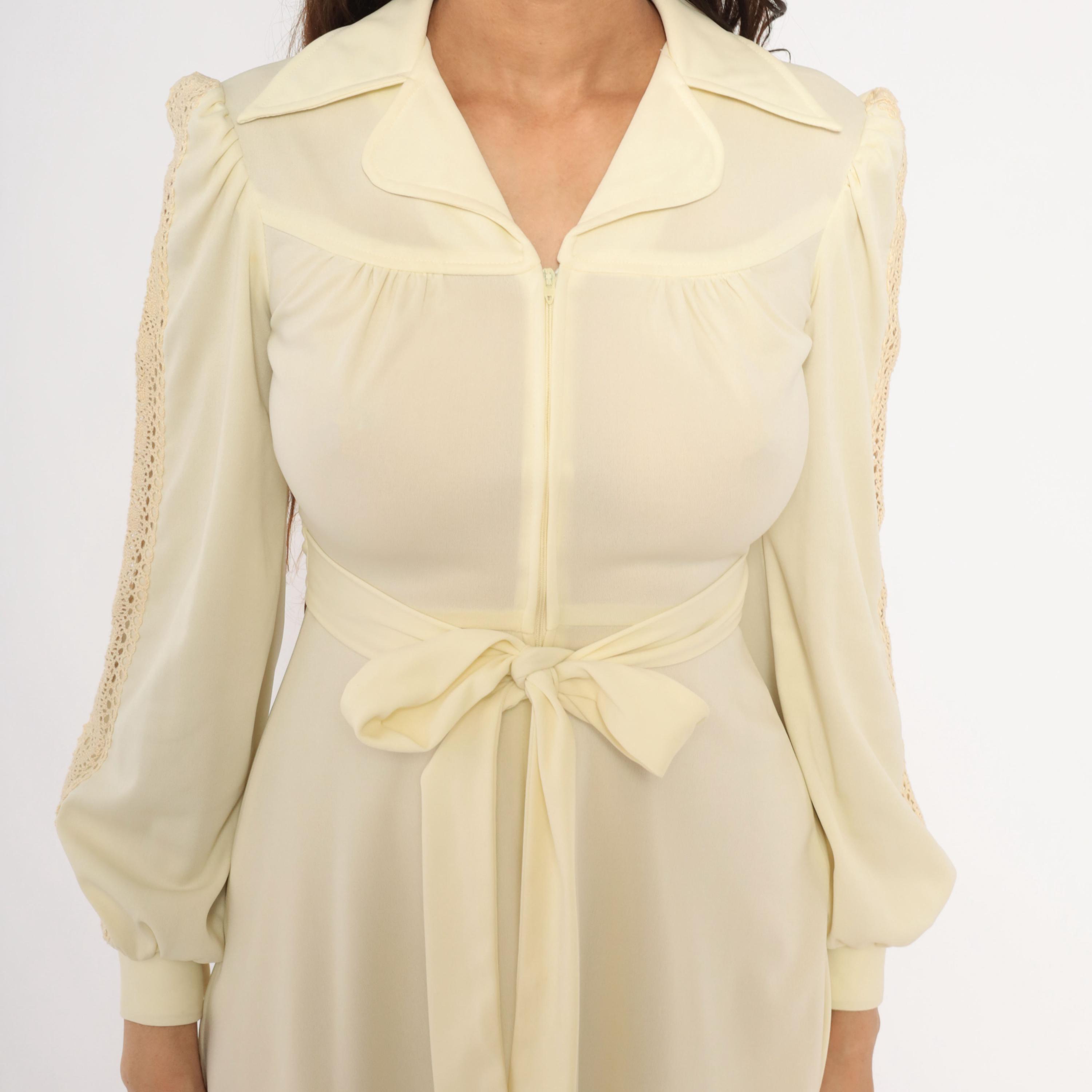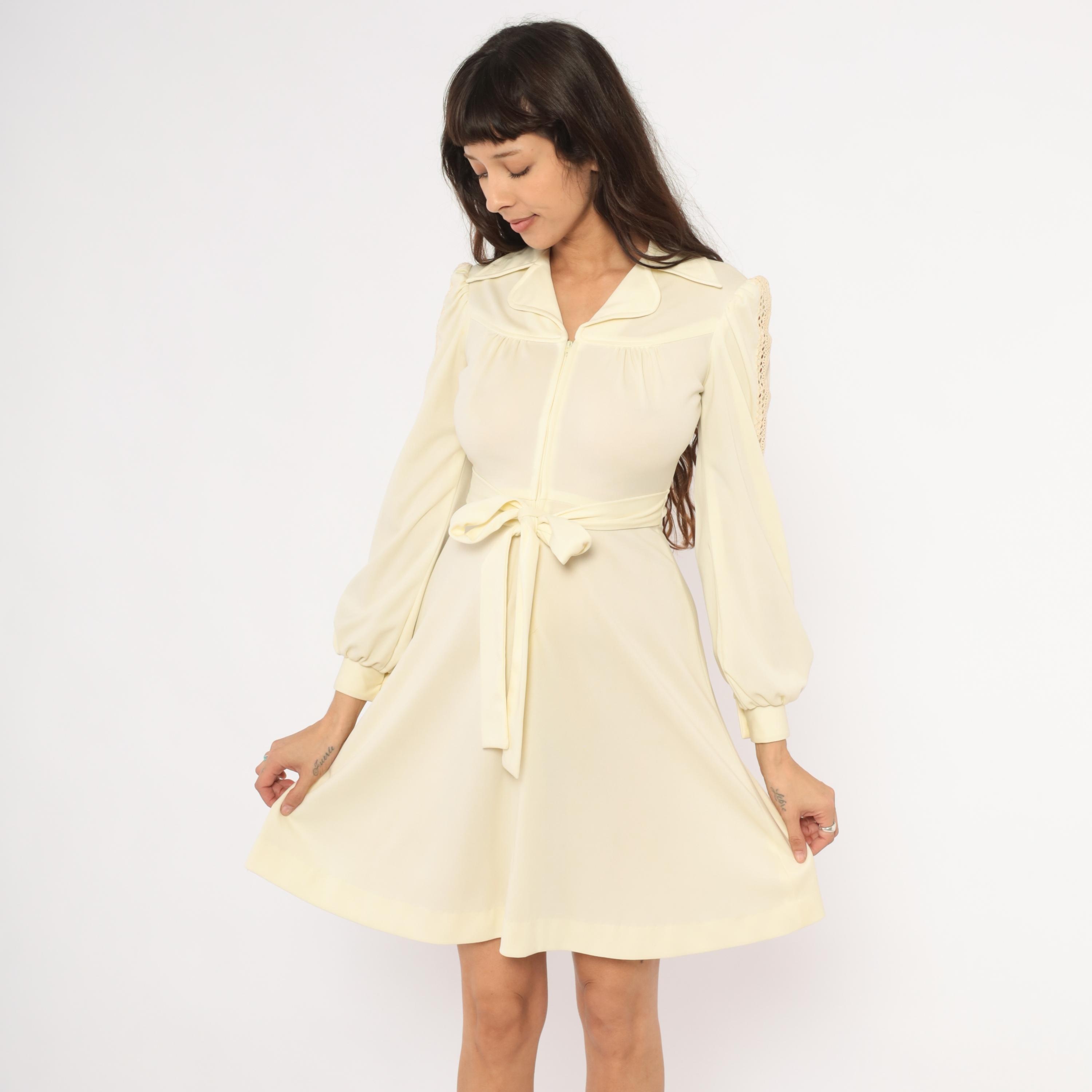 70s cream zip-front dress with a wide pointed collar, gathered bust, and a self-tie sash belt at the waist. Long bishop sleeves with open crochet lace insets running from shoulder to cuff, elasticized balloon volume, and buttoned cuffs. A-line skirt from the waist, knee-length hem, and slightly sheer upper bodice with an opaque body.