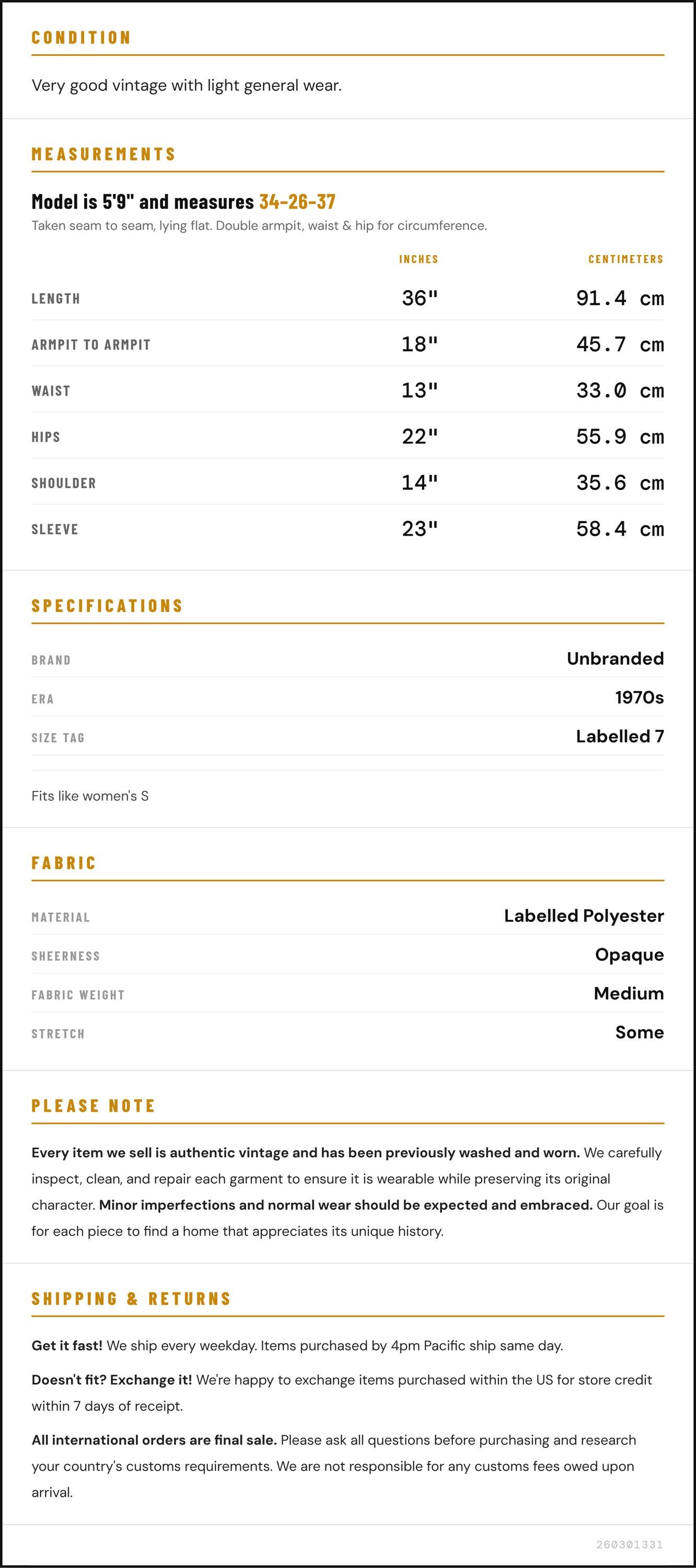 Taken from seam to seam while the garment is lying flat. Double the armpit, waist, and hip measurements.