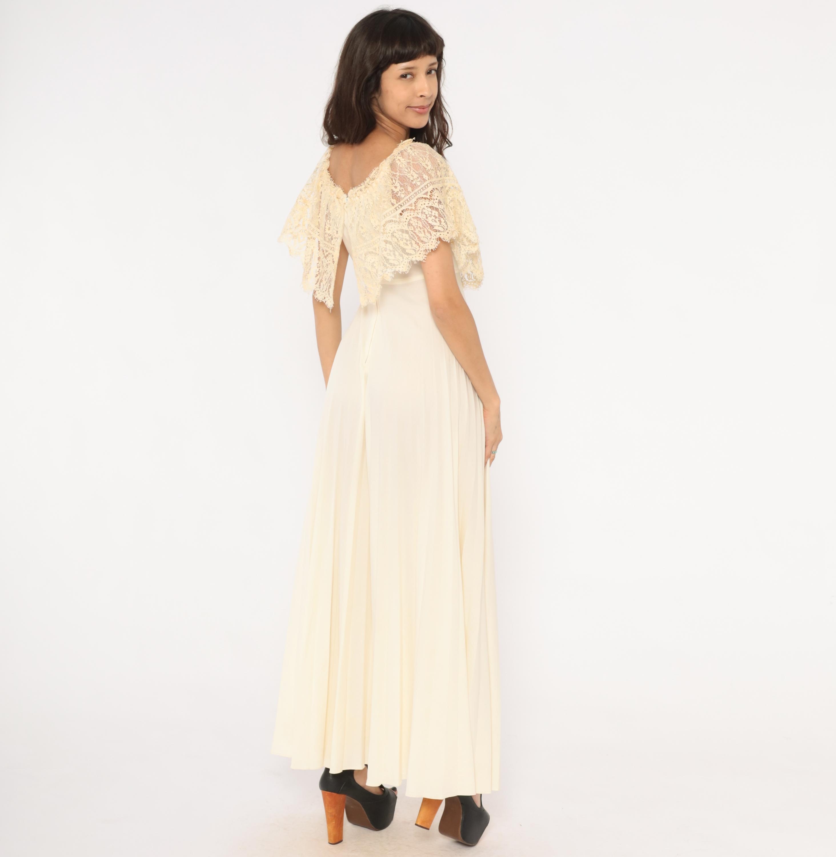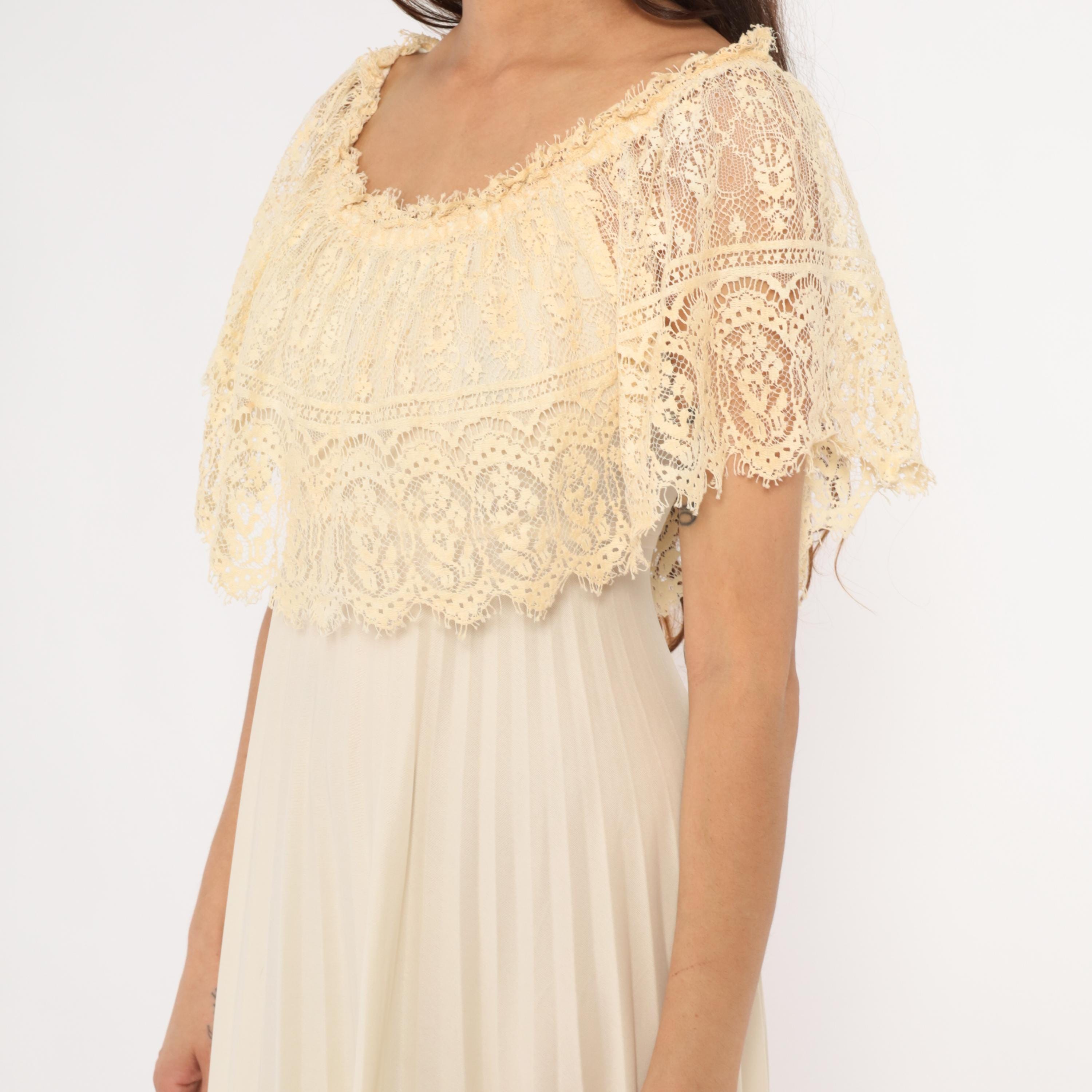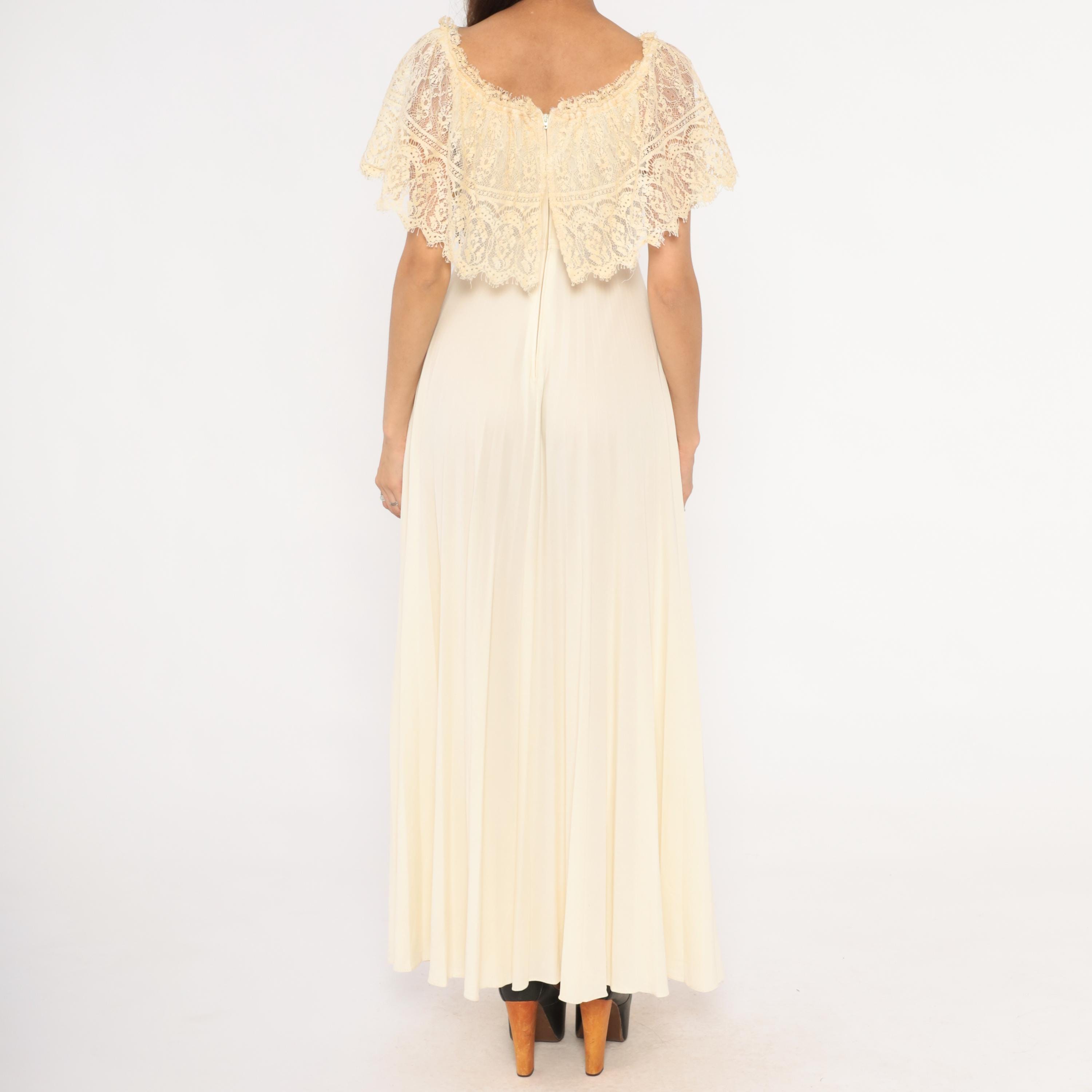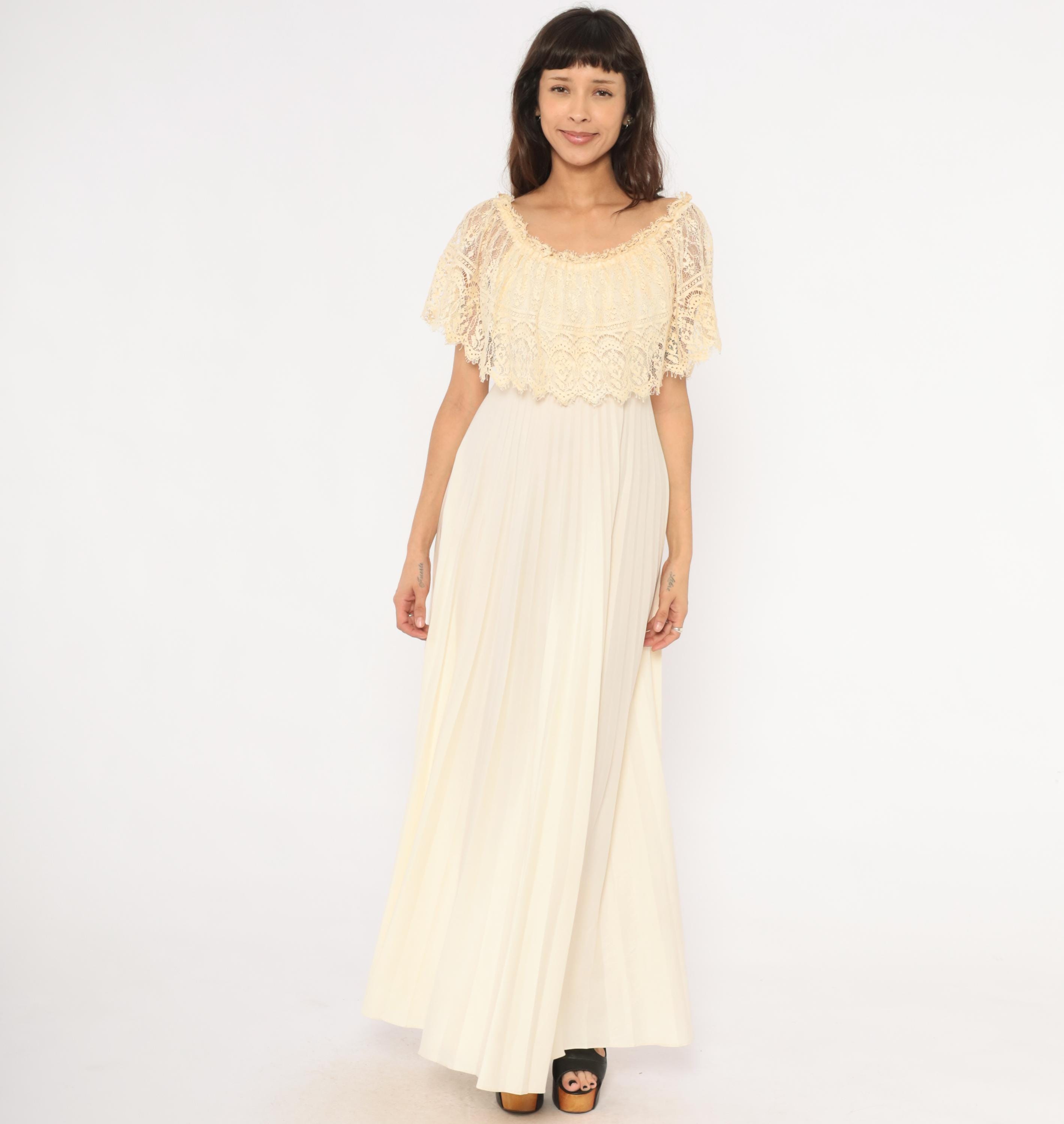 70s cream maxi dress with a lace capelet overlay gathered at the scoop neckline, draping over the shoulders and upper bodice. Scalloped edges along the lace hem and sleeve-like edges with an intricate floral lace pattern. Pleated skirt from the empire waist down to the floor, with a back zipper closure.