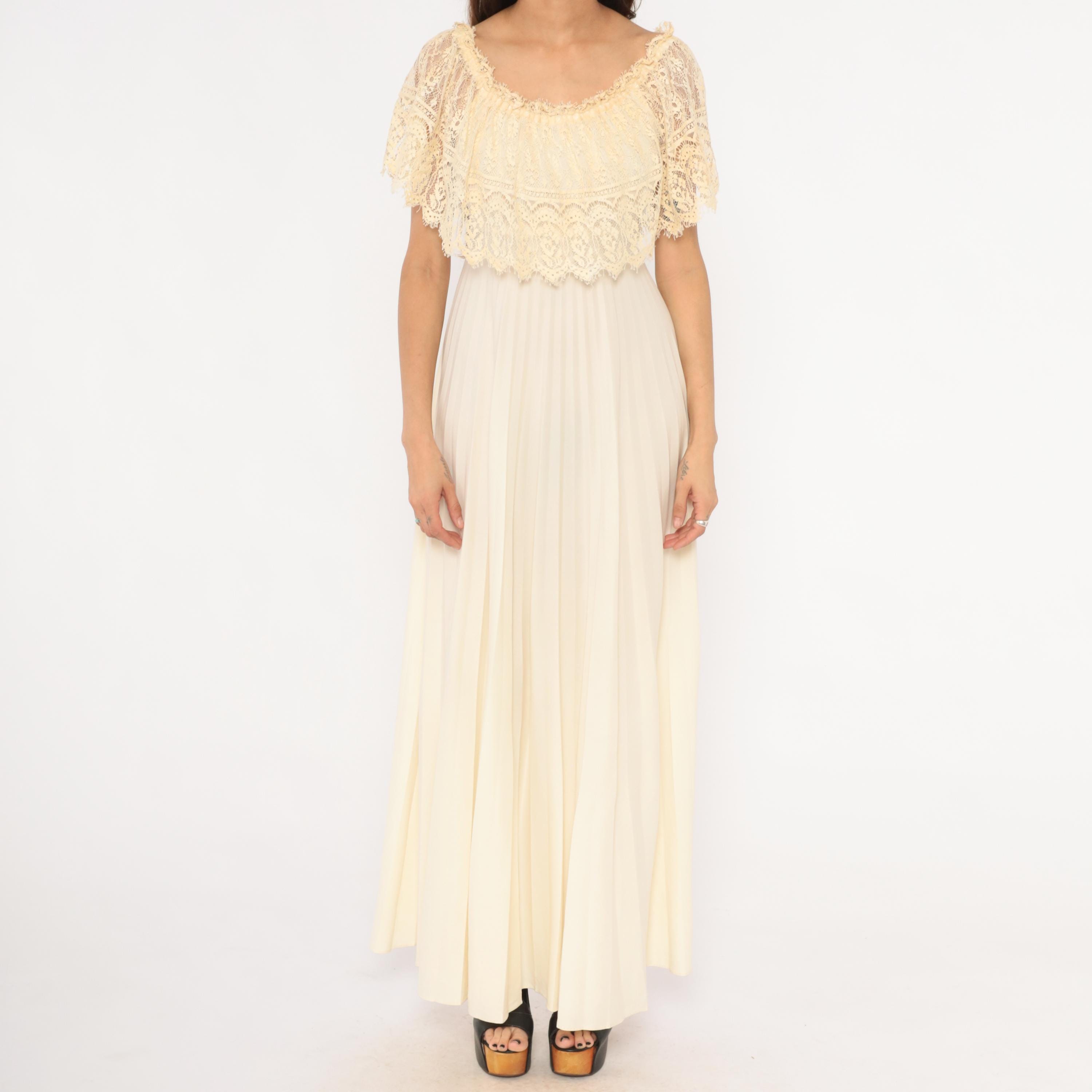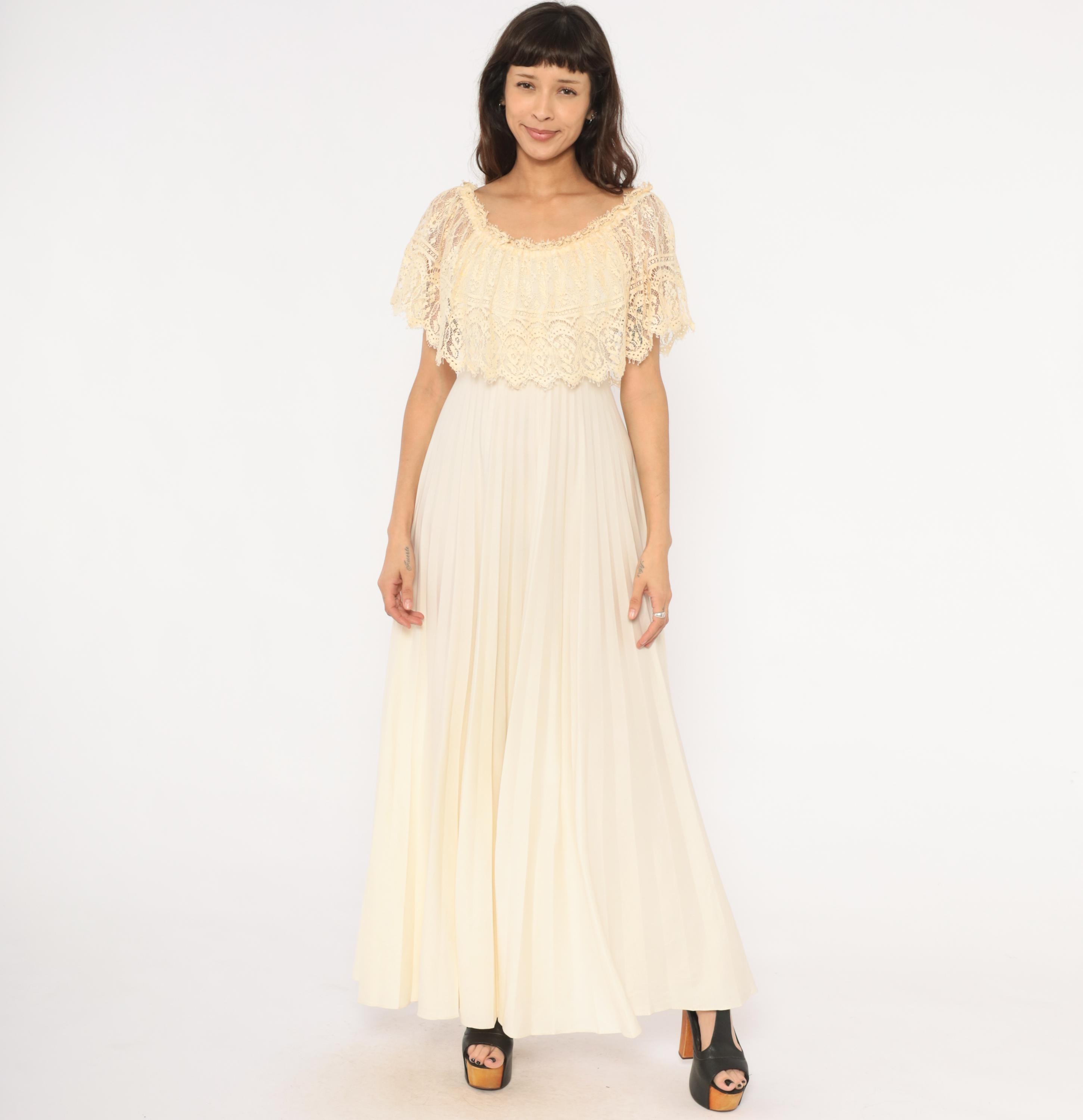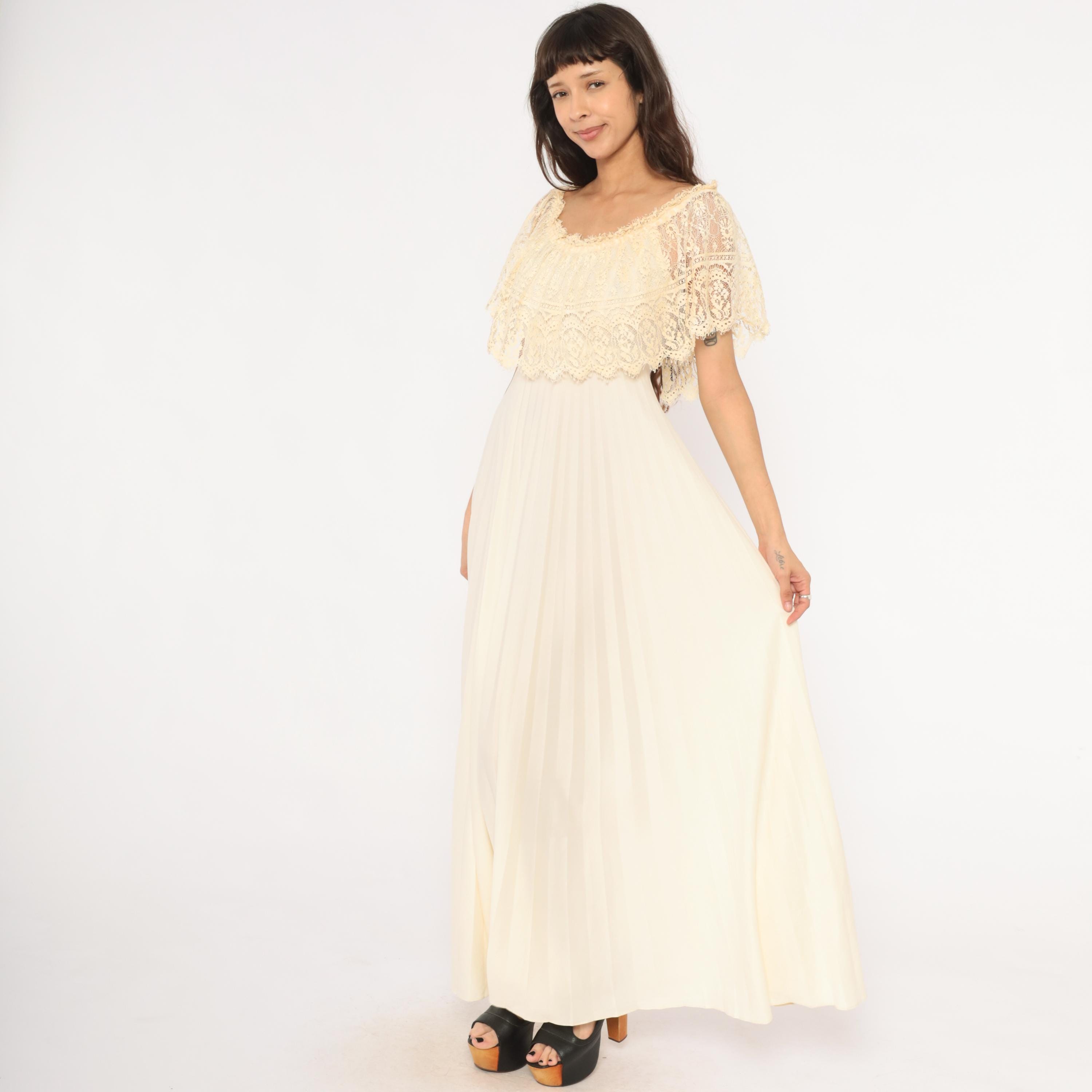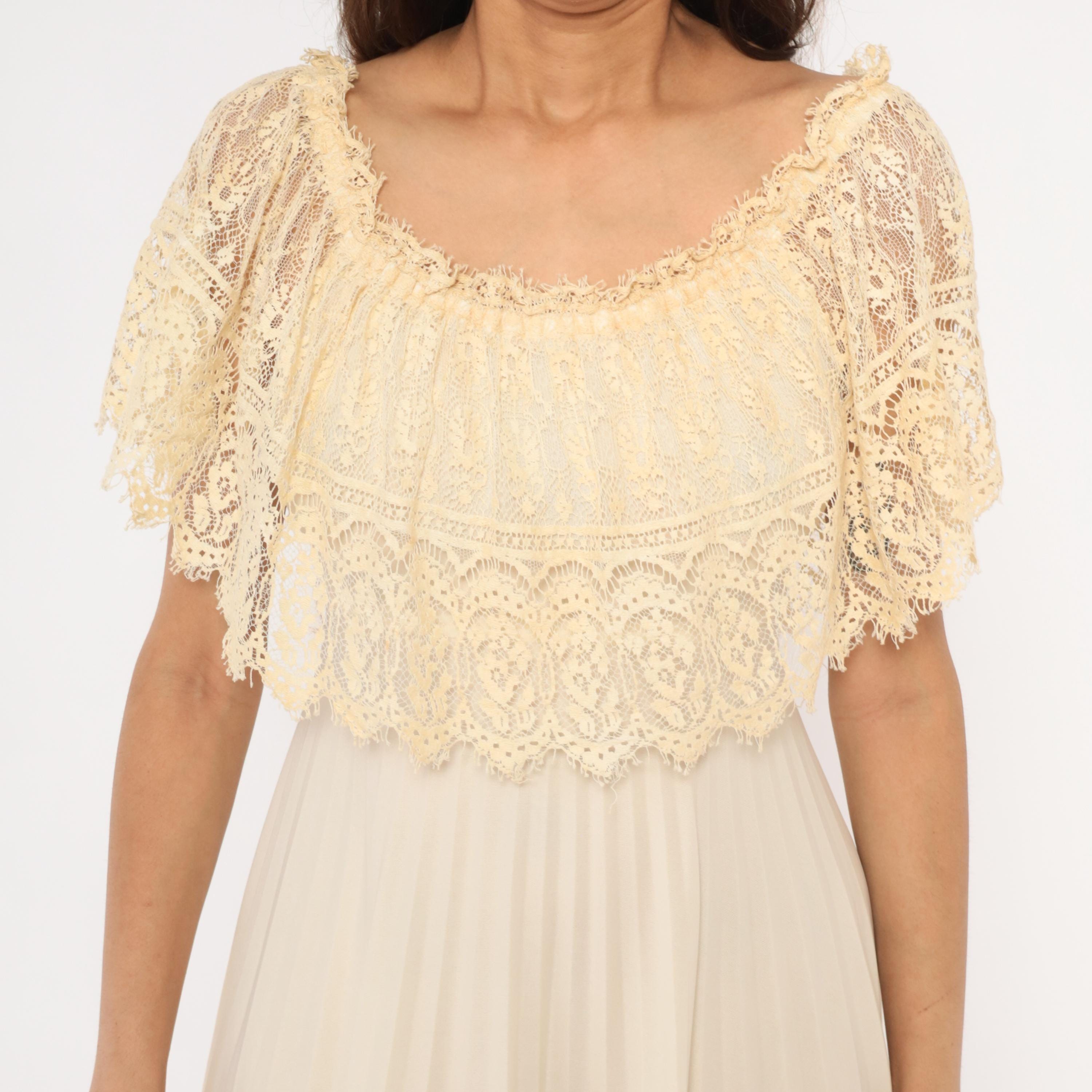 70s cream maxi dress with a lace capelet overlay gathered at the scoop neckline, draping over the shoulders and upper bodice. Scalloped edges along the lace hem and sleeve-like edges with an intricate floral lace pattern. Pleated skirt from the empire waist down to the floor, with a back zipper closure.